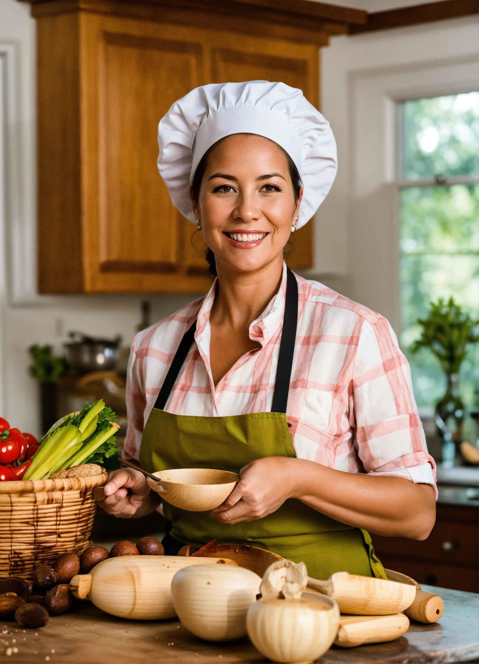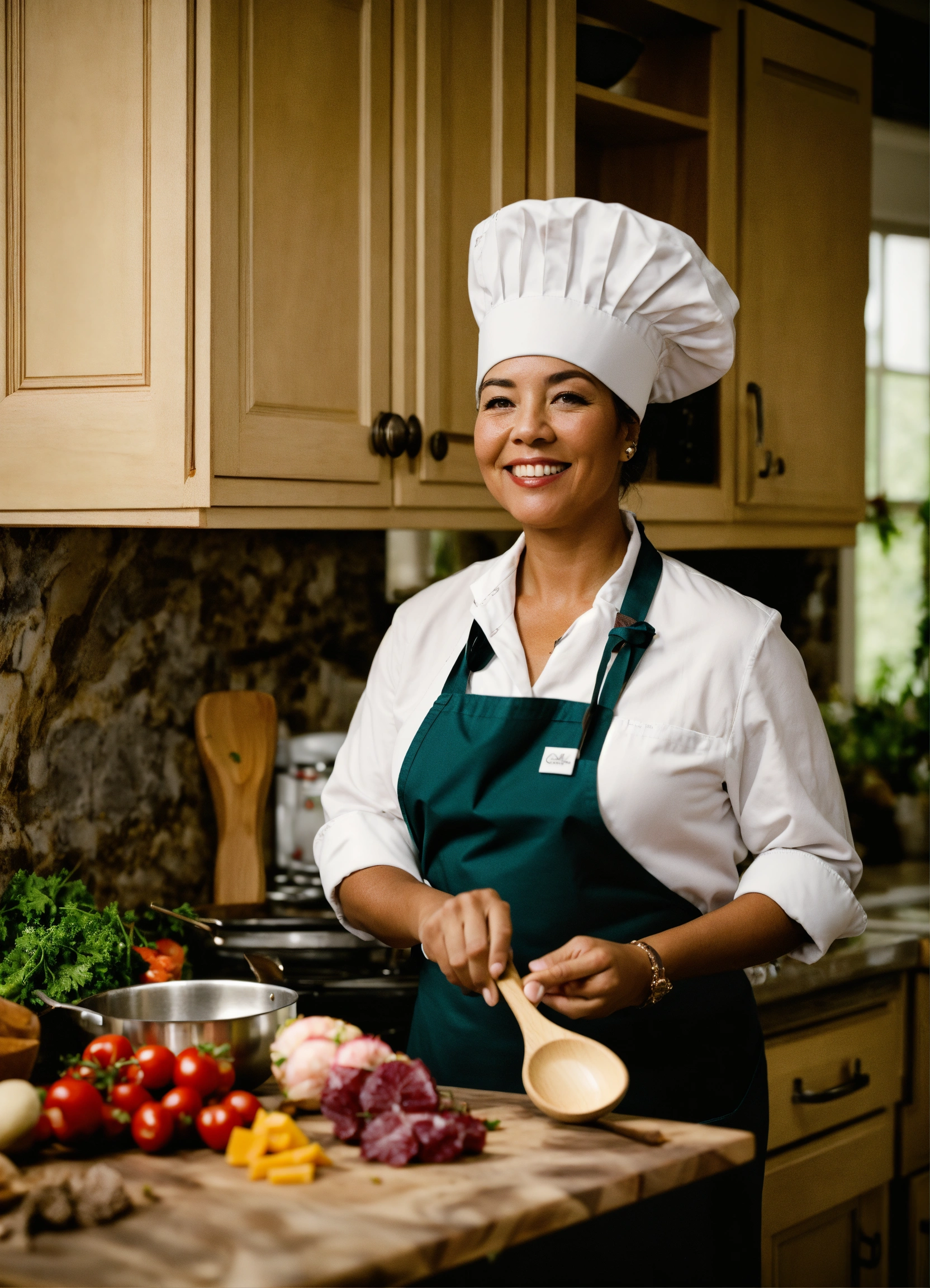 A woman culinary artist in her home kitchen wearing a chef's hat