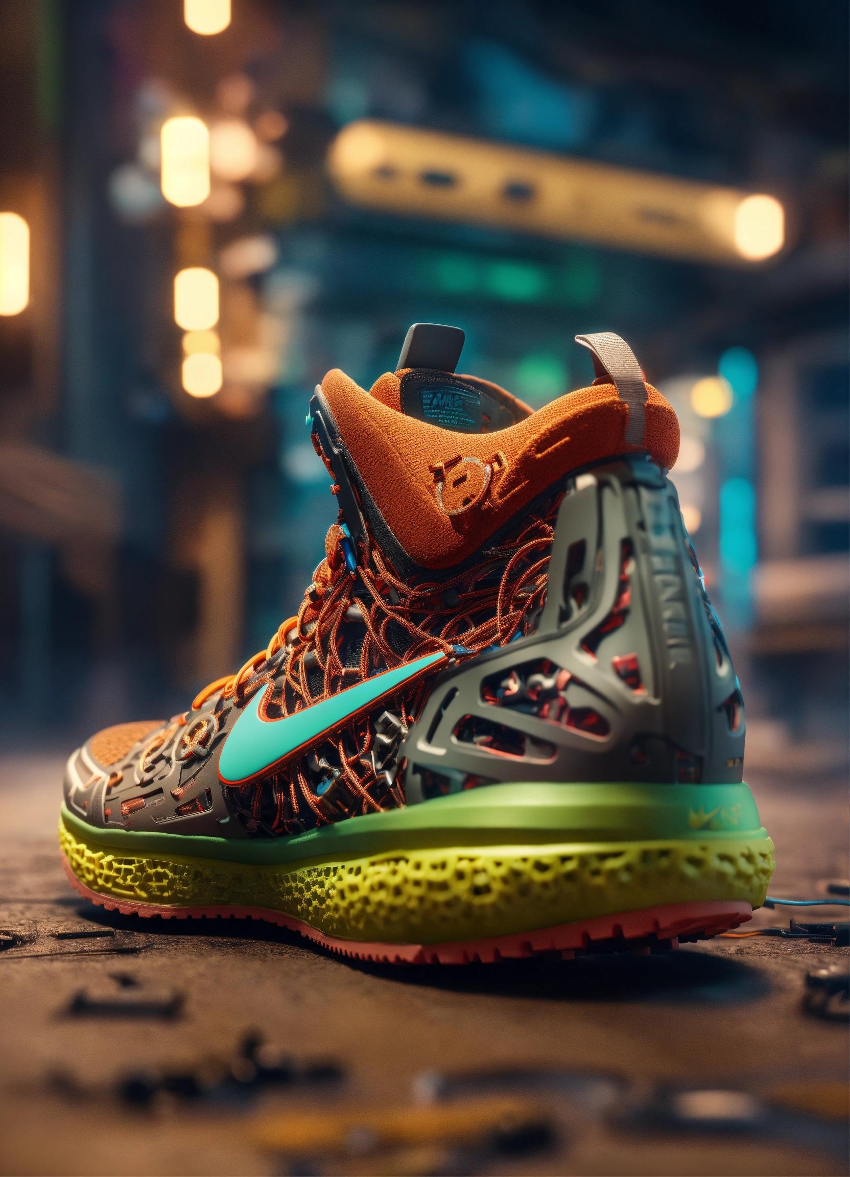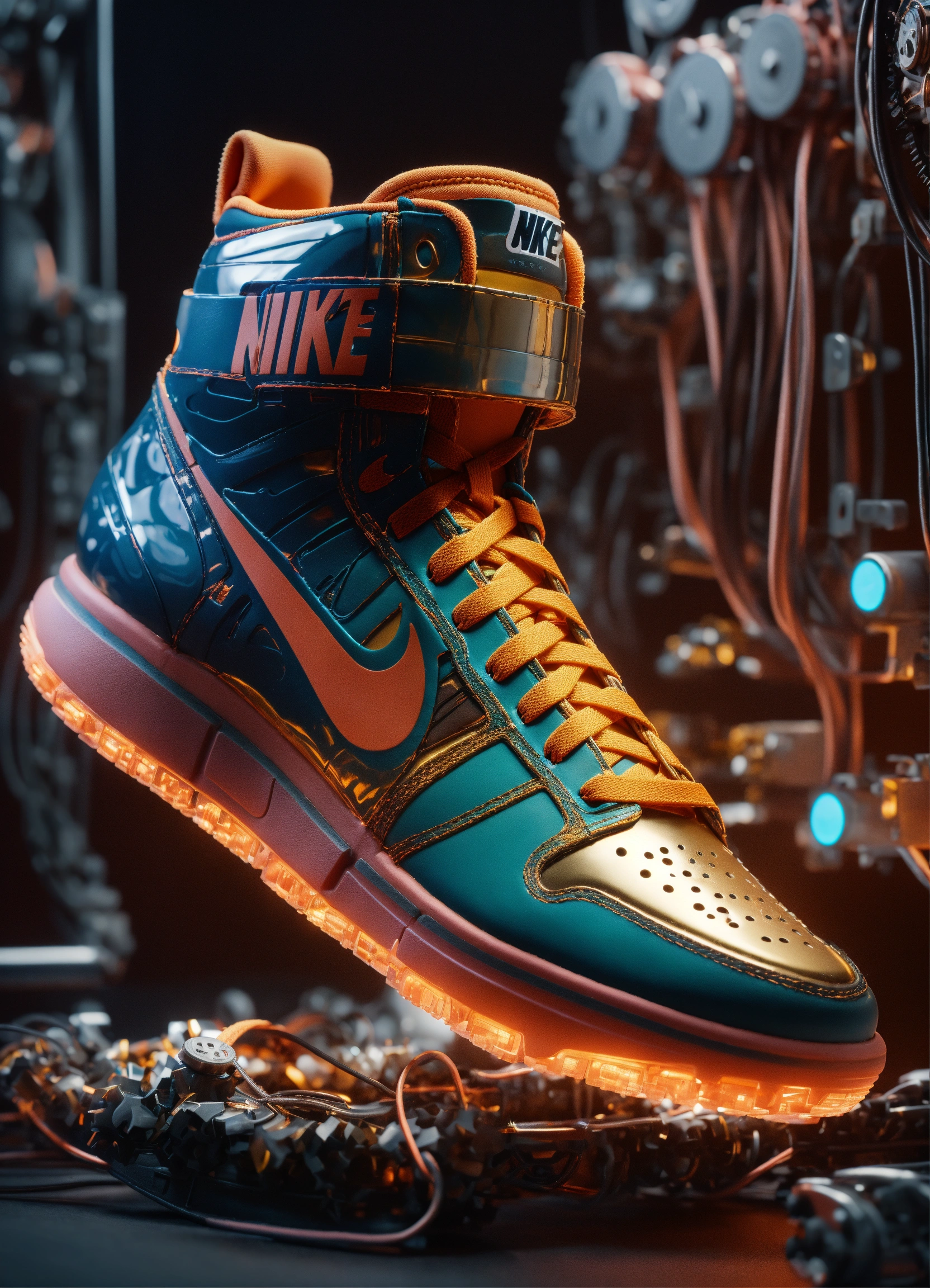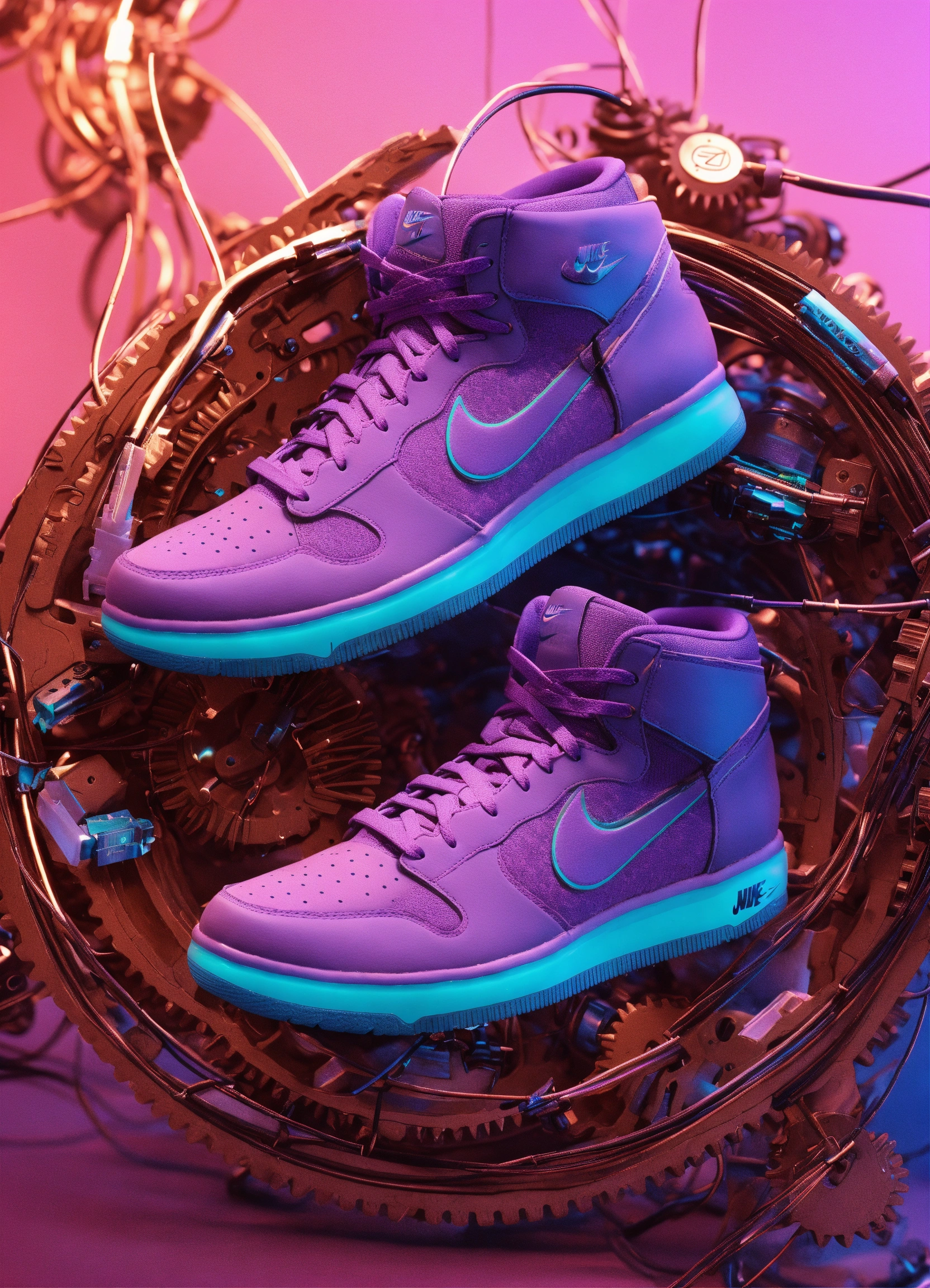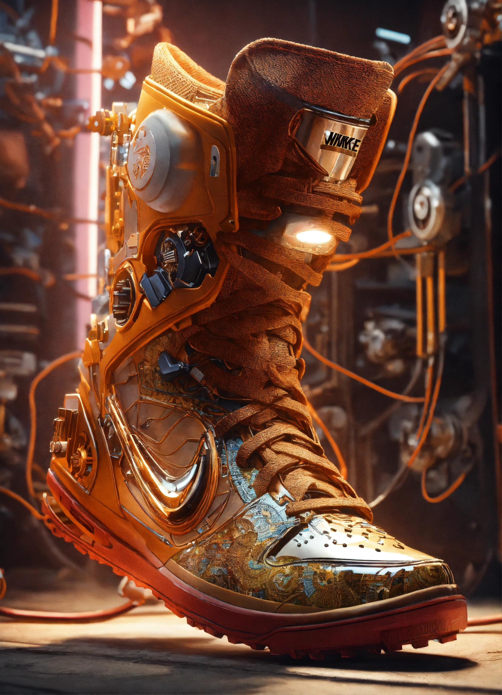 Nike sneakers made out (gears, wires, mechanical, electronics), pcb, hyper-realis, futurist, stunning unreal engine render, product photography 8k, hyper-realistic. surrealism