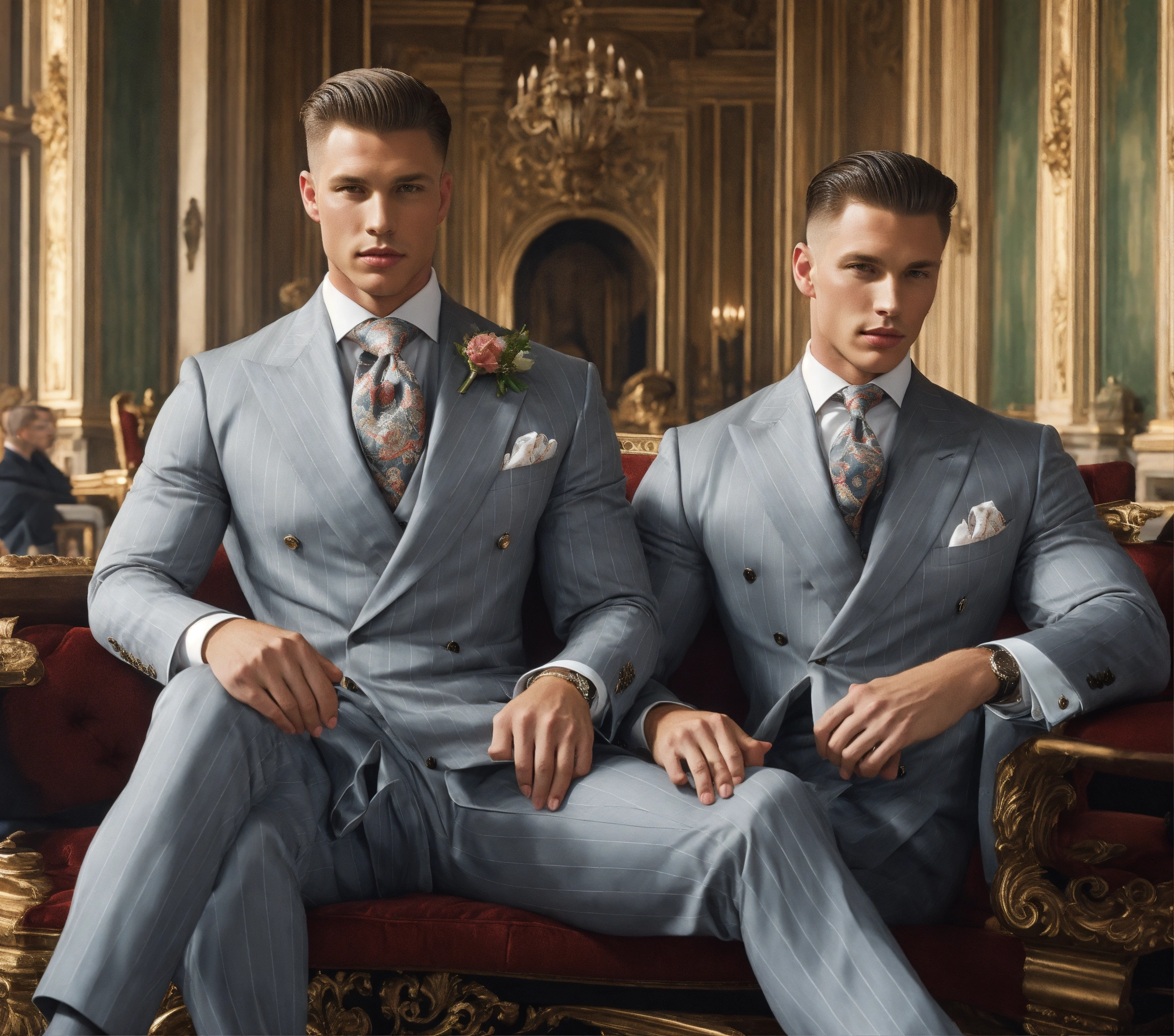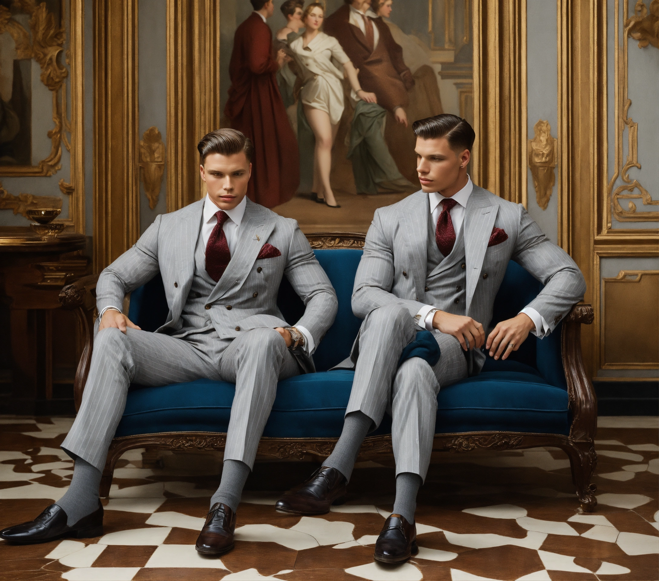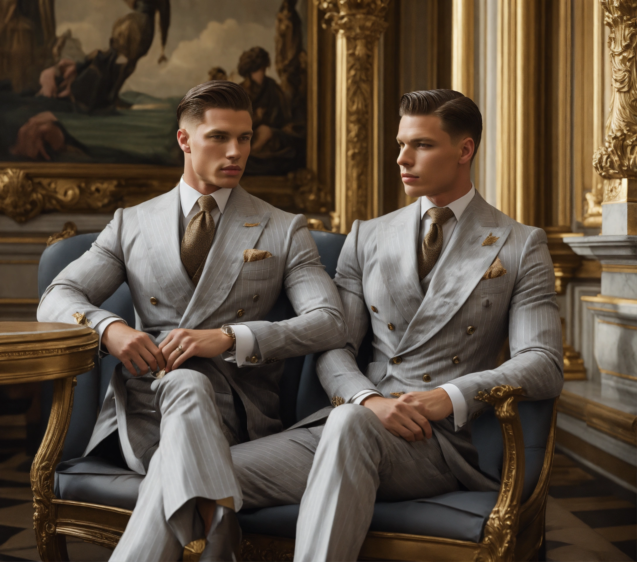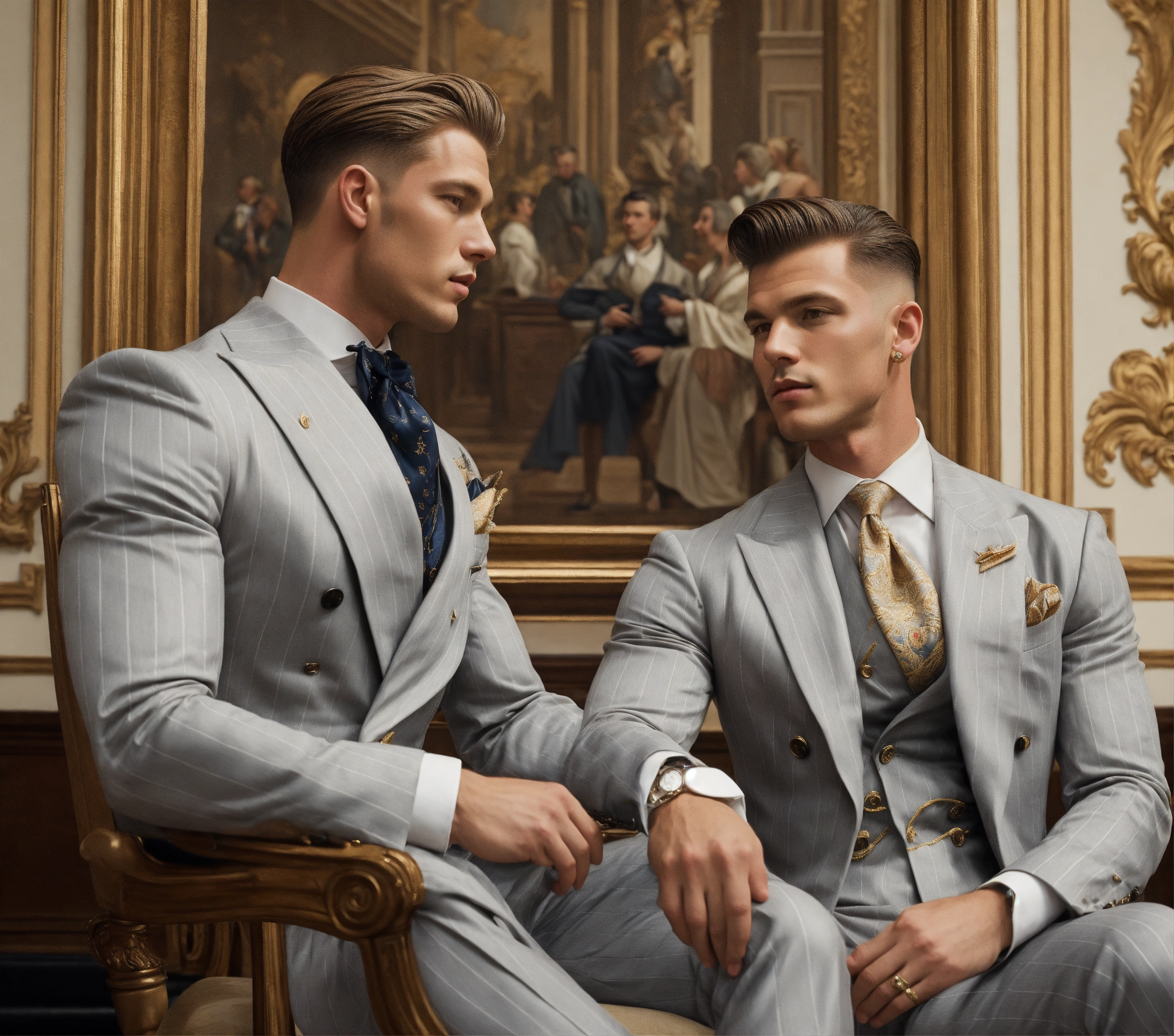 Two muscled gentlemen, pompadour haircut, in light grey pinstripe double breasted suit, seating in a venetian palace, leyendecker style