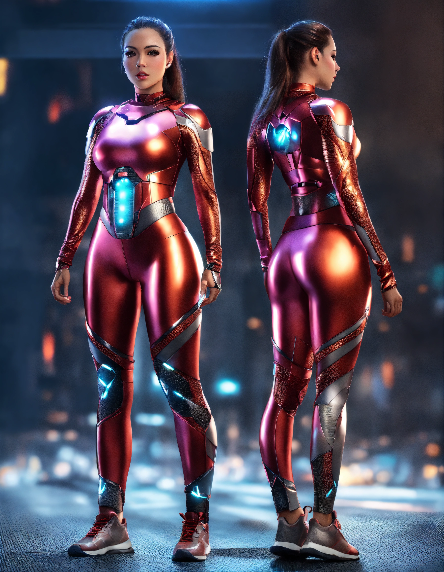 Full body shot of realistic woman in shiny yoga pants, tight sports top, electric elements, hightech power suit, cyborg suit, showing belly and thighs, hyper realistic, mesh