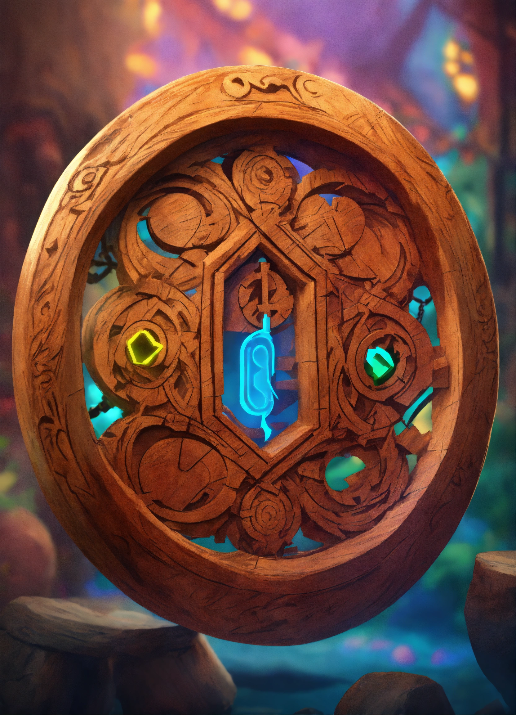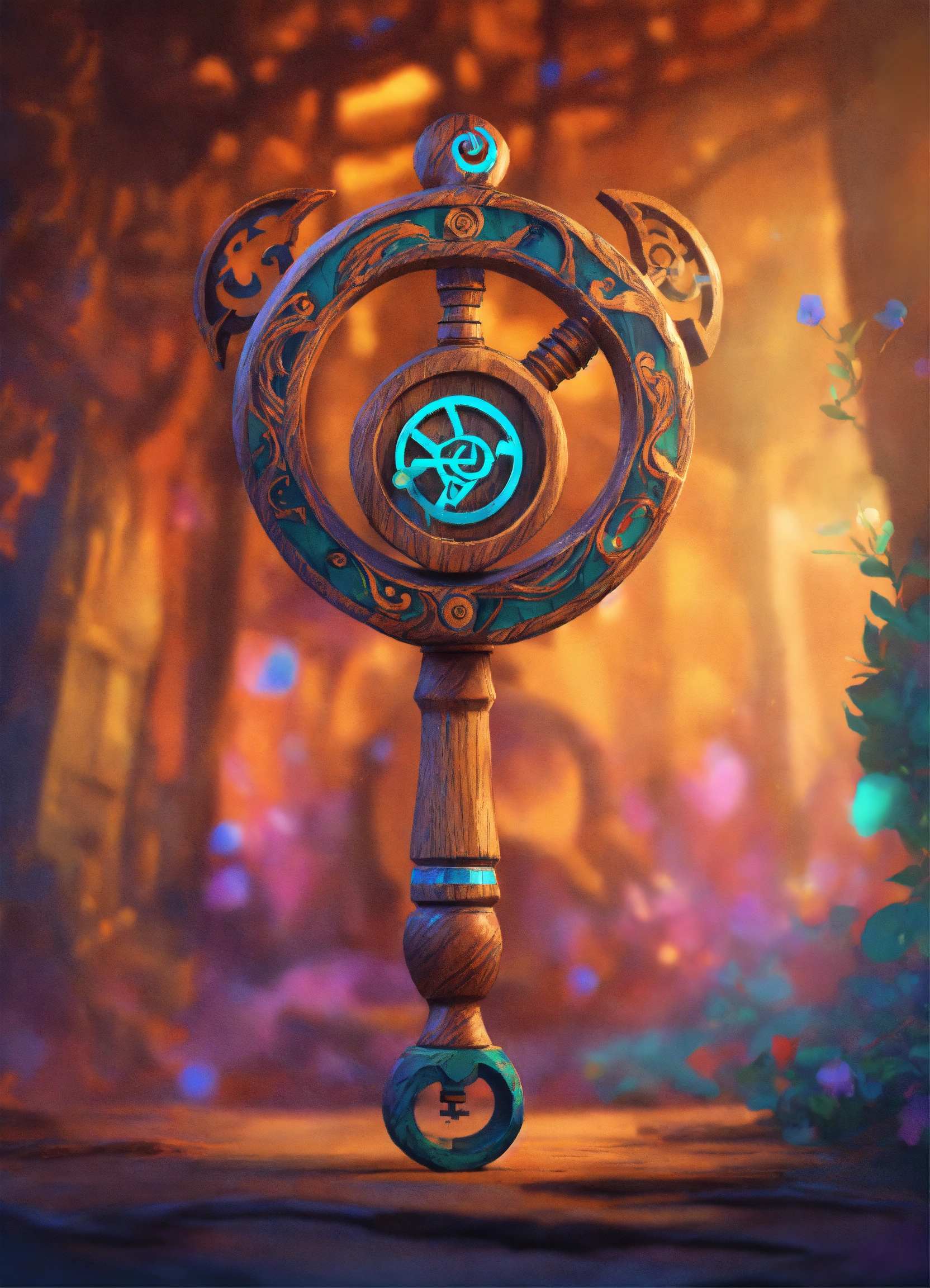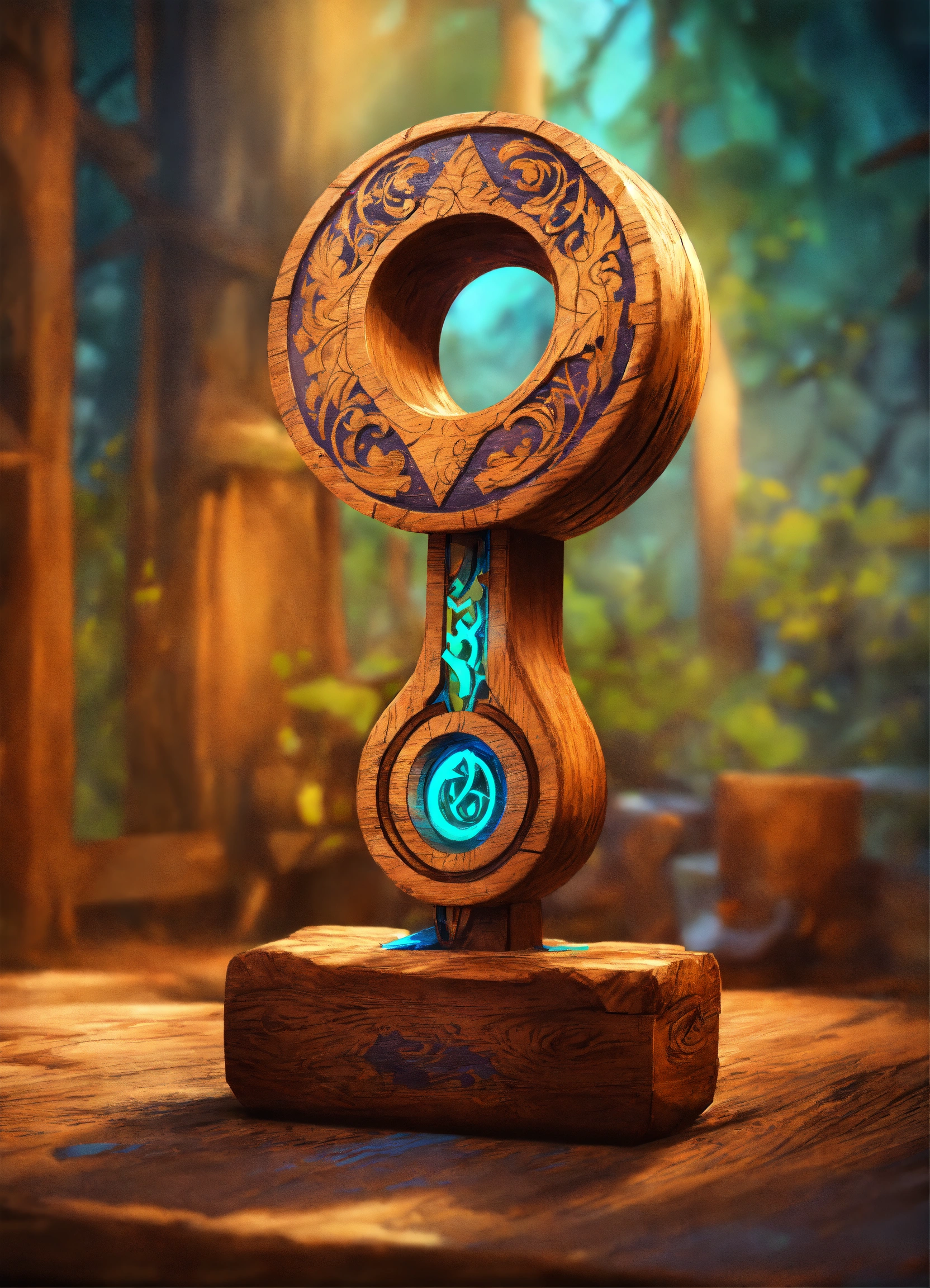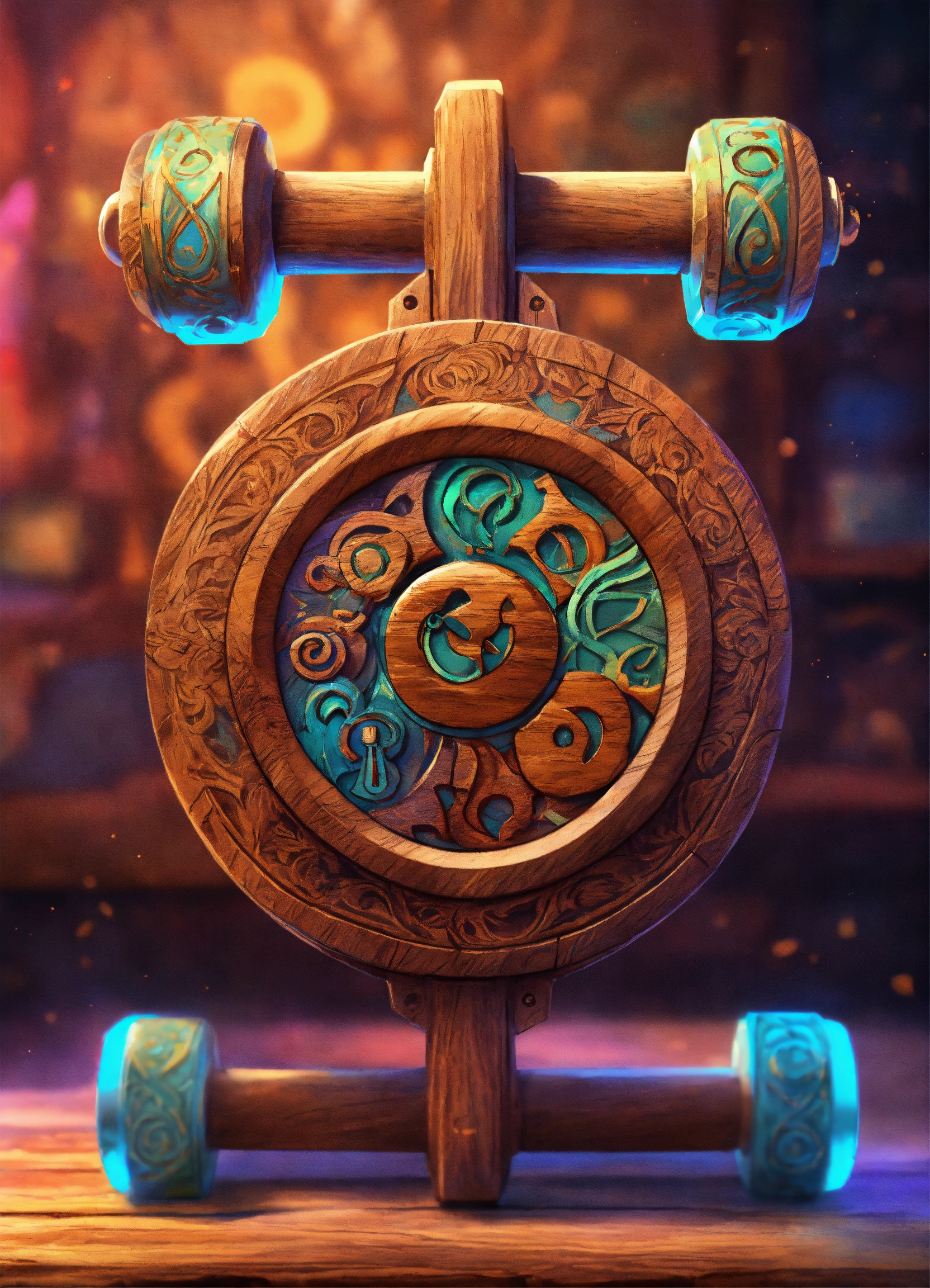 Magical rune engraved wooden crank, crudely carved, wooden hand crank, round handle, air element, magical item, video game concept art, colorful background, artistic render, painterly style, drawing