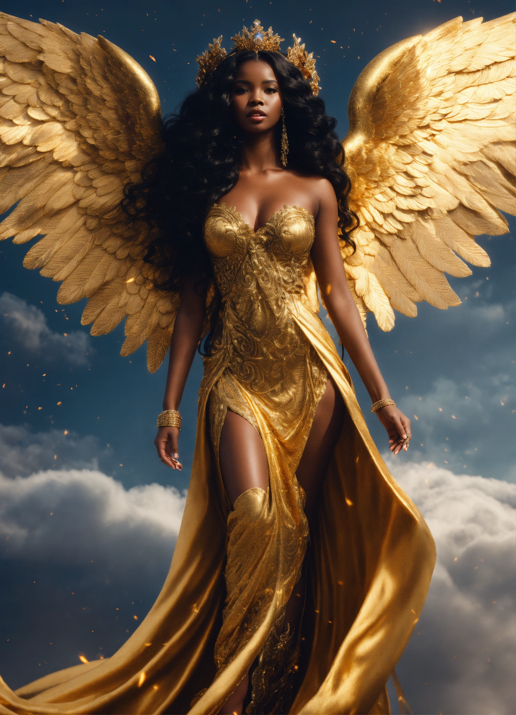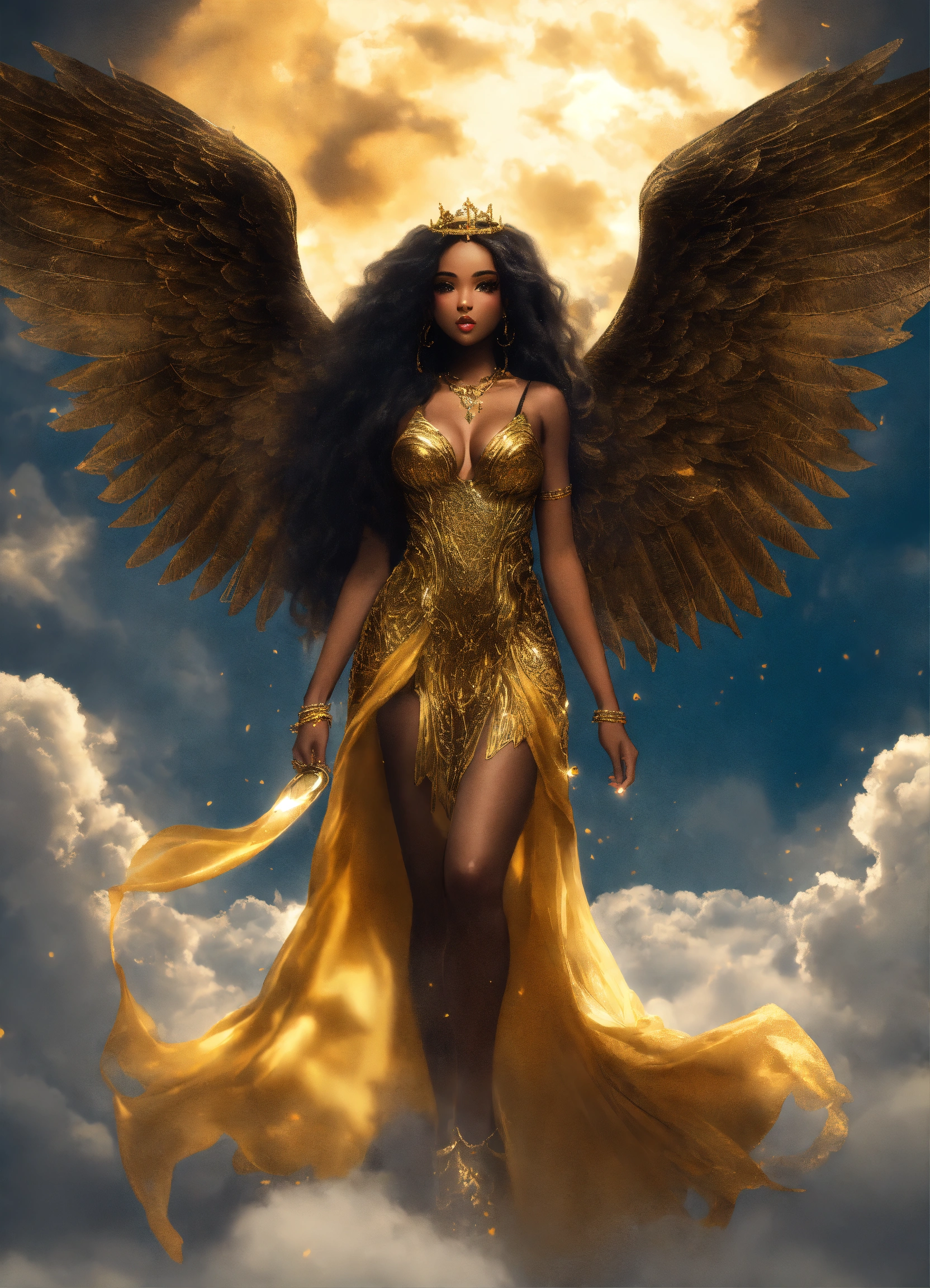 A beautiful black female angel goddess, a beautiful goddess queen with long dark hair hour-glass figure angel wings wearing gold dress, walking in the clouds, resolution 8k, insanely detailed