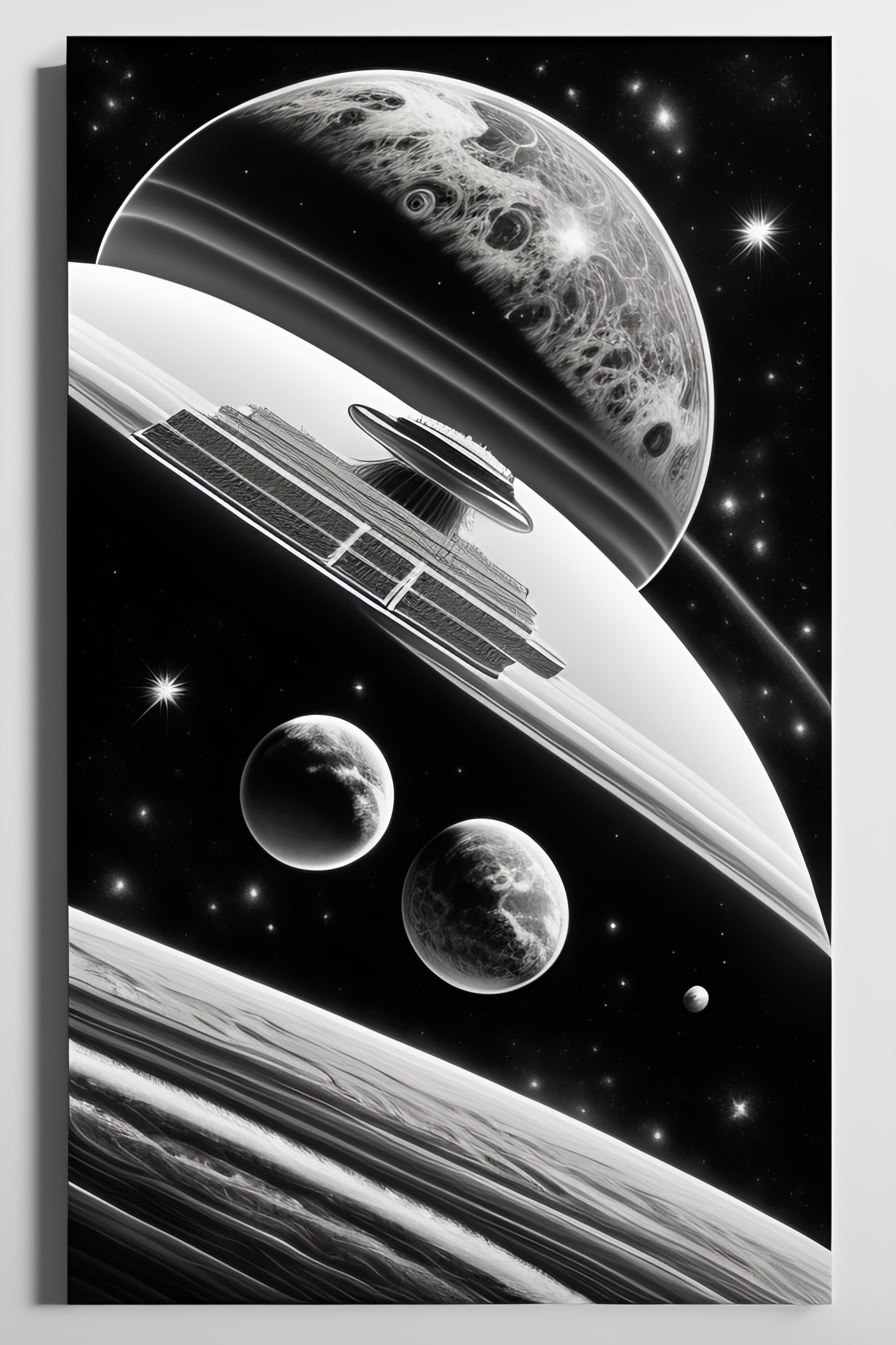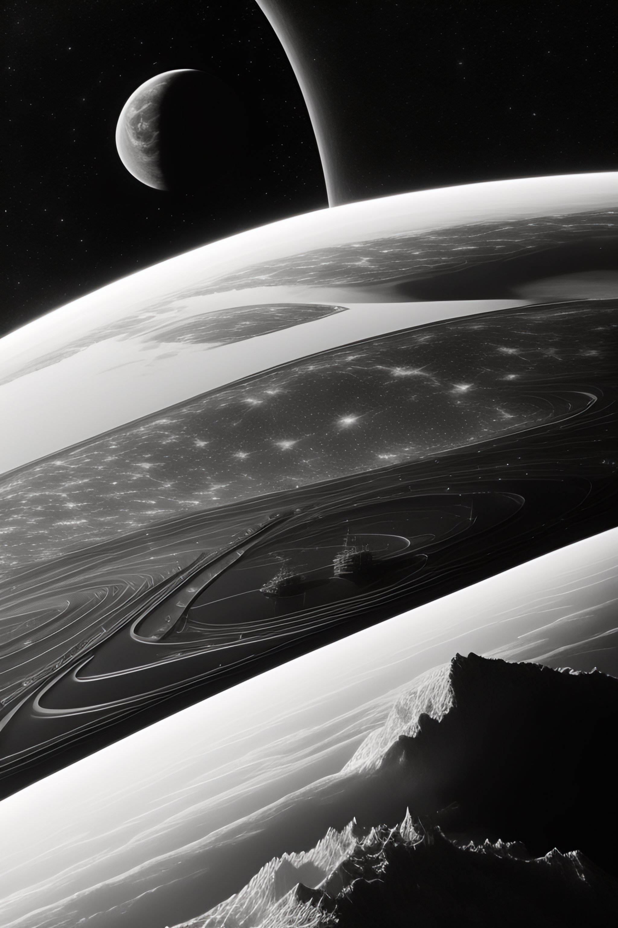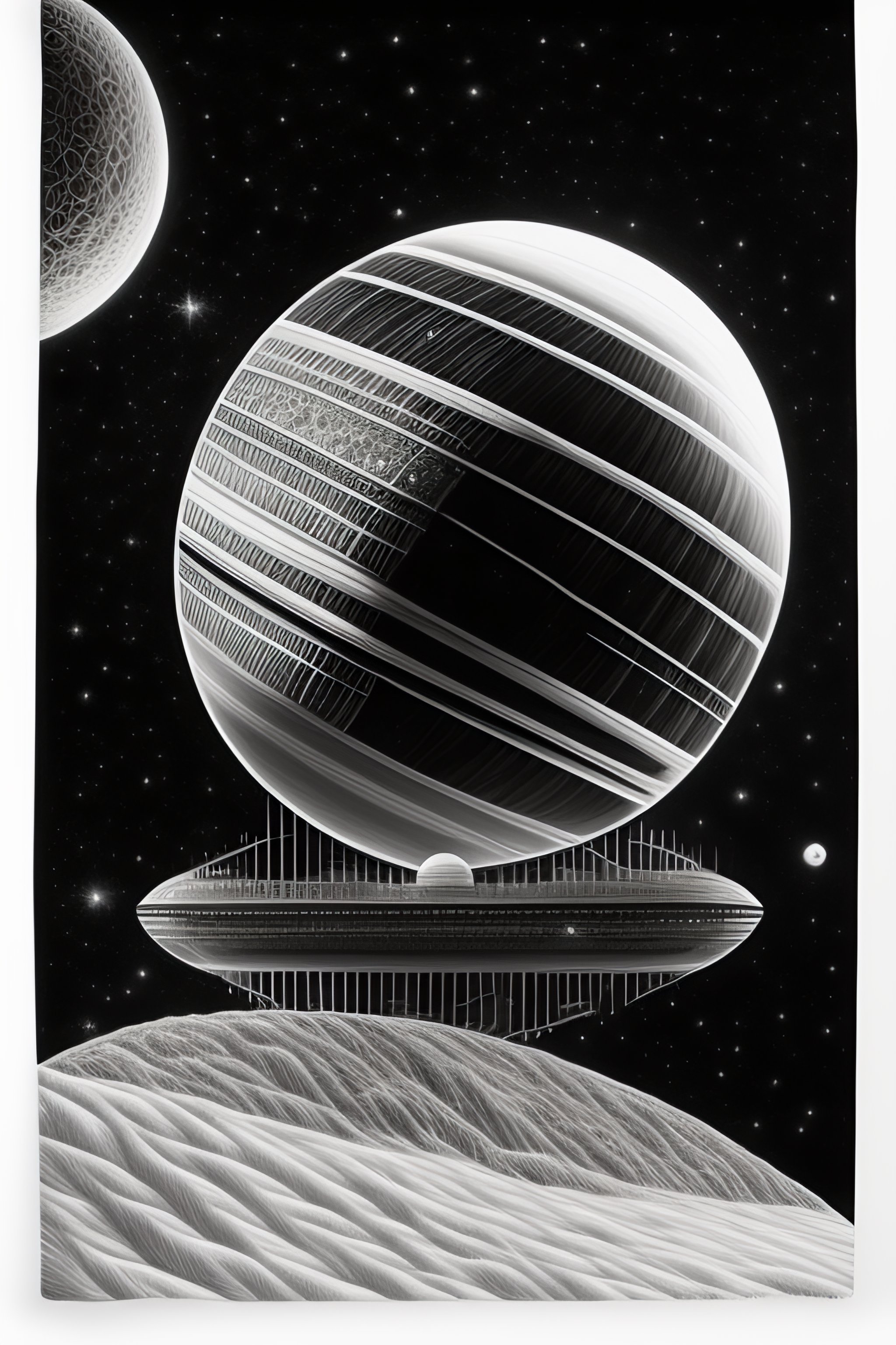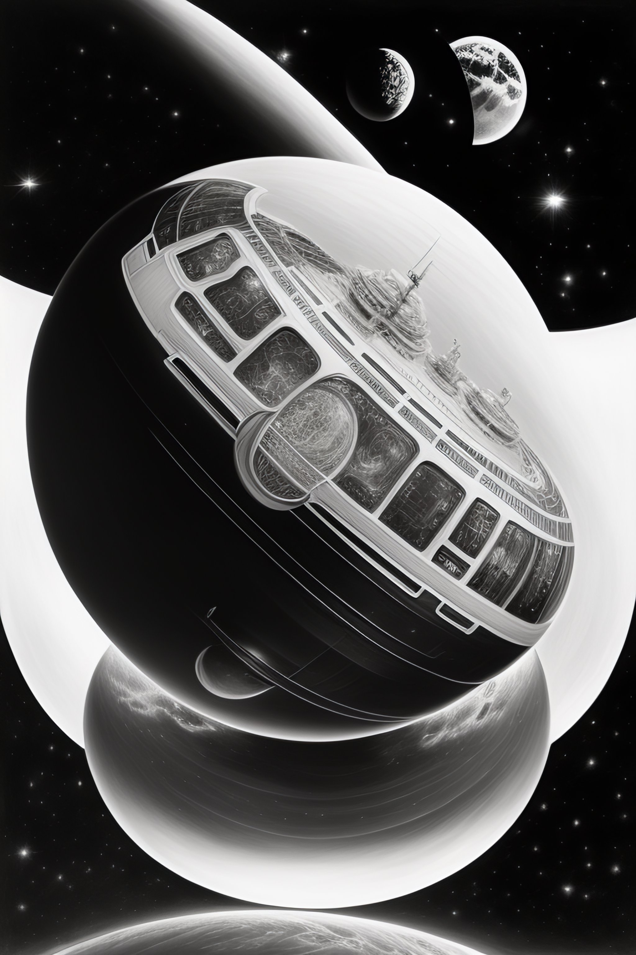 A black and white photo of a space station, a detailed drawing by wolfgang zelmer, tumblr, space art, outlined art, art on instagram, made of crystals
