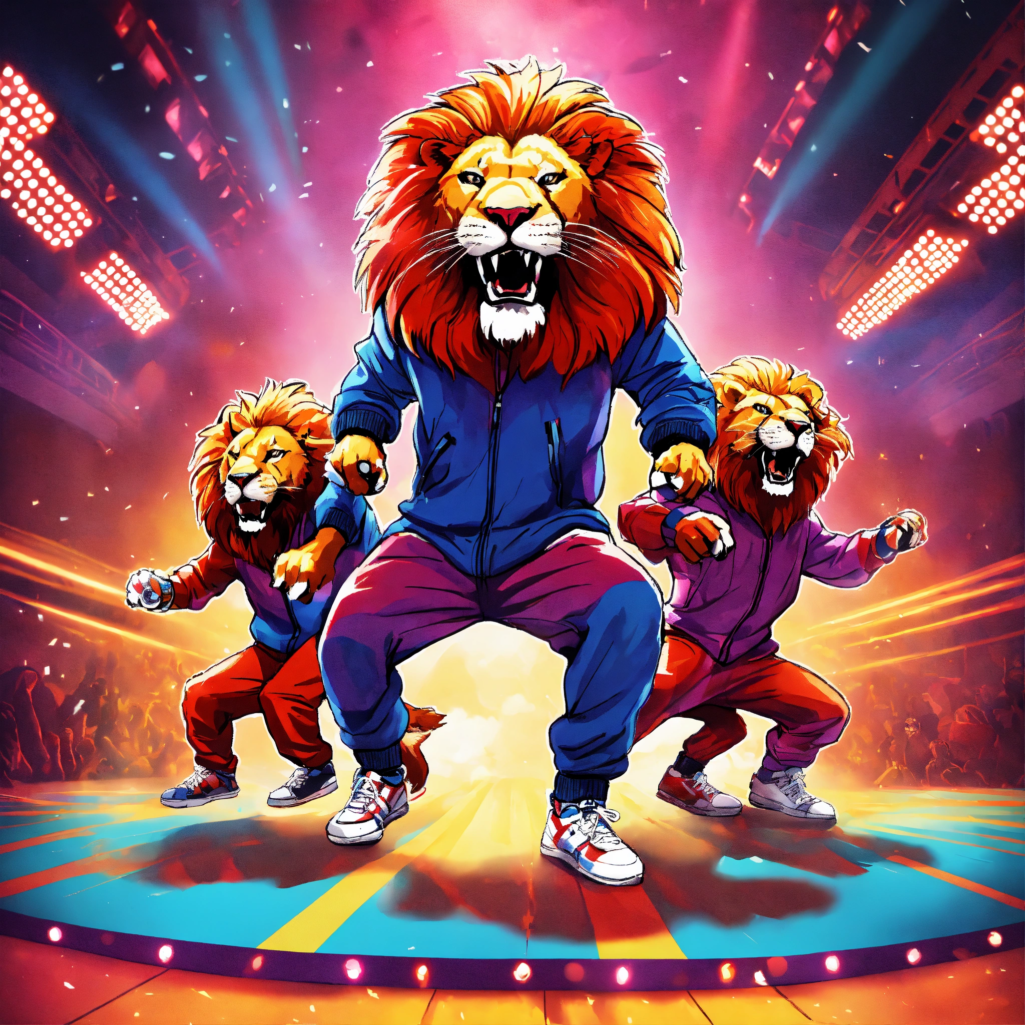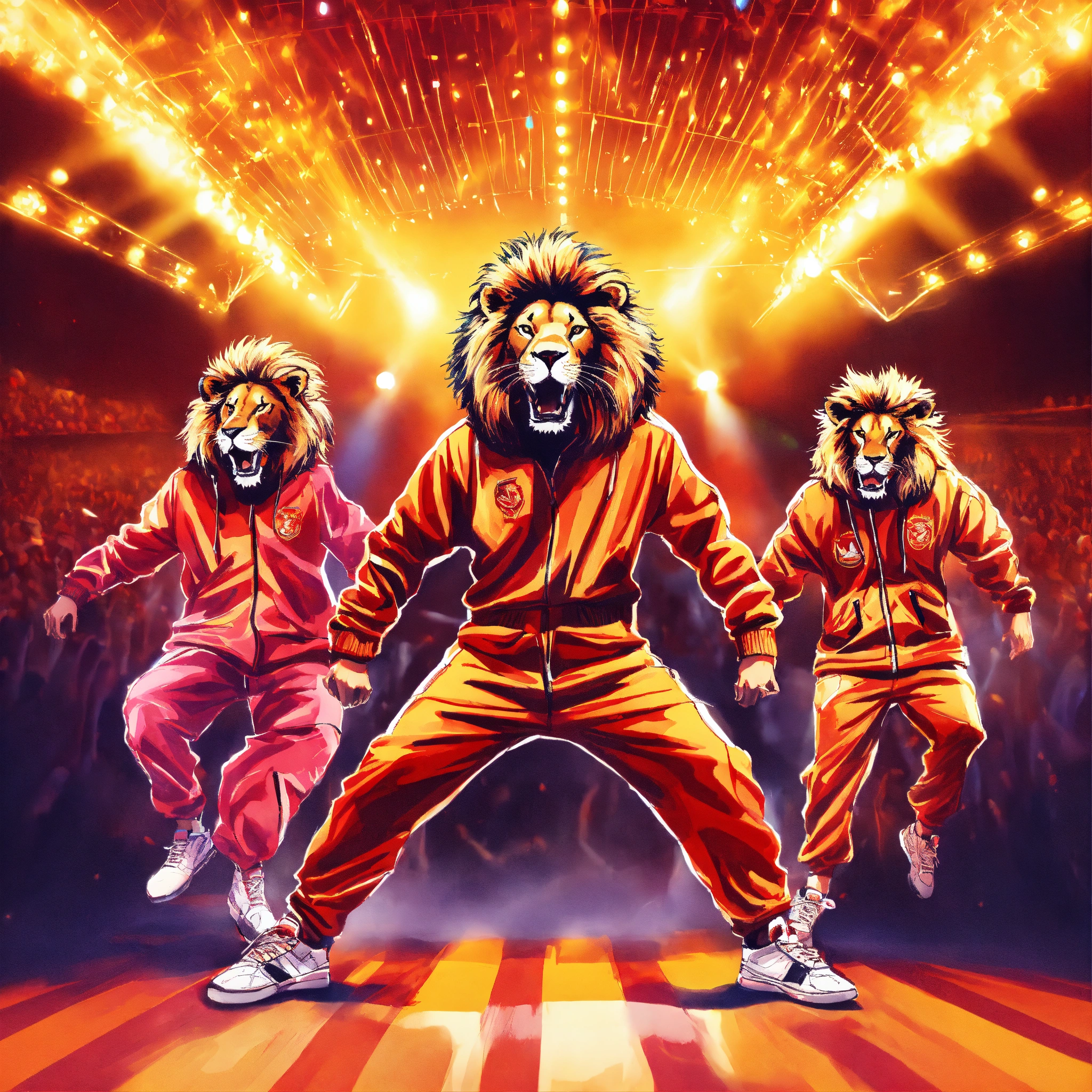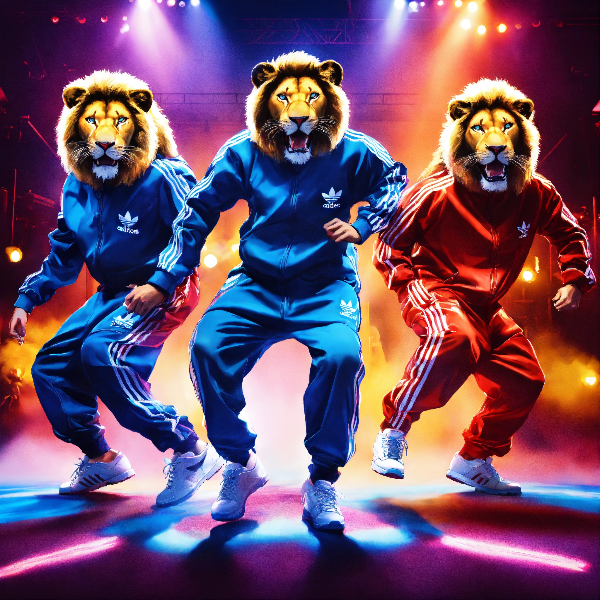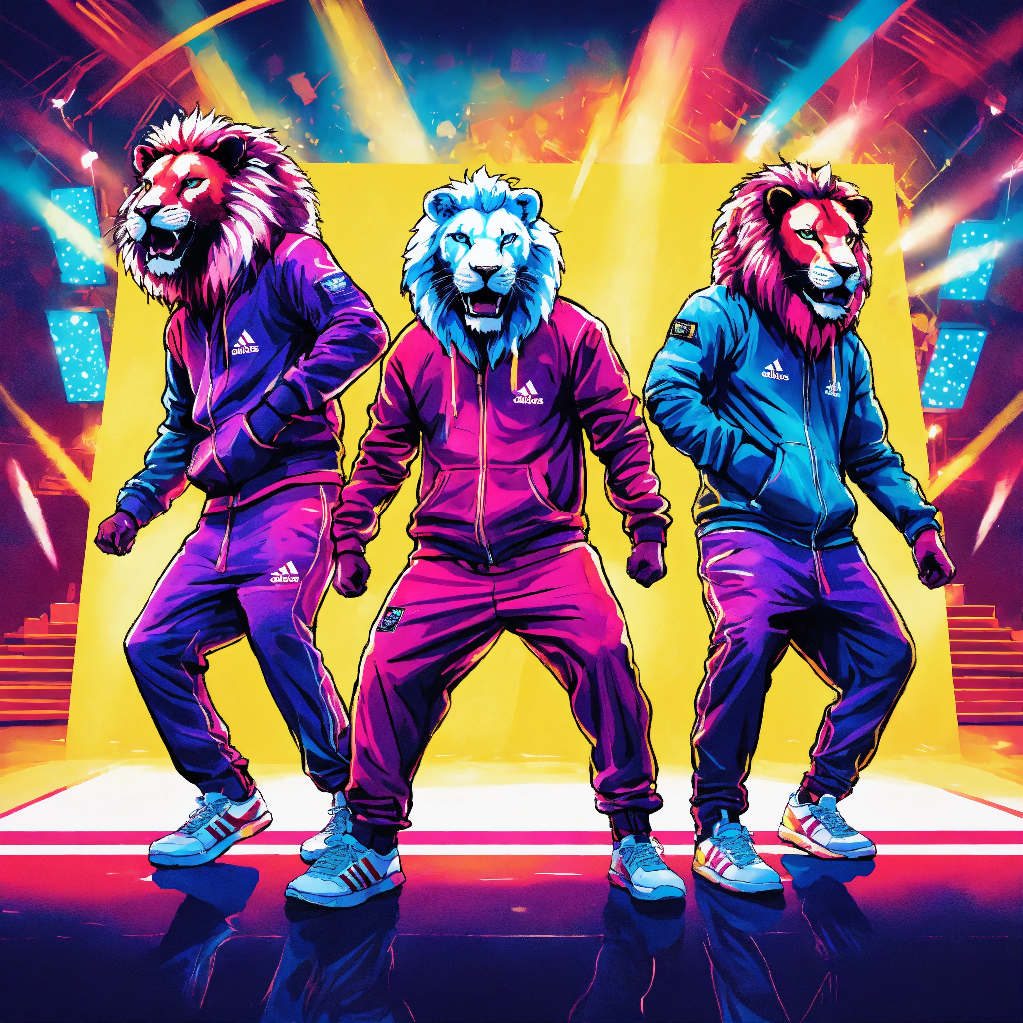 Artistic image type of image illustration prompt description create an electrifying illustration featuring three funky lions, dressed in adidas jumpsuits, showcasing their breakdancing skills like the jabbawockeez on a dynamic stage. the stage will be the focal point, with a massive and exuberant crowd cheering them on. the atmosphere will be filled with vibrant and colorful lights, creating a mesmerizing light show. a hazy mist of smoke will envelop the stage, adding to the energy and excitement.