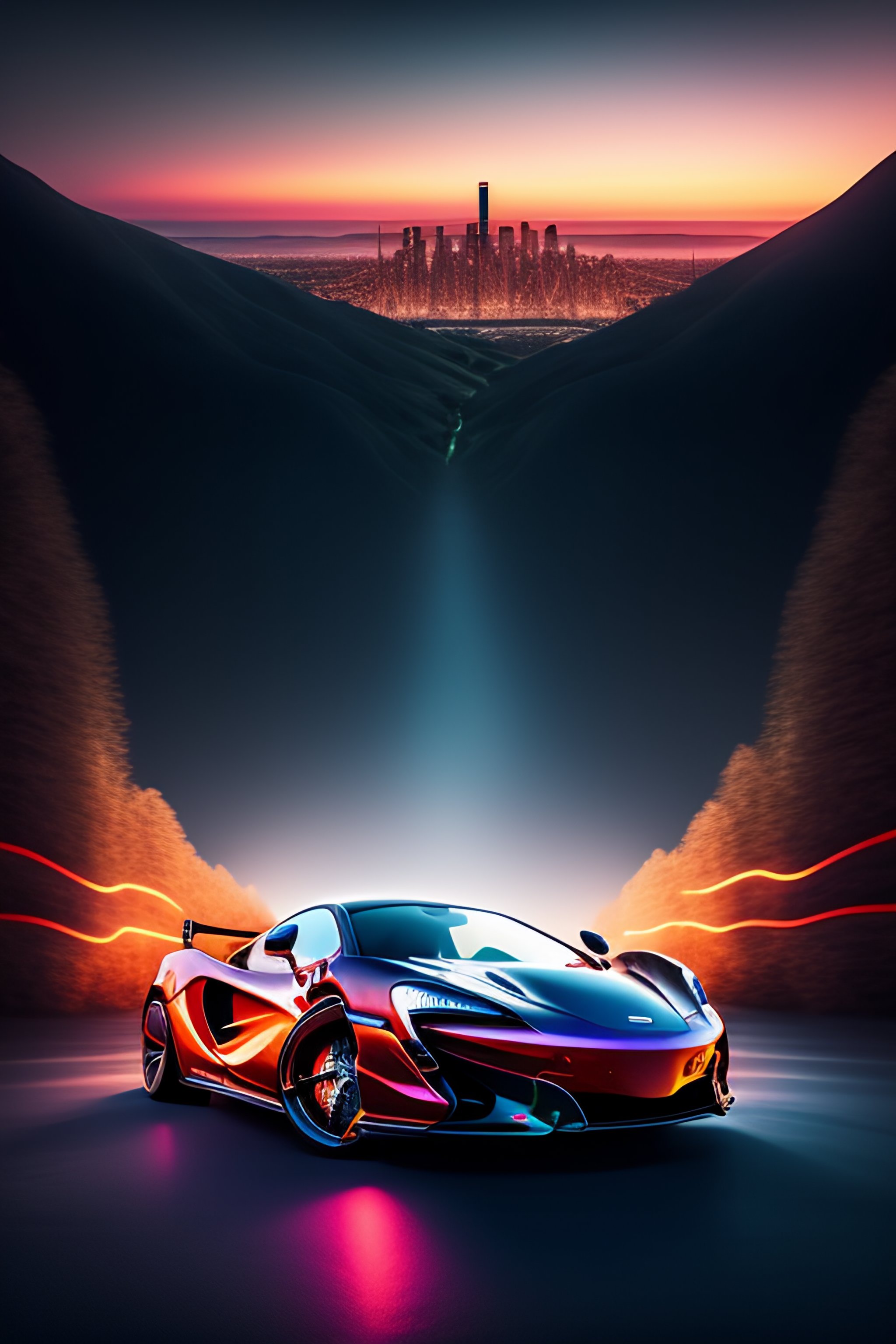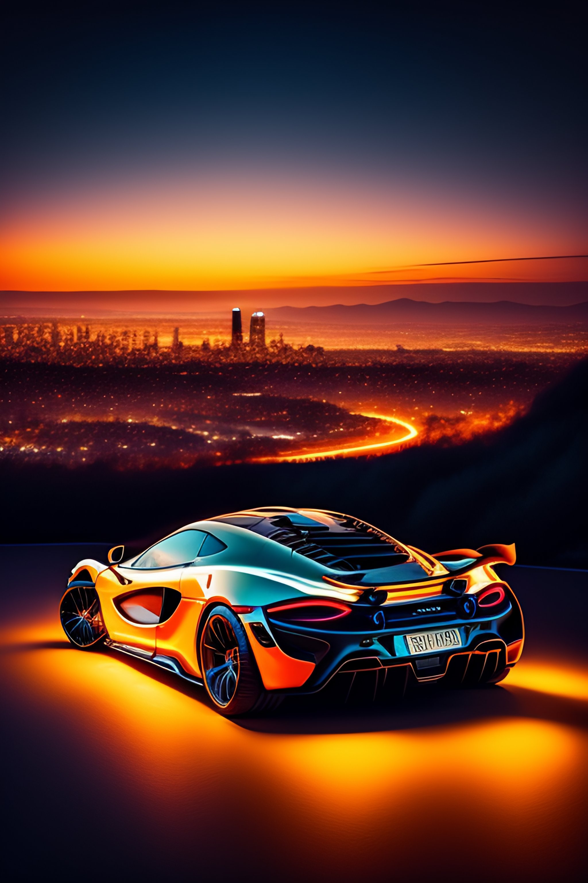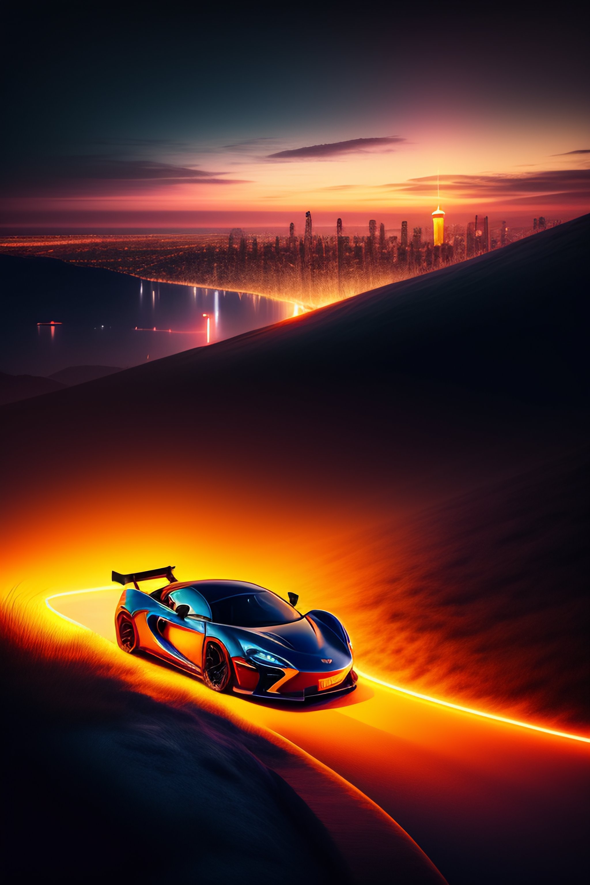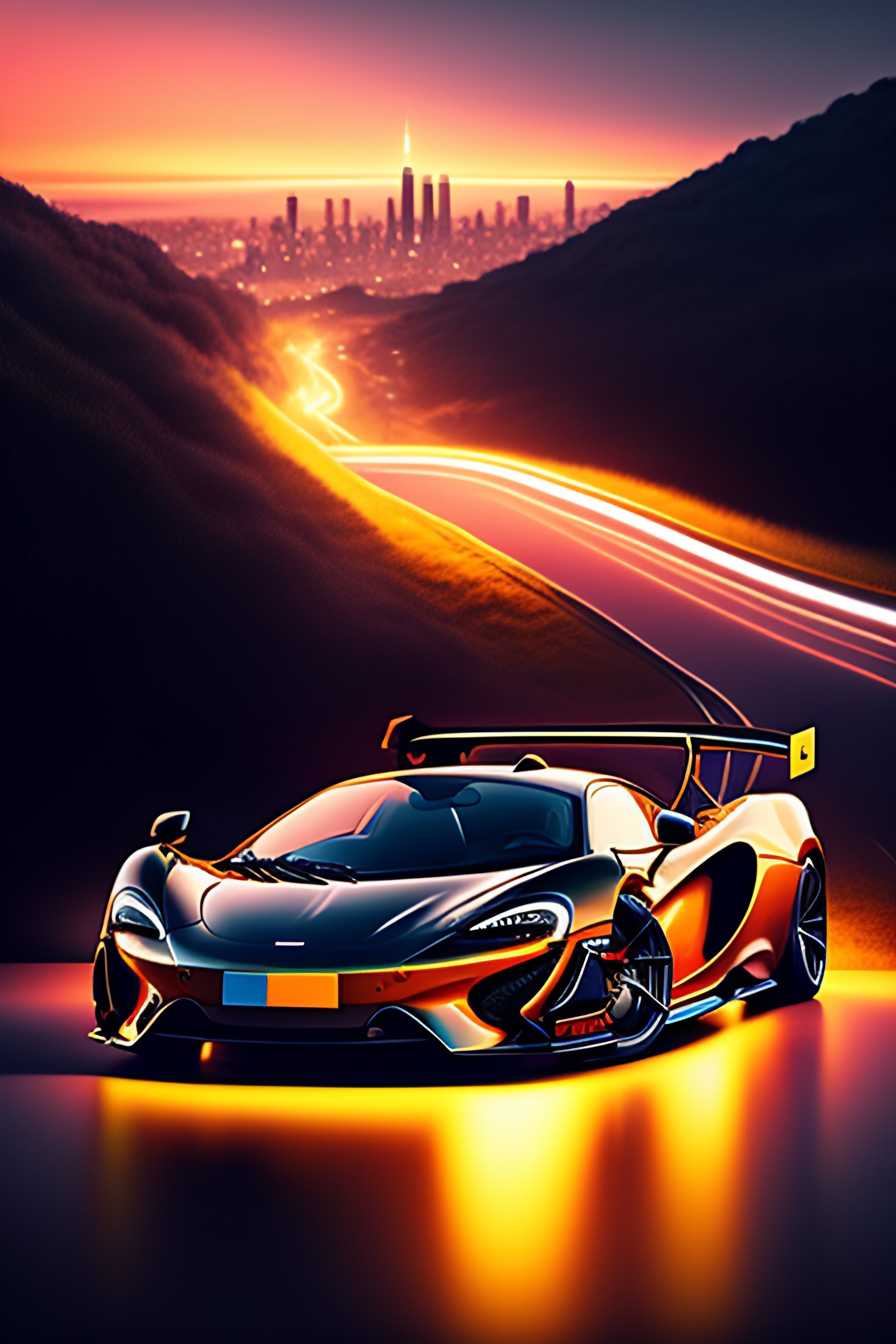 A mclaren going down a hill with the view of the city and glowing lights, ultra realistic, a bit dark, fantasy, reality
