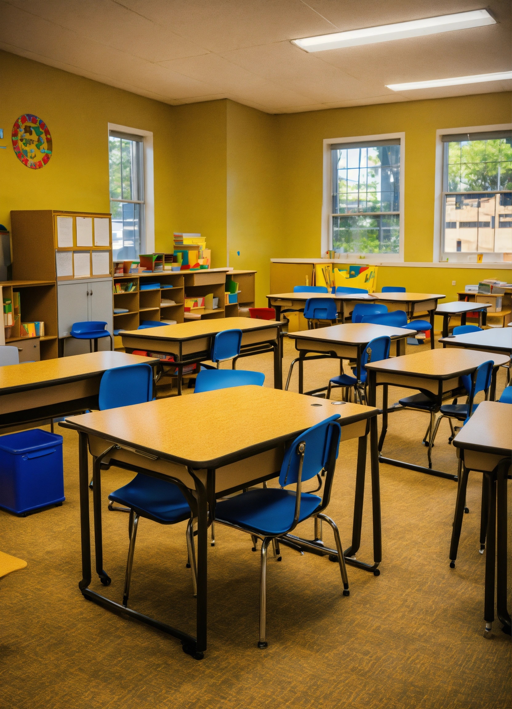 and 5 student desks with 4 chairs around each desk