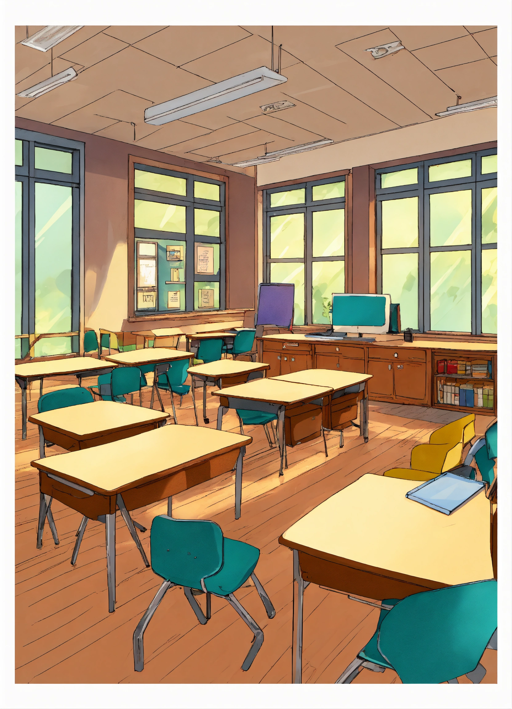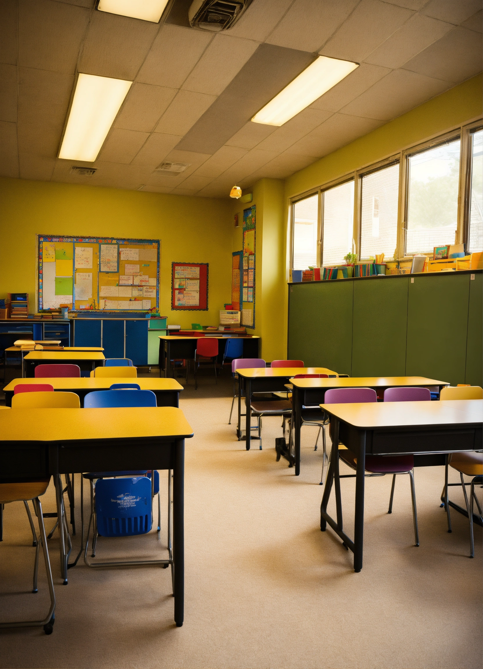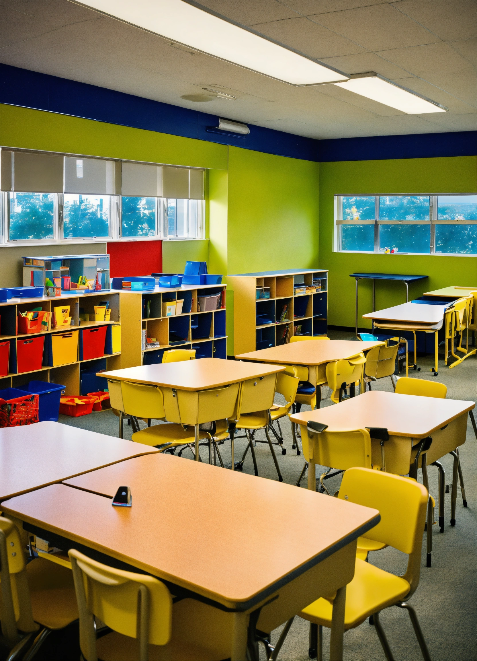 A classroom with a teachers desk
