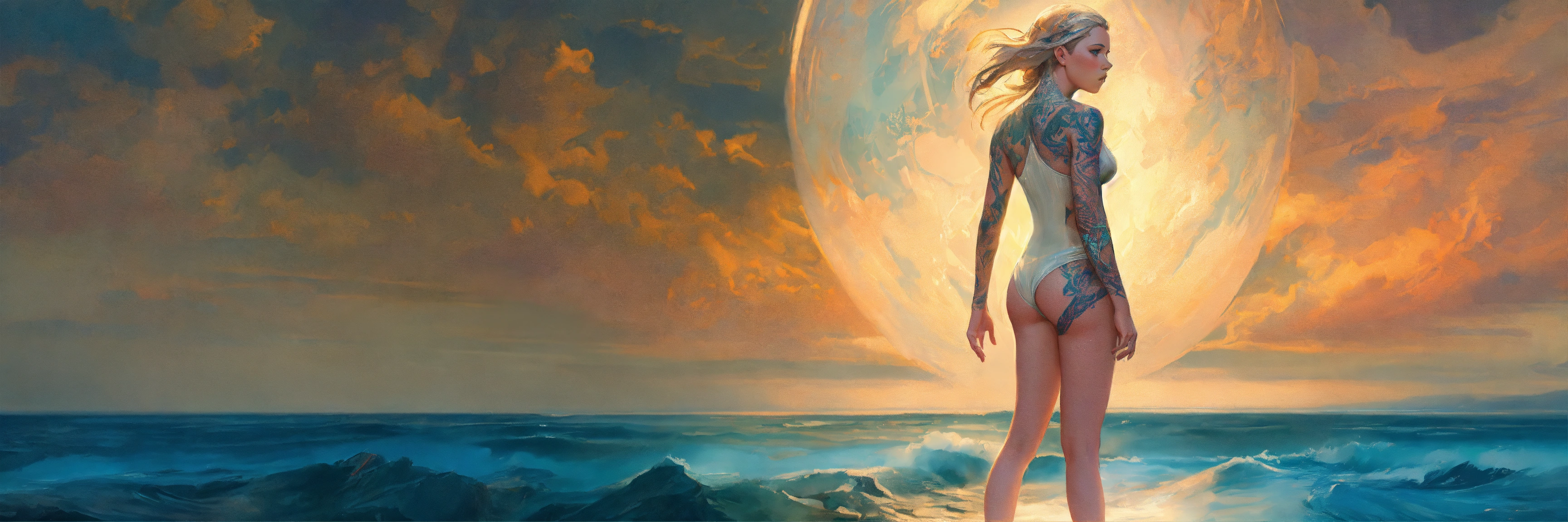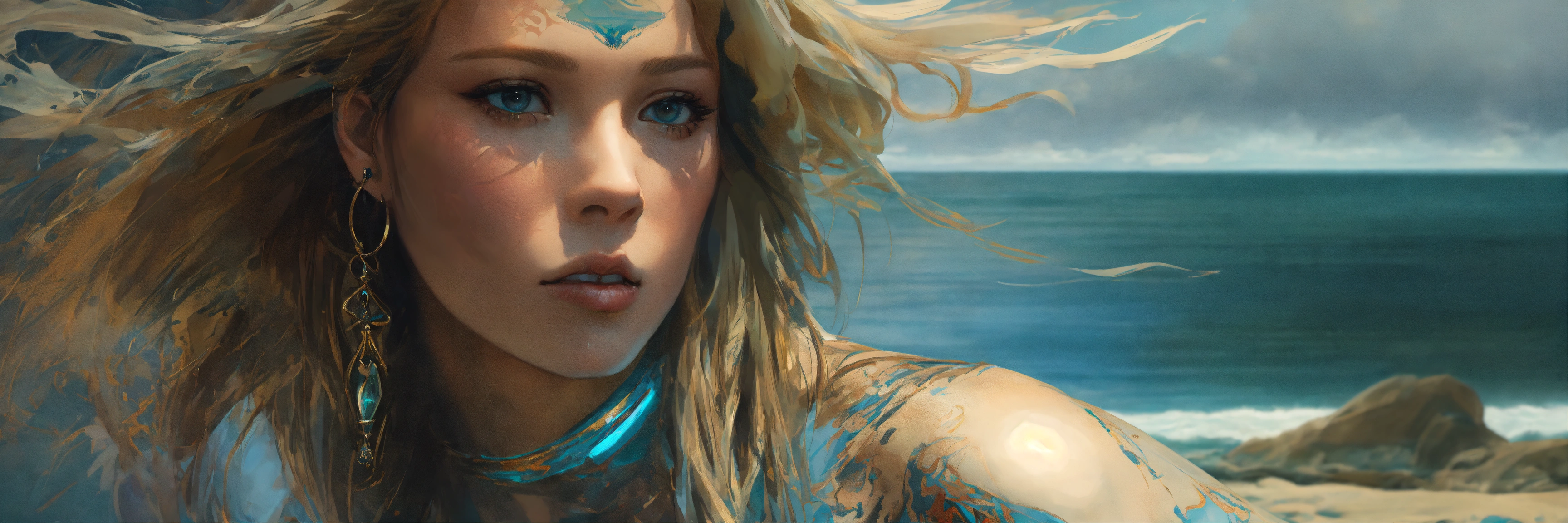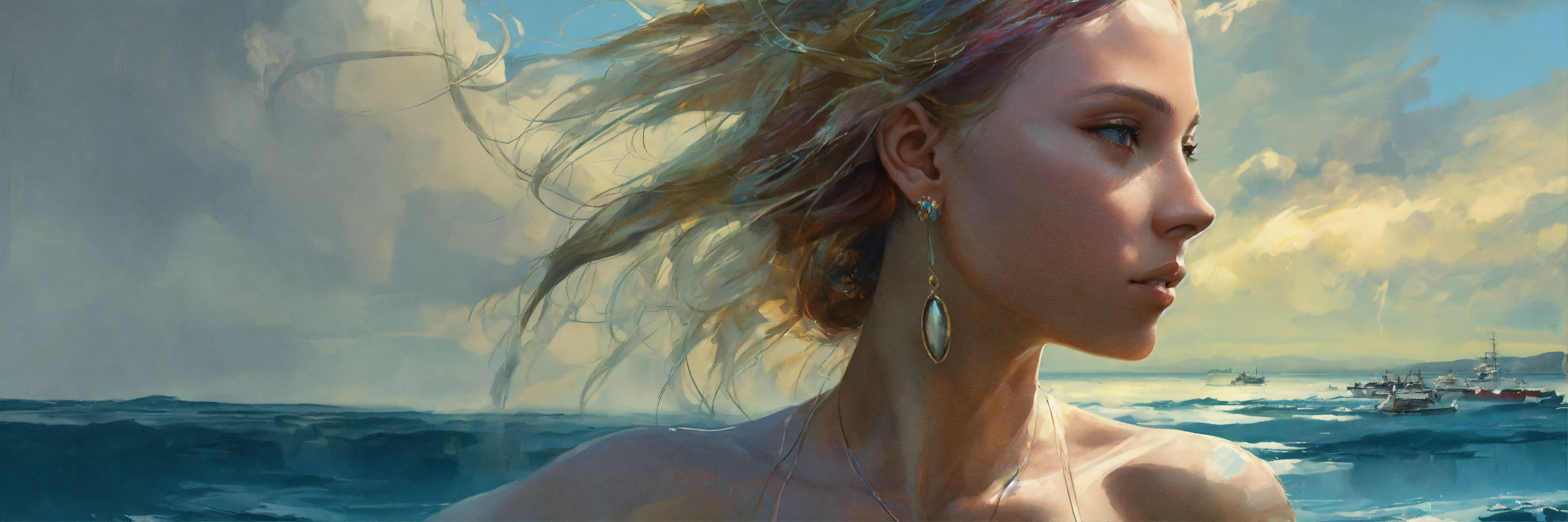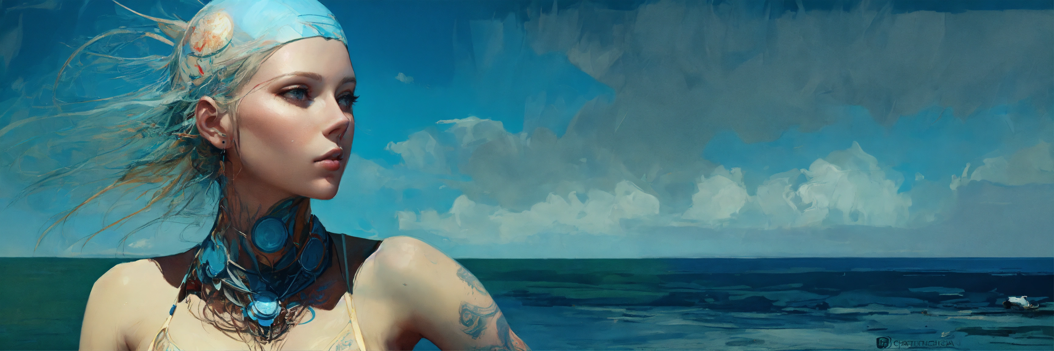 Liya silver combined gwyneth paltrow mixed scarlett johansson, professional portrait of an extraterrestrial race, tattooed man or woman, large head, shape of the head with 3d bone protrusions under the skin on the head, normal face, full-body side view, sea and clouds in the background, the sea is ocean blue, the male has a natural color, abstract beauty, approaching perfection, delicate face, dynamic, moonlight, very detailed, digital painting, artstation, concept art, smooth, sharp focus, illustration, art by carne griffiths and wadim kashin.