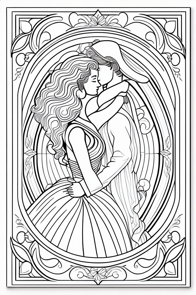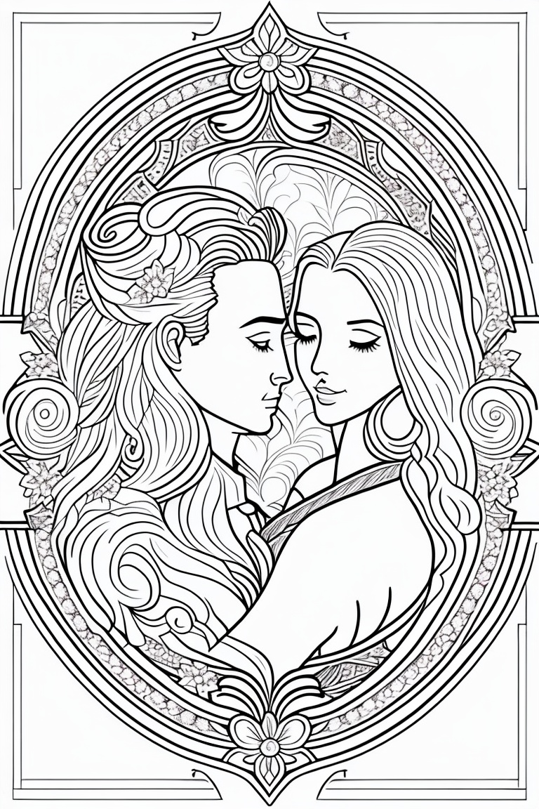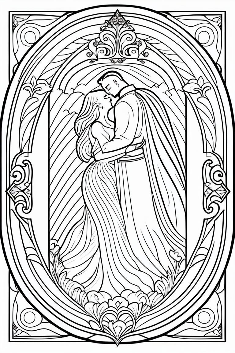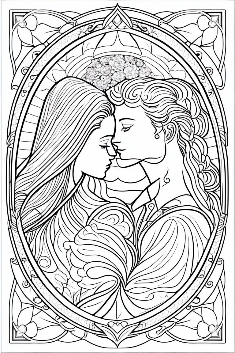 Coloring pages for adults, bold lines, dark lines, valentine day, mandala couple, white background, clean line art, fine line art, fantasy, prince, princess, mandala hearts, kisses, romantic scenes, romantic hugs, wedding scenes, hot hugs, brides, lesbian couple, lgbt couples