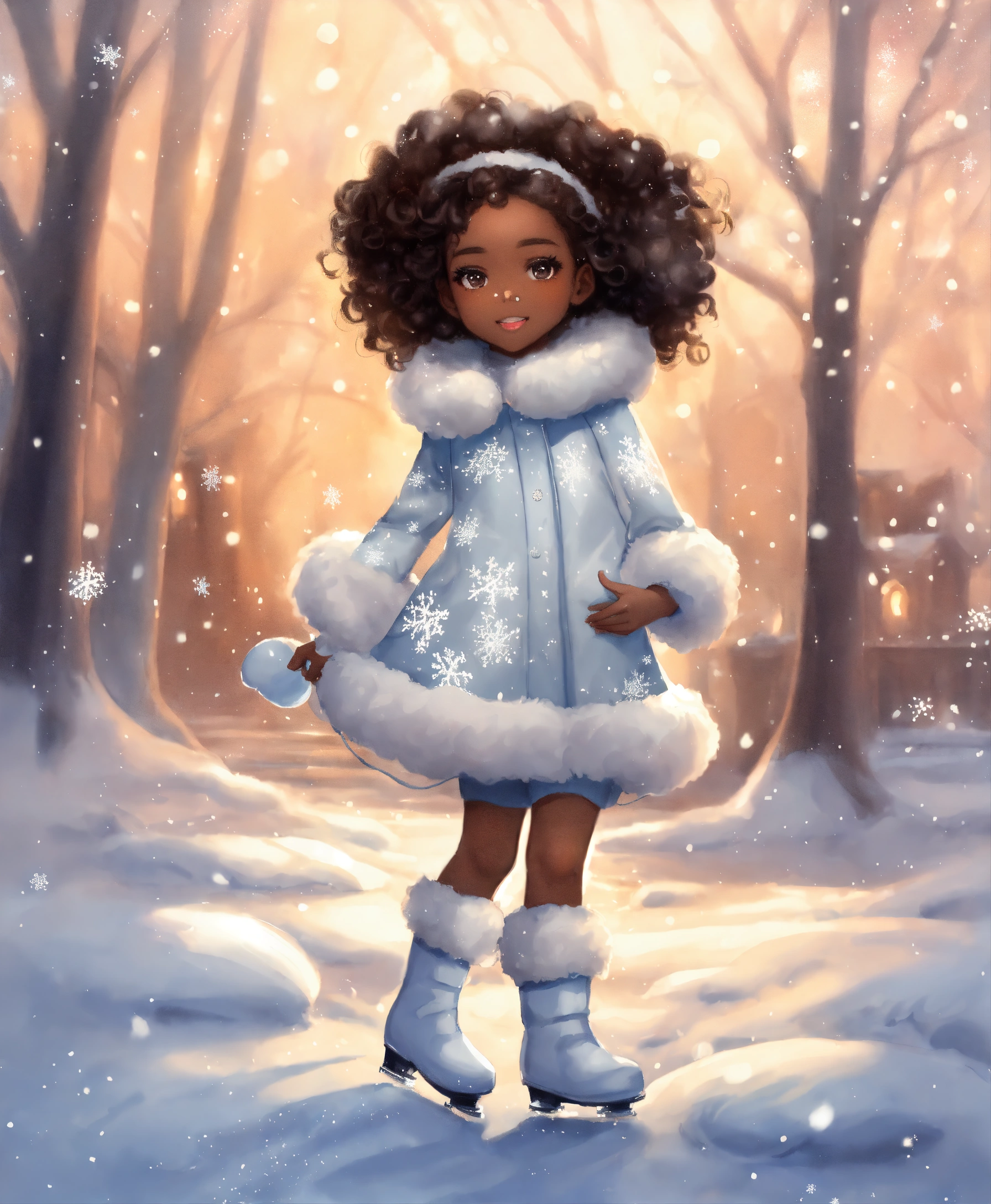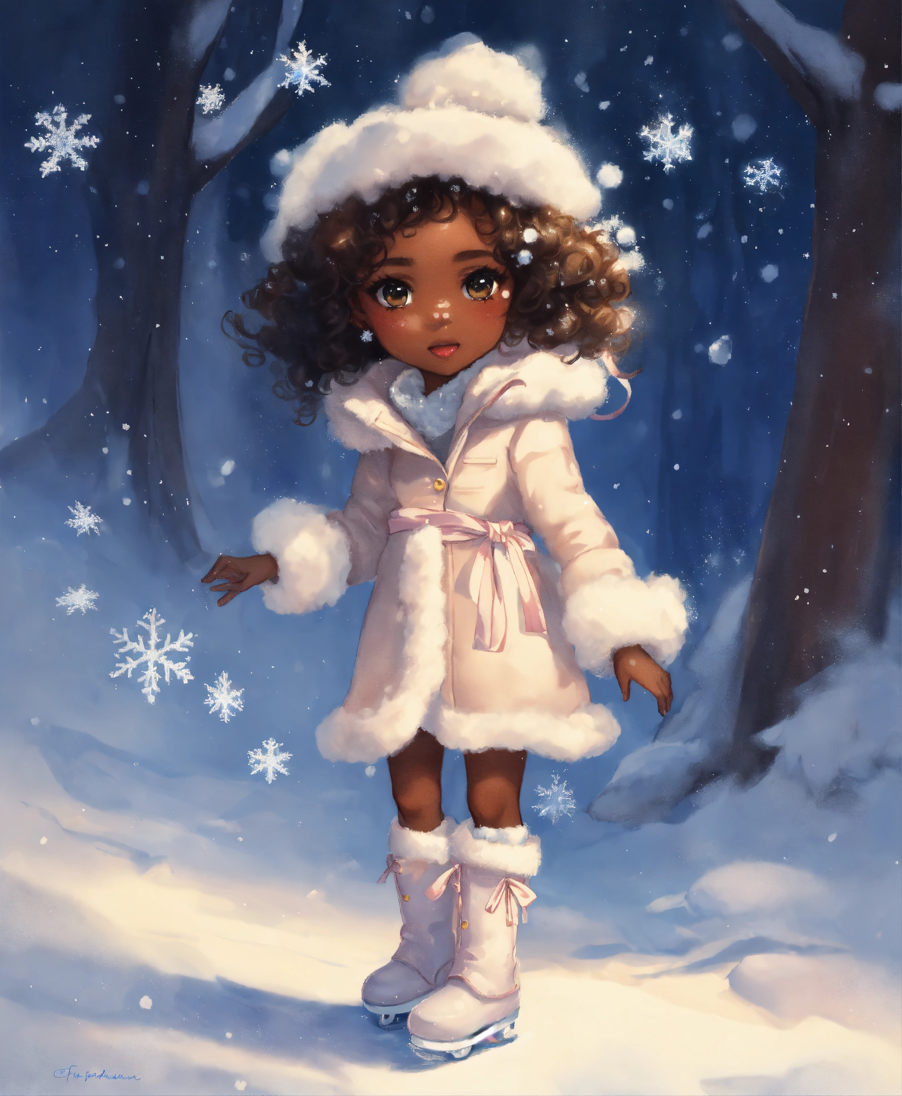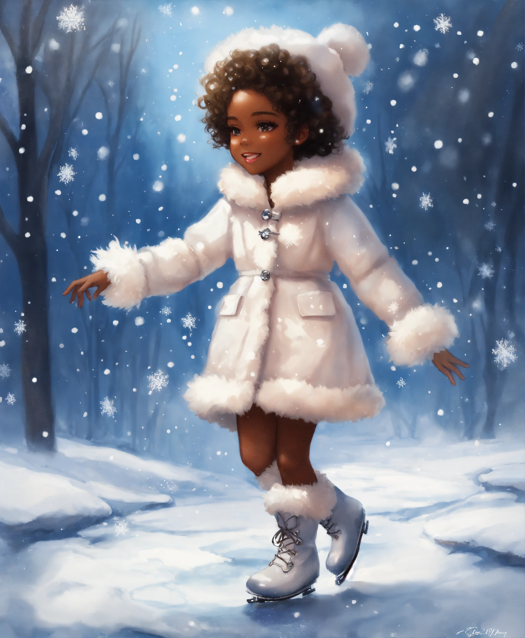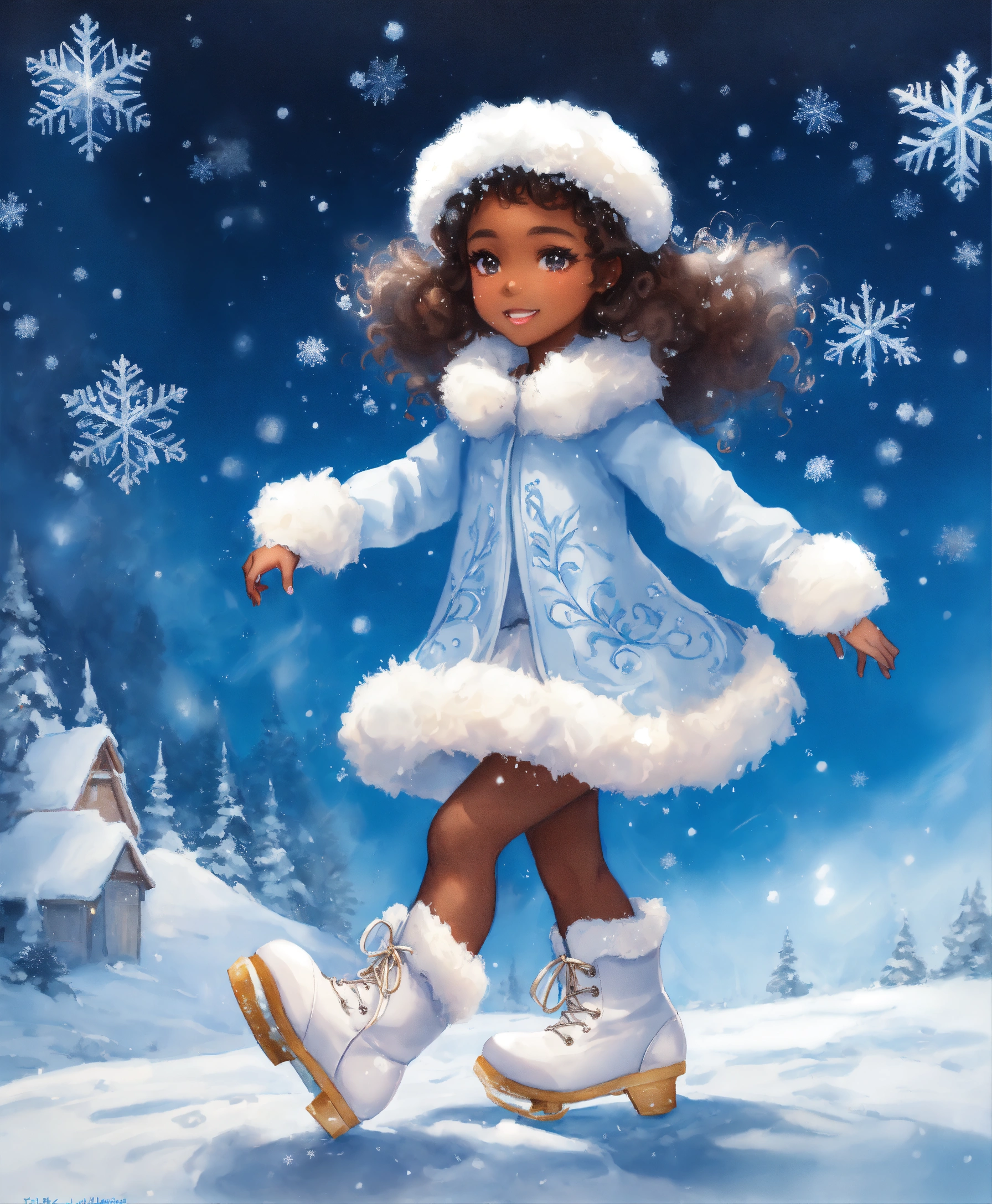 Water painting, full body, beautiful black little girl, wearing white snow boots, frizzy and bouncy curls, ice princess, fur coat, wearing winter white gloves, white frozen snowflake blizzard ice, ice skating, fairy tale, gentle snowflakes descending