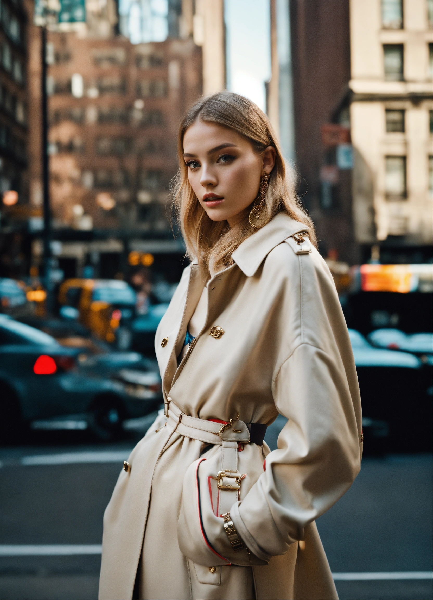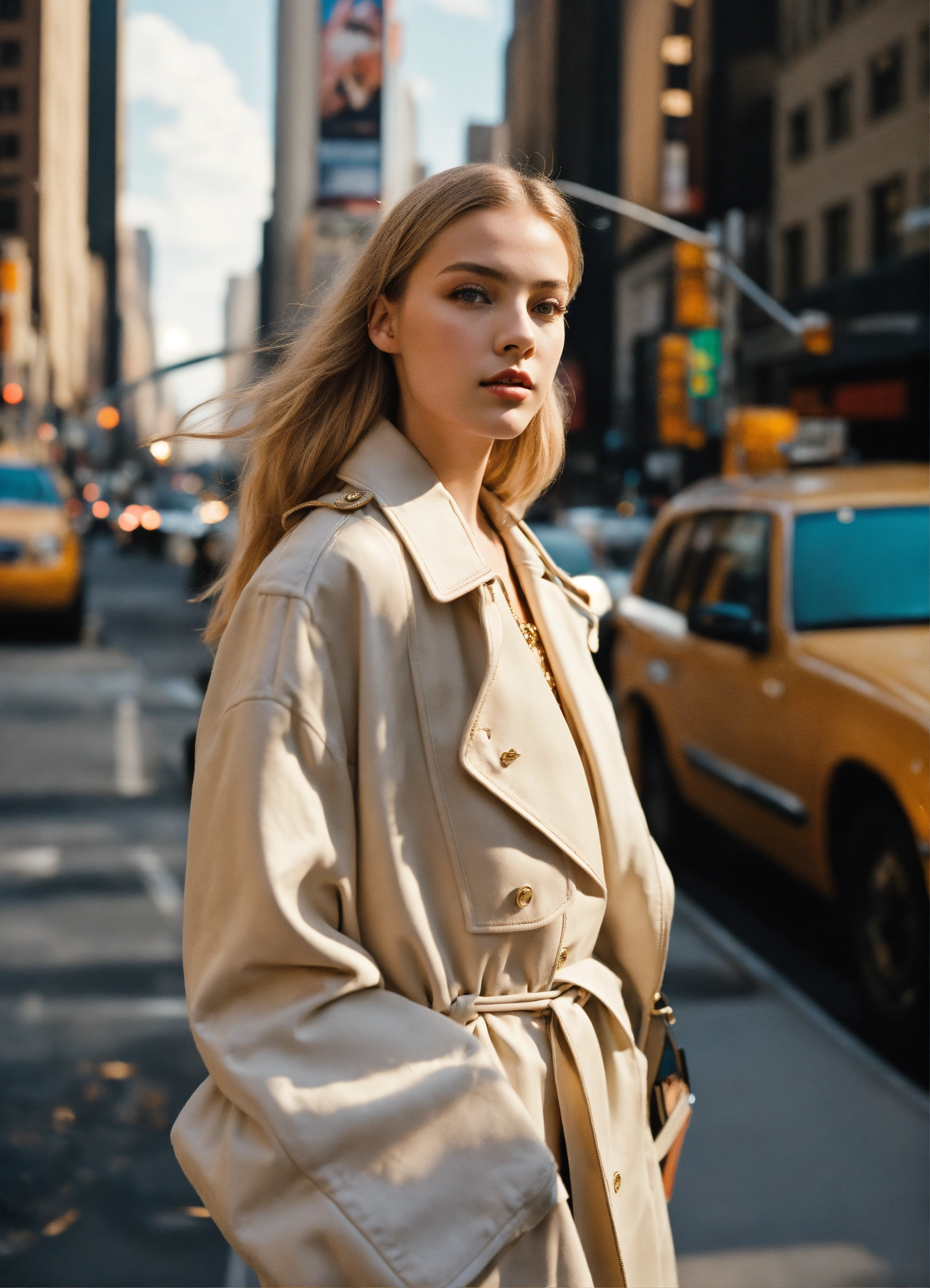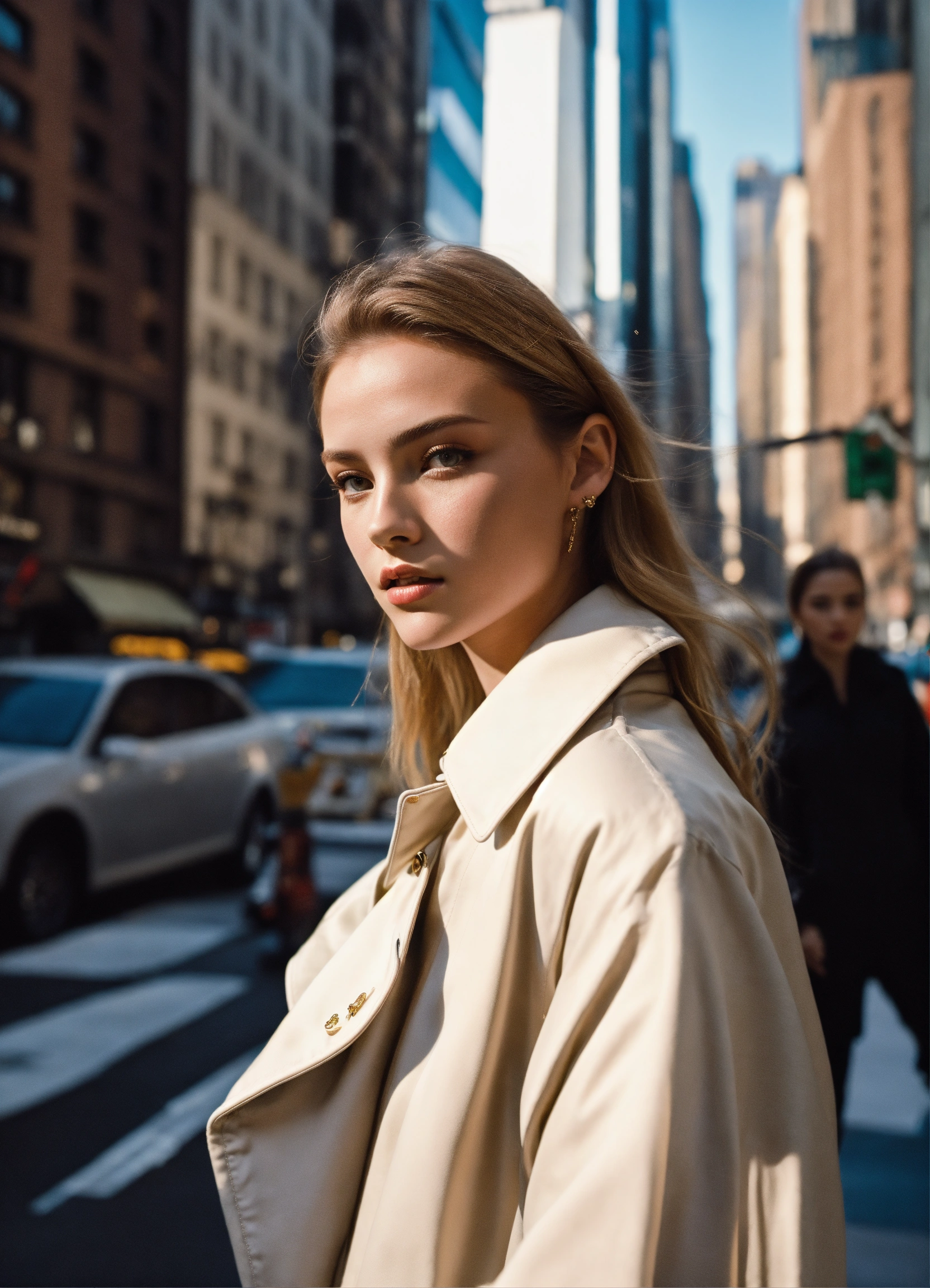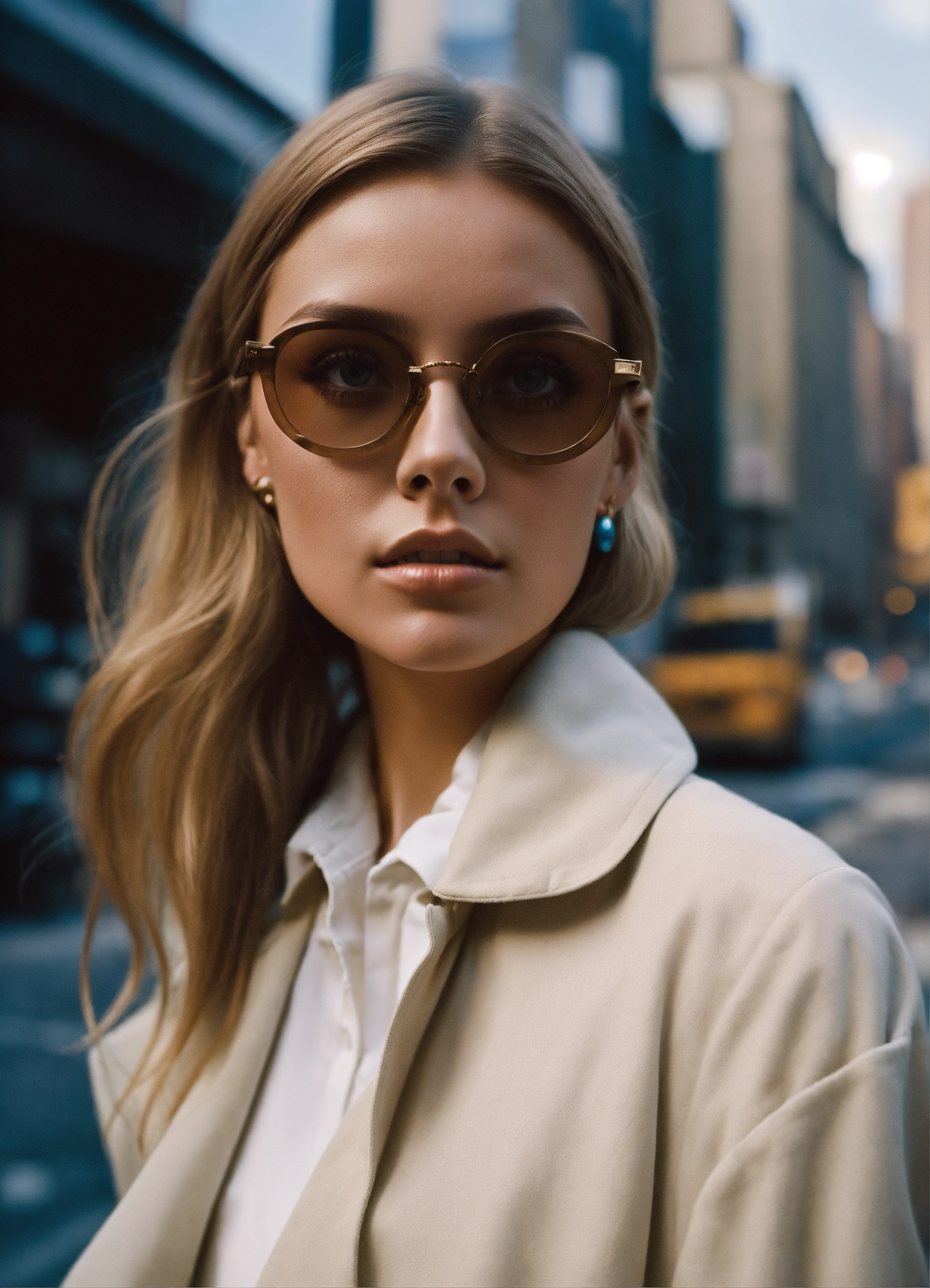 Amateur prada street fashion photoshoot of a beautiful 3d russian girl in new york, interesting poses, photorealistic, white and light beige color, photo shoot, cinematic still shot, magazine photography, 35mm, film look