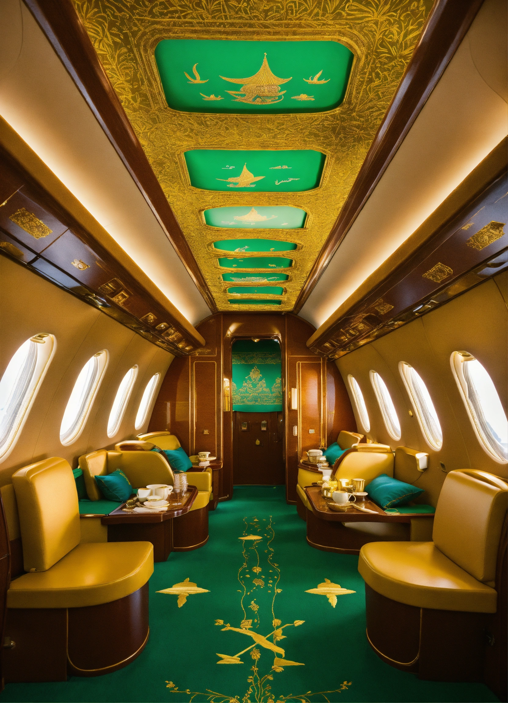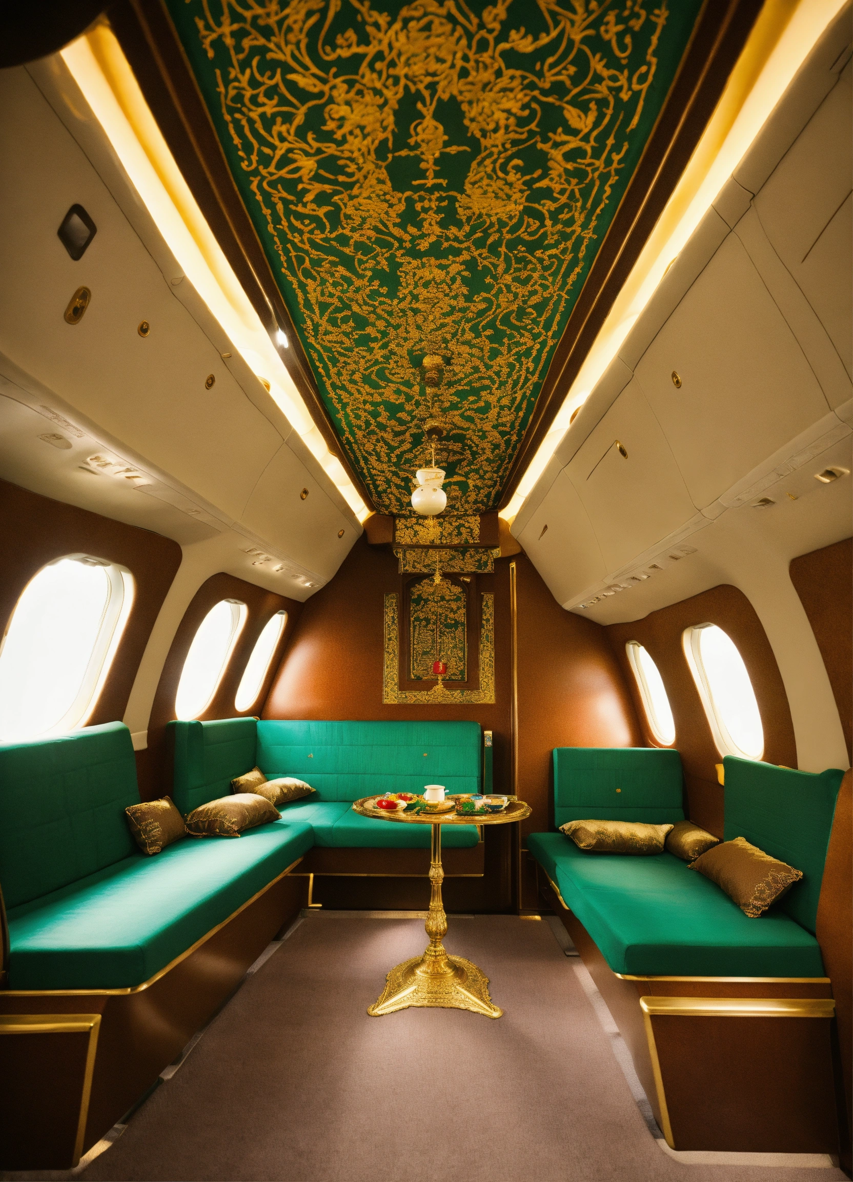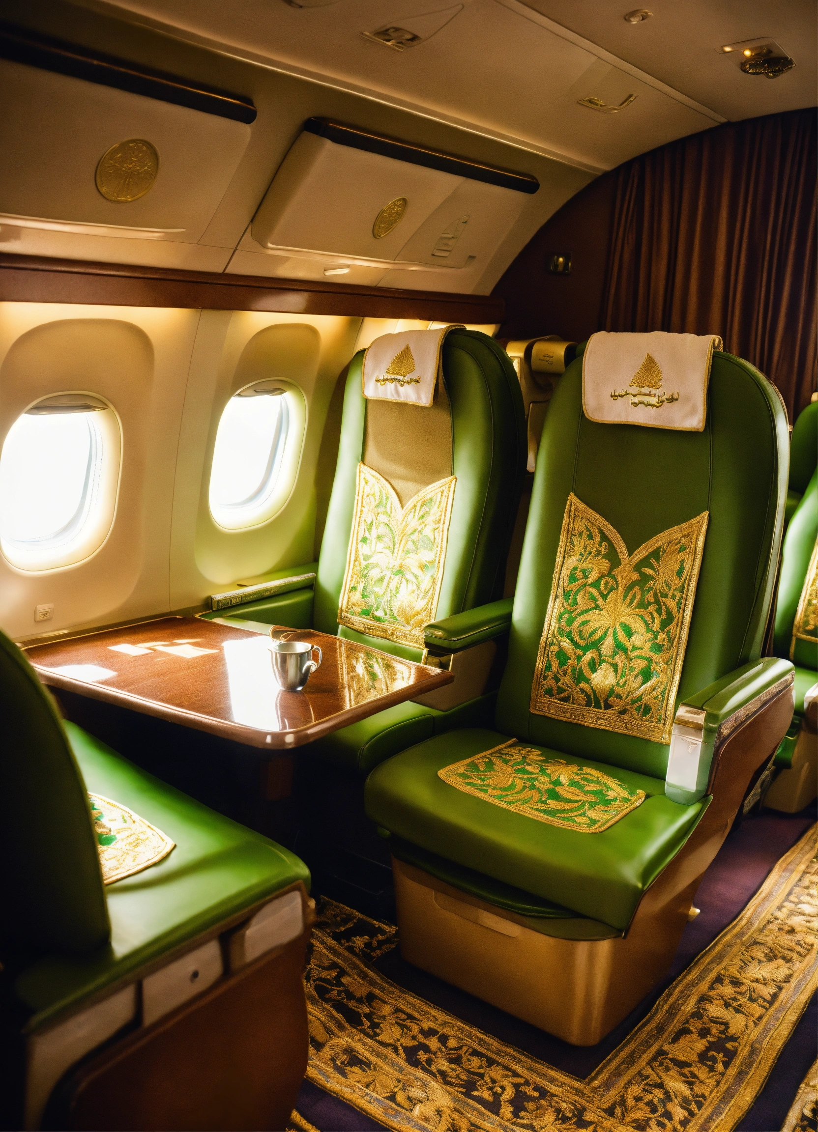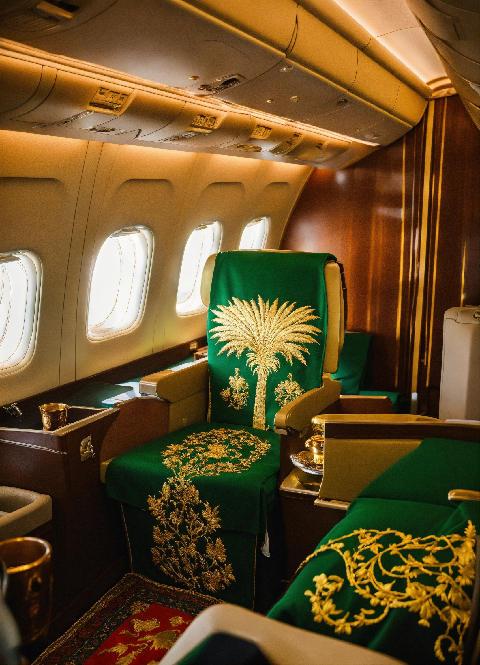 Airplane interior with seats and gold palms embroidery arabic coffee set pot dala laban tv baroque prayer room saudi flag green