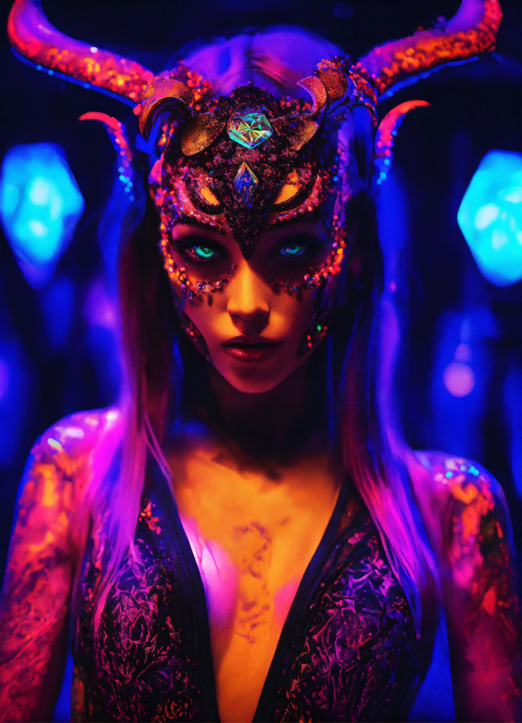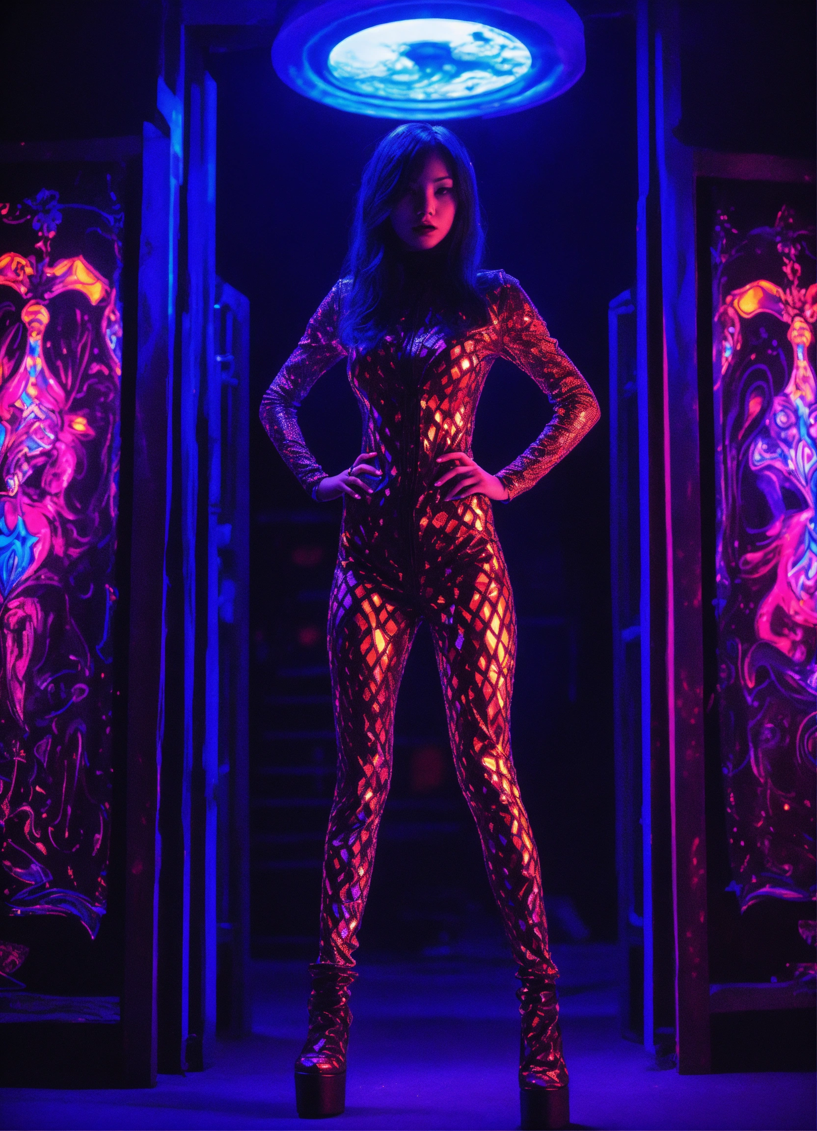 Full body photorealistic female the grudge in a diamond suit in a blacklight dmt demon psytrance club