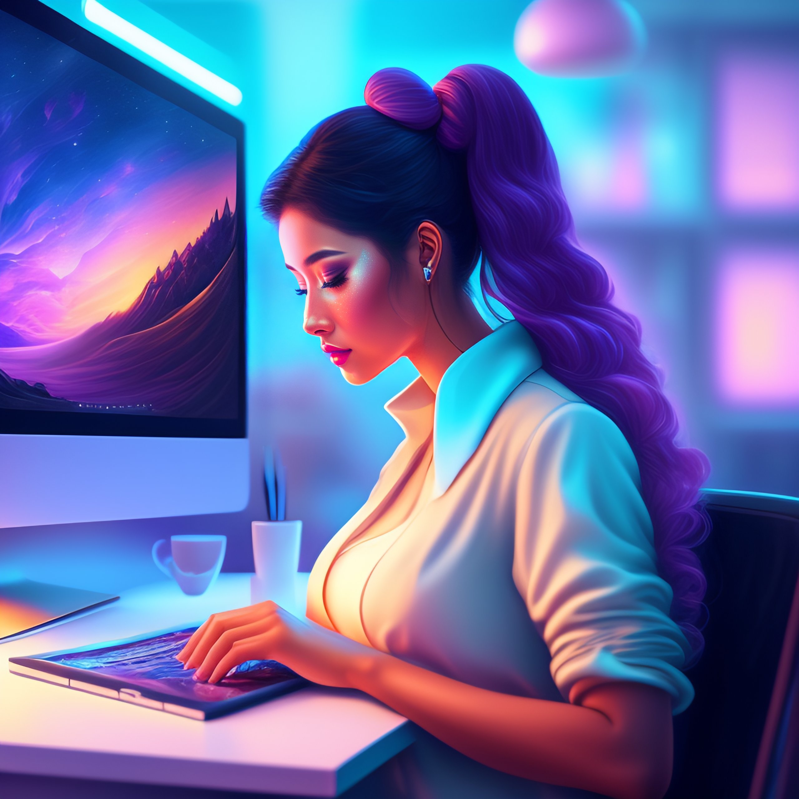 Woman programming on her laptop, coding aesthetic, fantasy, pastel colors aesthetic, highly detailed, digital painting, concept art, illustration