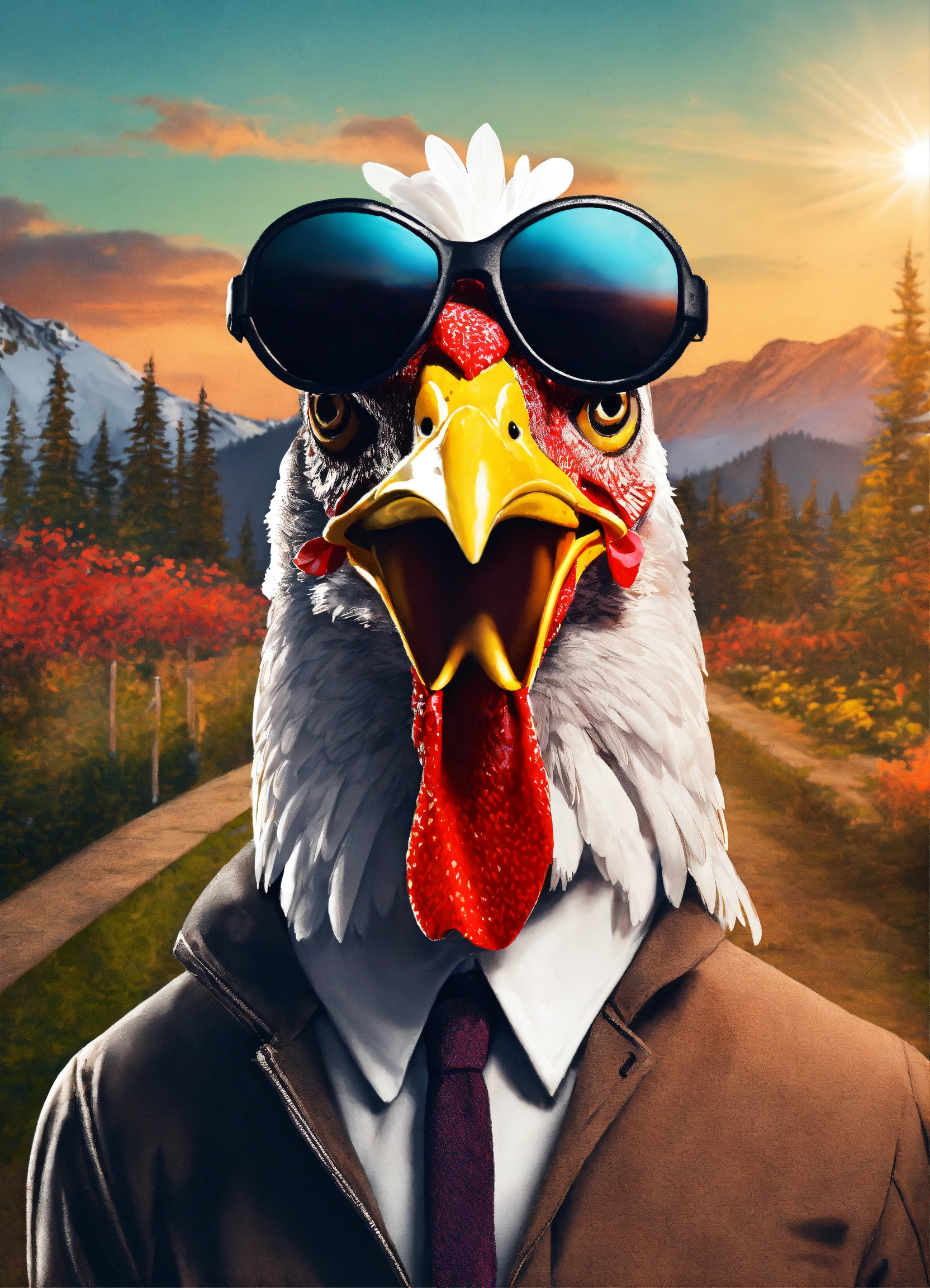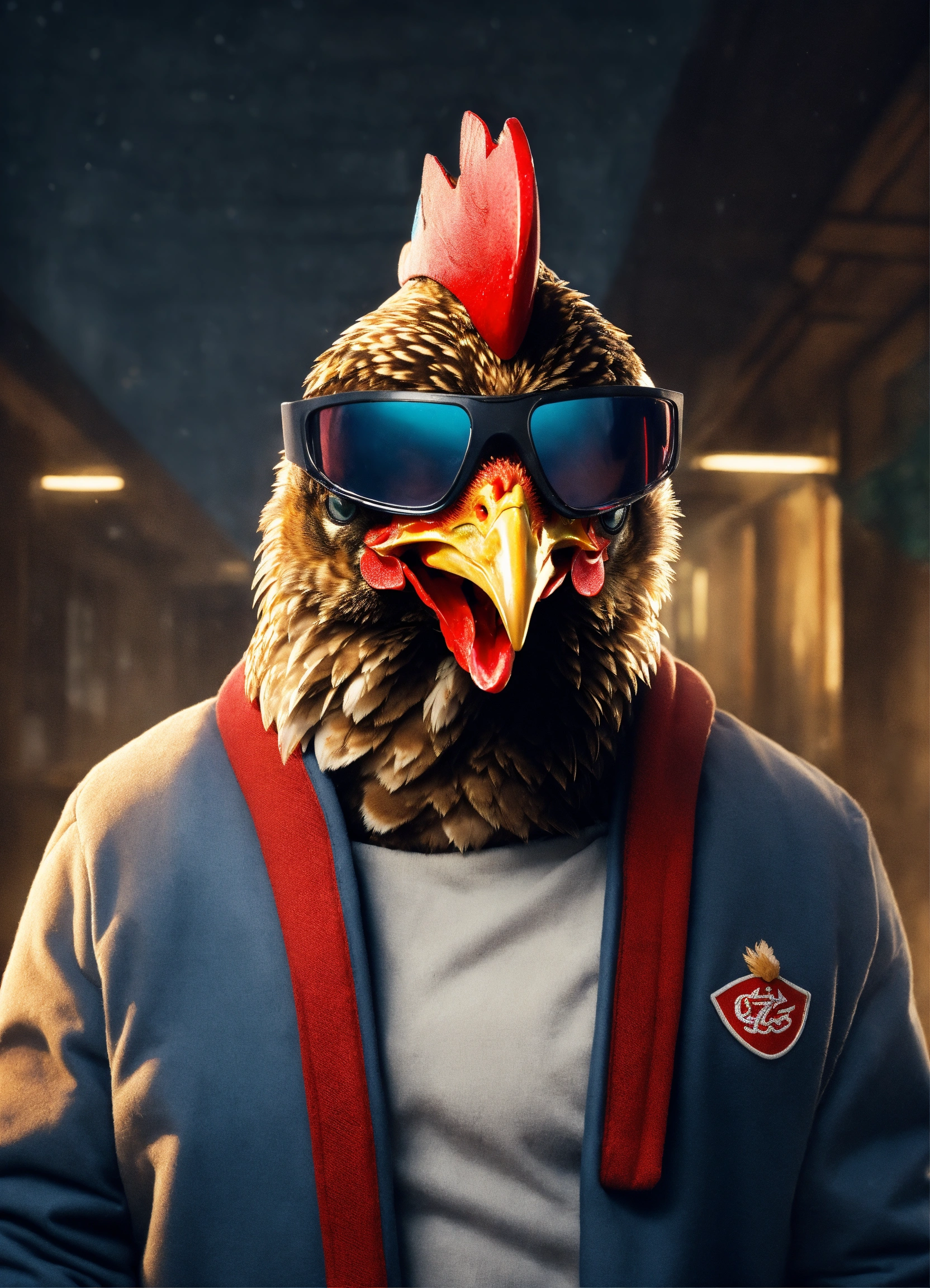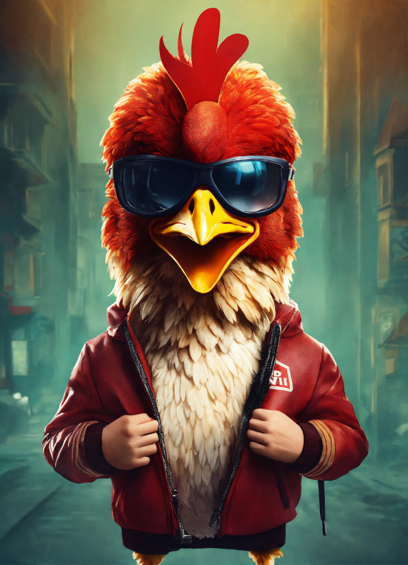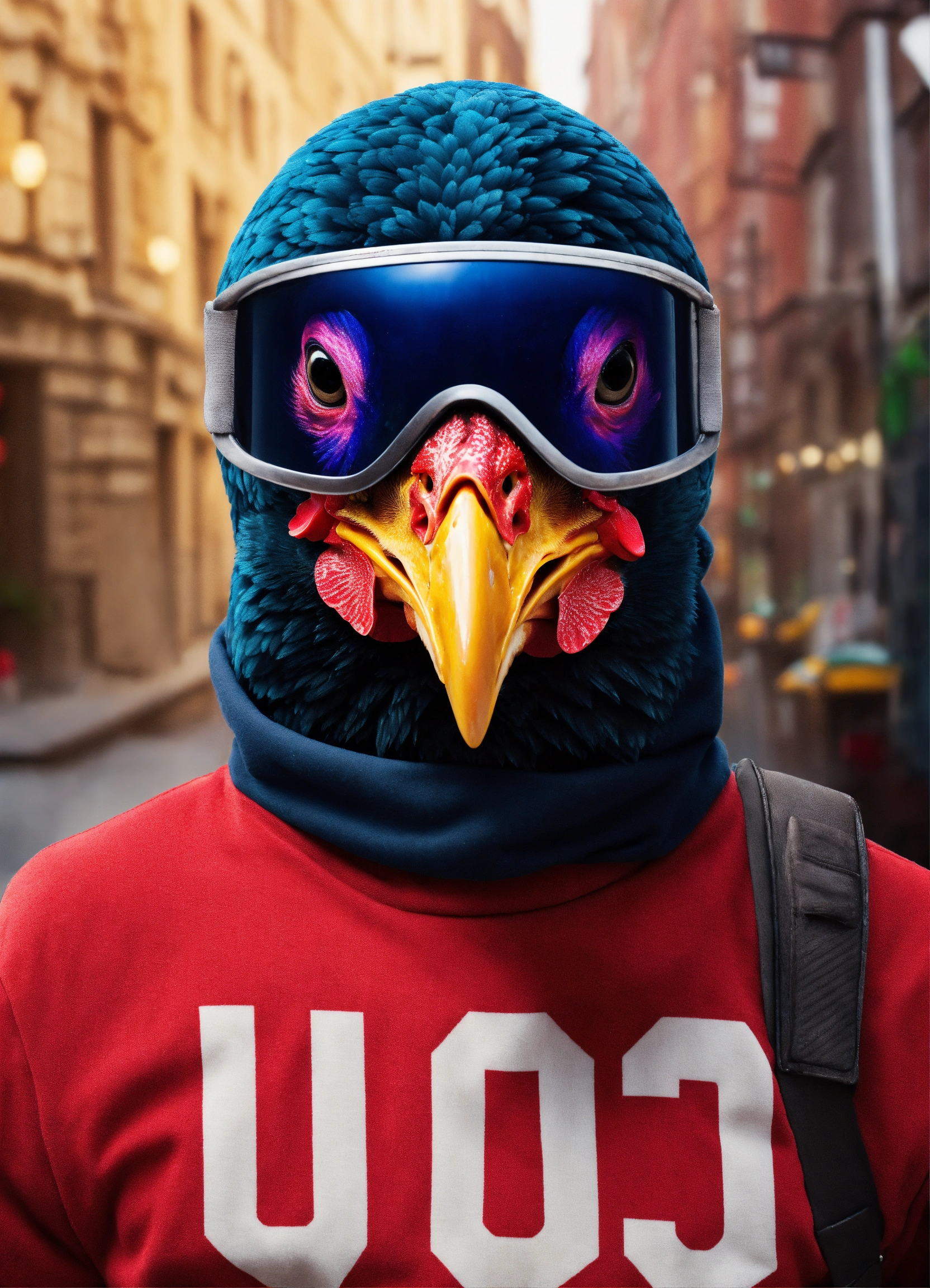 A chicken wearing a ski mask cause up logo robbery heist