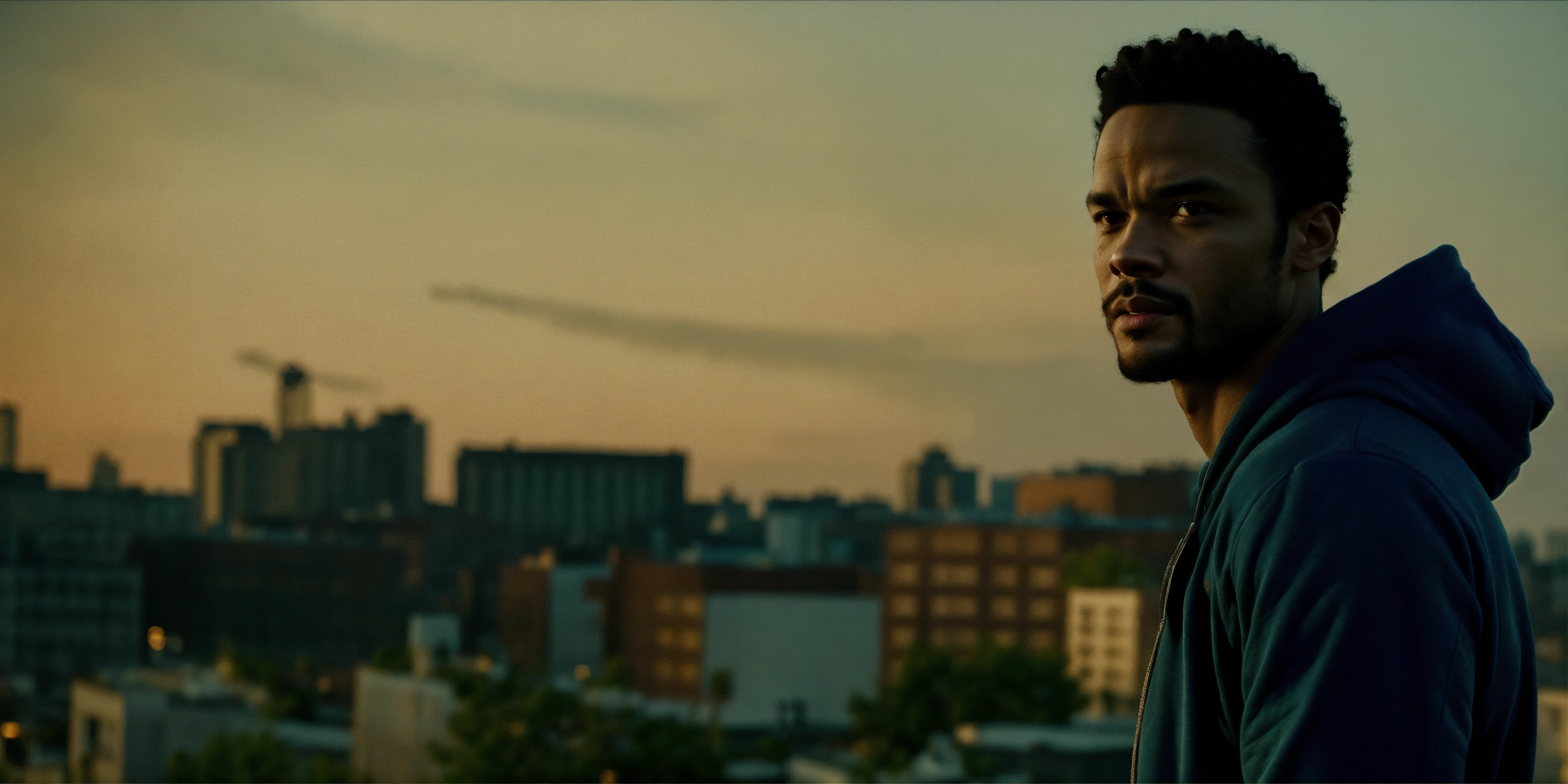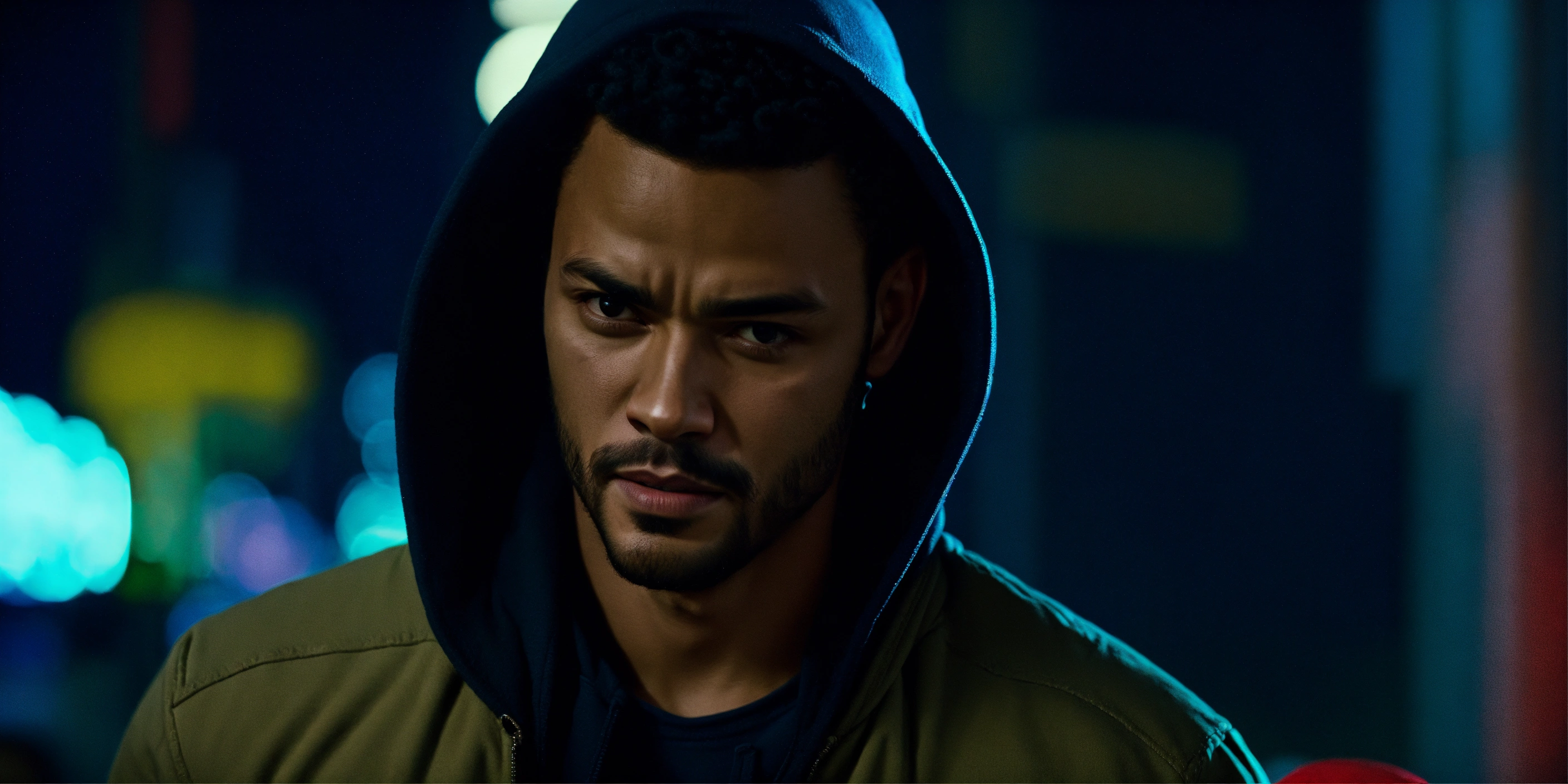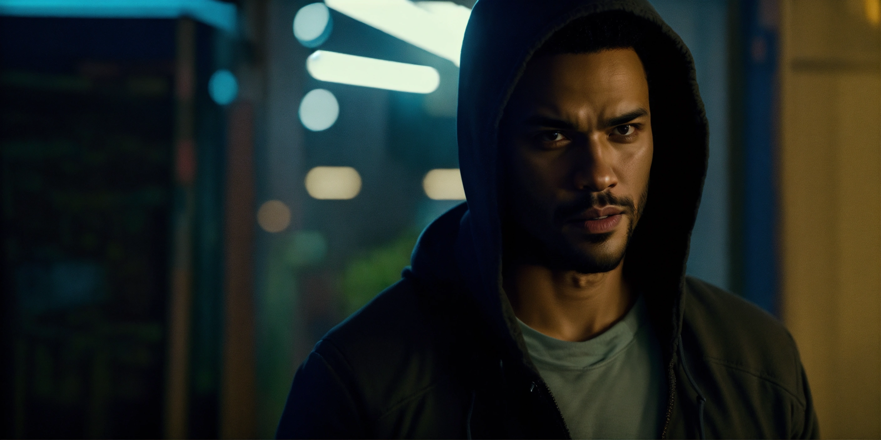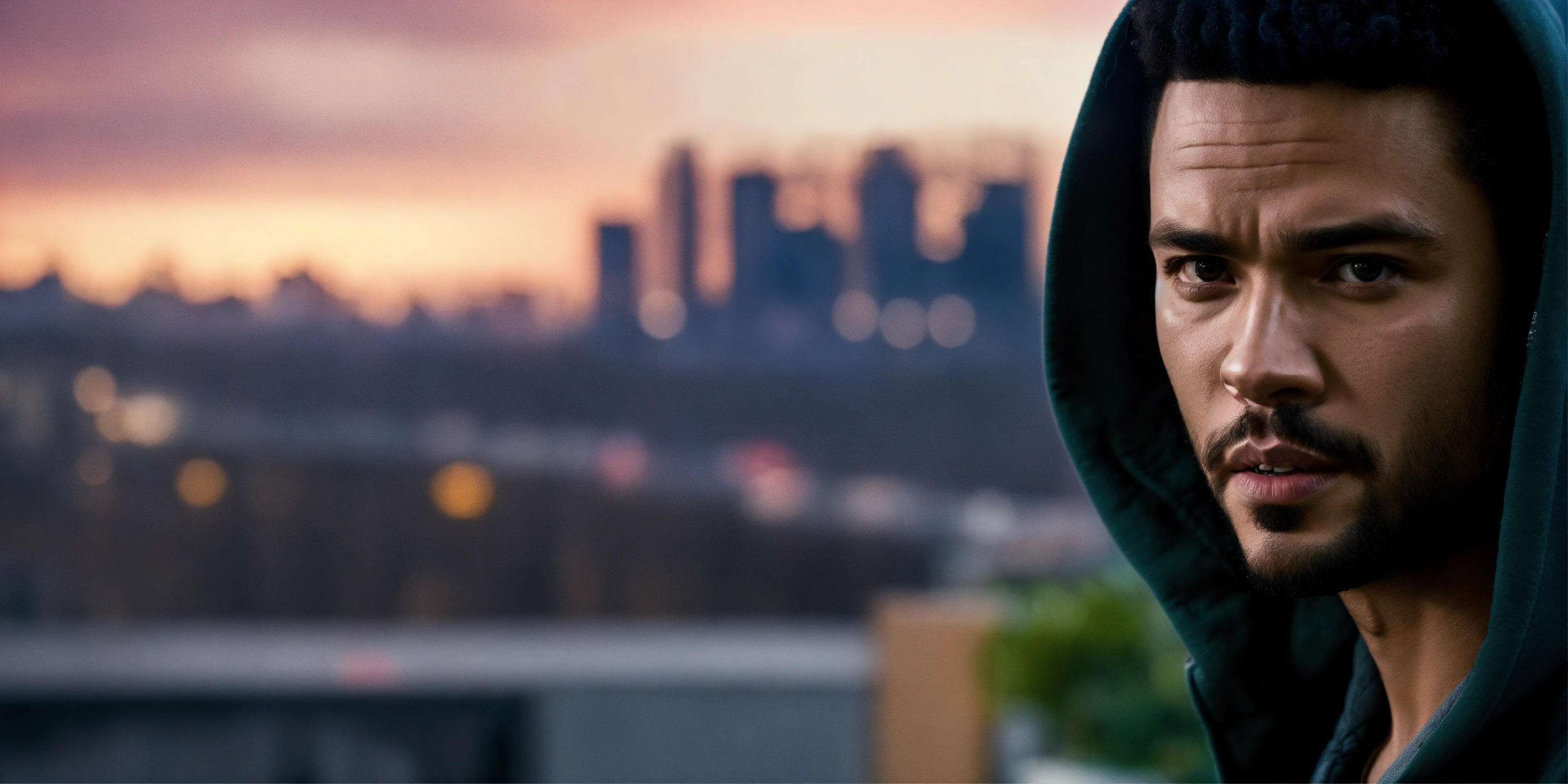Handsome nice eka darville, zombie-infested city, dark, cinematic, jessica jones style, short hair, short temples, soft smile, hoodie