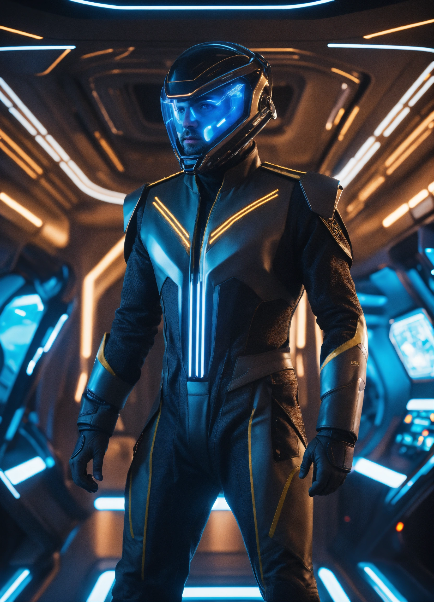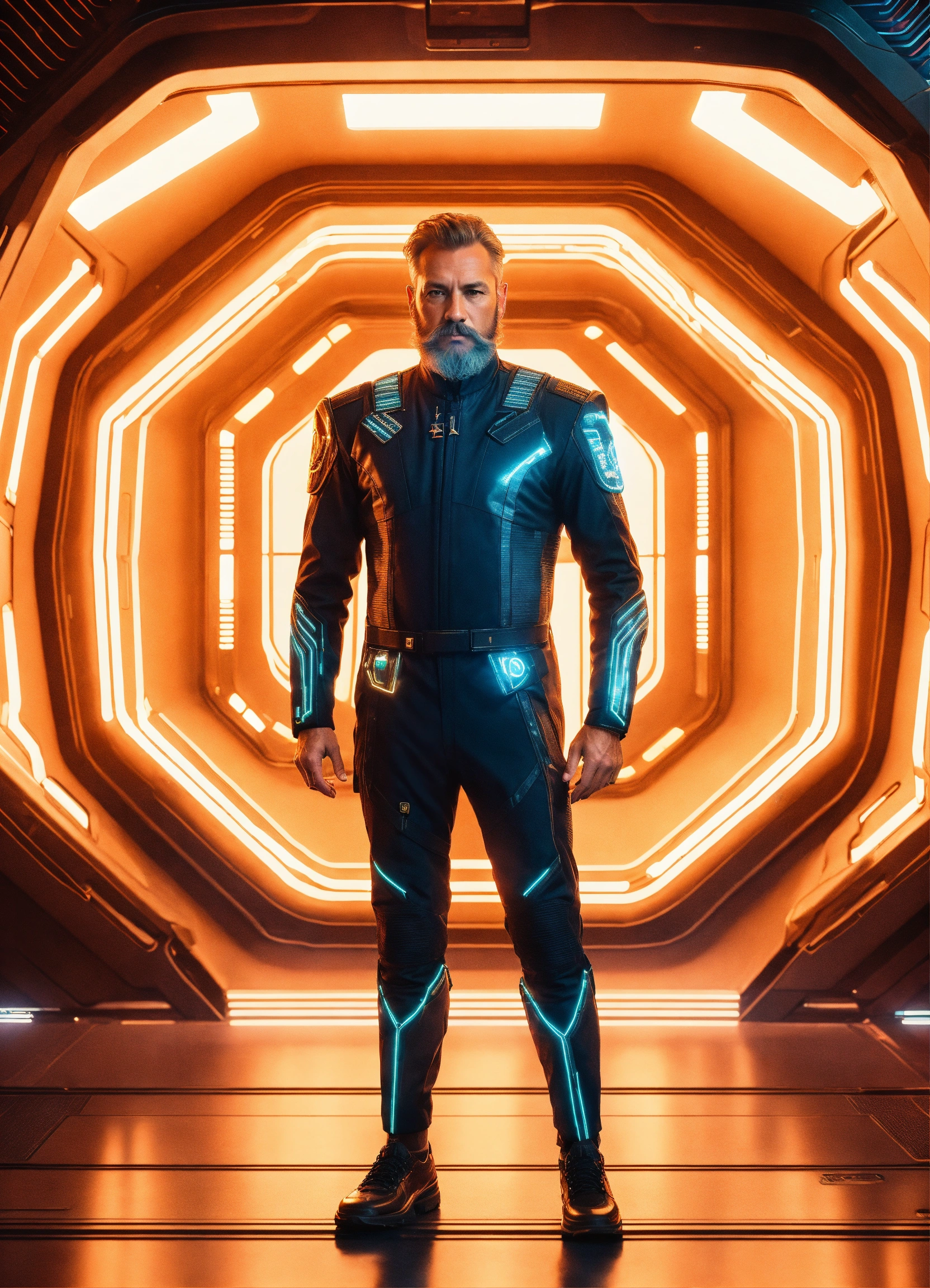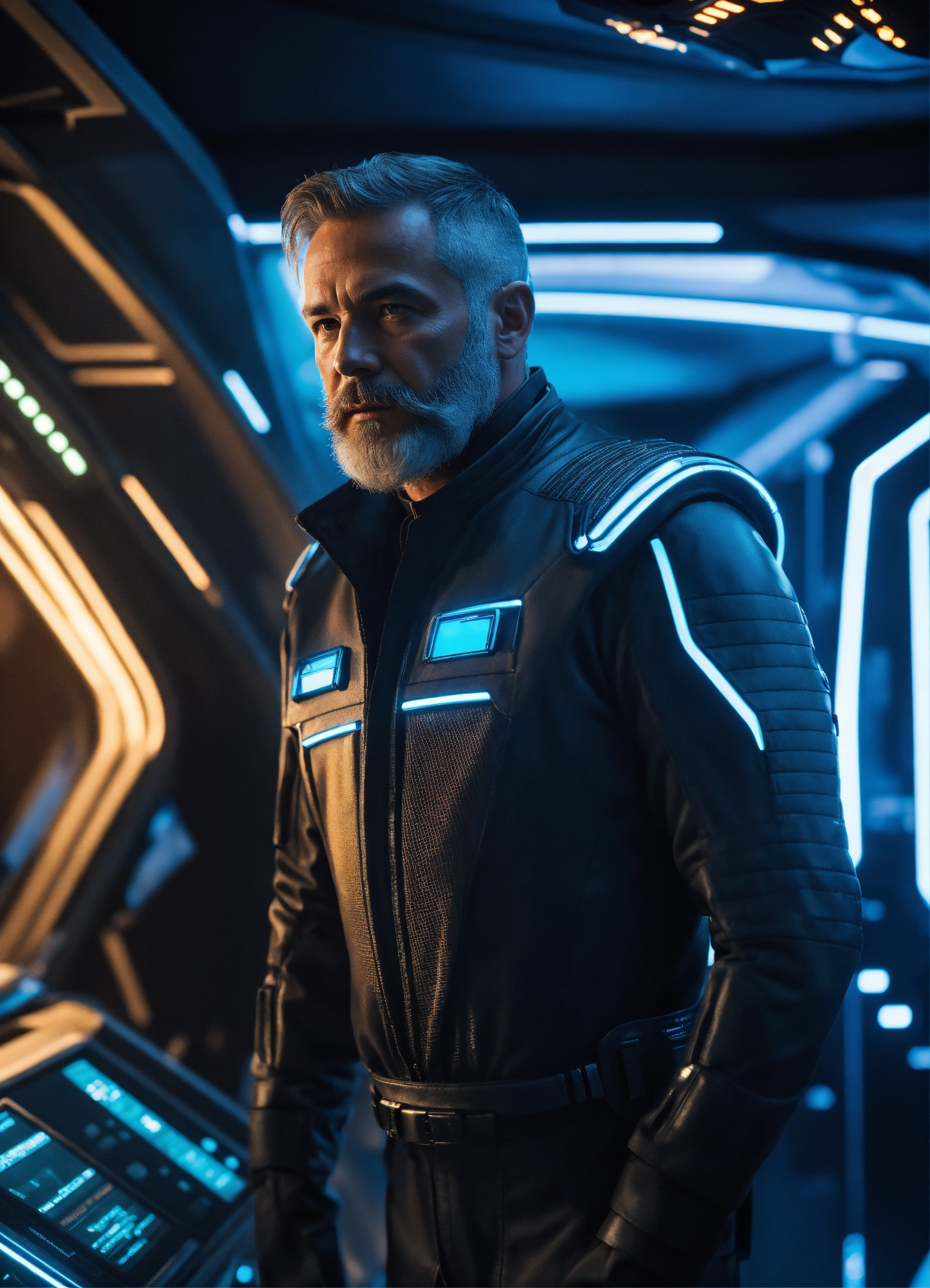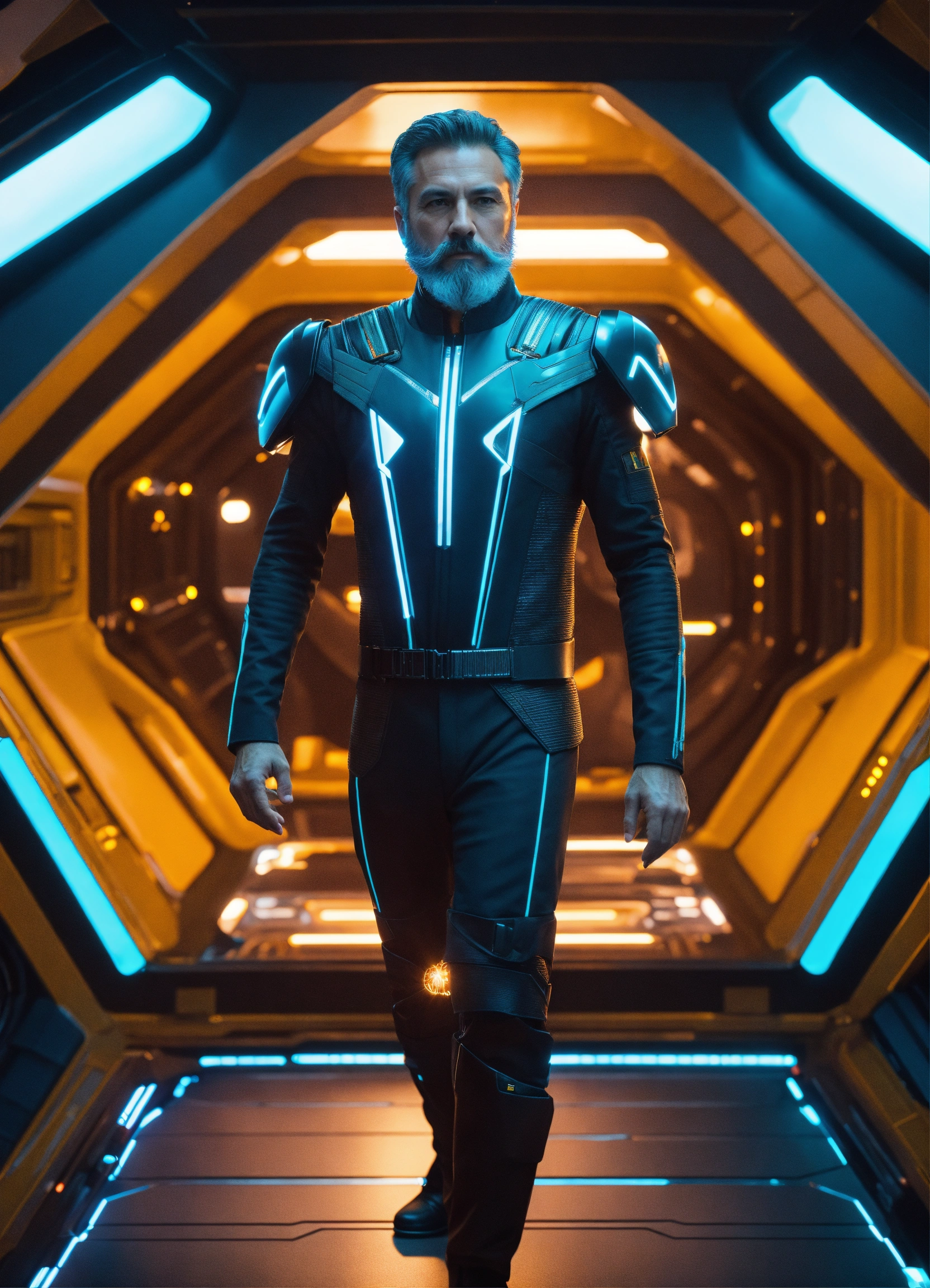50 year old masculine star commander with trim beard is wearing a sleek futuristic uniform standing in a hi tech alien starship, 8k, tron