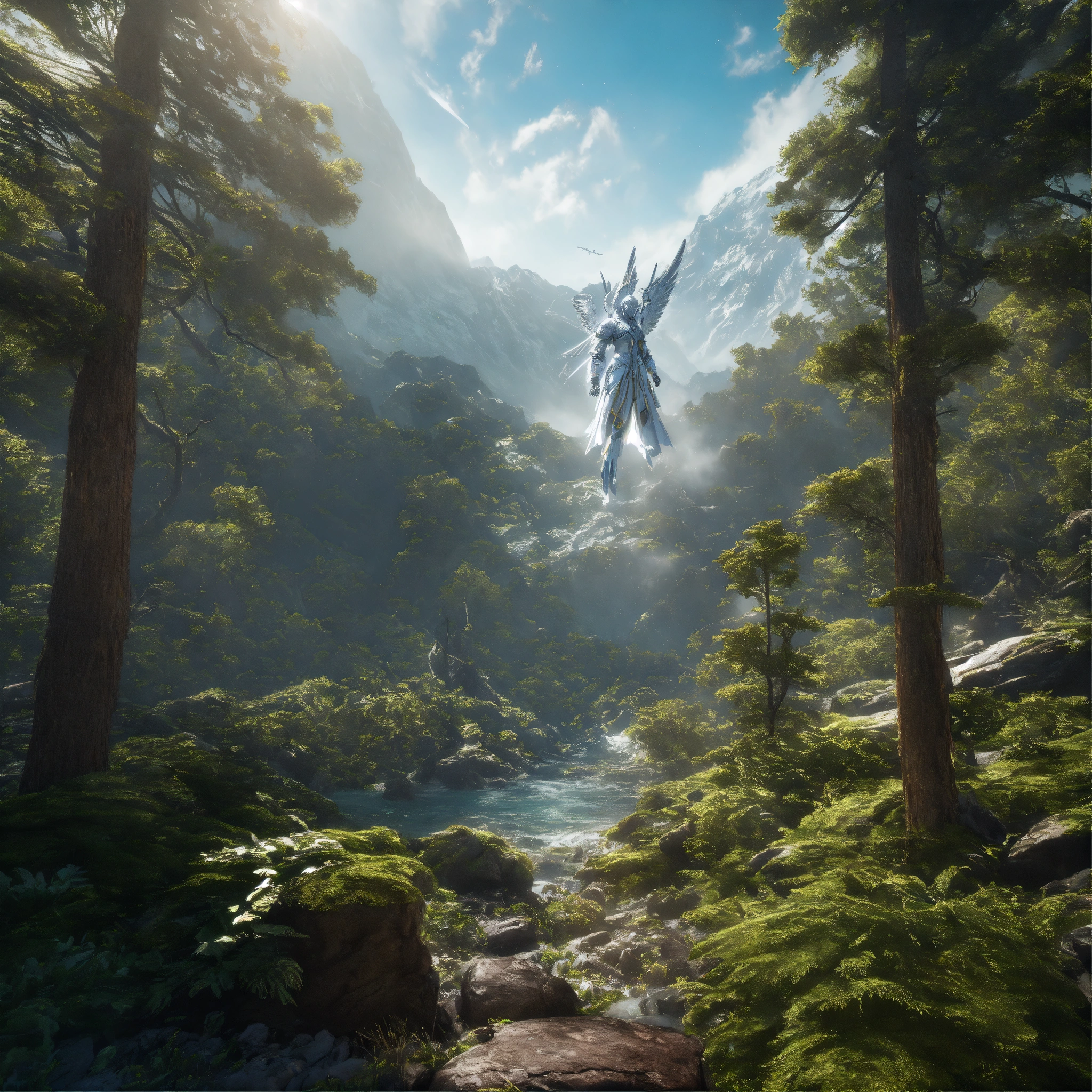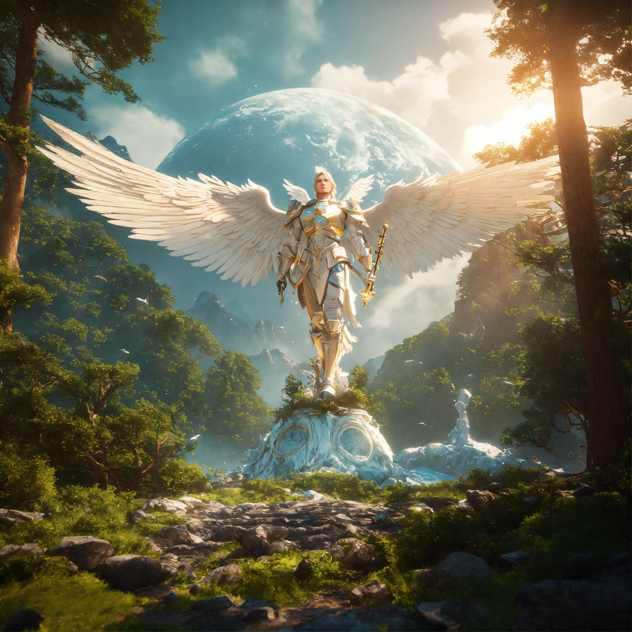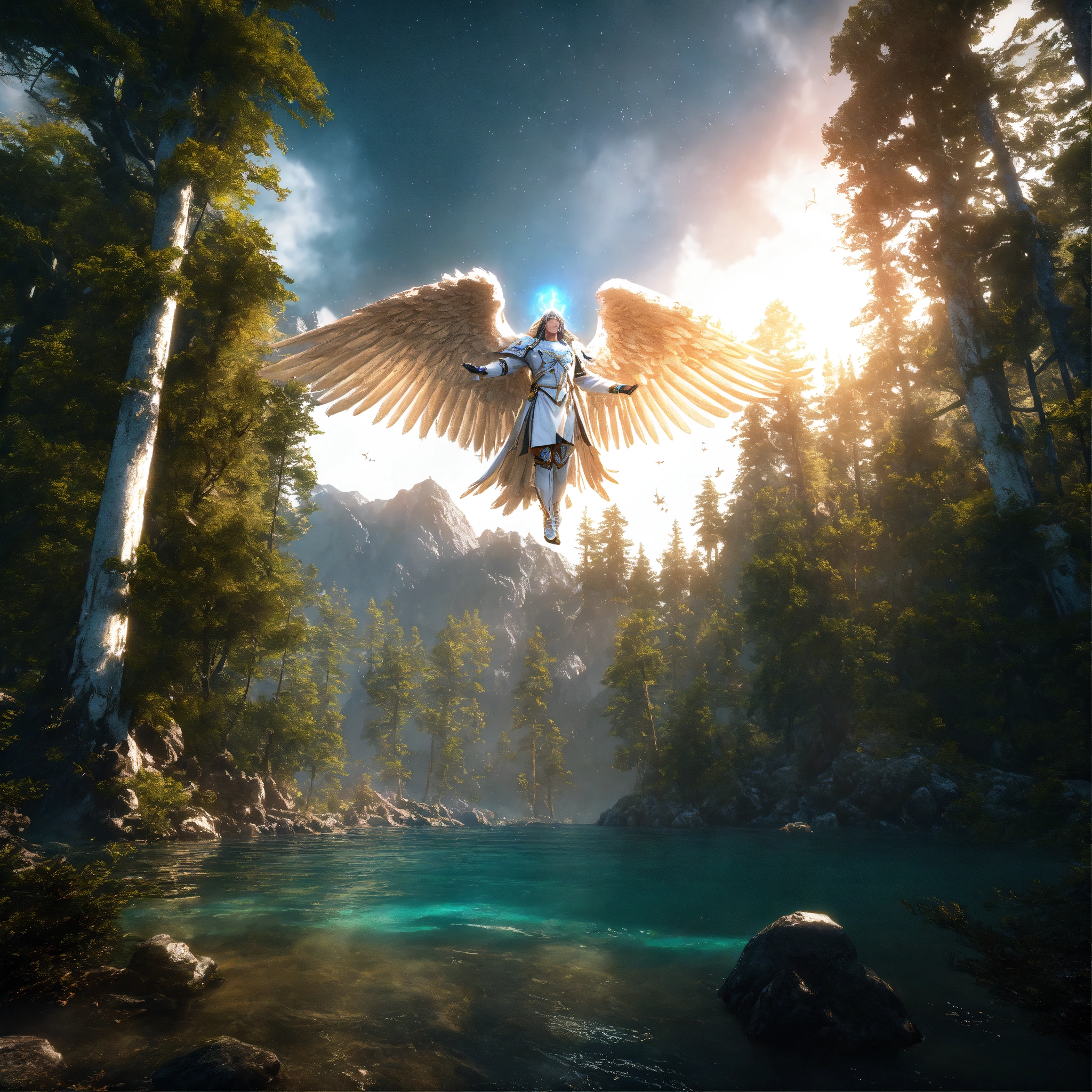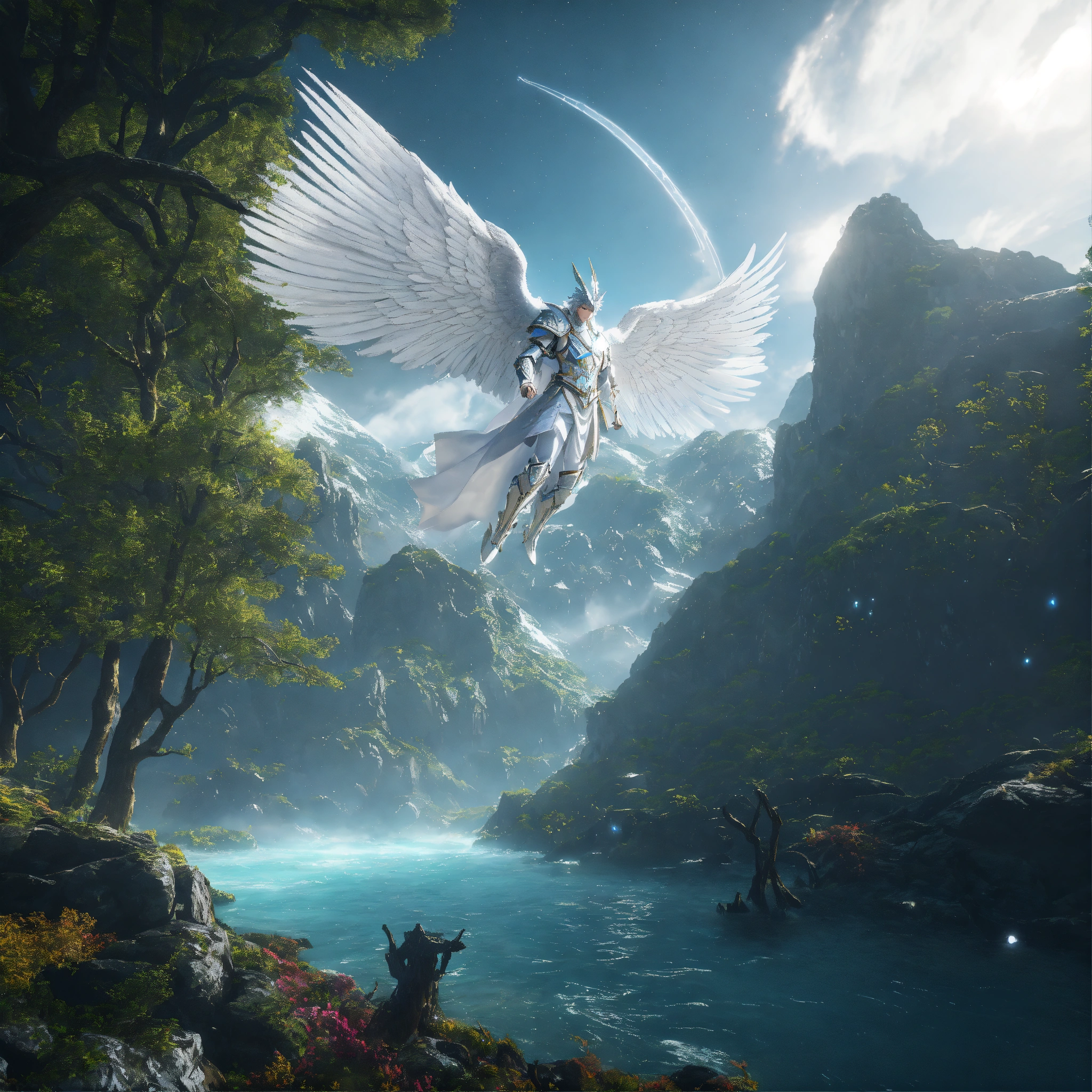 White archangel michael war in the forest, being reincarnated into a ocean world, sky nebula, artstation scifi 3d scene of a showing mountains, maximalism, ambient occlusion, atmospheric haze, unreal engine, hyper realism, realistic shading, cinematic composition, realistic render, octane render, detailed textures, photorealistic, wide shot