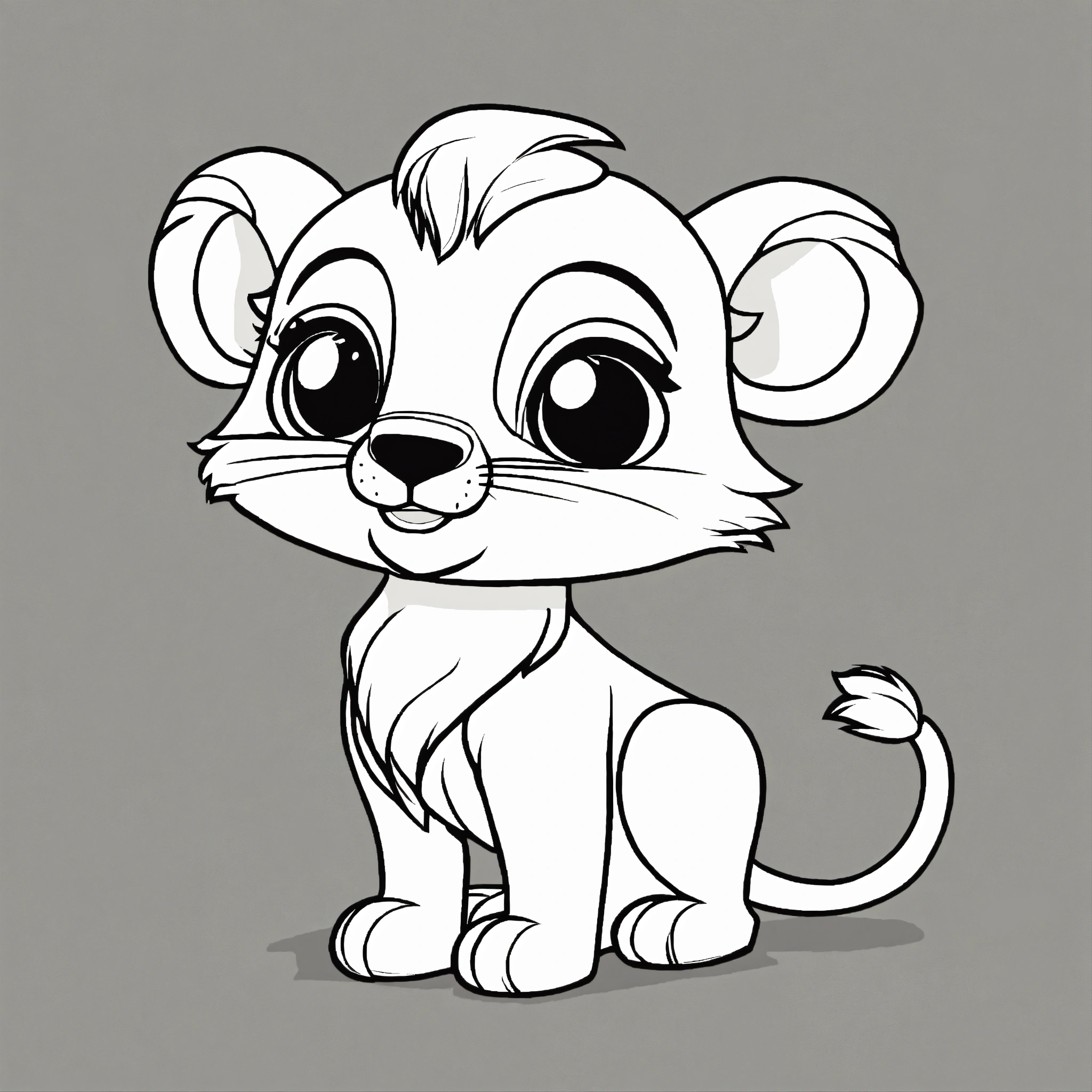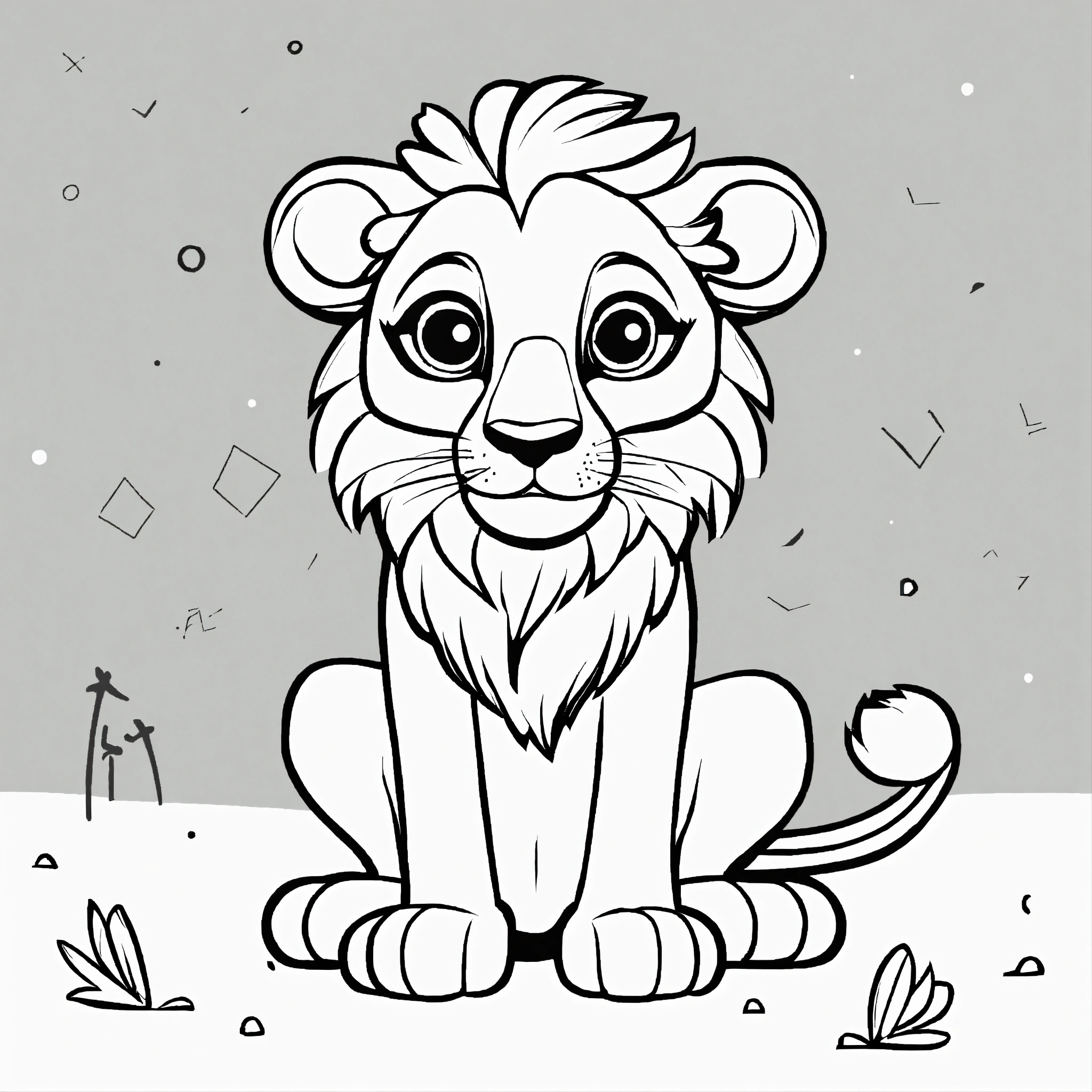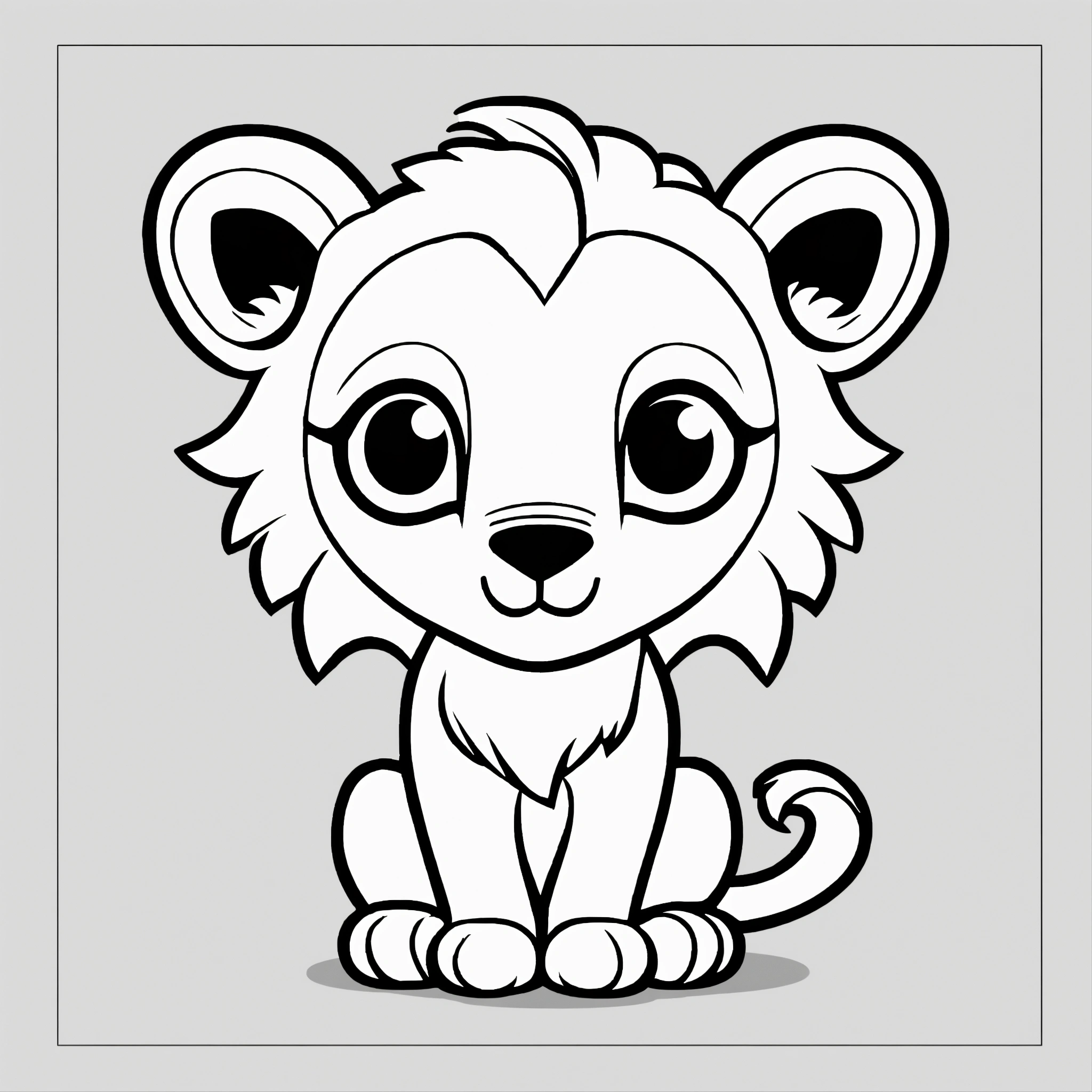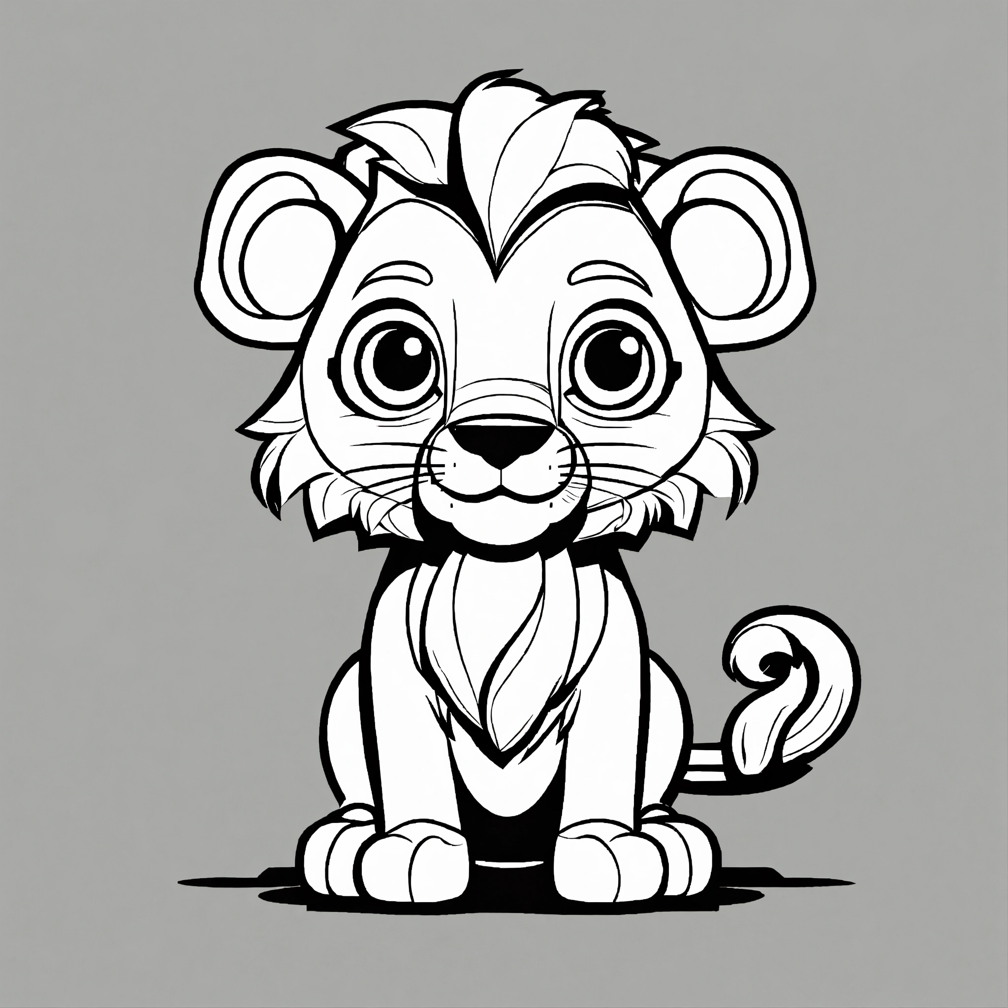 Cute lion, big eyes, pixar style, simple outline and shapes, coloring page black and white, flat vector, white background, heavy line art, clean line art, simple, only lines