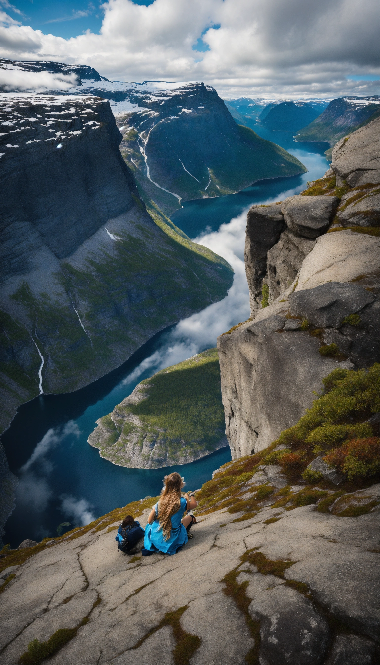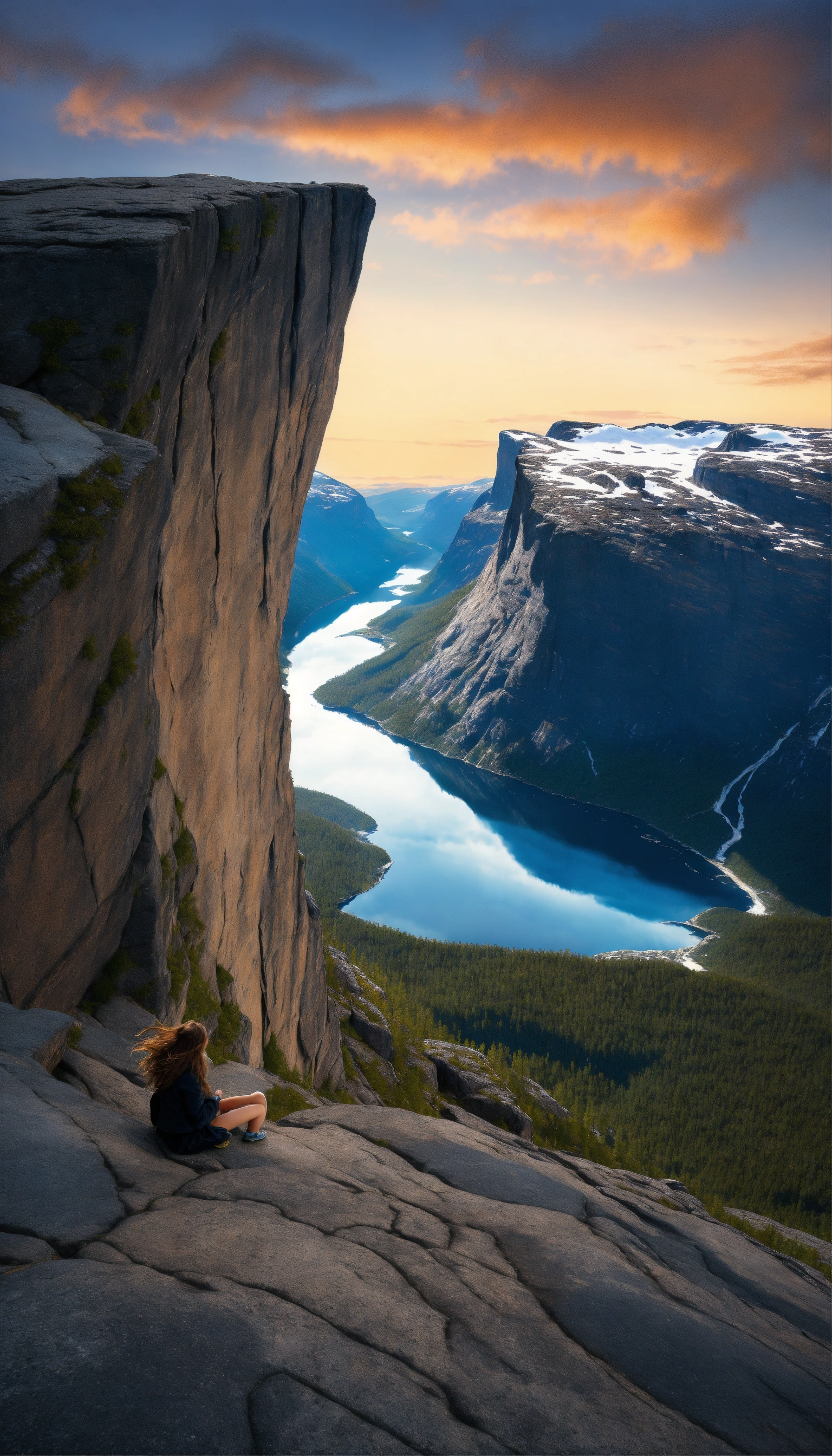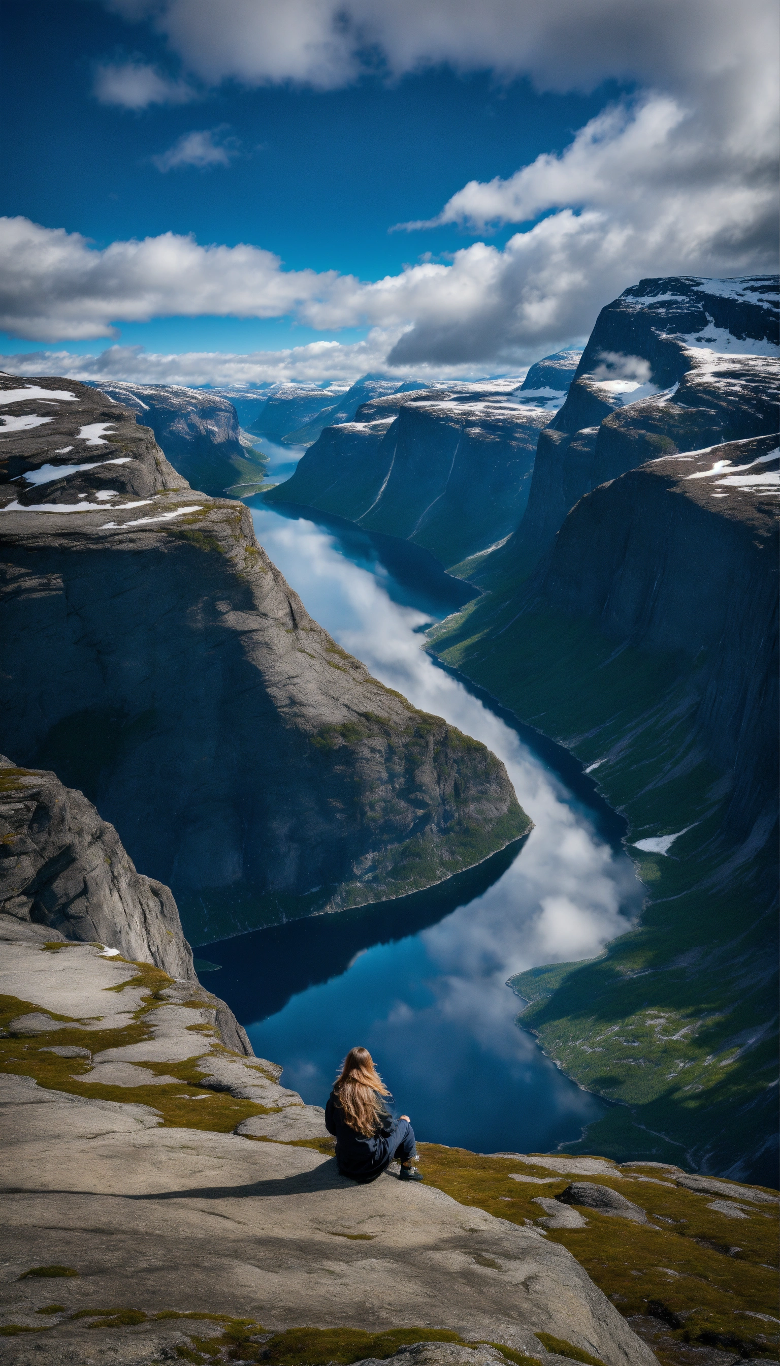 The trolltunga rock in norway from a perspective not too far behind, capturing the protruding rock formation that resembles a majestic, extended tongue. perched on the rock is a girl with flowing, long hair, caught in the grip of a gust of wind. she's sitting on the edge of the cliff, raising her hand high in a pose of challenge and grandeur against the backdrop of a stunning, clear blue mid-morning sky with white clouds. below trolltunga, a river flows vigorously, creating a magnificent and vibrant landscape. the pencil sketch style adds depth and texture to the artwork, enhancing its realism., ensuring it remains highly detailed, clean, and natural. long hair, caught in the grip of a gust of wind