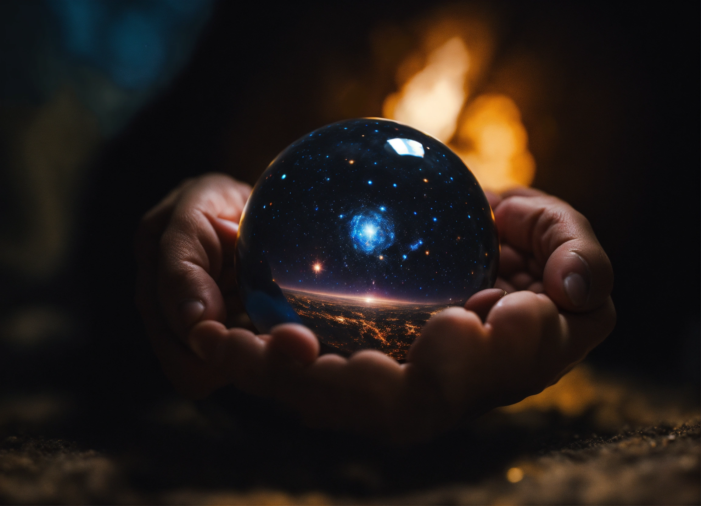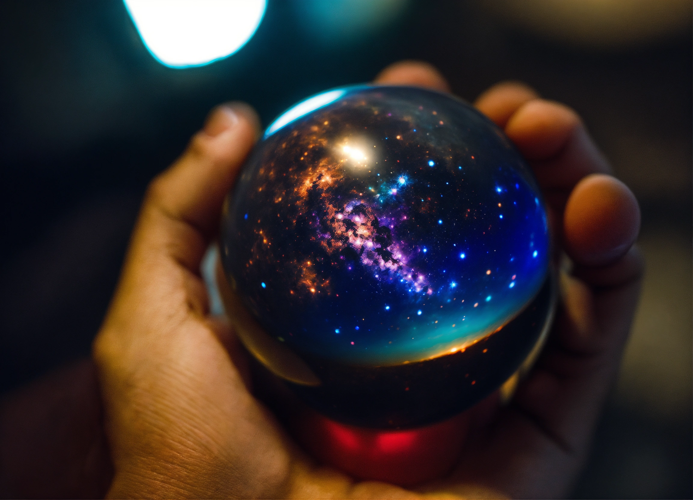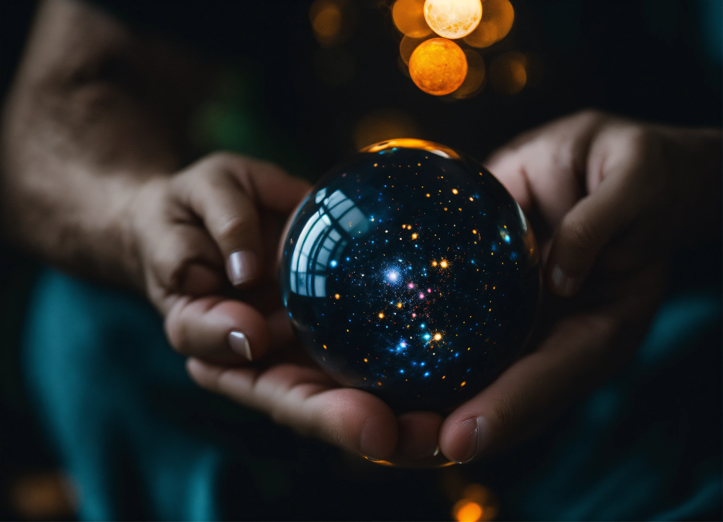 An orb that contains the universe, held in the palm of my hands, dark hues. add engagement in trade disaster.