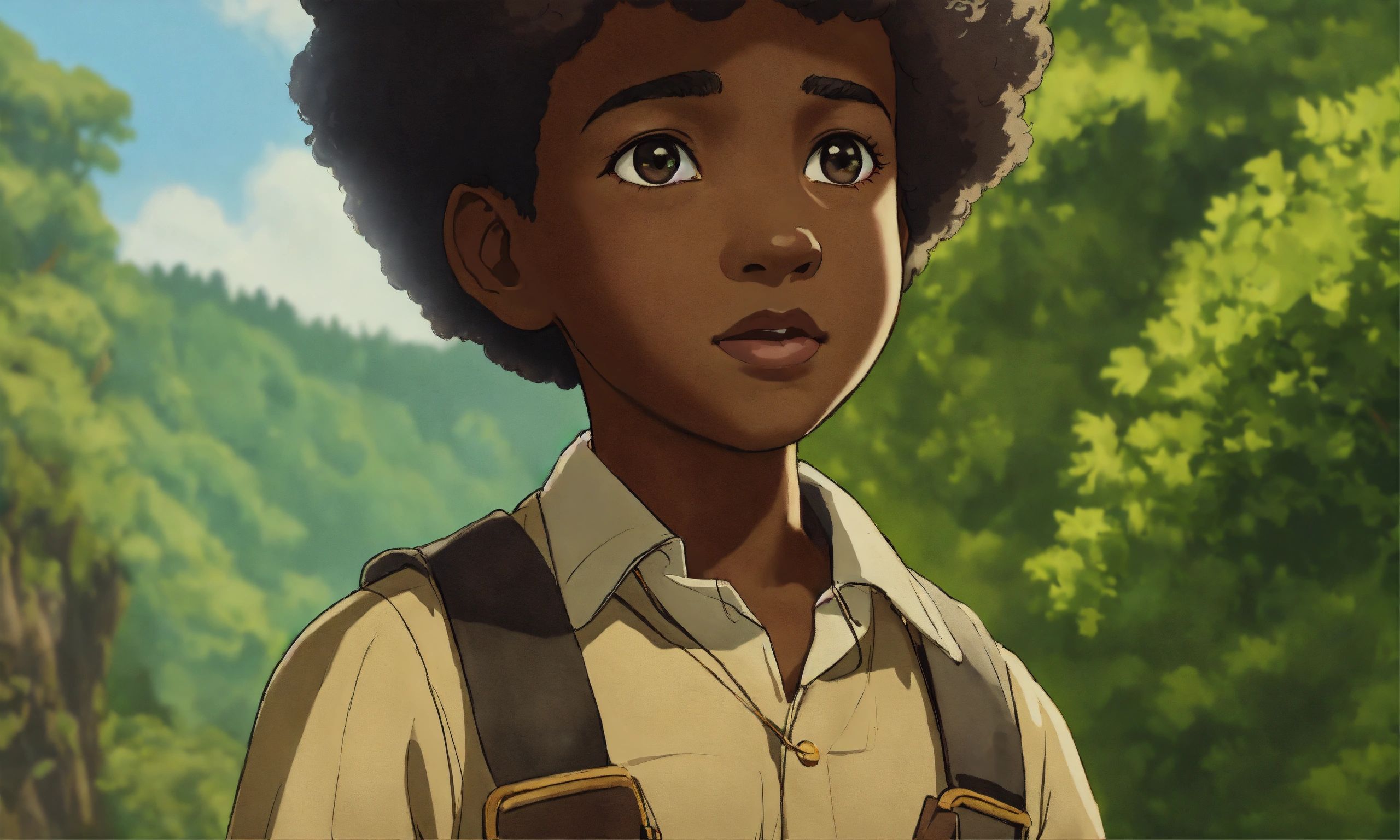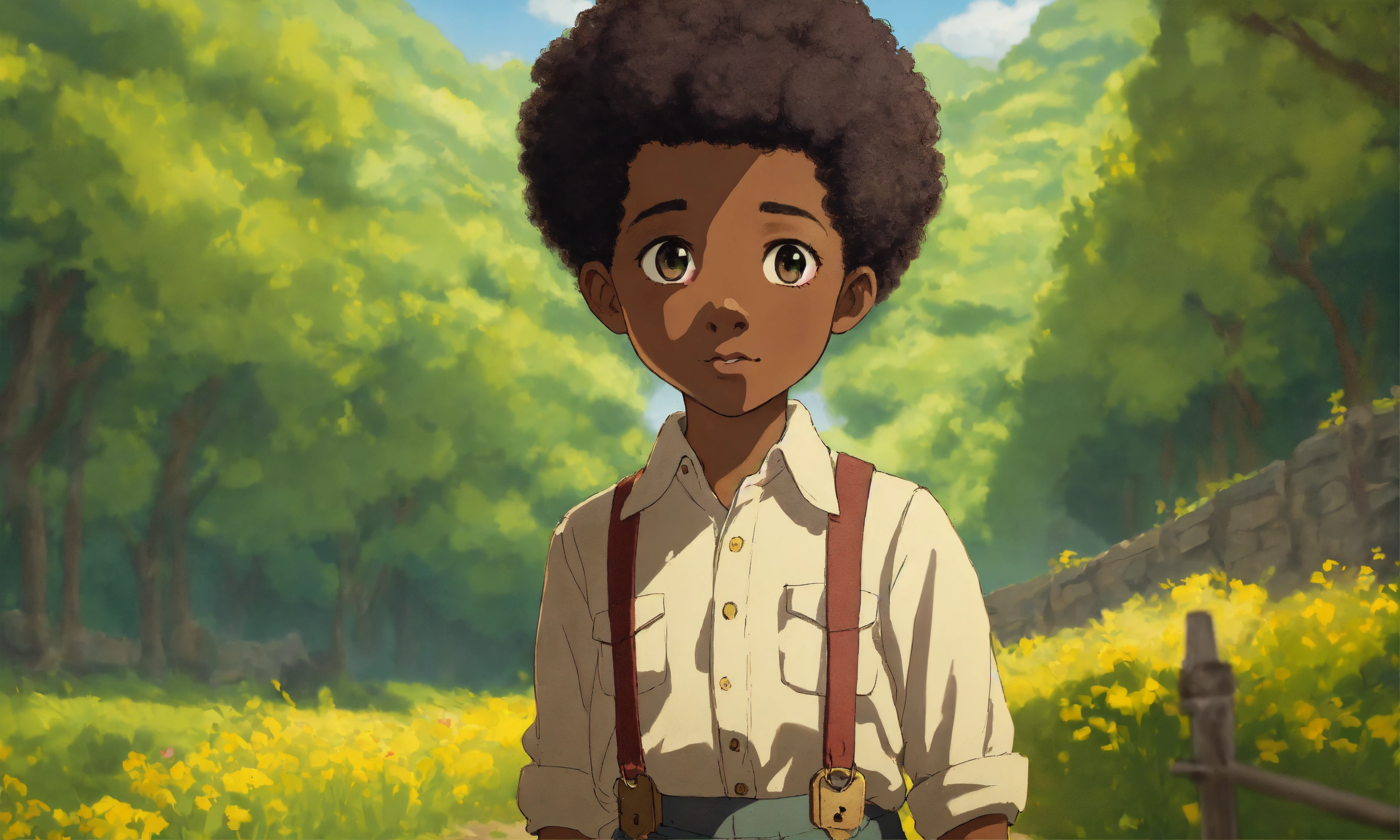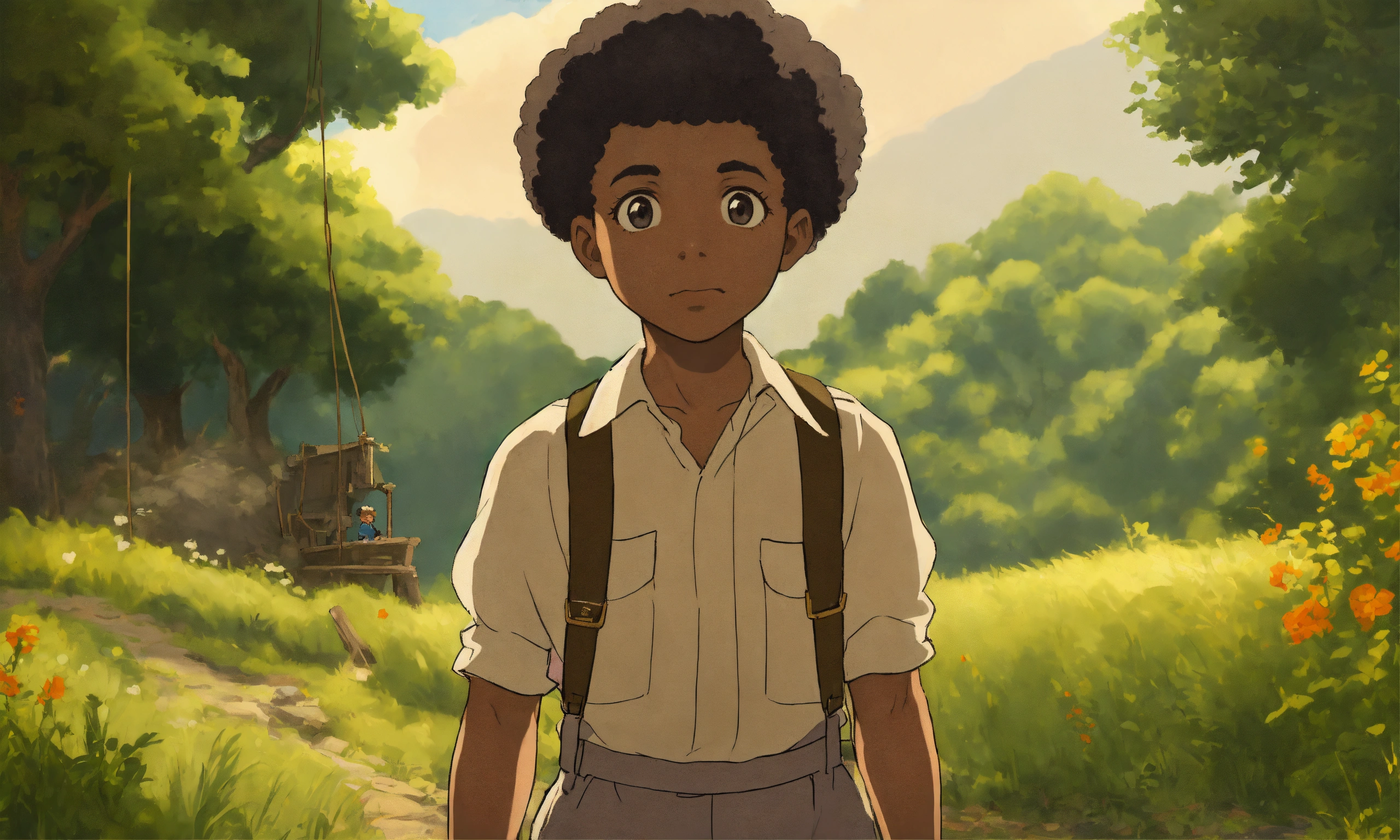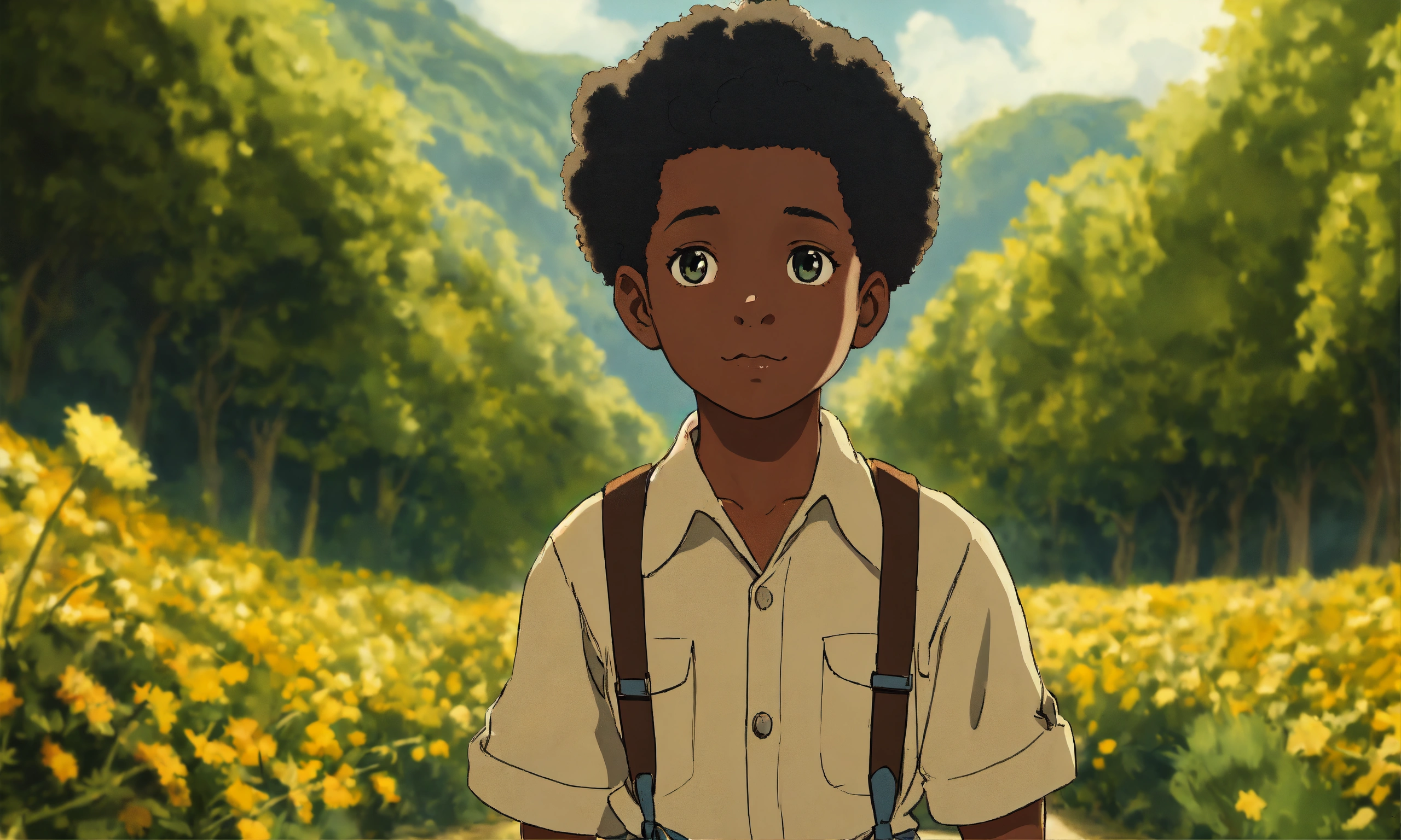 A 1930s portrait of an extremely cute short black boy with short afro hair, hazel eyes with 4 arms standing in a glen with slingshot by studio ghibli.