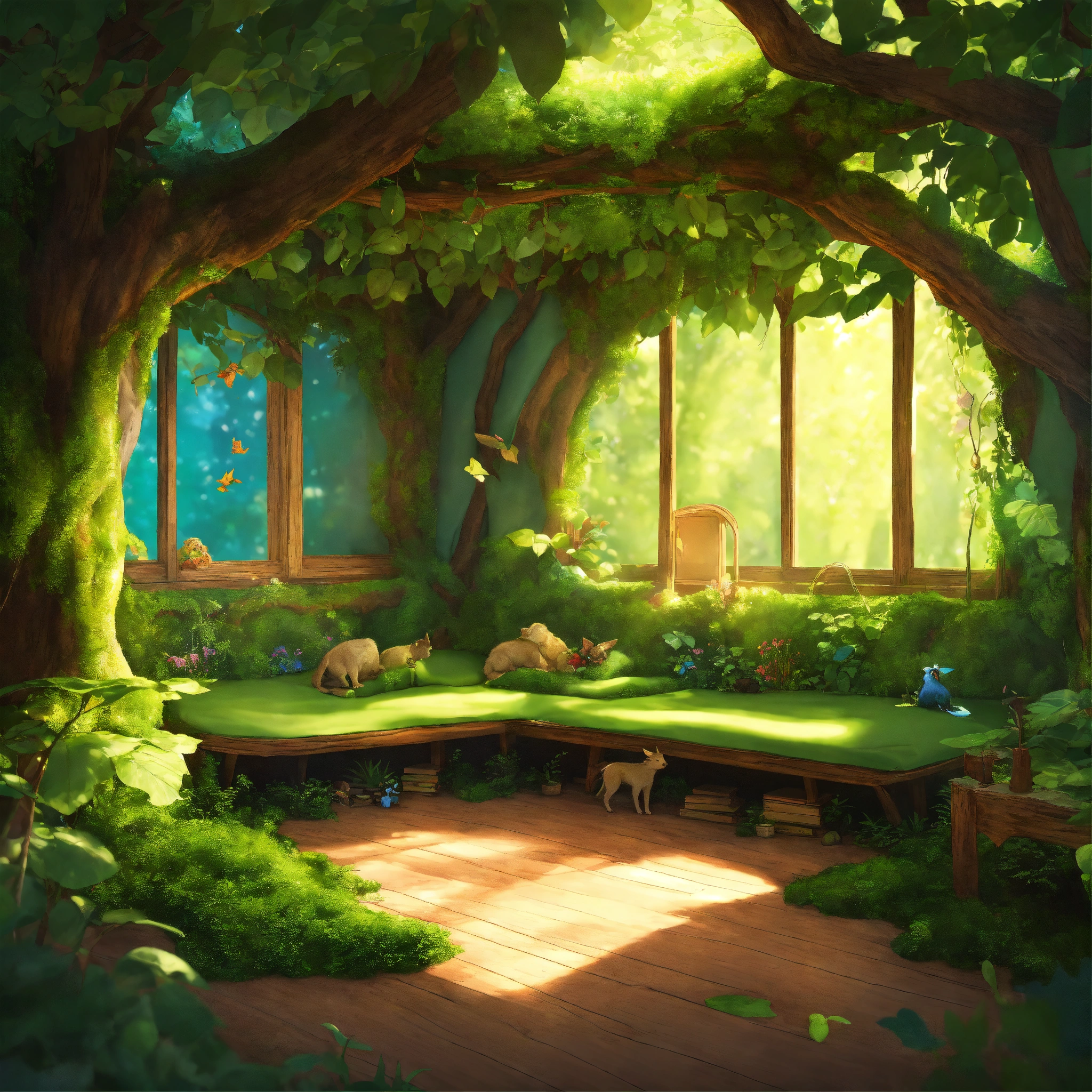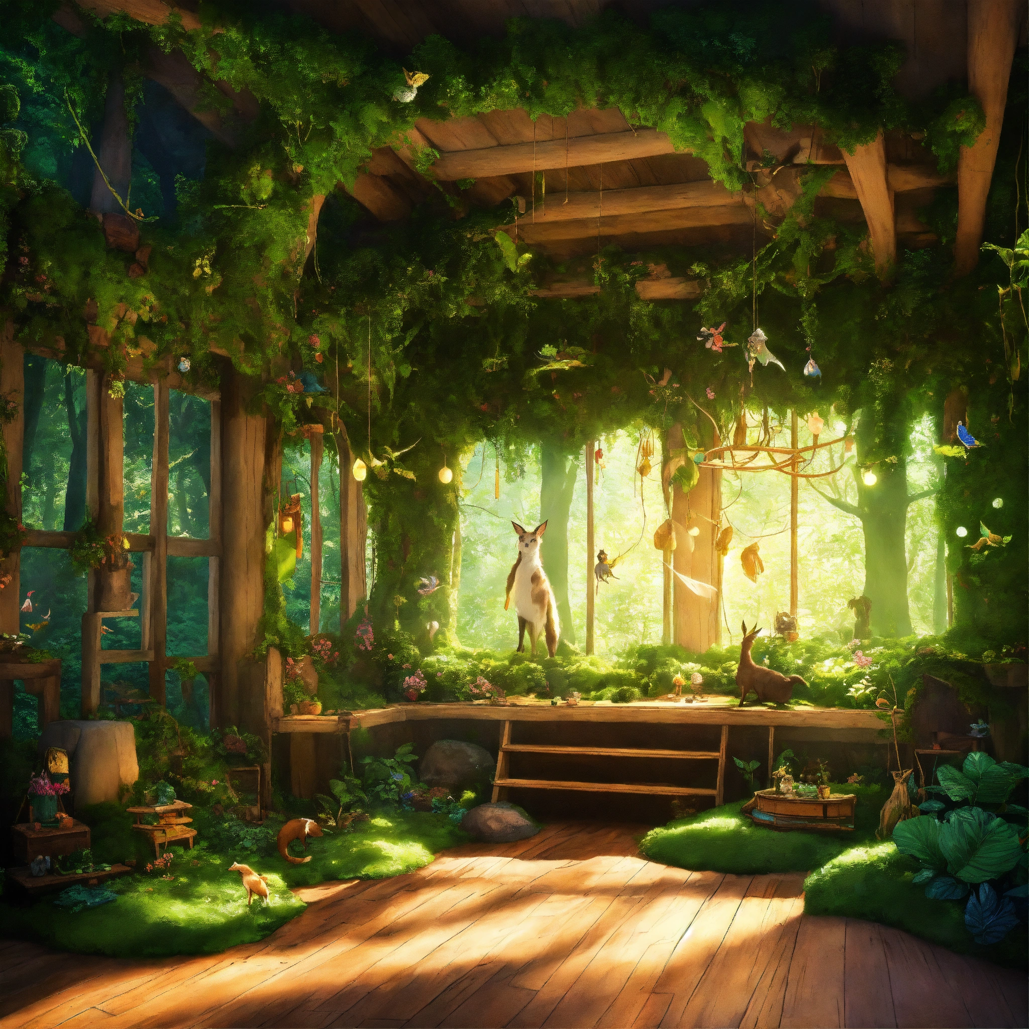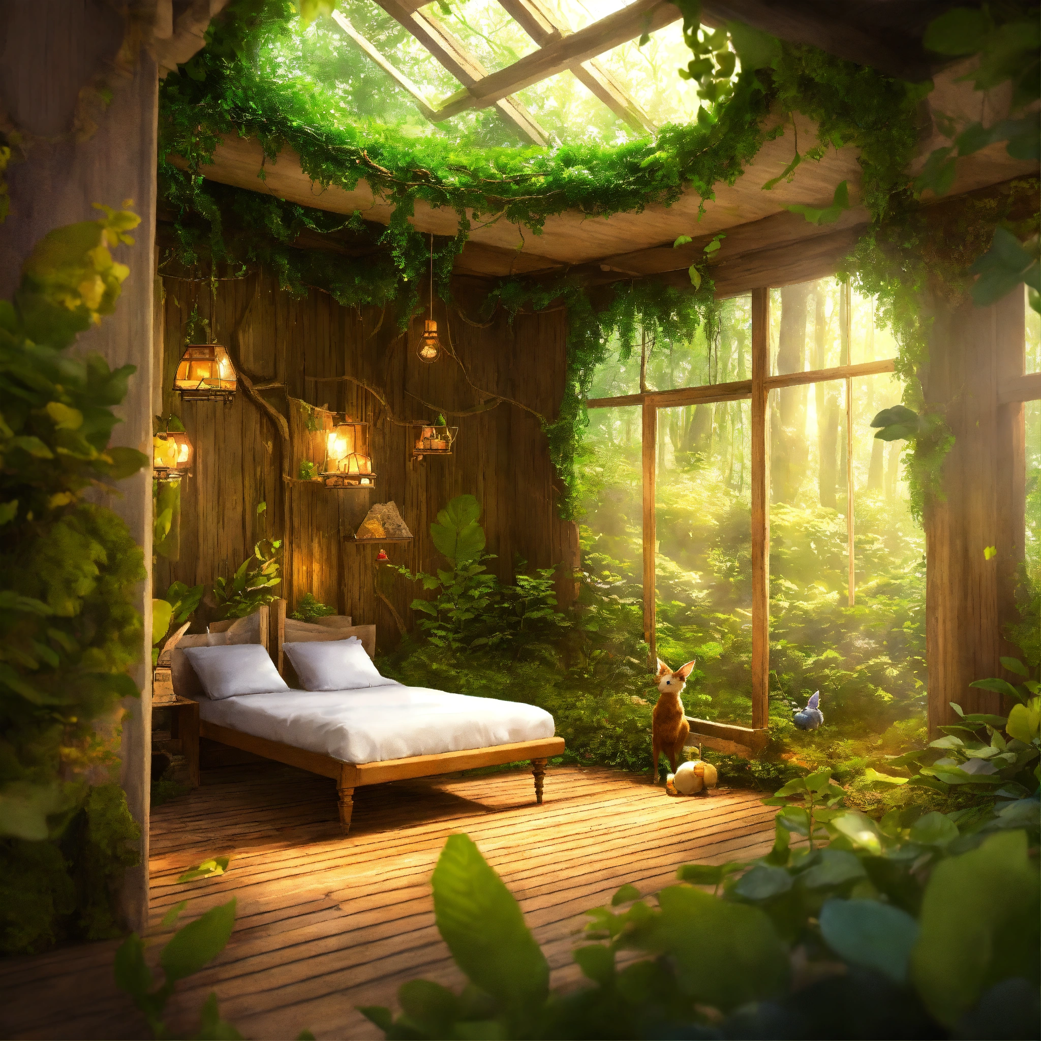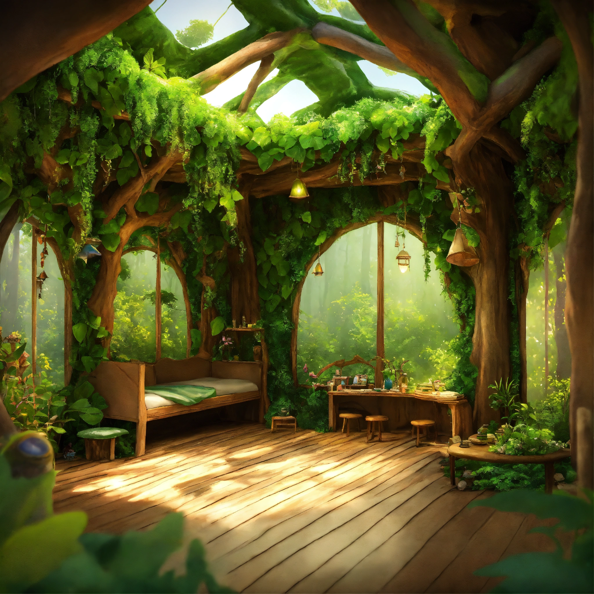The forest retreat paint a picture of a room that opens up to a magical forest. trees grow right through the floor, and the ceiling is a canopy of leaves. woodland creatures and playful faeries inhabit this verdant space.