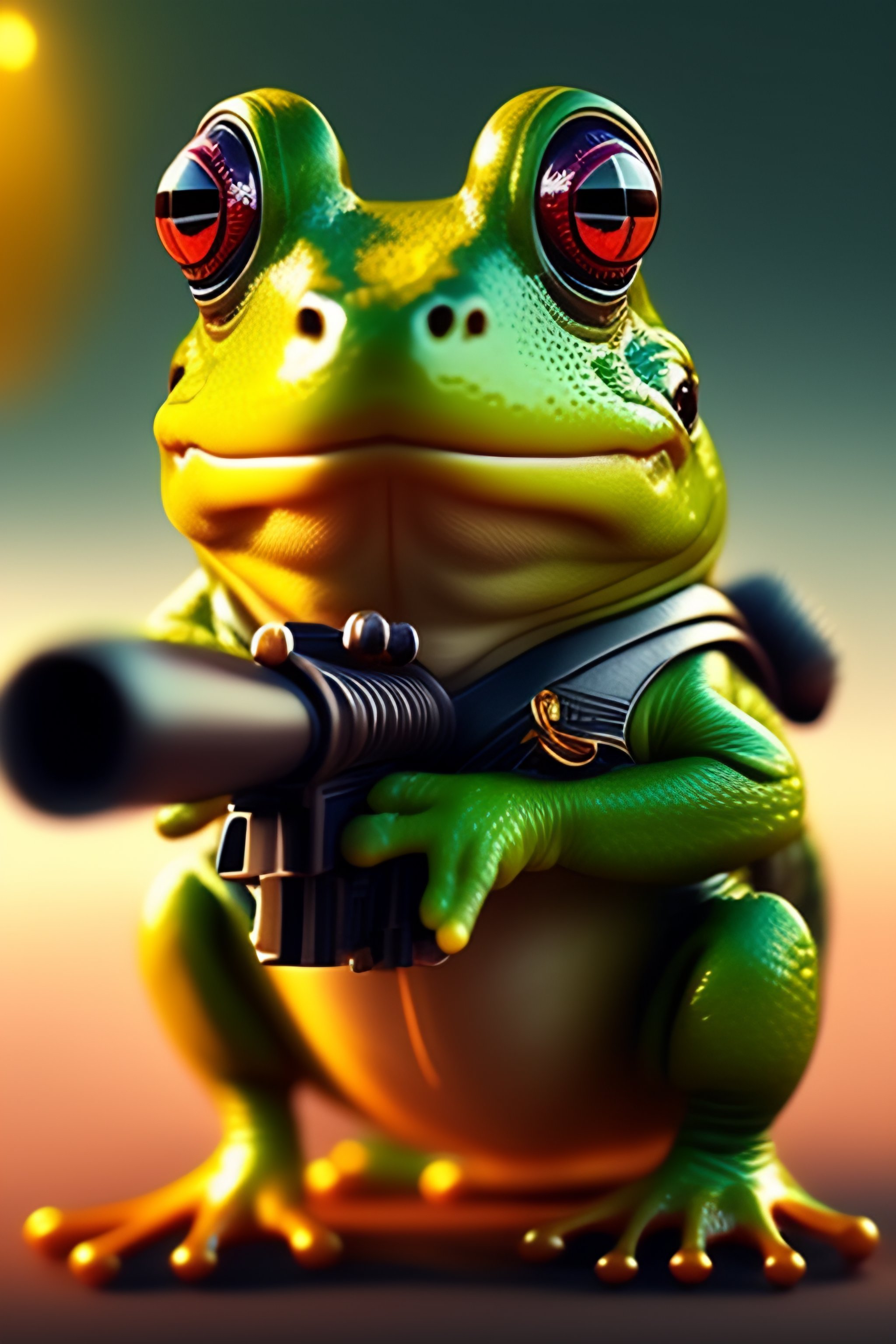 A frog wielding a rocket-launcher from a video game