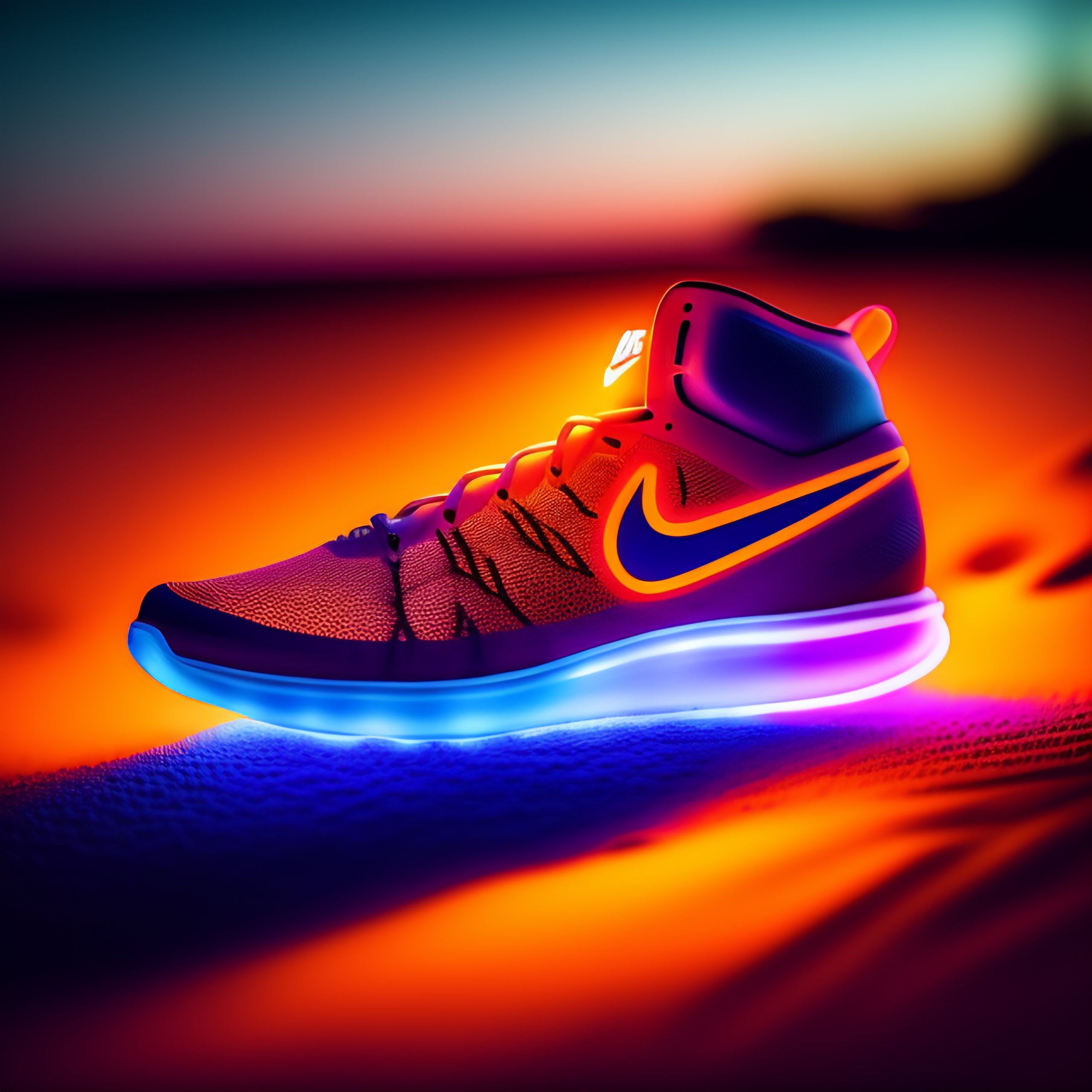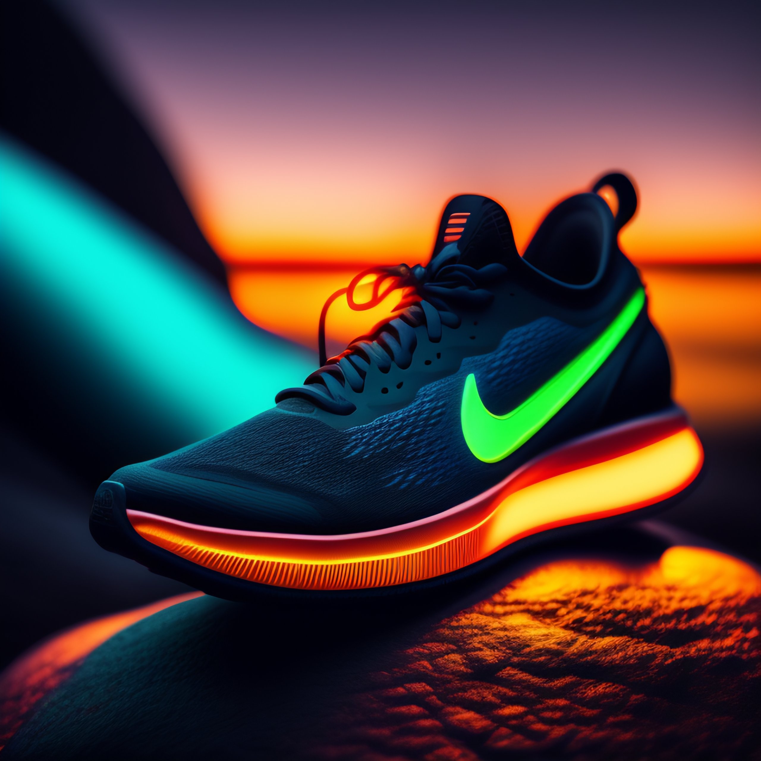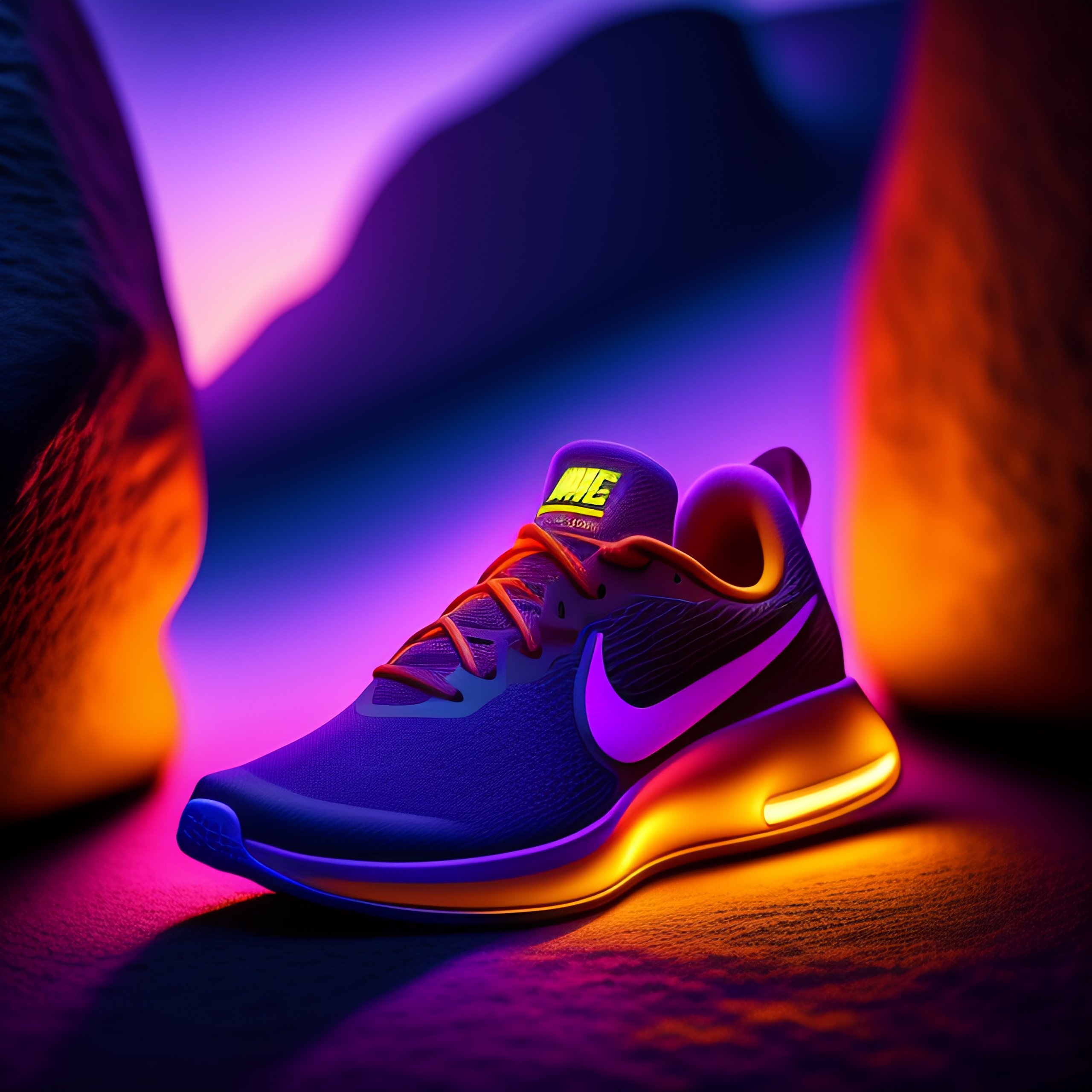 Illustration of a nike sports shoe in neon lights on a rock at night with moon light 8k