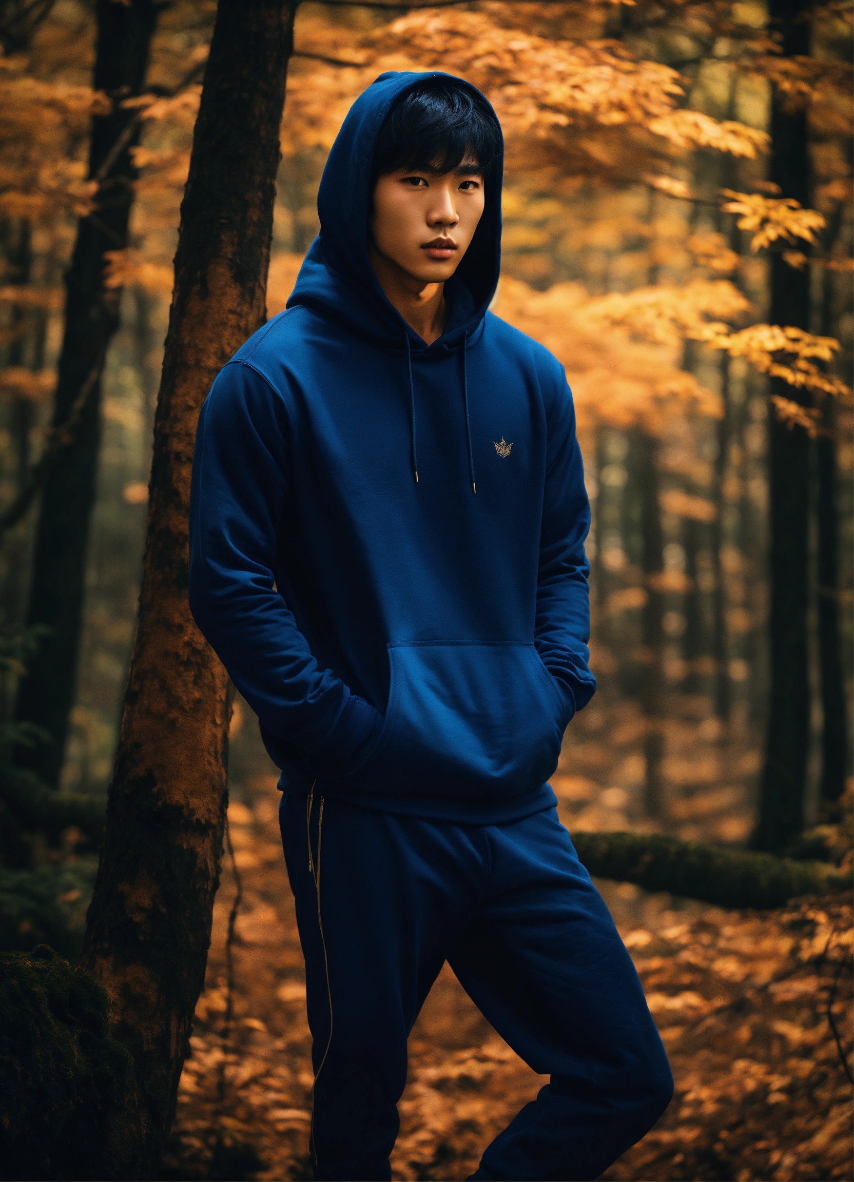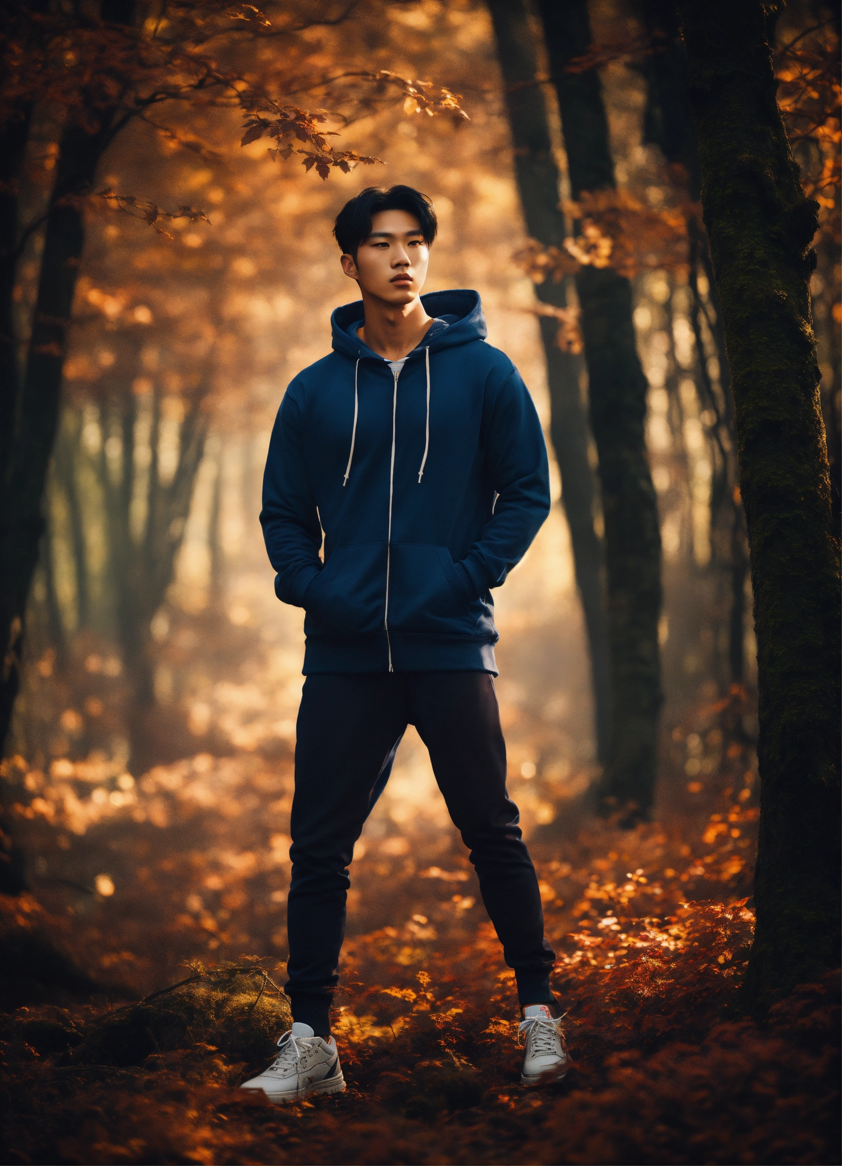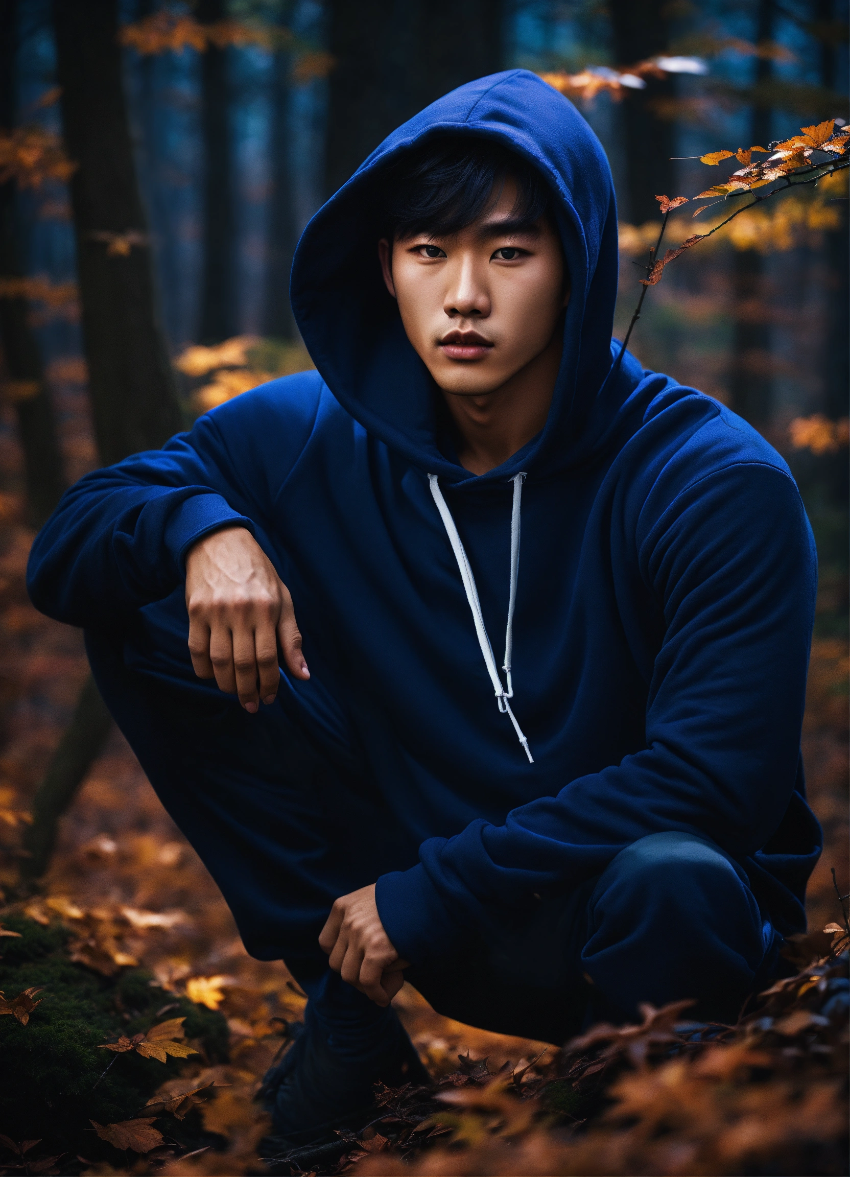 Pin-up poster of a fit korean male model wearing a blank midnight blue hoodie in a autumnal forest, dark fantasy atmosphere, dramatic lighting