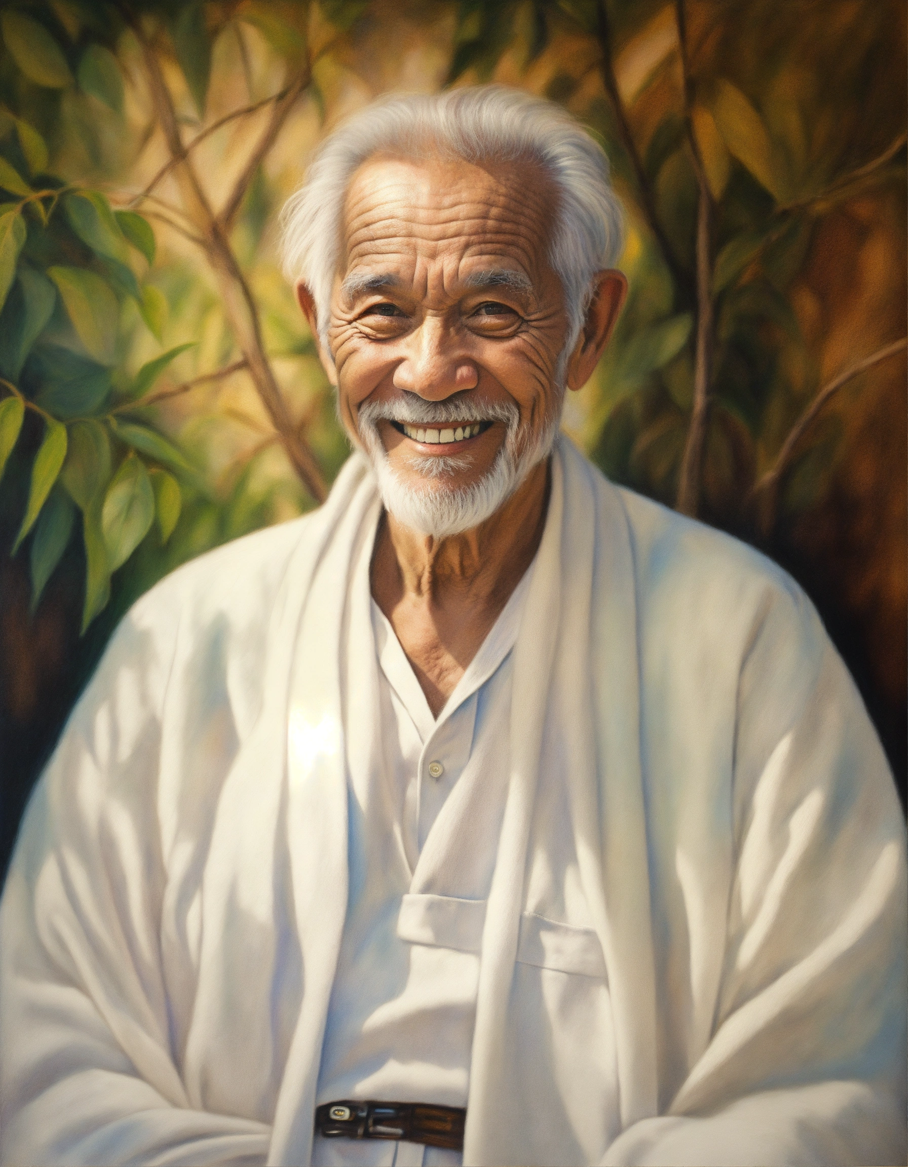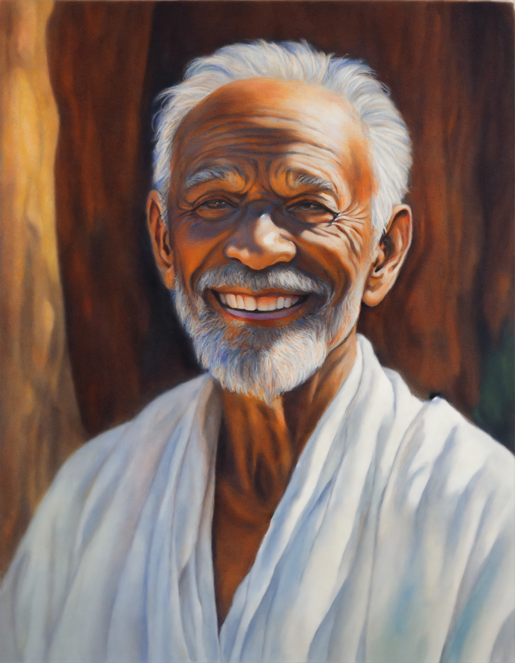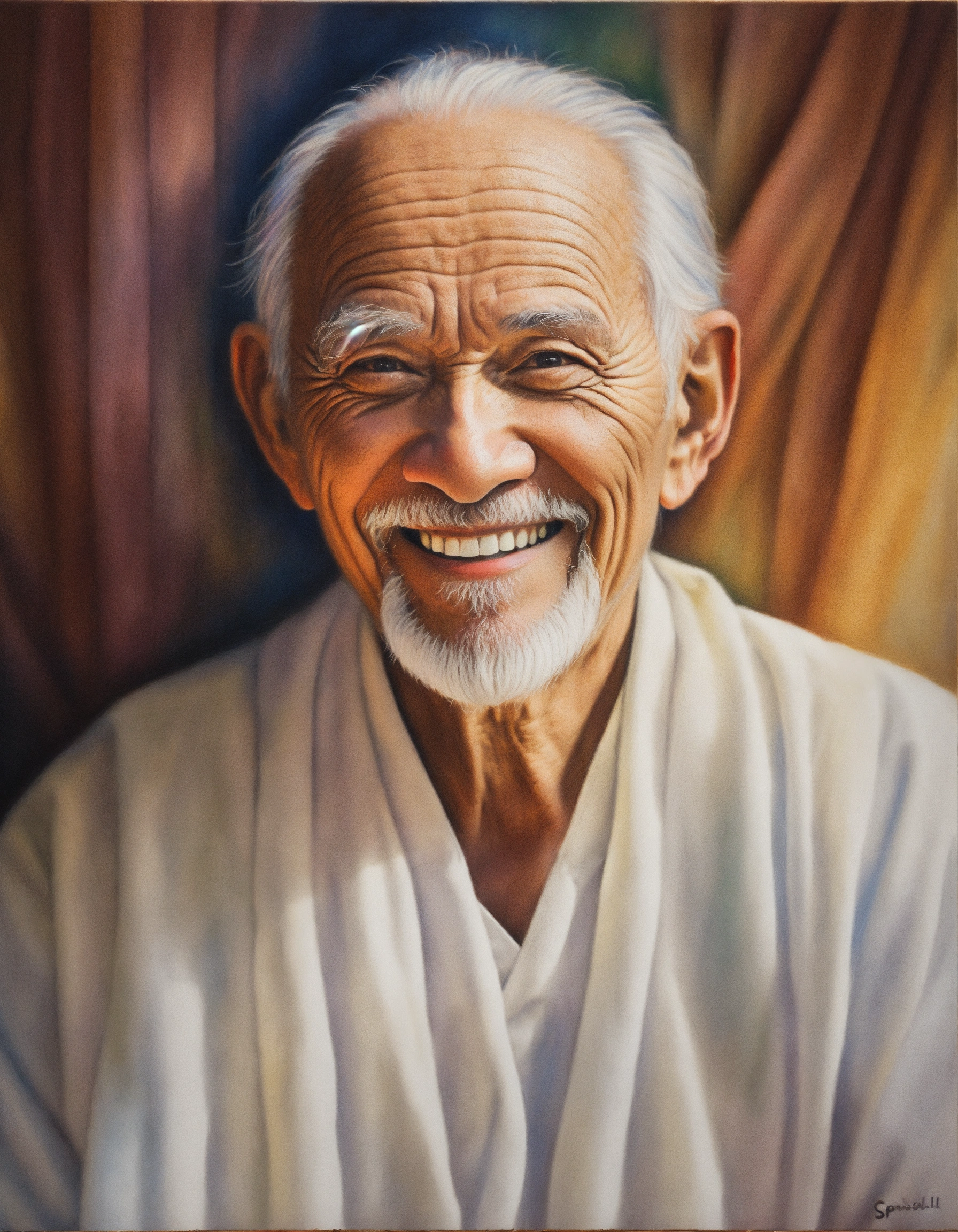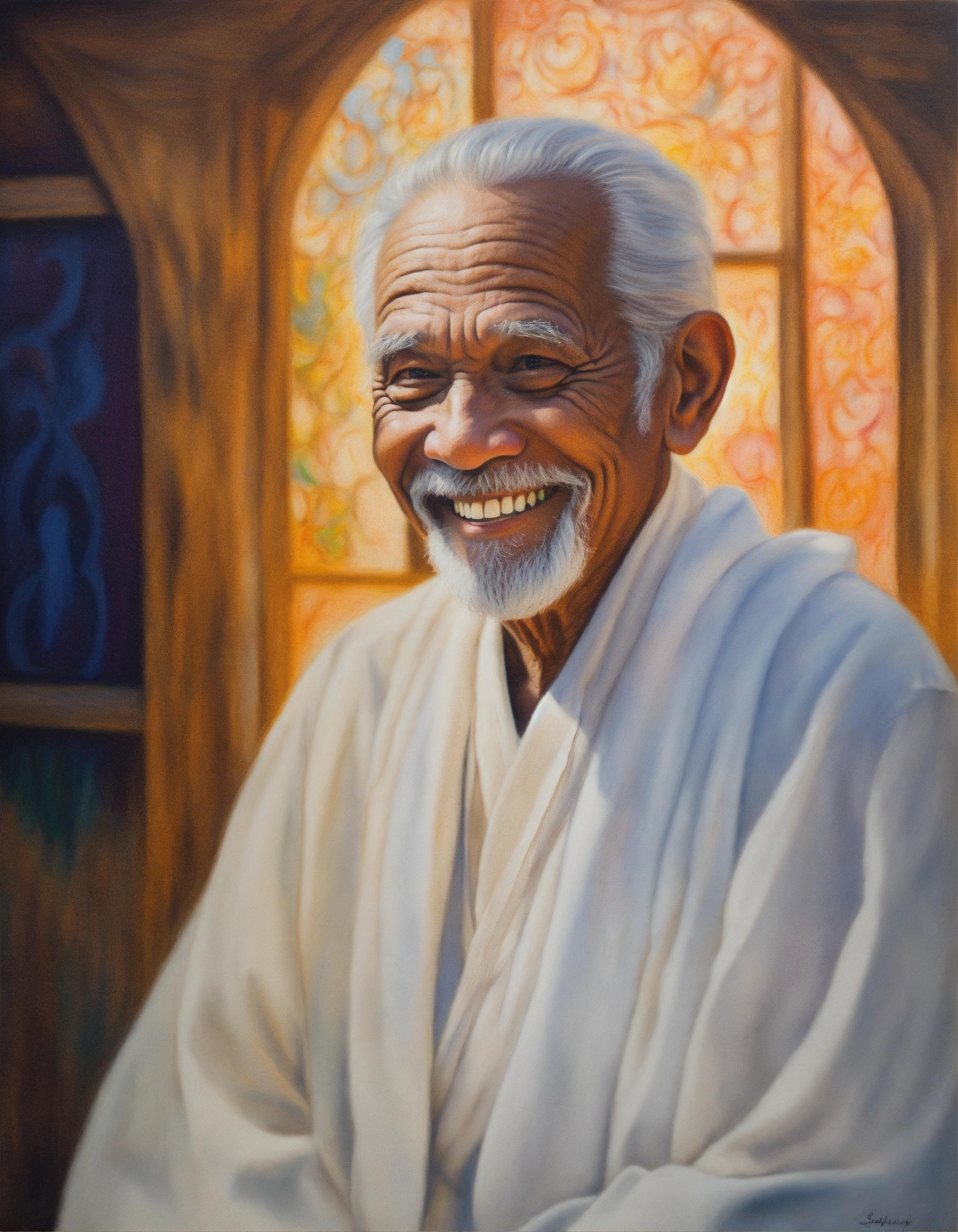 Colored pencil painting of a spiritual mentor, old man, a beautiful smile, wearing white clothes, white skin. a soul. spirit. spiritual art.