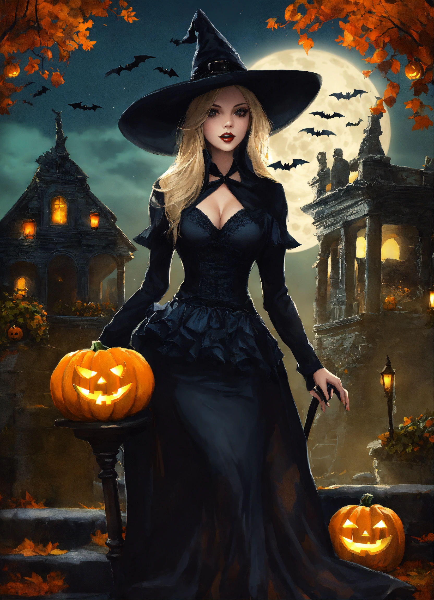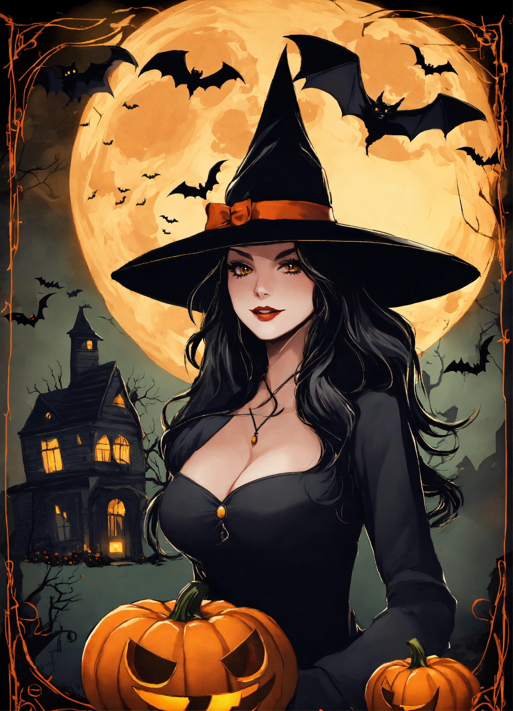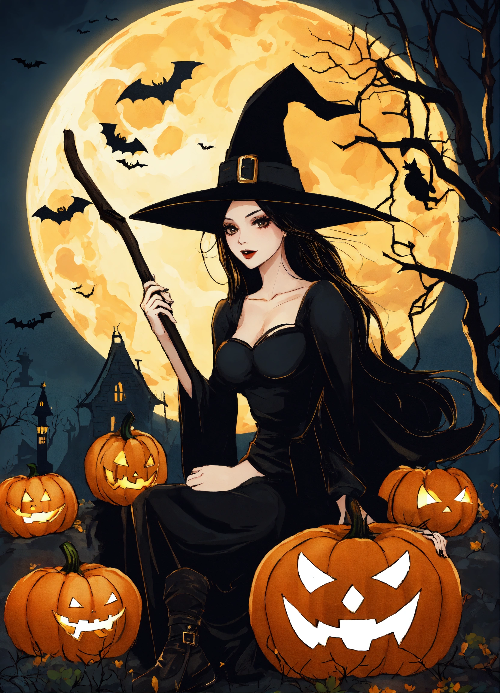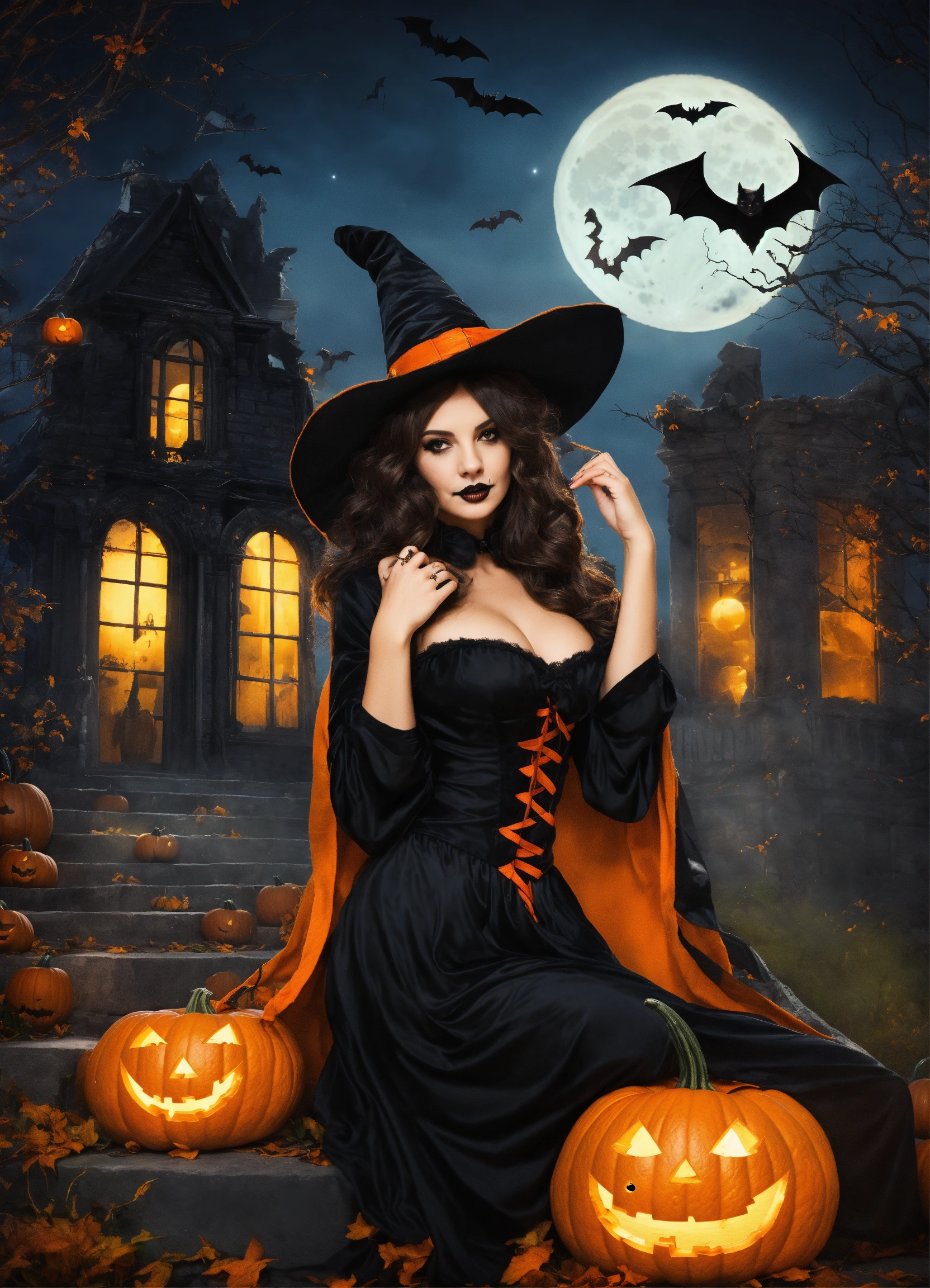 Halloween, beautiful witch dressed in black, hat, ruins, night, full moon, black cat, bats, halloween pumpkin