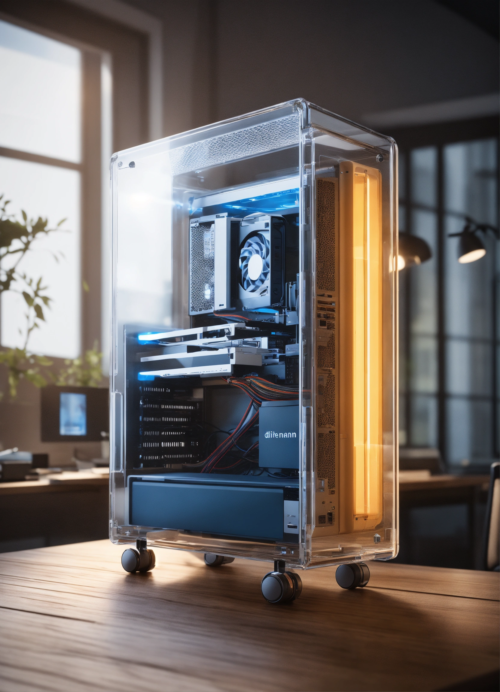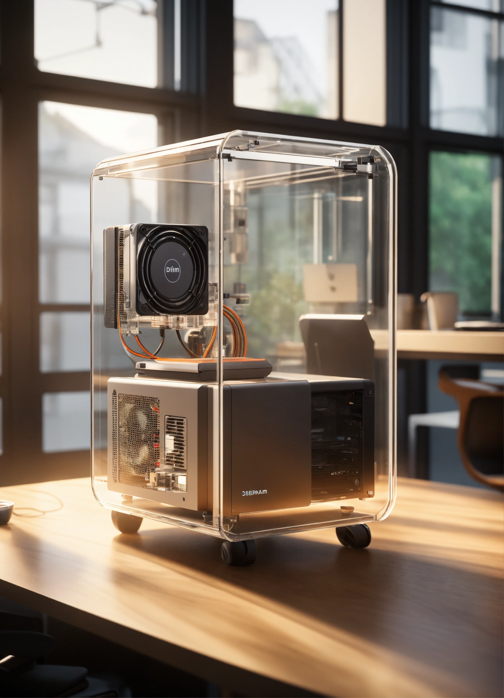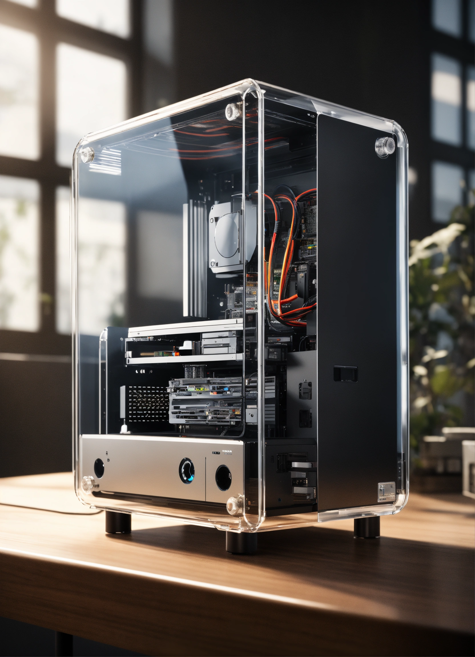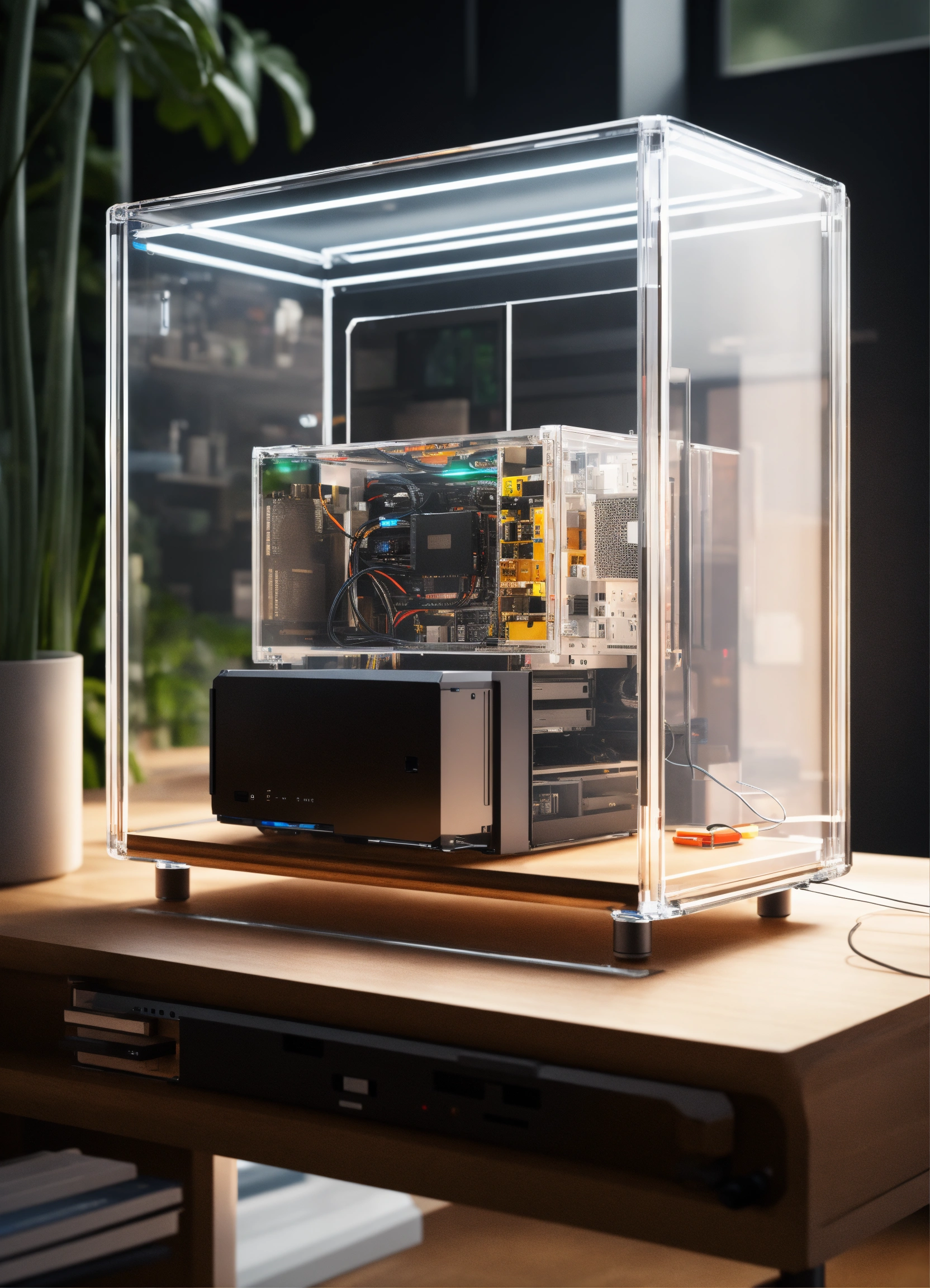 A translucent polycarbonate pc case, designed by dieter rams. industrial design inspiration. unreal engine render 8k, beautiful natural lighting, on desk