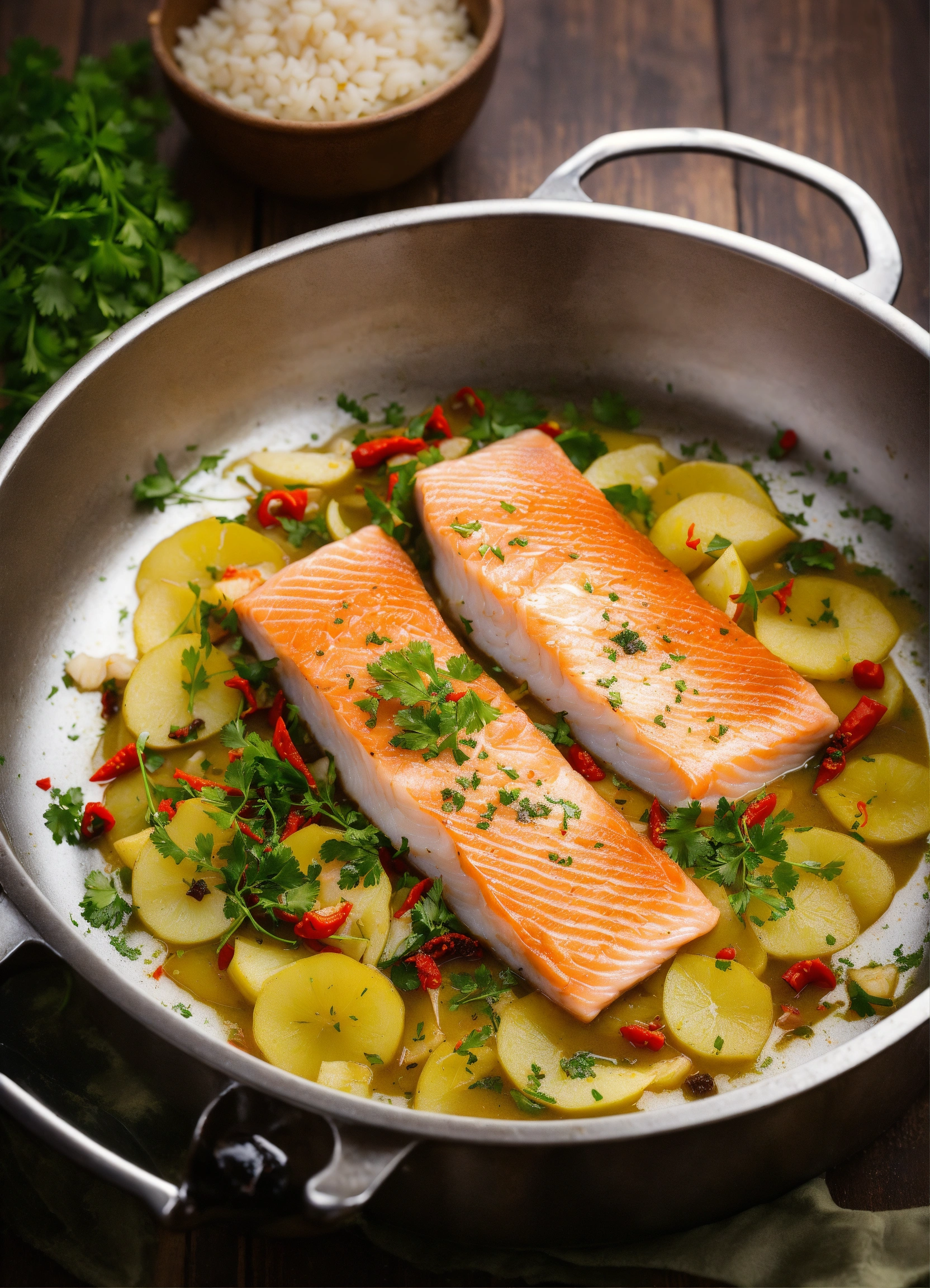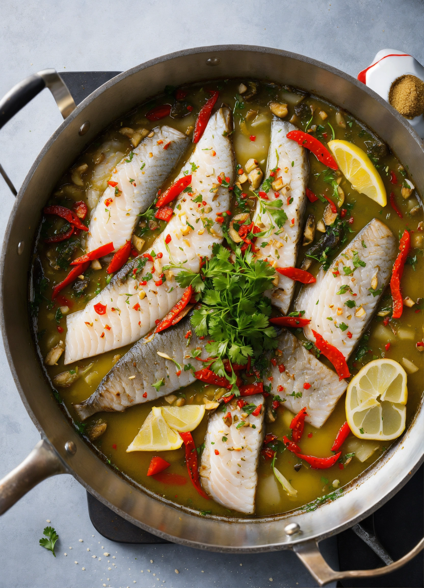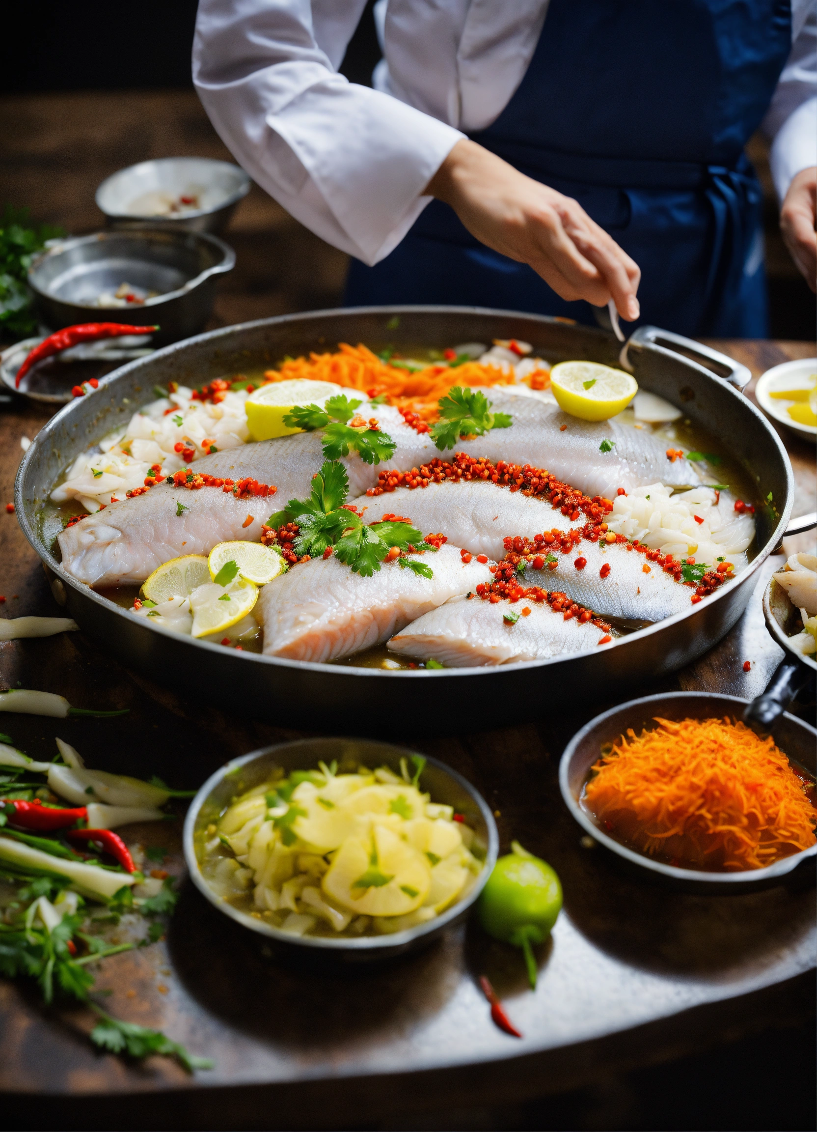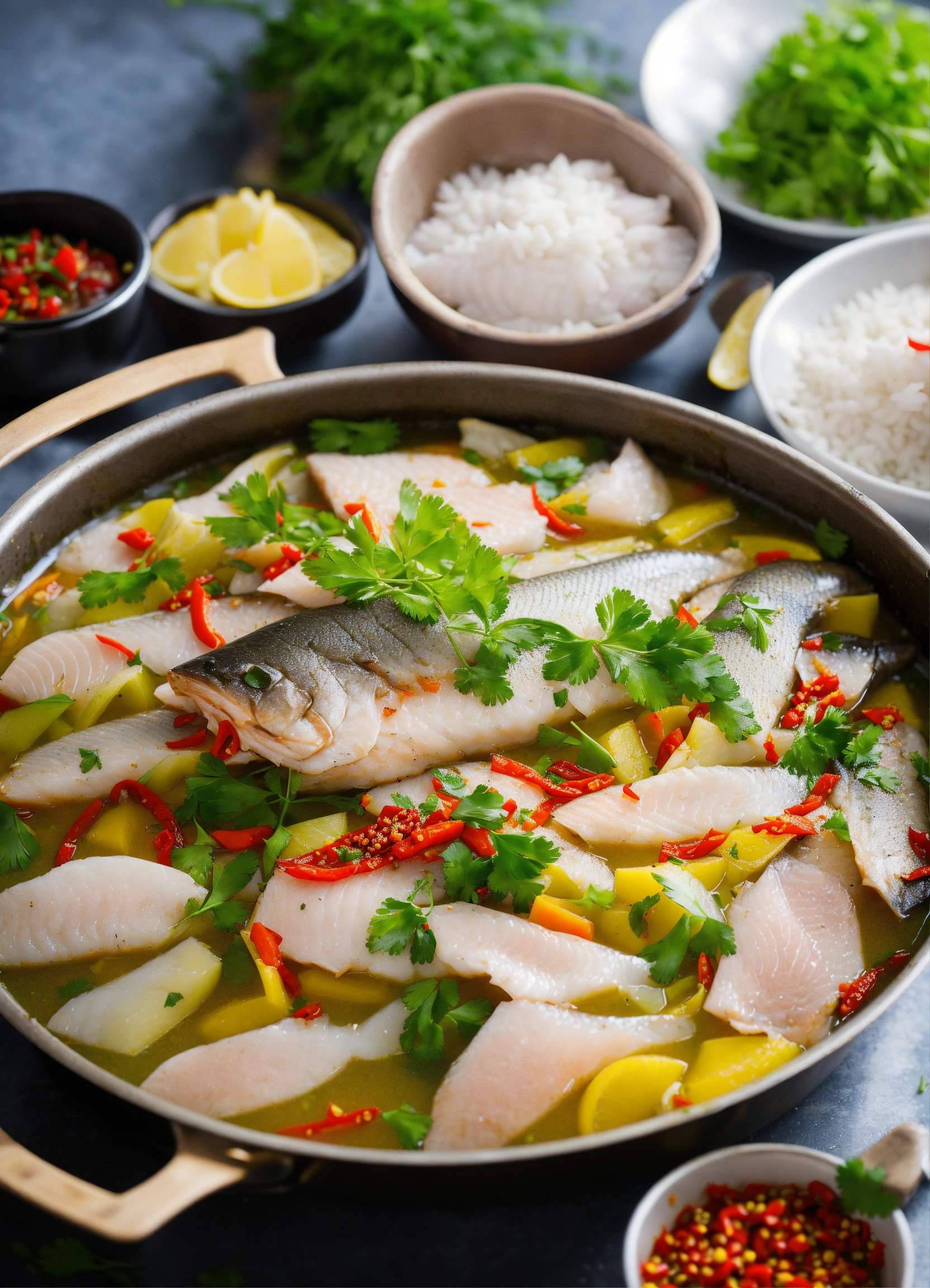On a large table, there is a large pot of freshly cooked boiled fish fillets. these fish fillets are cut into slices from grass carp, sea bass, and crucian carp. beautiful chef is experimenting with flavors. this delicious dish uses fresh fish fillets and seasonings such as pickled pepper, sichuan peppercorns, ginger and garlic.