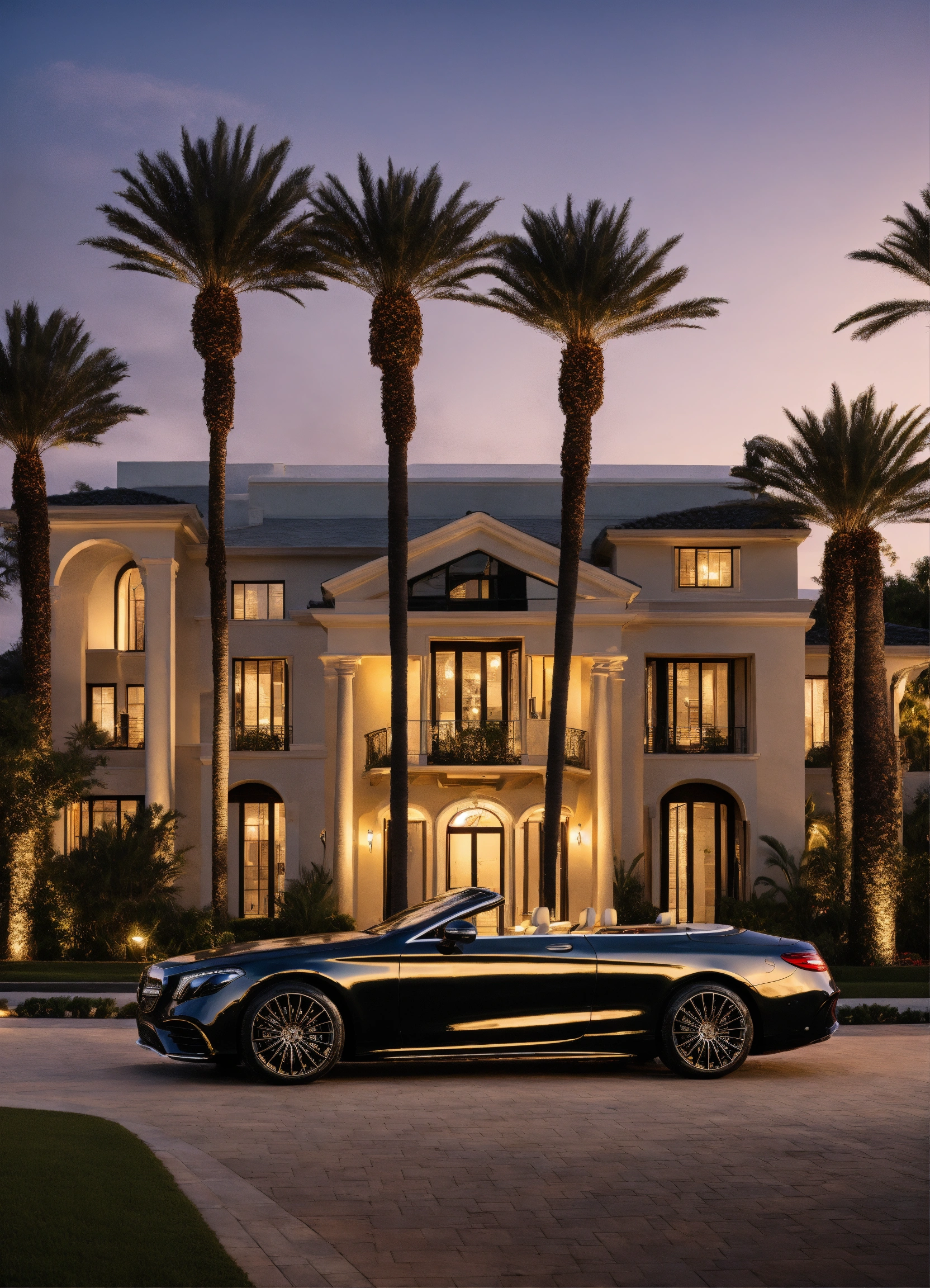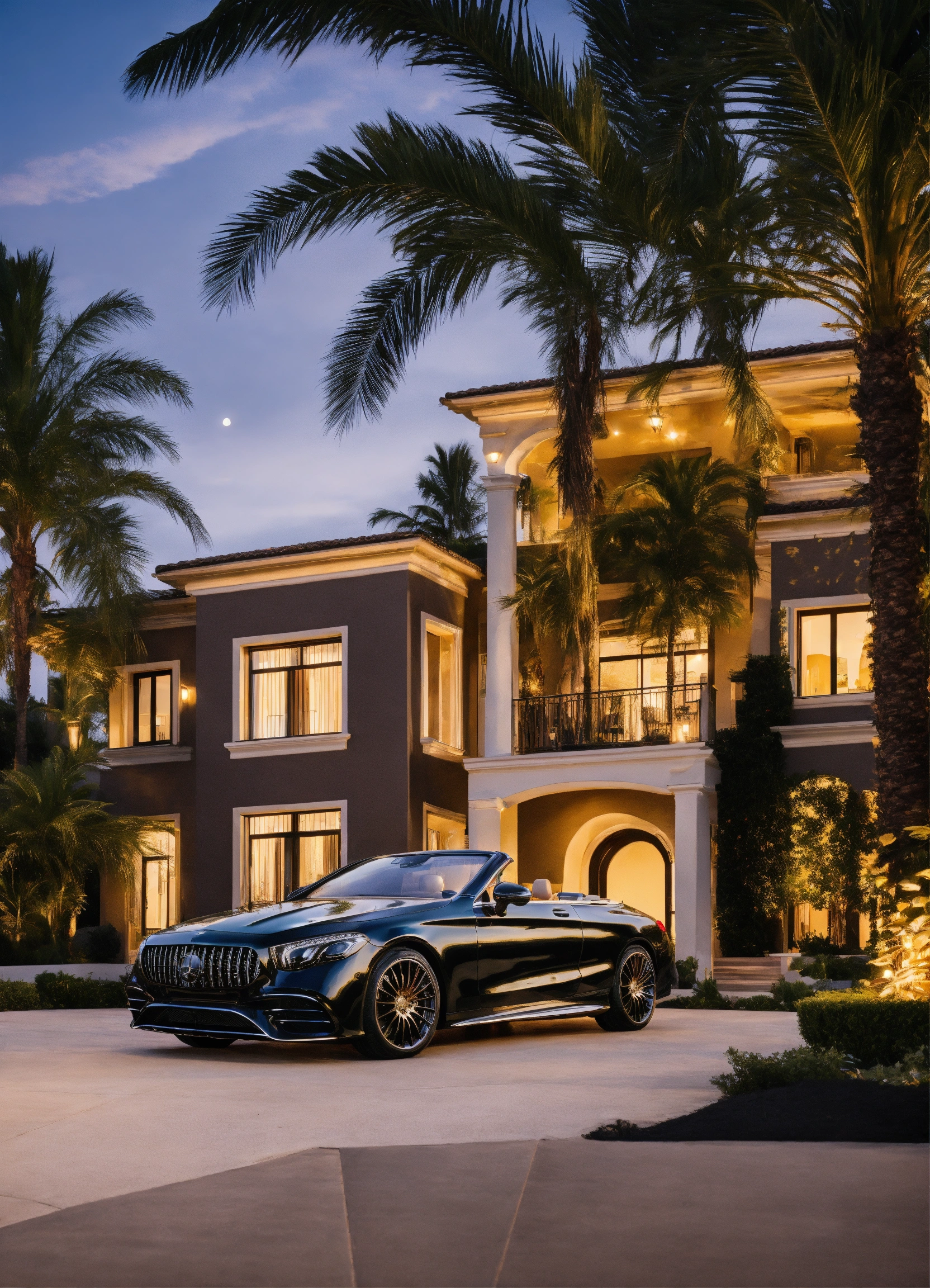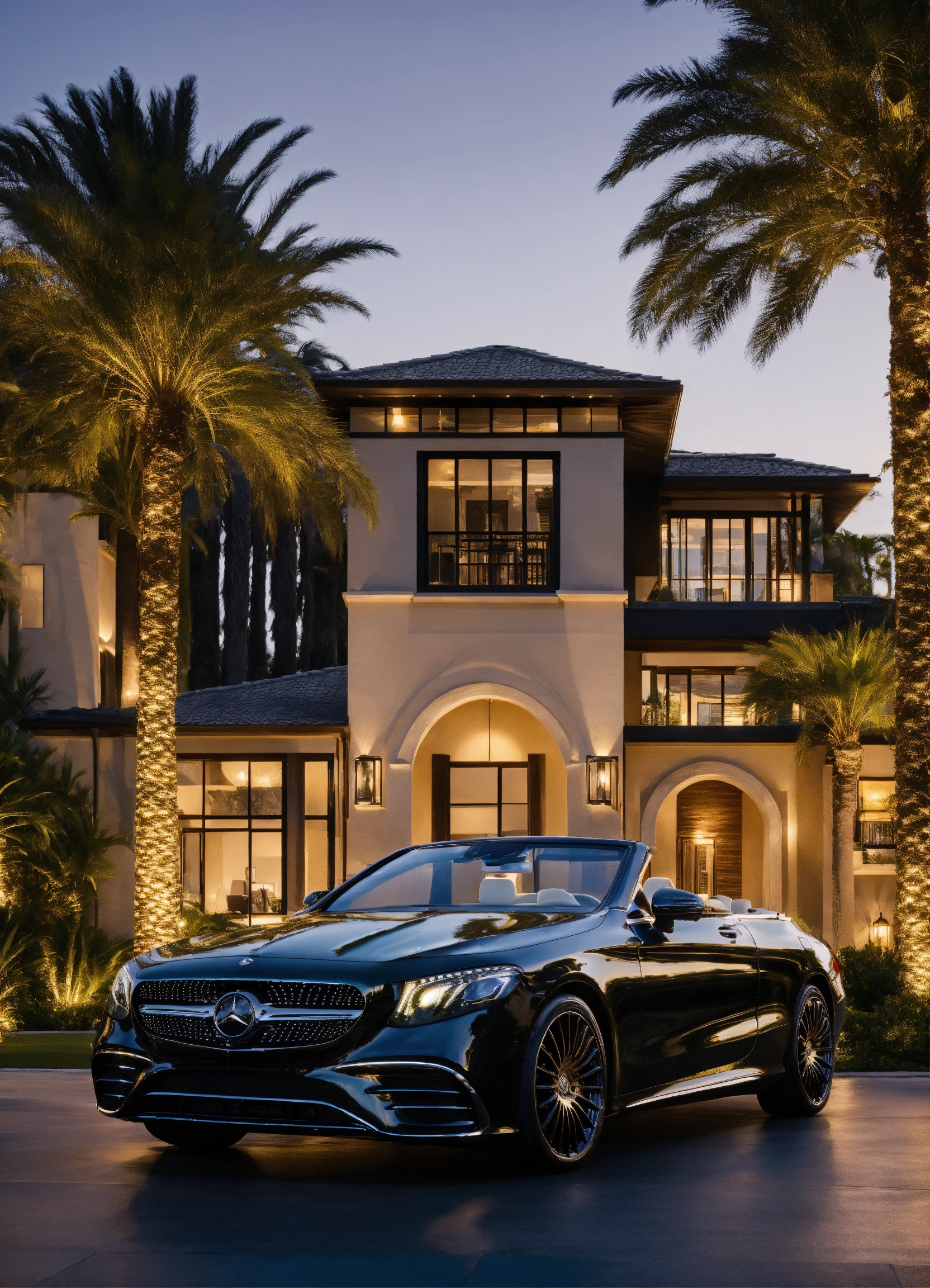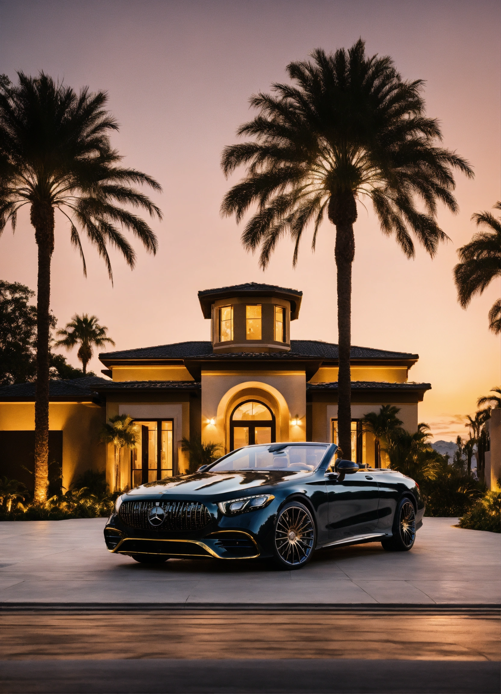 2024 mercedes s class convertible black and gold trim with contemporary mansion and palm trees landscape with golden moonlight background