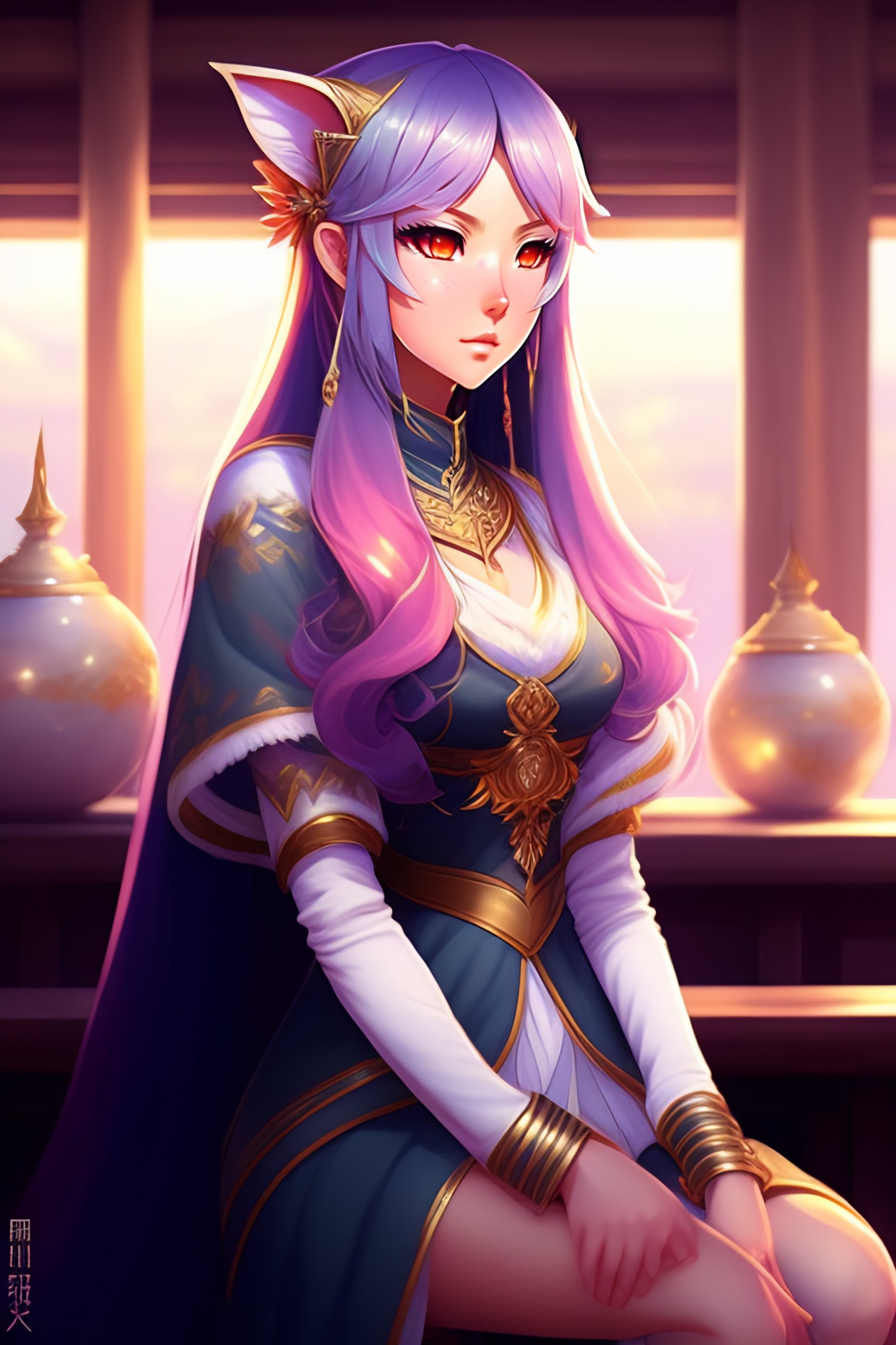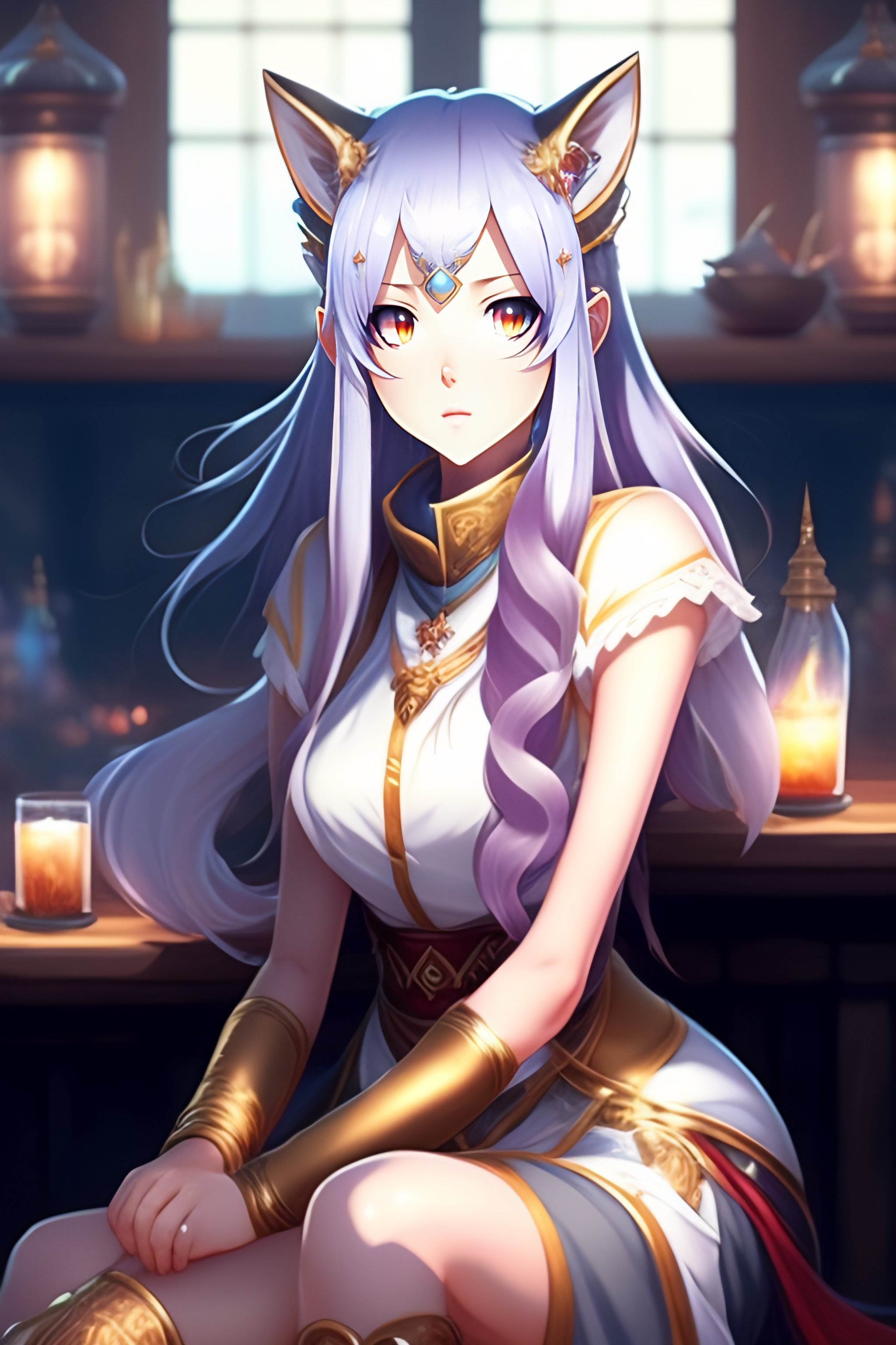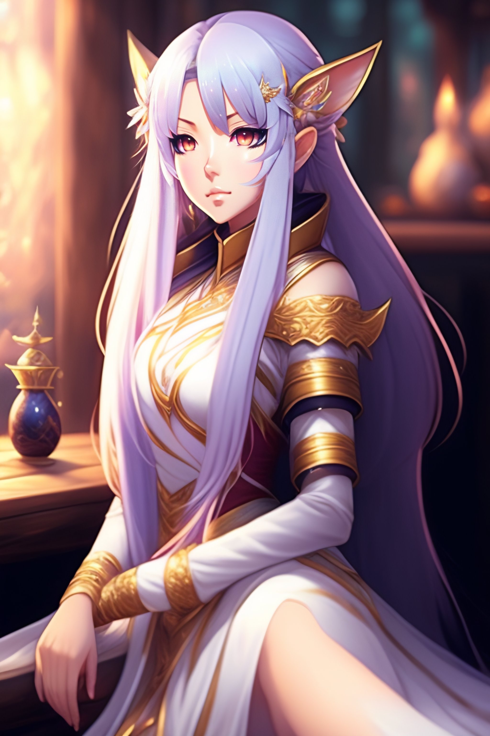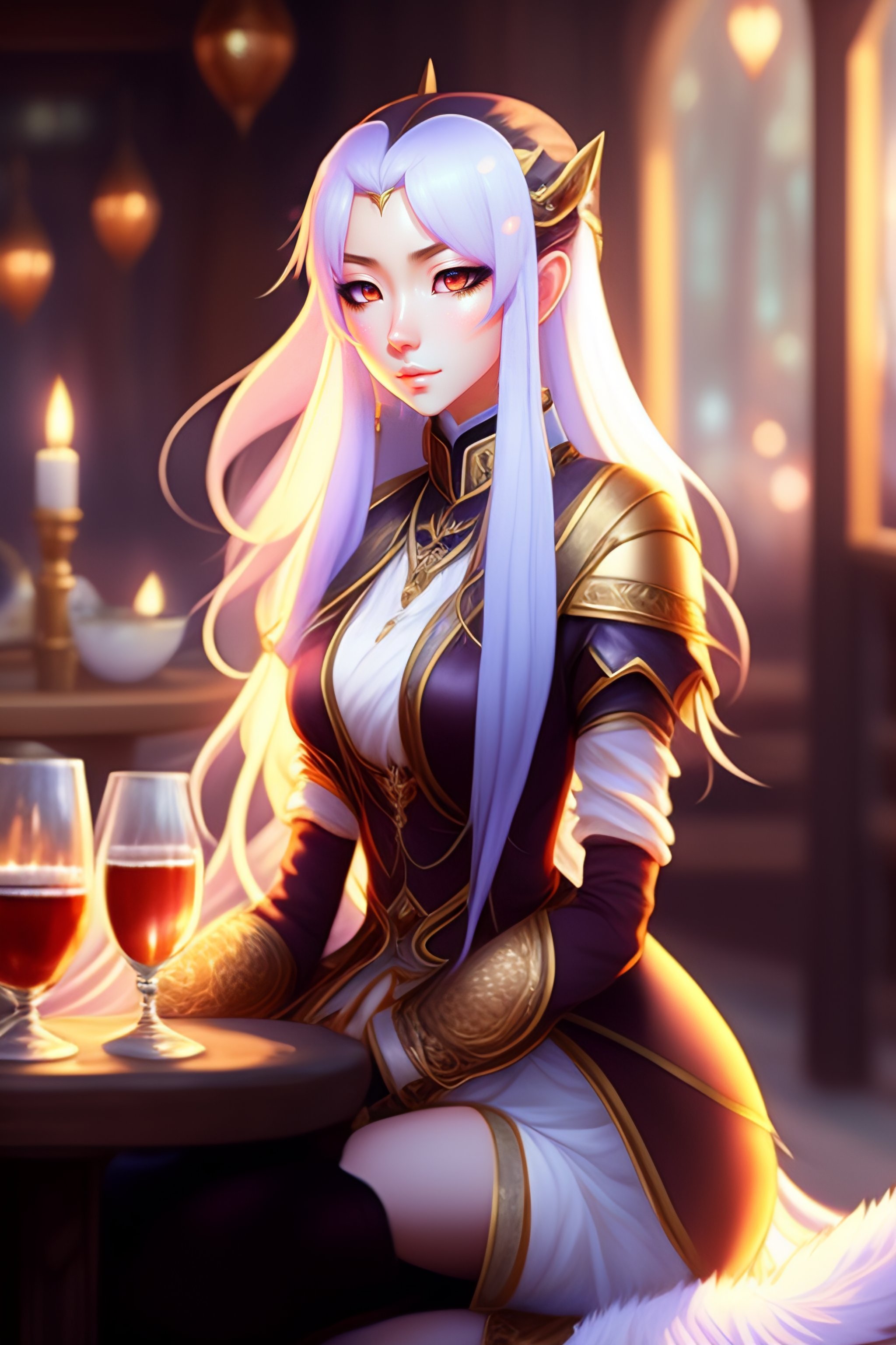 Anime fox girl, arctic hair and eyes, 160cm, hourglass body, ross tran style, xianxia, sitting in a xianxia style tavern, shapeshifting hand, elegant and narcissistic, ice queen, unapproachable, legs crossed from the front, smug eyes, looking down on the world