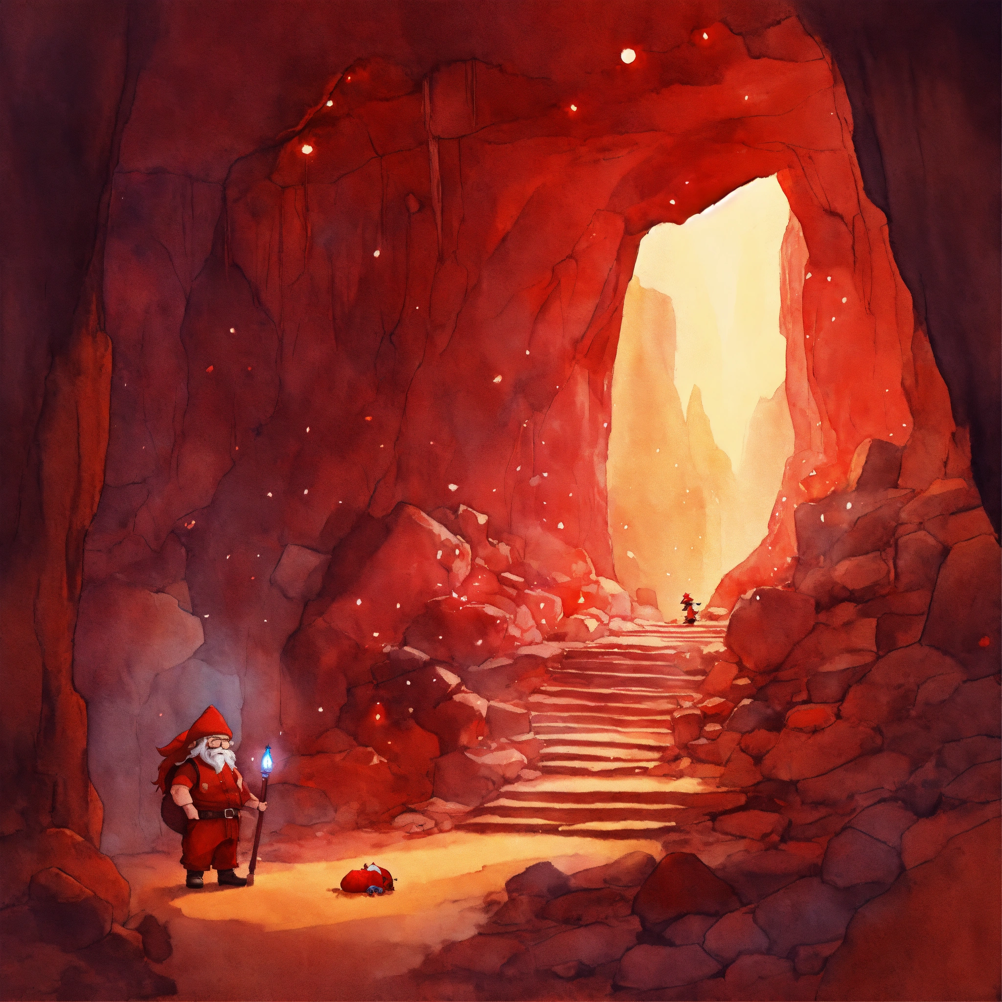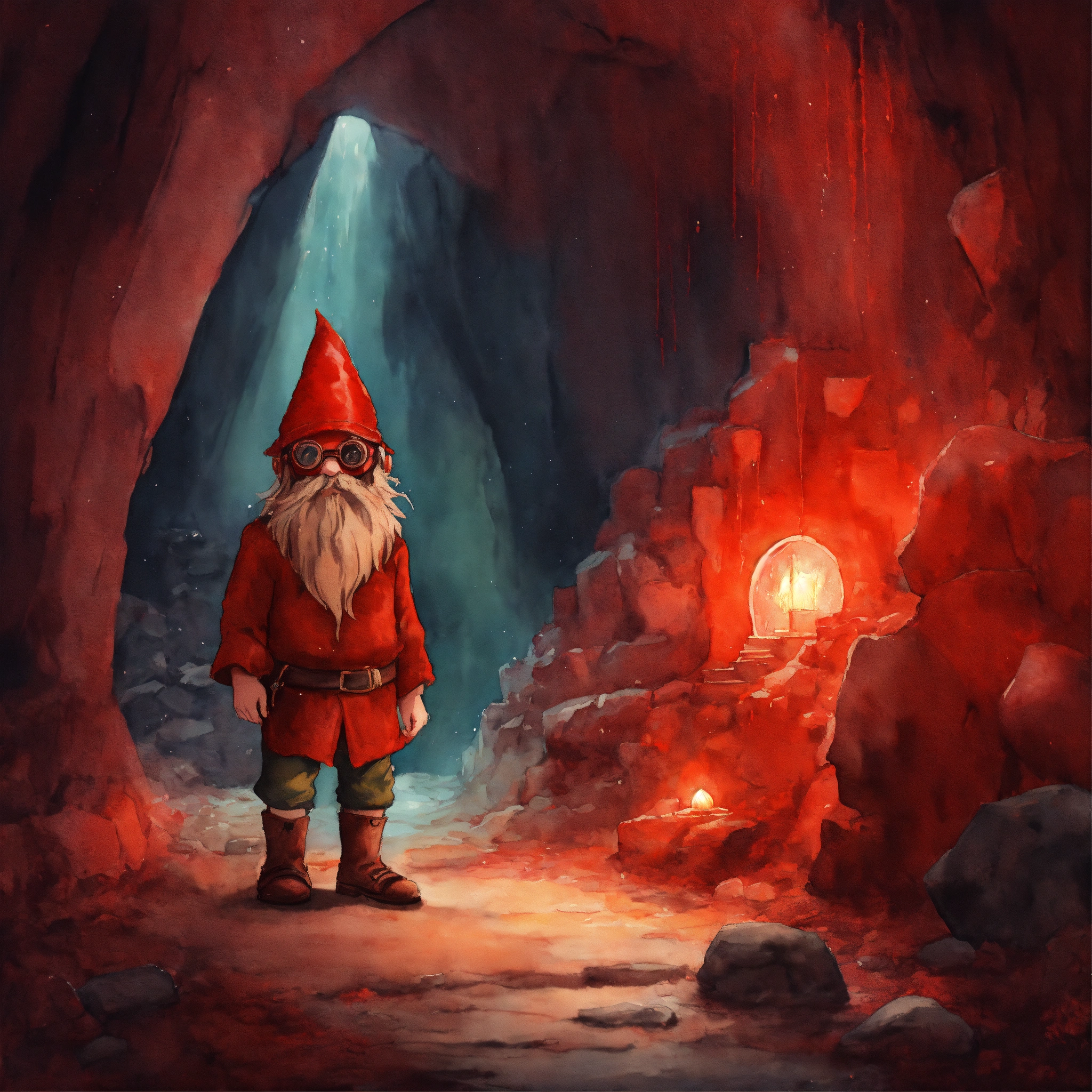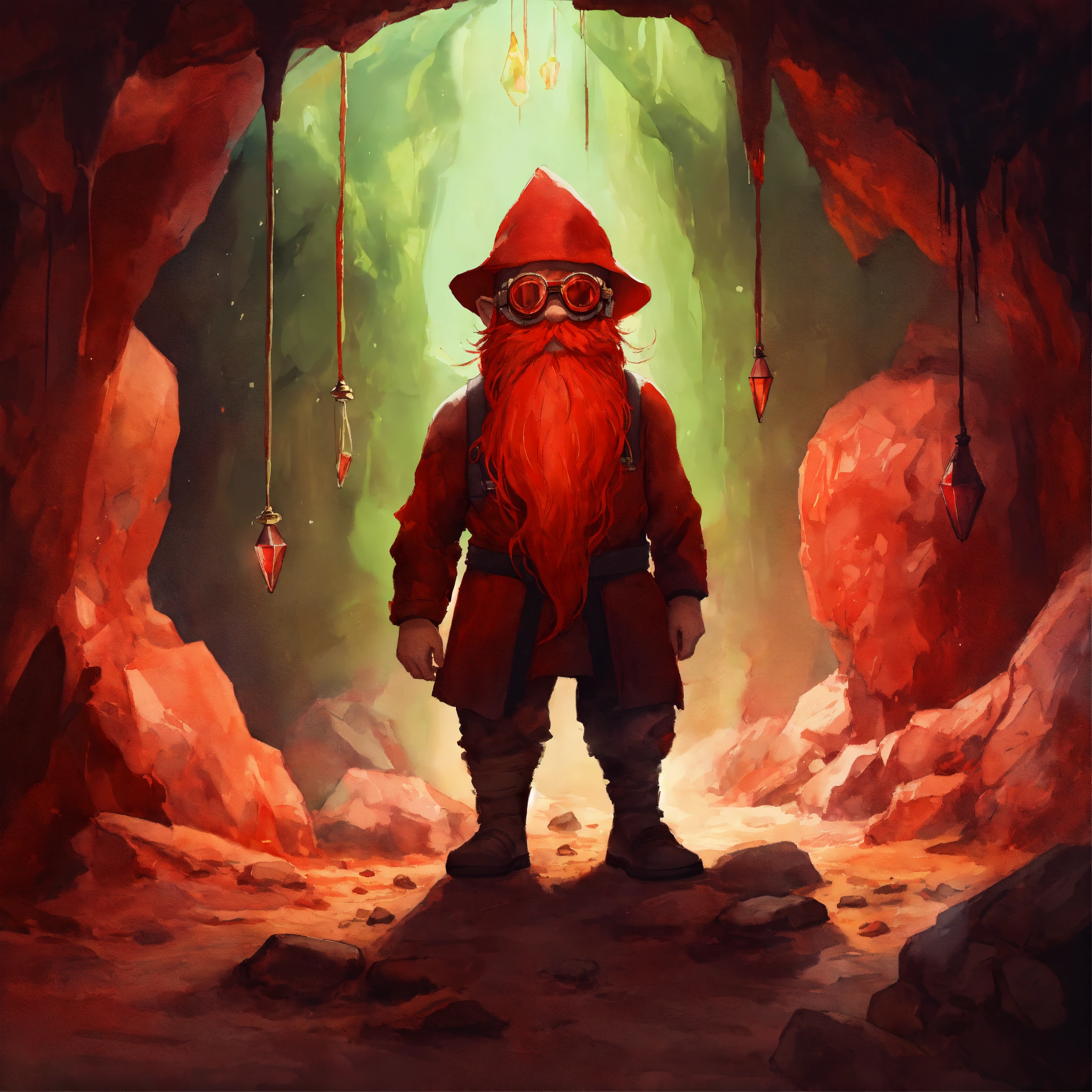 Watercolor painting, simple watercolor on canvas, dim lighting, red light, cave, short muscular skinny gnome, glowing red goggles, huge beard, skinny gnome man, thin dwarf man with large head, tiny skinny body, giant big head, humongous head with little skinny body, dark red clothes, red light, grubby hands, muscular, glowing dark red crystals, dirty clothes, dark red patched pants, huge red goggles, giant head, very small gnome man with giant head and goggles, long hair with bangs, long beard, secret red cave, roots, vines, moss, underground temple, ancient secret tunnel, dark red glow, red crystals, stone spiral staircase, dirt walls, dark ceiling, red light