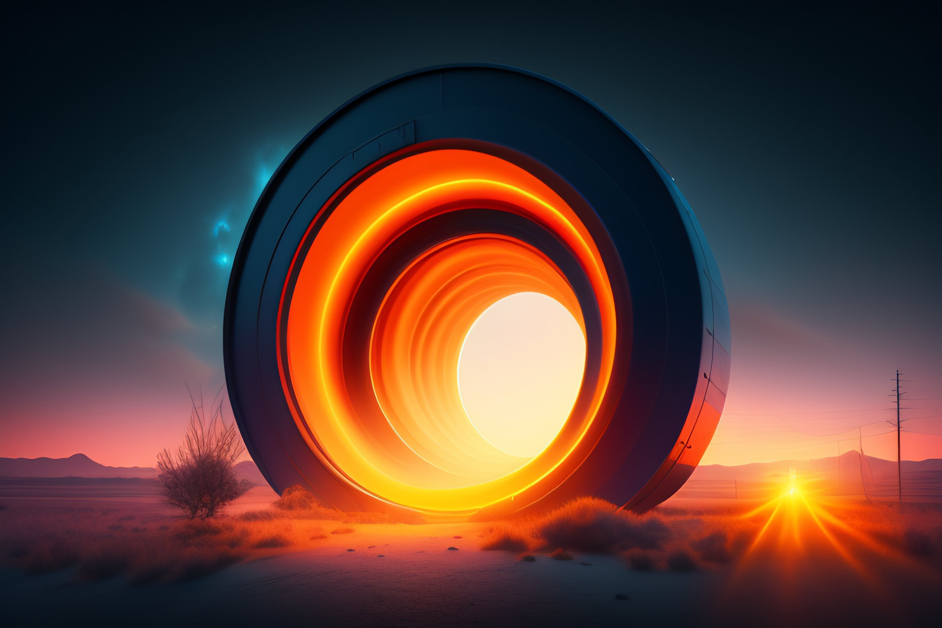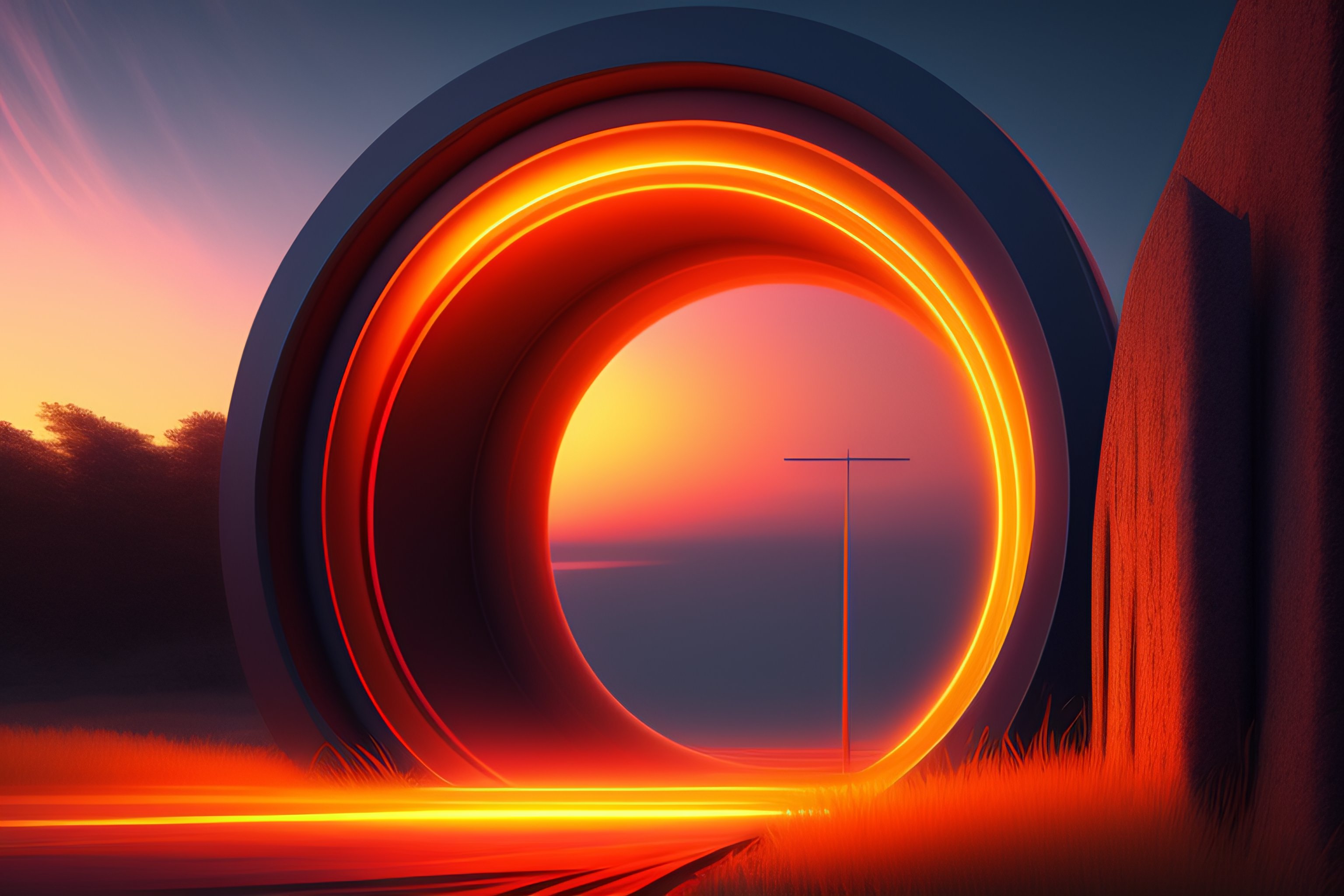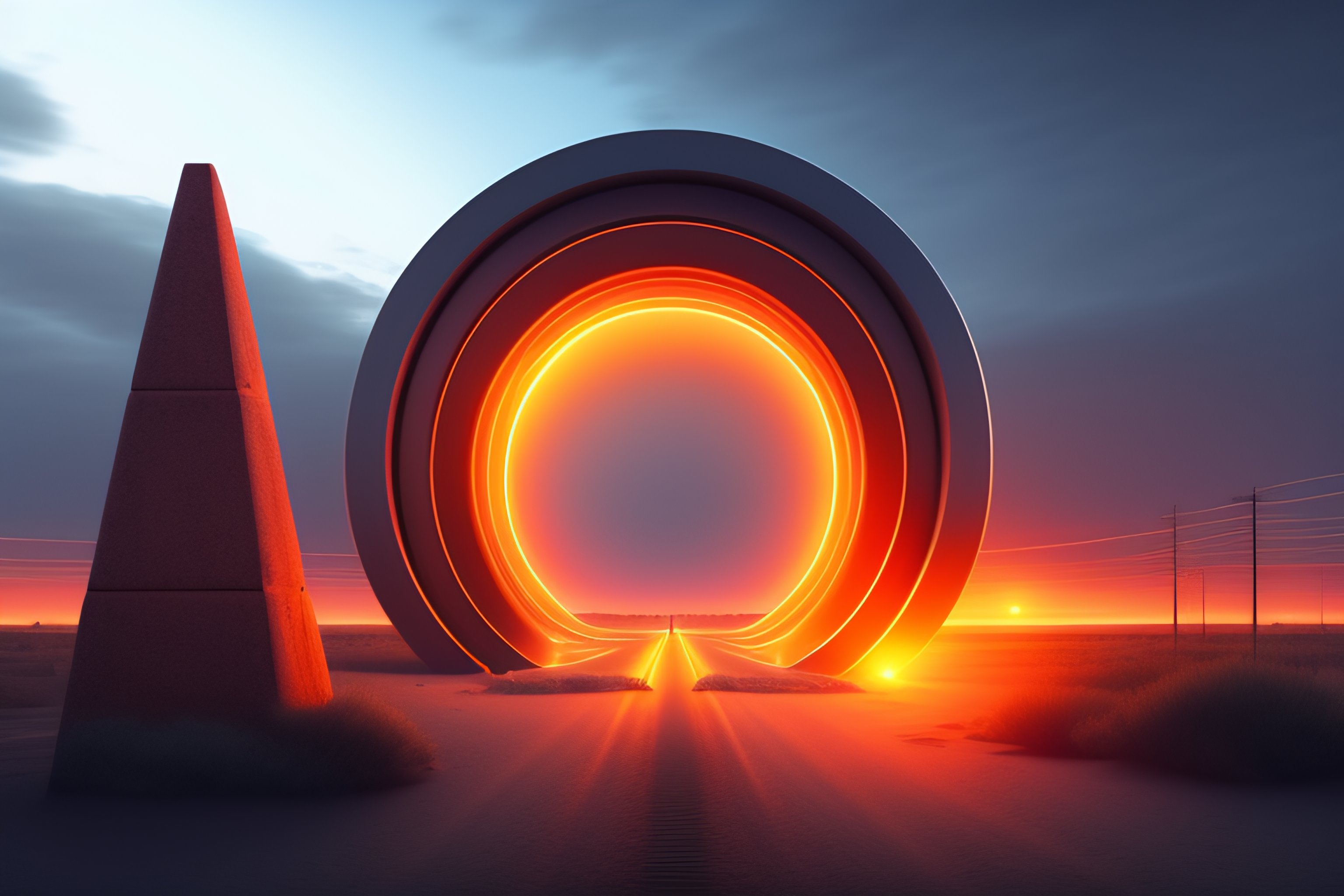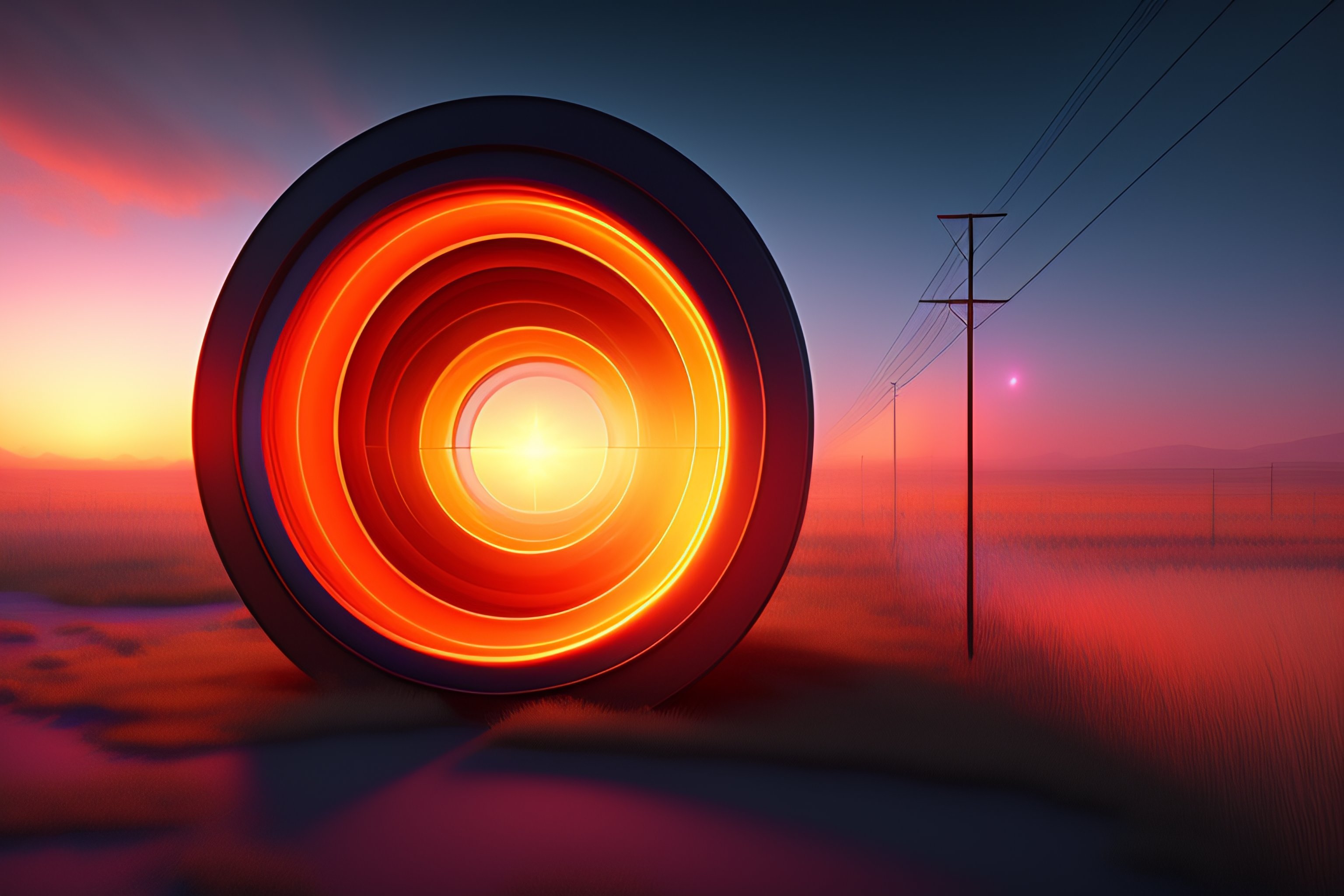 Interdimensional portal with semi-transparent orange light near a power pole, 4k, digital art, super high details