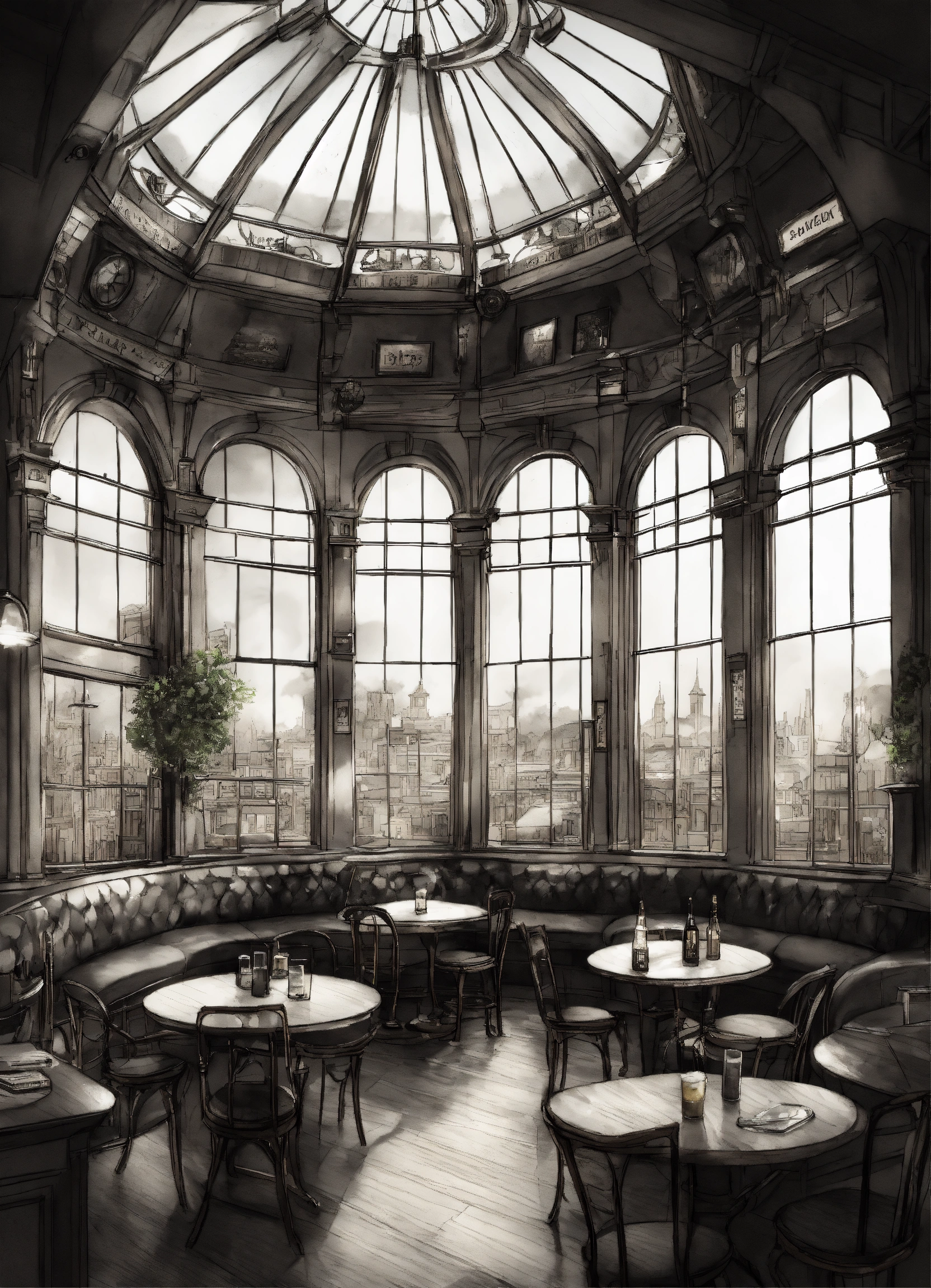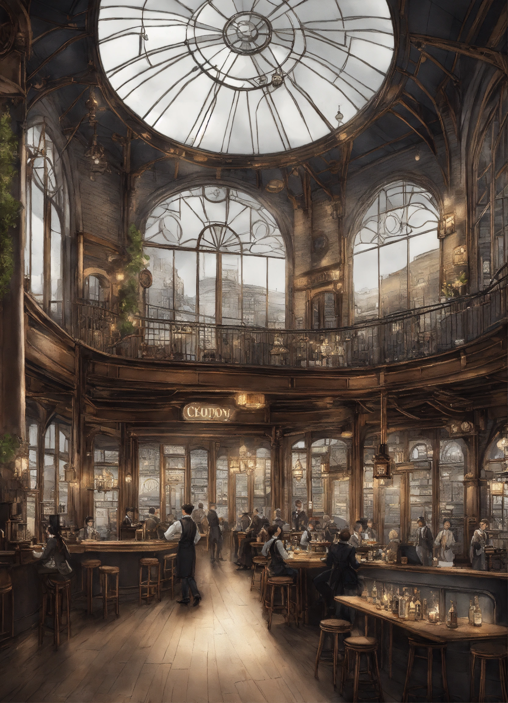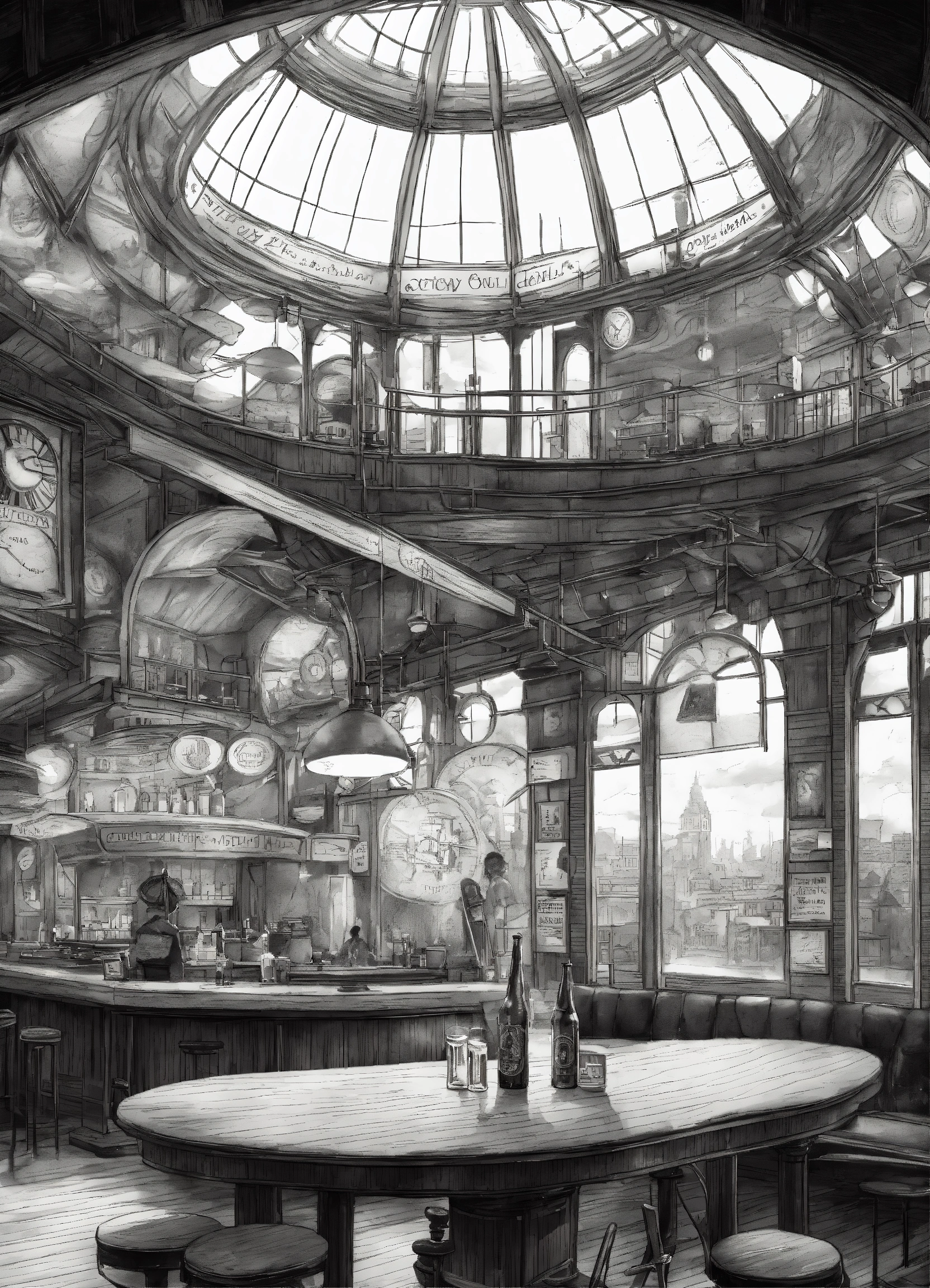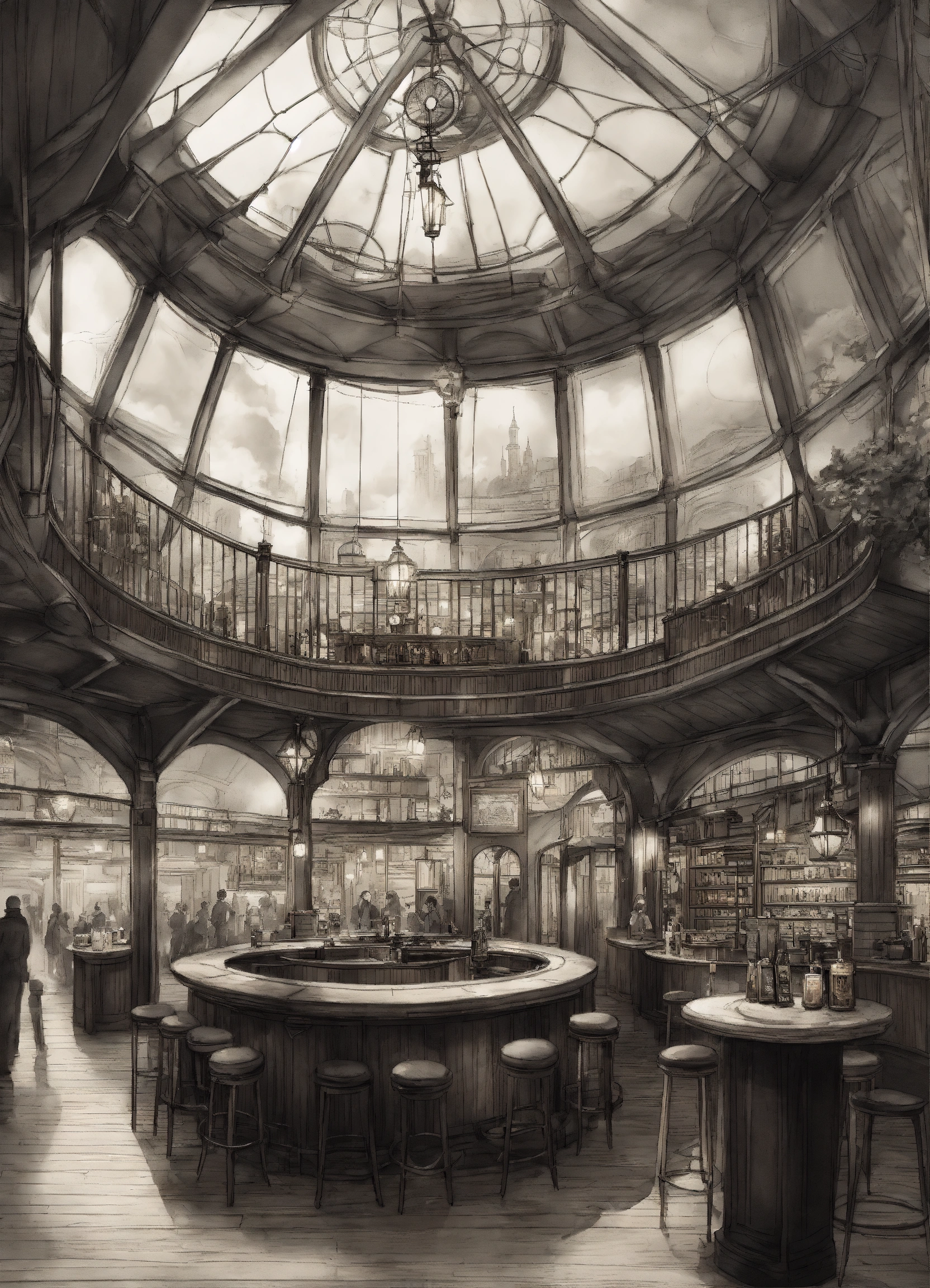A expansive circular environment, with large windows, outside the windows a victorian city . the environment is lit from above and all around there is a large wooden counter where beers are served to various people. a huge sign with the writing "cloudy lounge". glass roof. steampunk style, victorian, greyscale, realistic, pencil sketch.