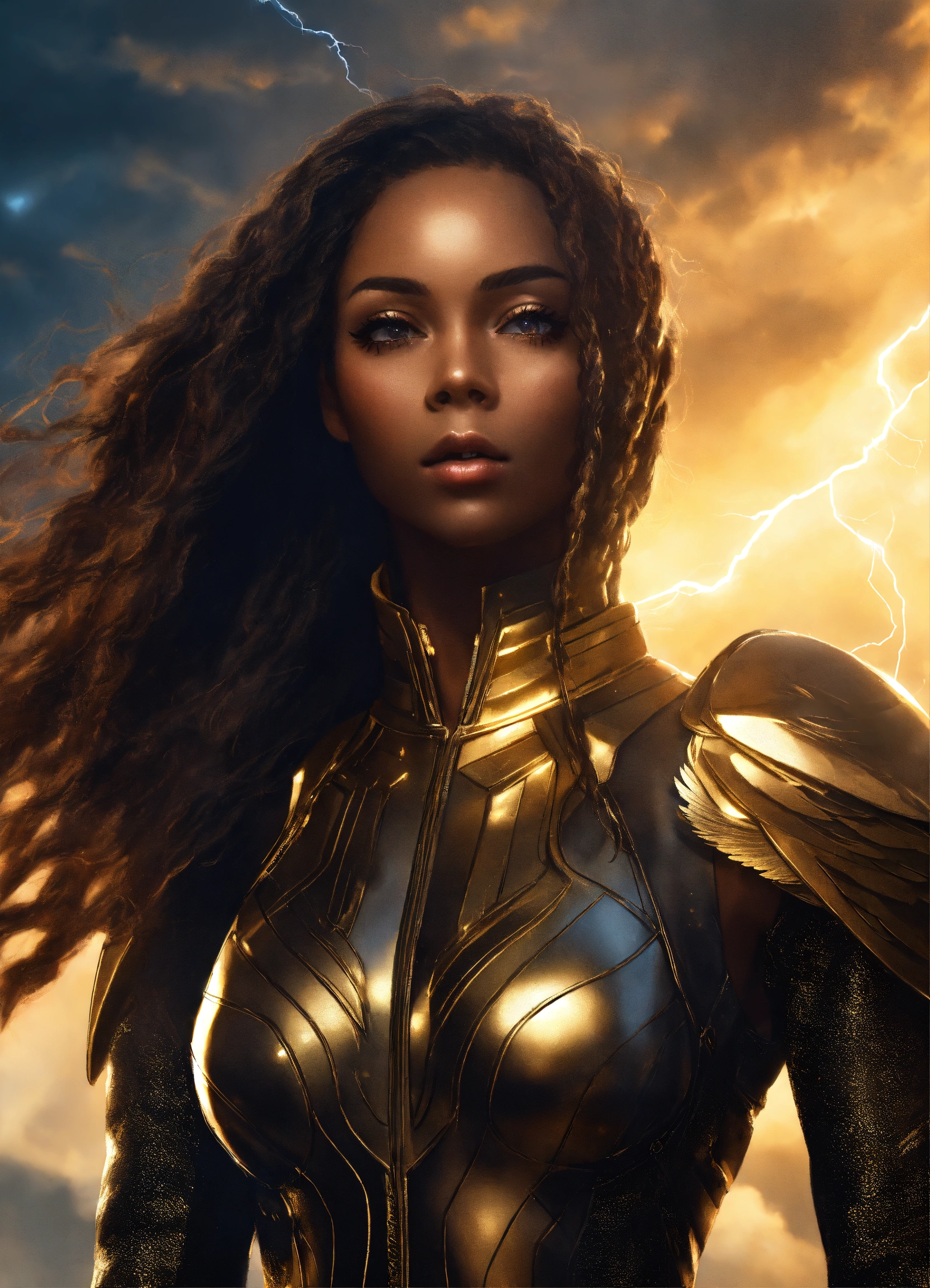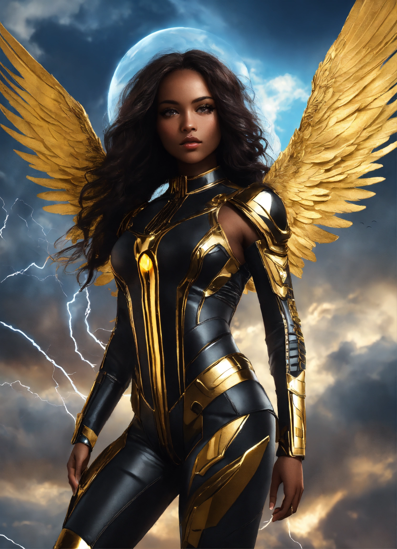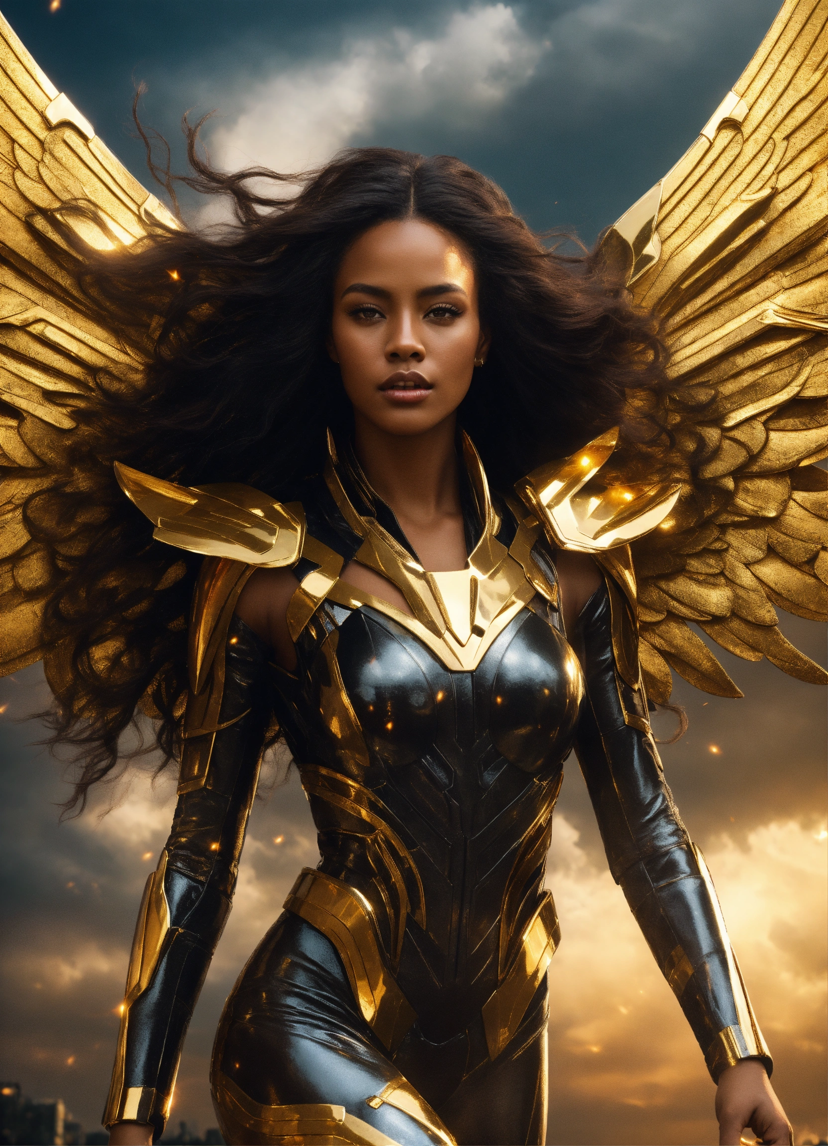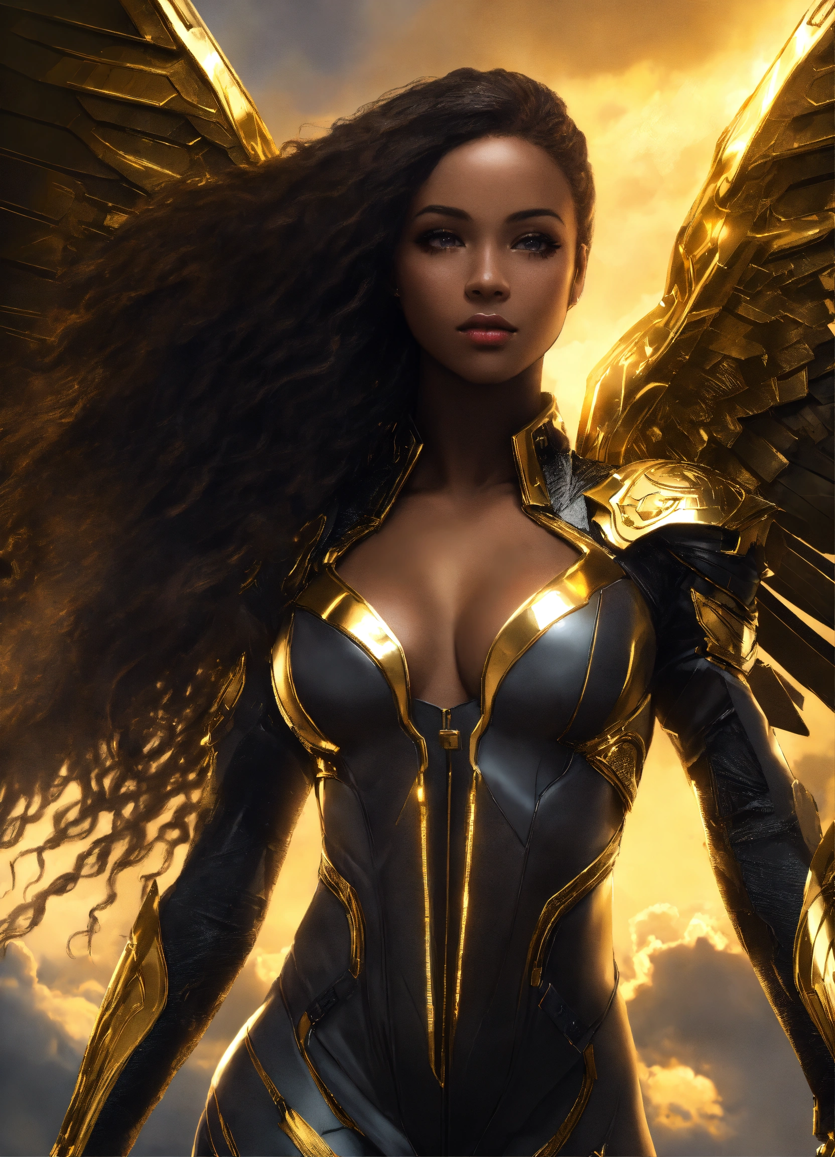 Black futuristic warrior, beautiful black futuristic warrior angel girl dark brown skin with wings, beautiful perfect face, shapely hour-glass figure long flowing hair, wearing a gold super spy stealth suit, she's floating in the sky with clouds and gold lightning behind her, fantasy, high detail, realistic photo, high detail, digital painting, cinematic, stunning, hyper-realistic, sharp focus, high resolution 8k, insanely detailed
