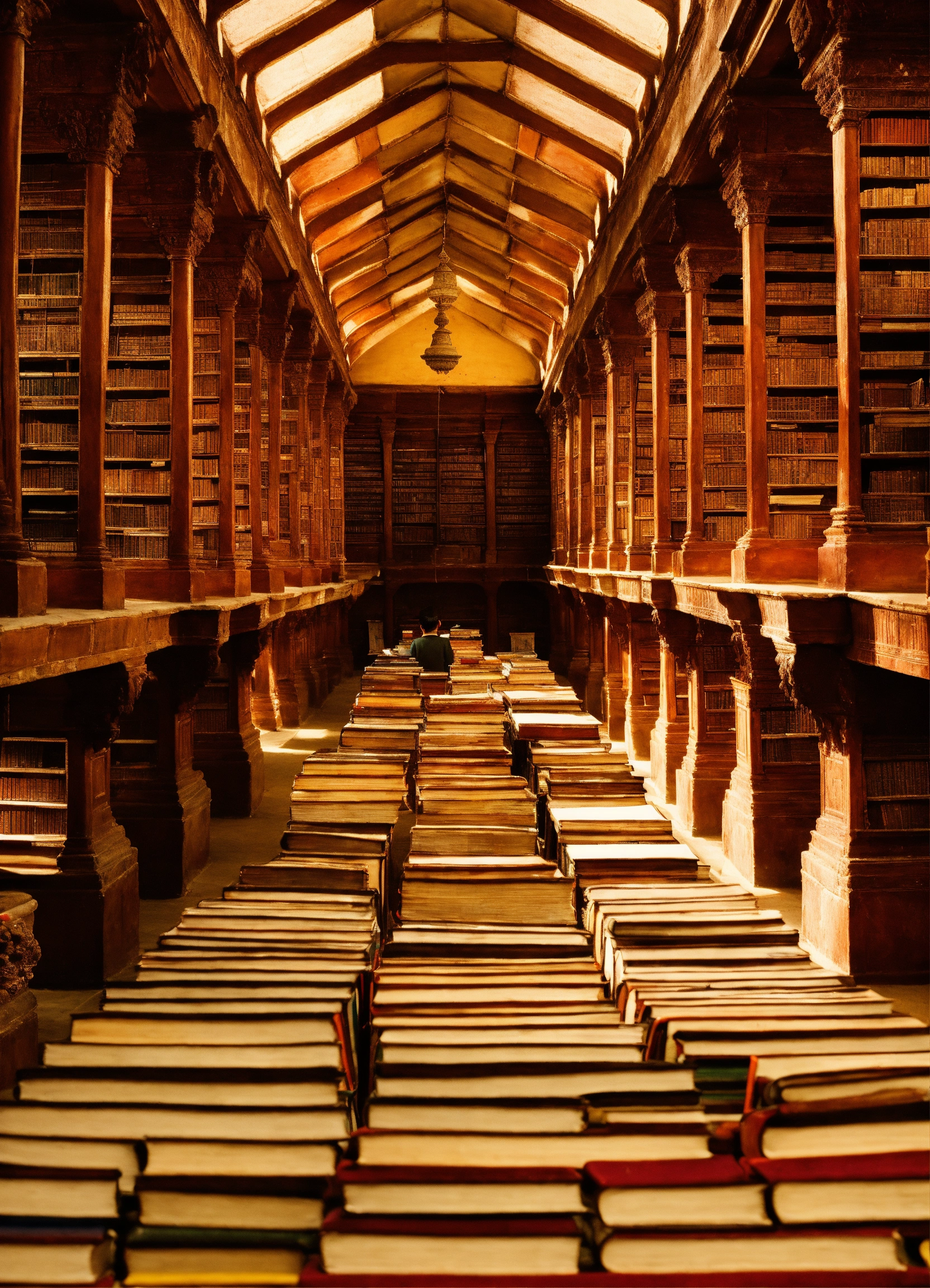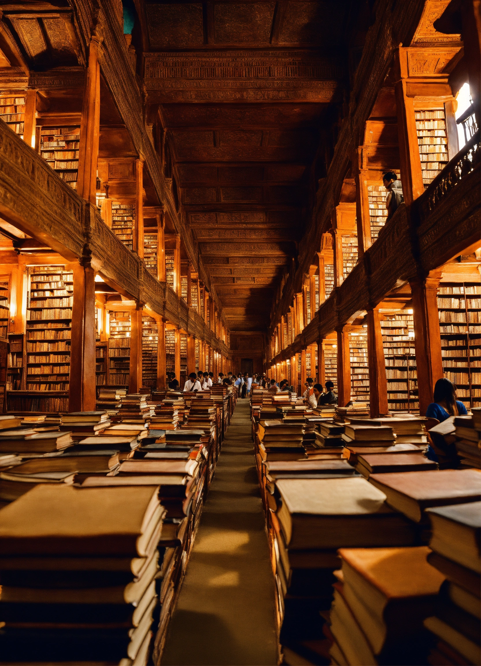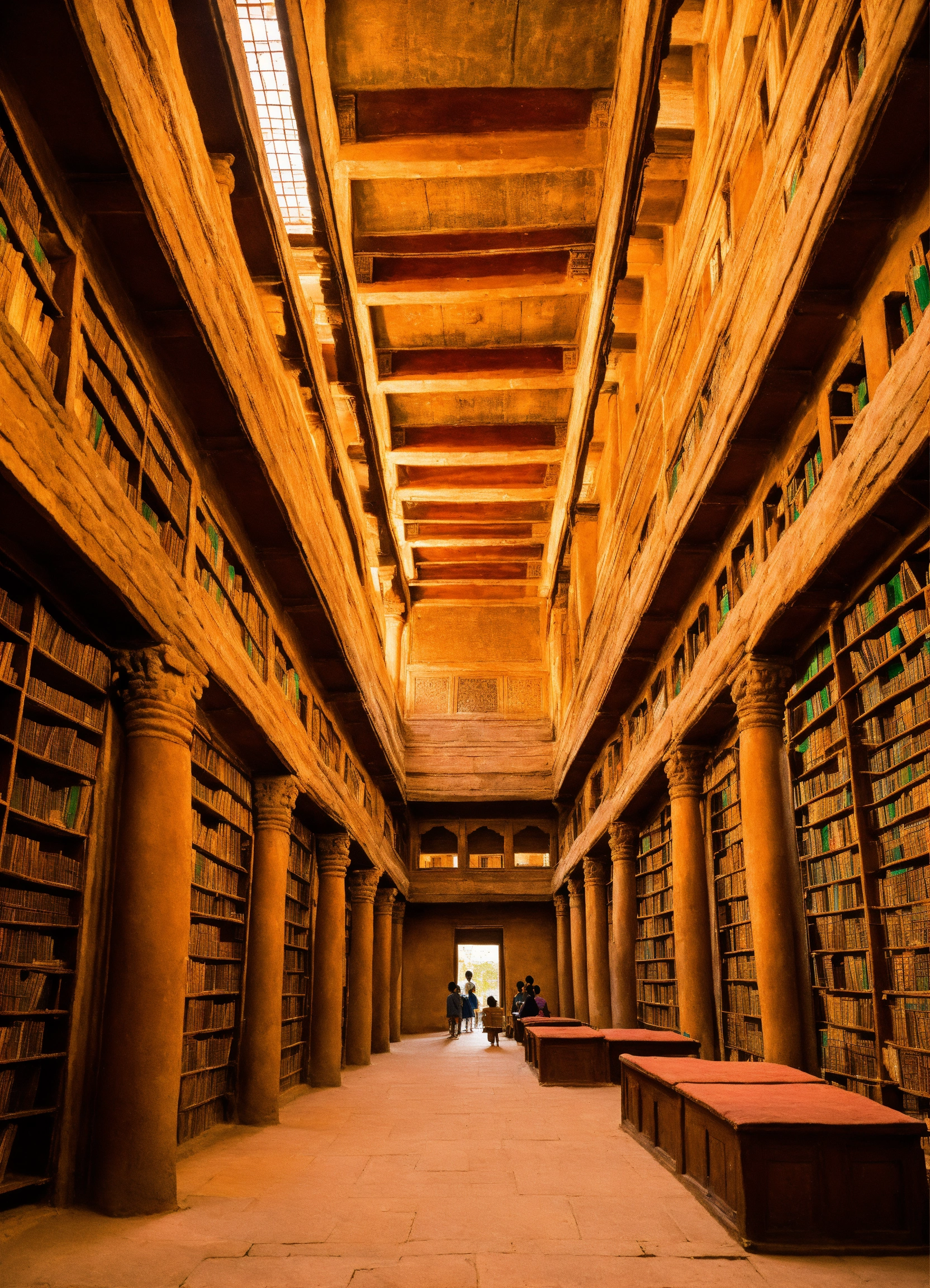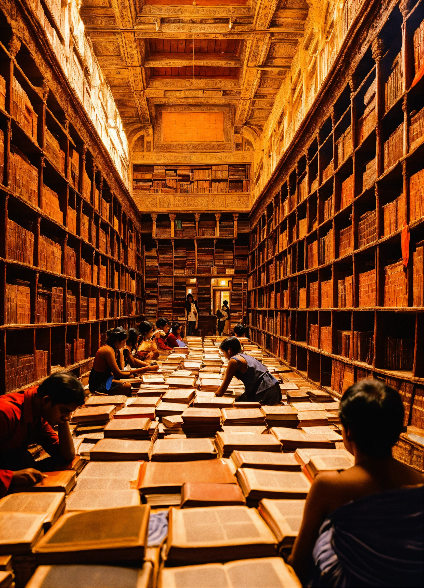 Ancient indian library containing hundreds of thousands of books, ancient india, surrounded by students looking at the books