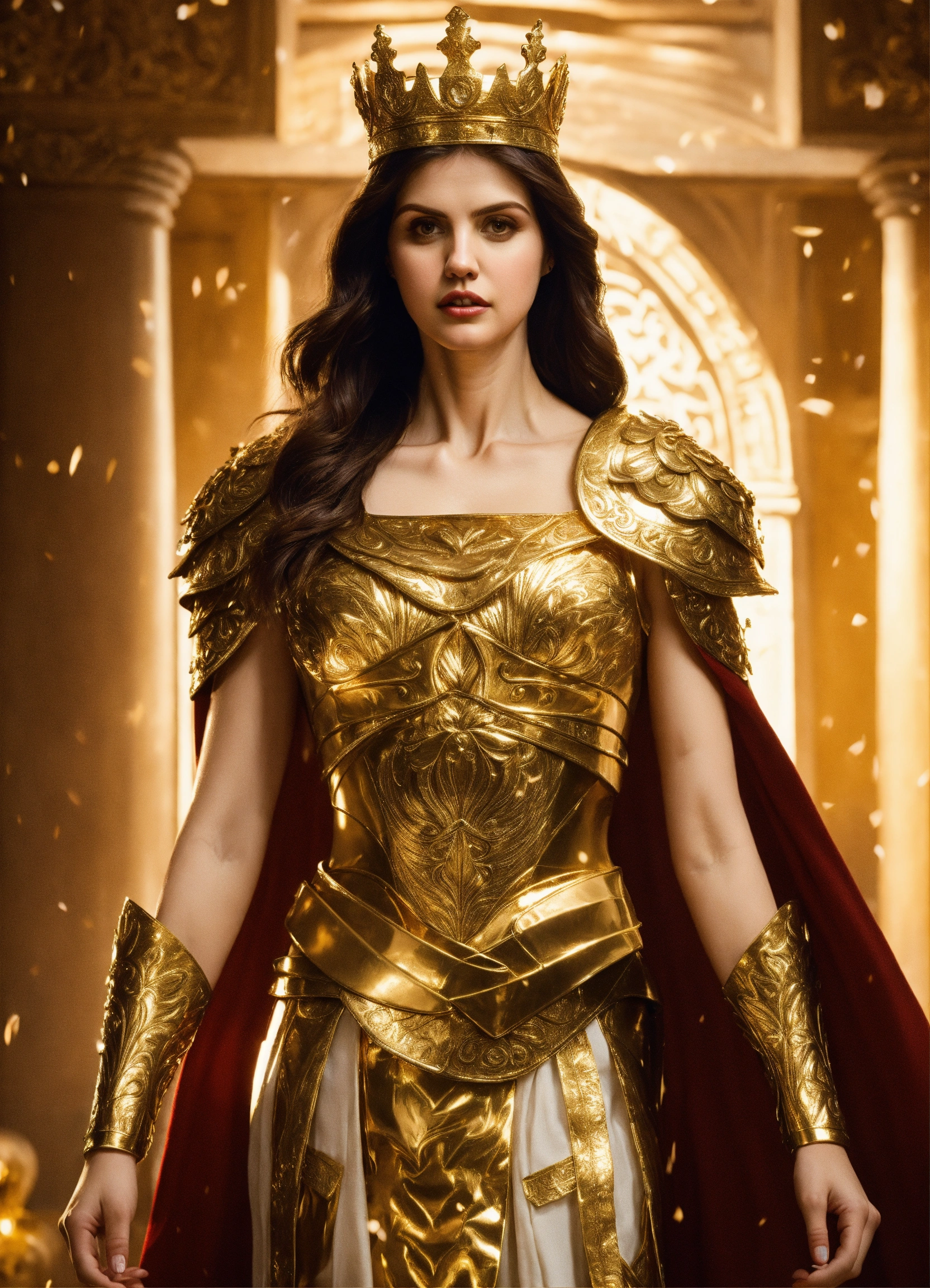 Alexandra daddario as greek goddess in golden armor with crown with white cape