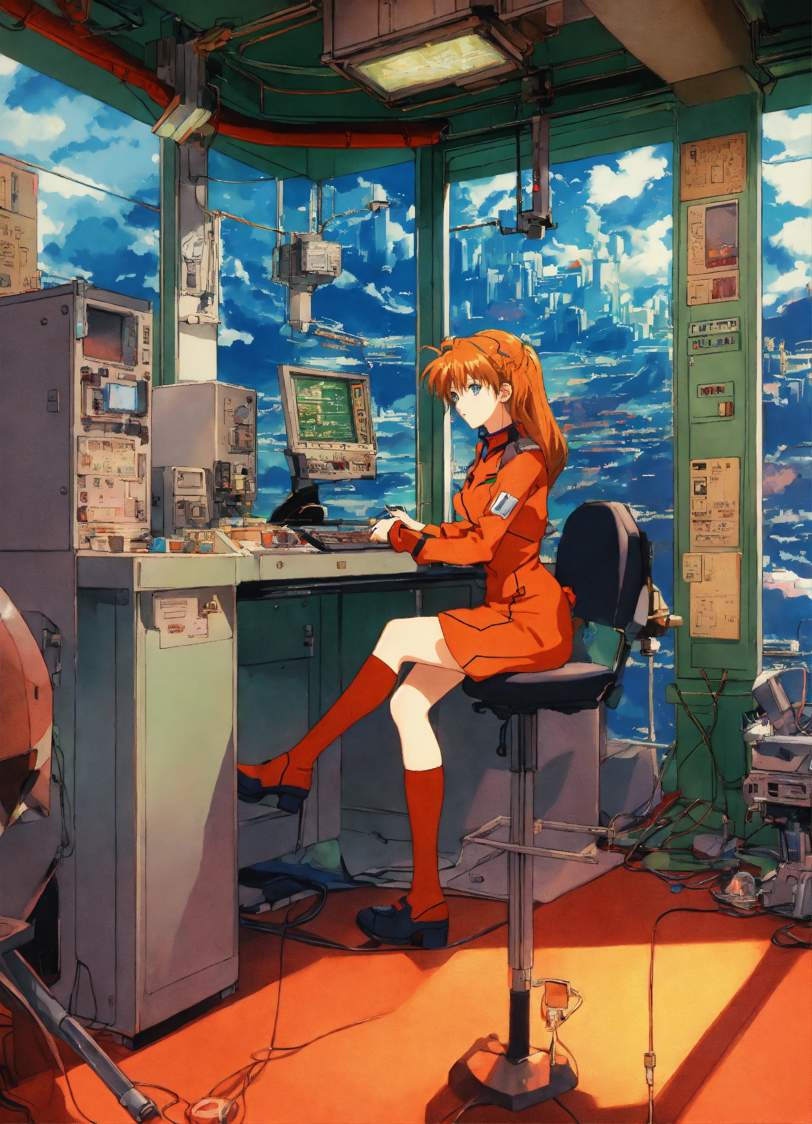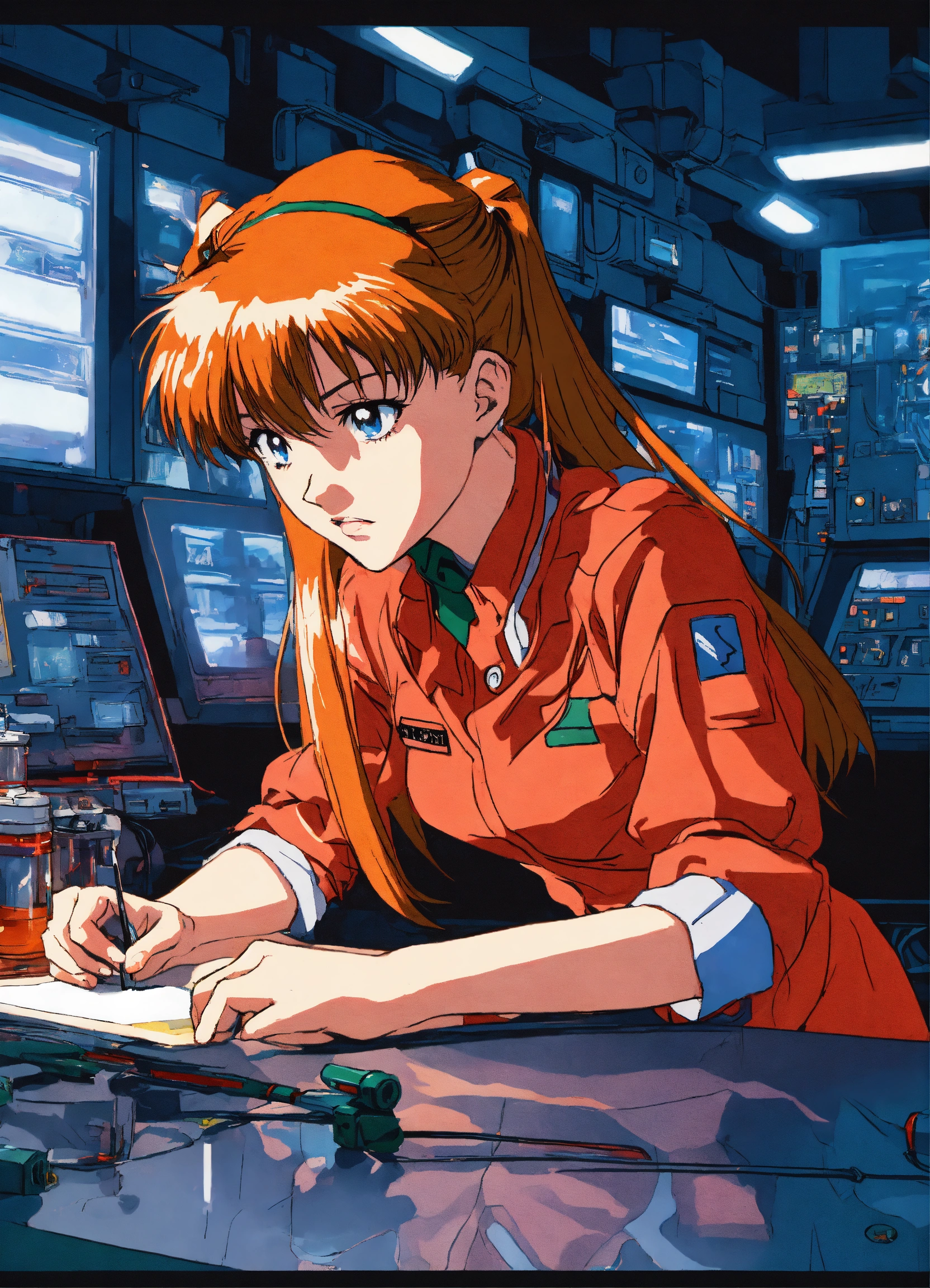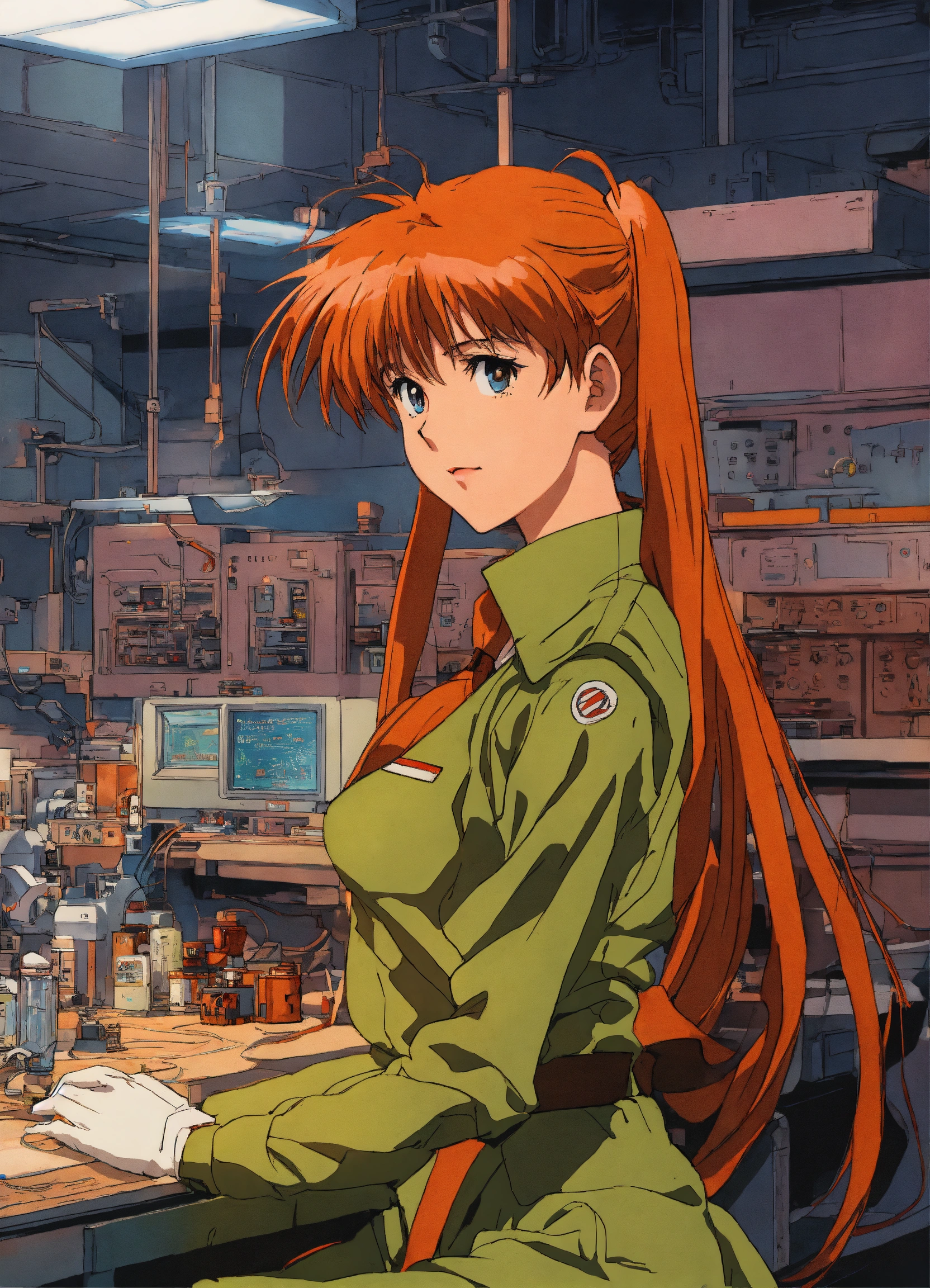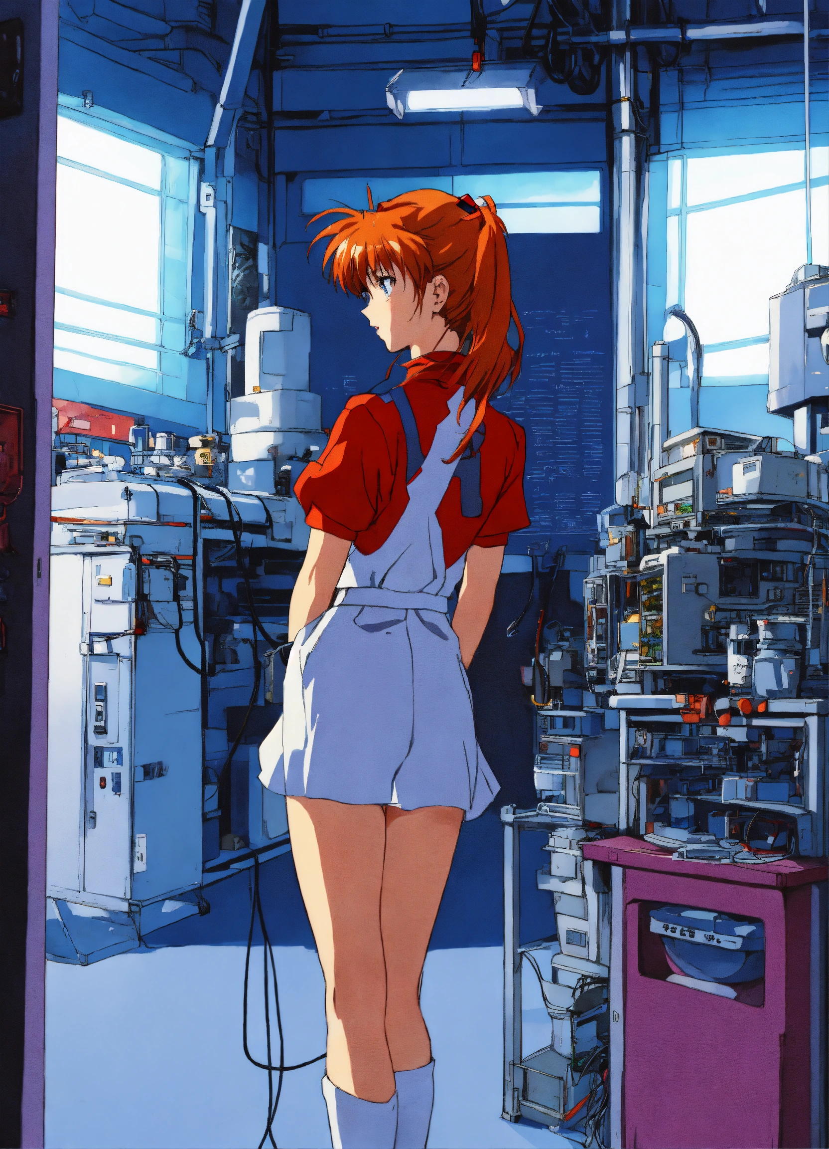 Anime illustration of asuka langley soryu from neon genesis evangelion, detailed scene, stunning details, vintage 90's anime, detailed environment, inside the lab