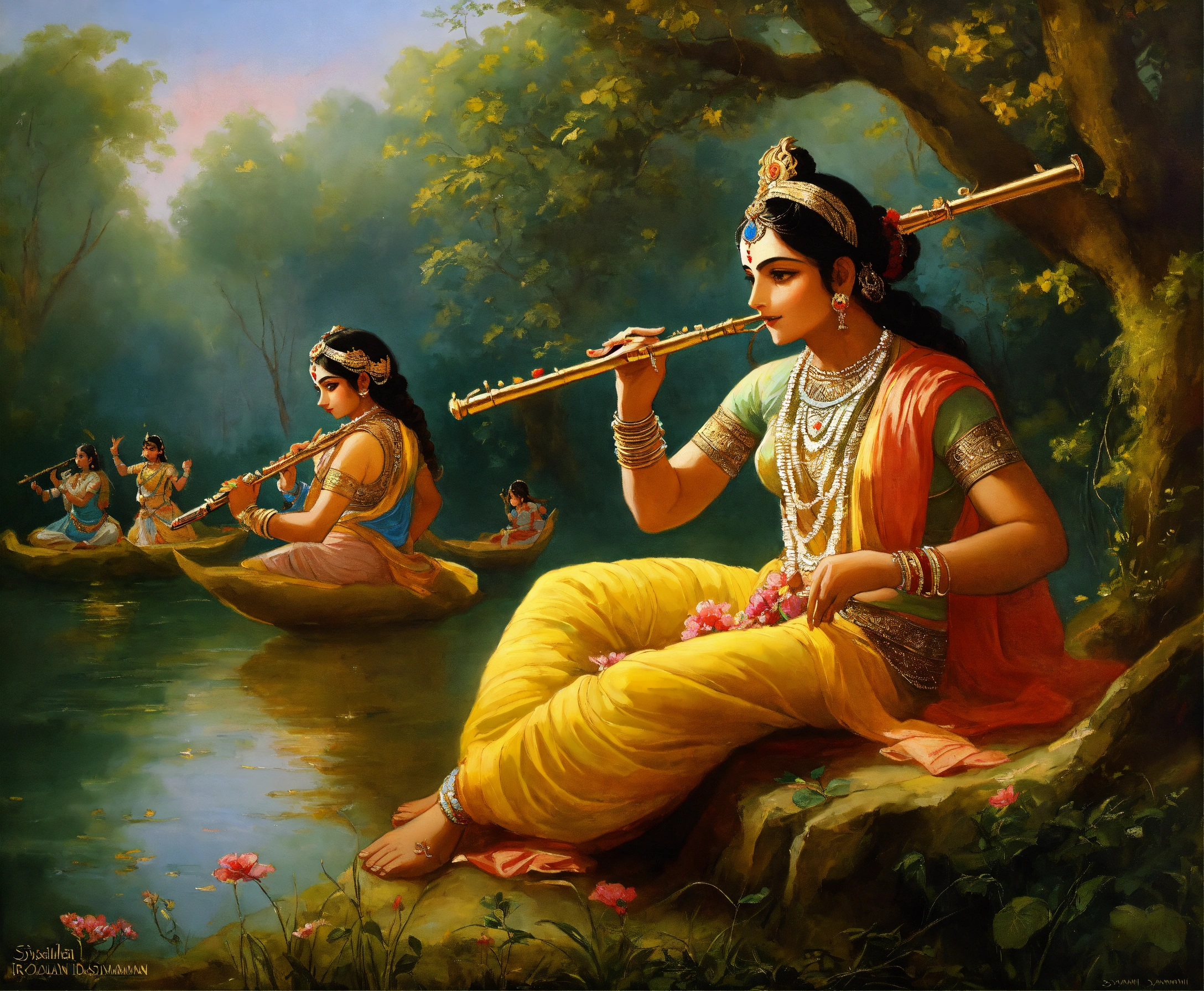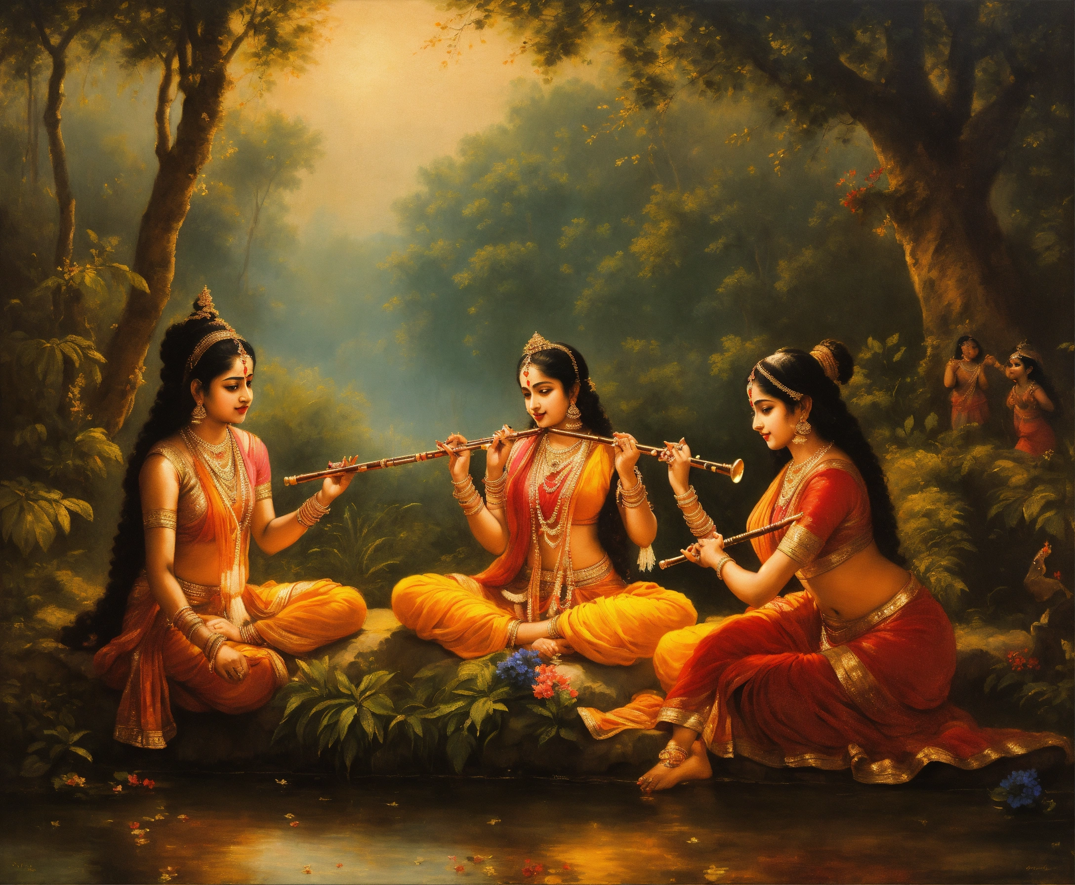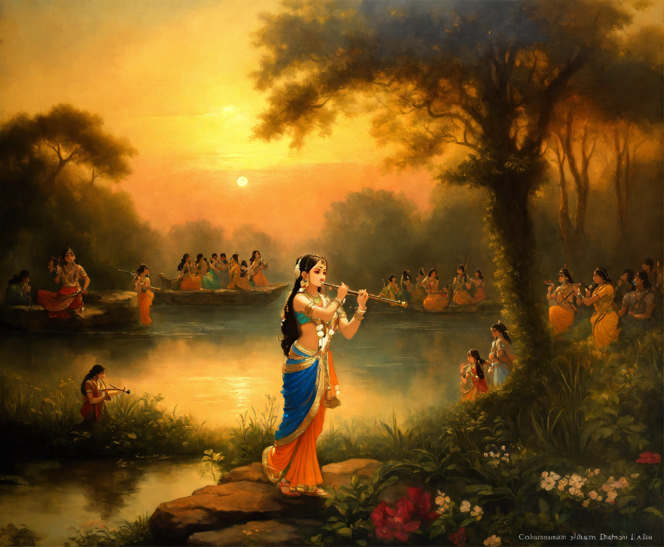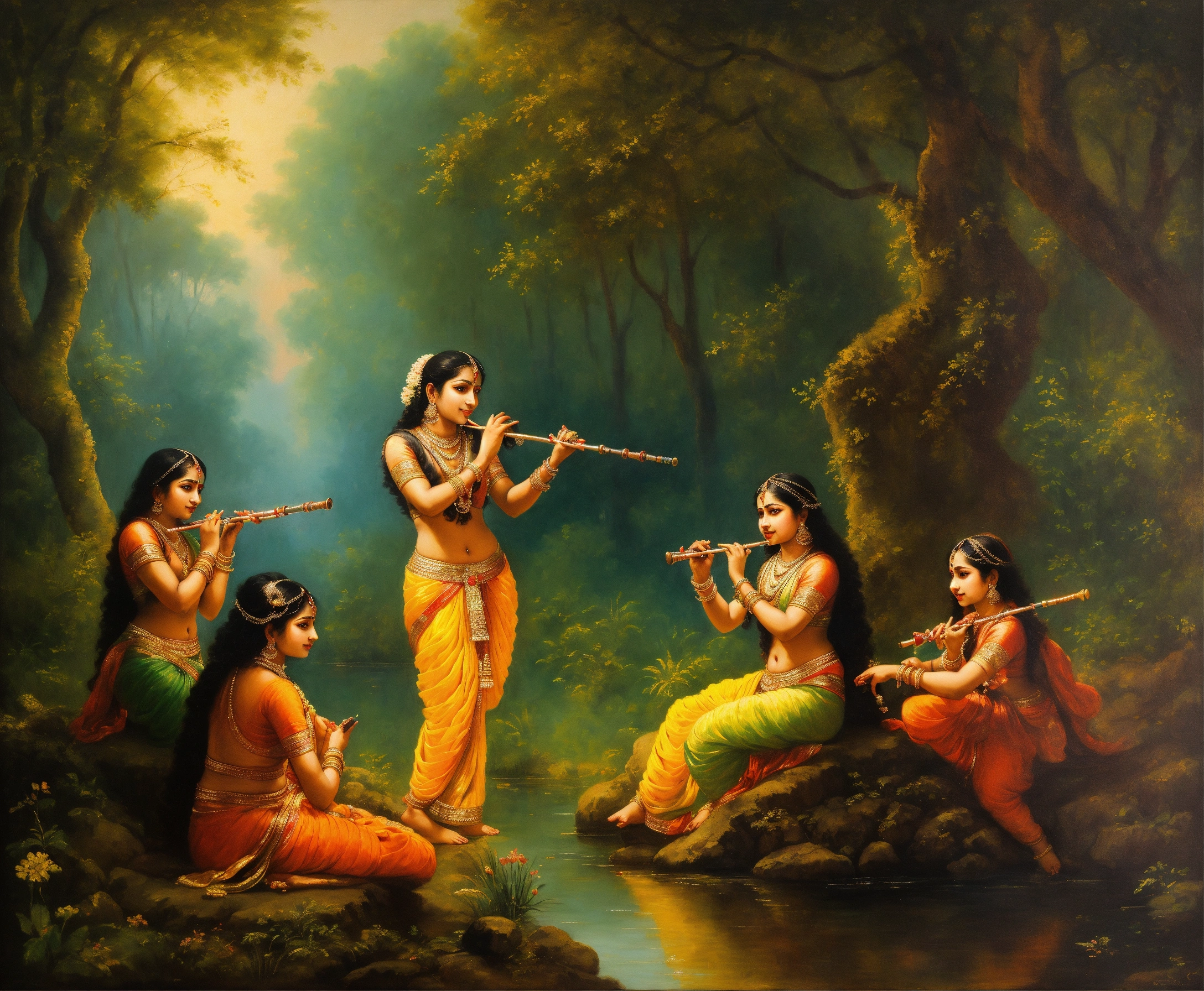Lord krishna playing the flute, gopi, indian forest, beautiful girls, dusk, young indian girls, lord krishna and the gopis, rasalila, dancing, beautiful, art, realistic, painting, paintings by syamarani dasi, isckon painting, romanticism, rembrandt