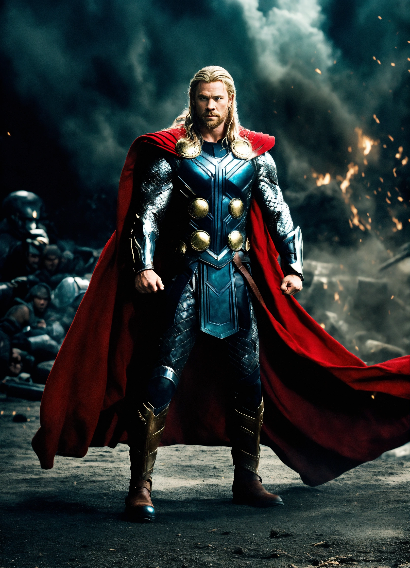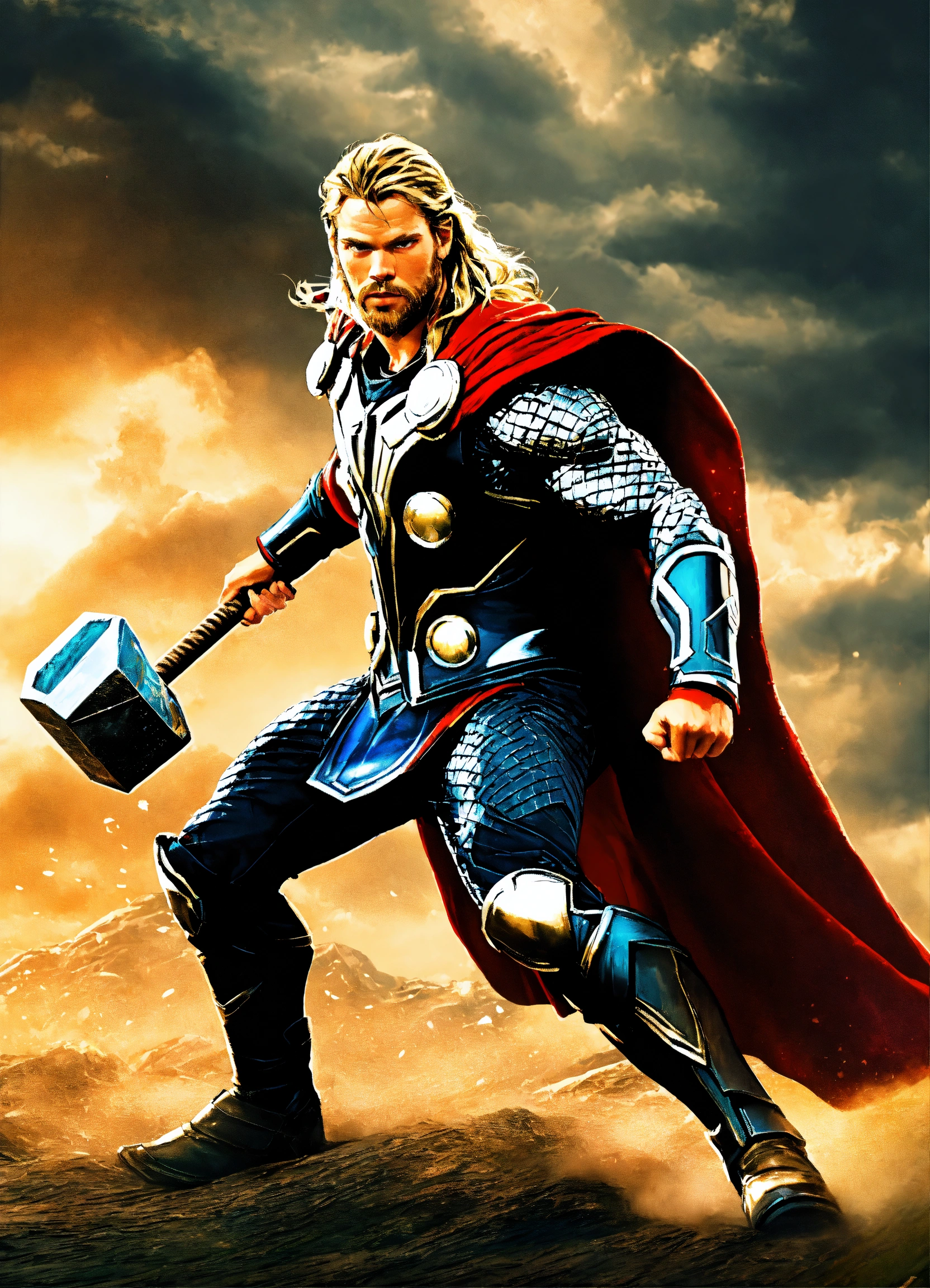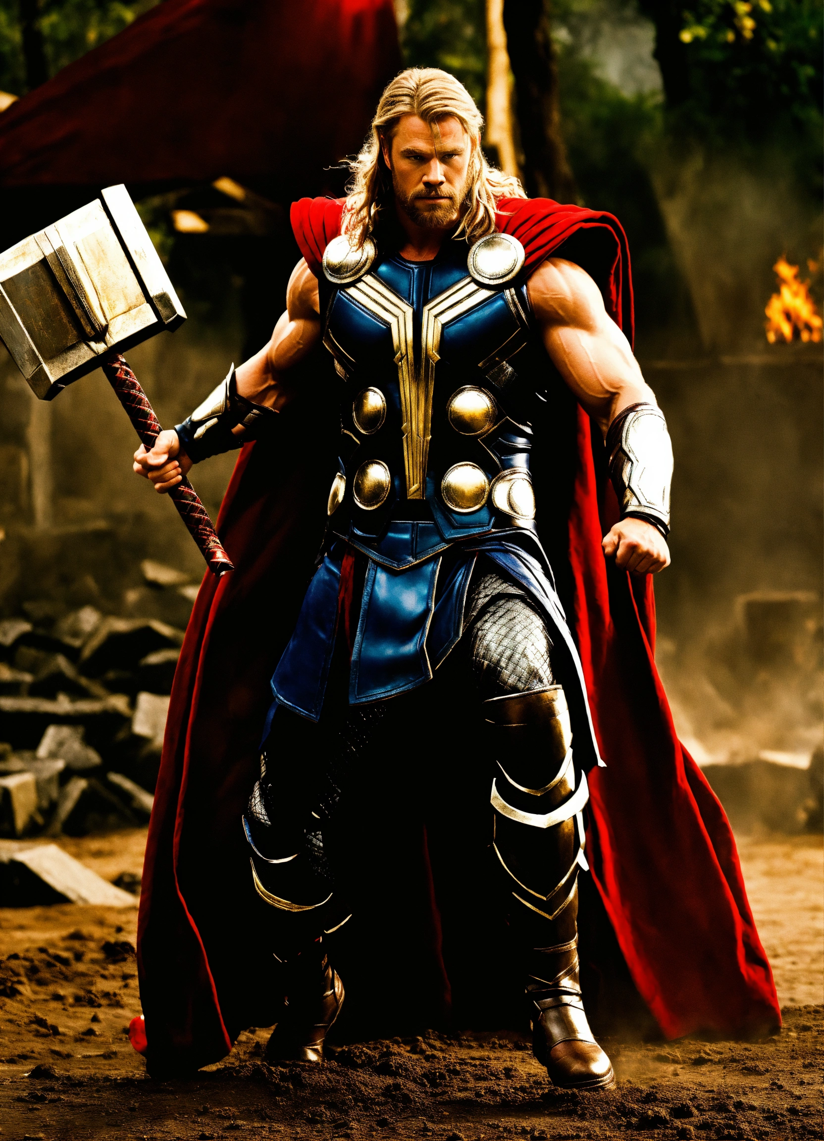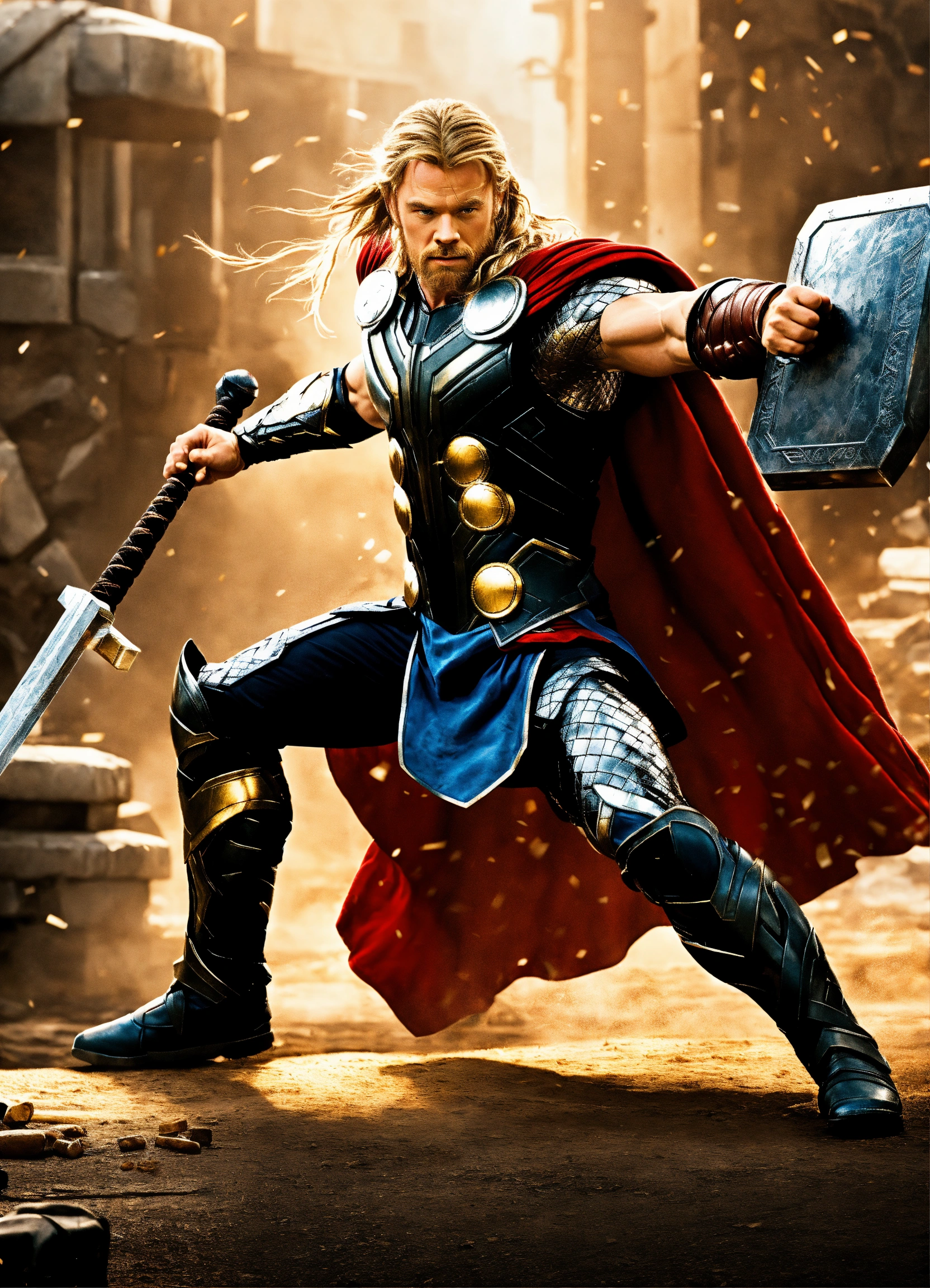 Produce me an image of thor in fighting action, movie image. ensure high resolution, 8k image, realistic.
