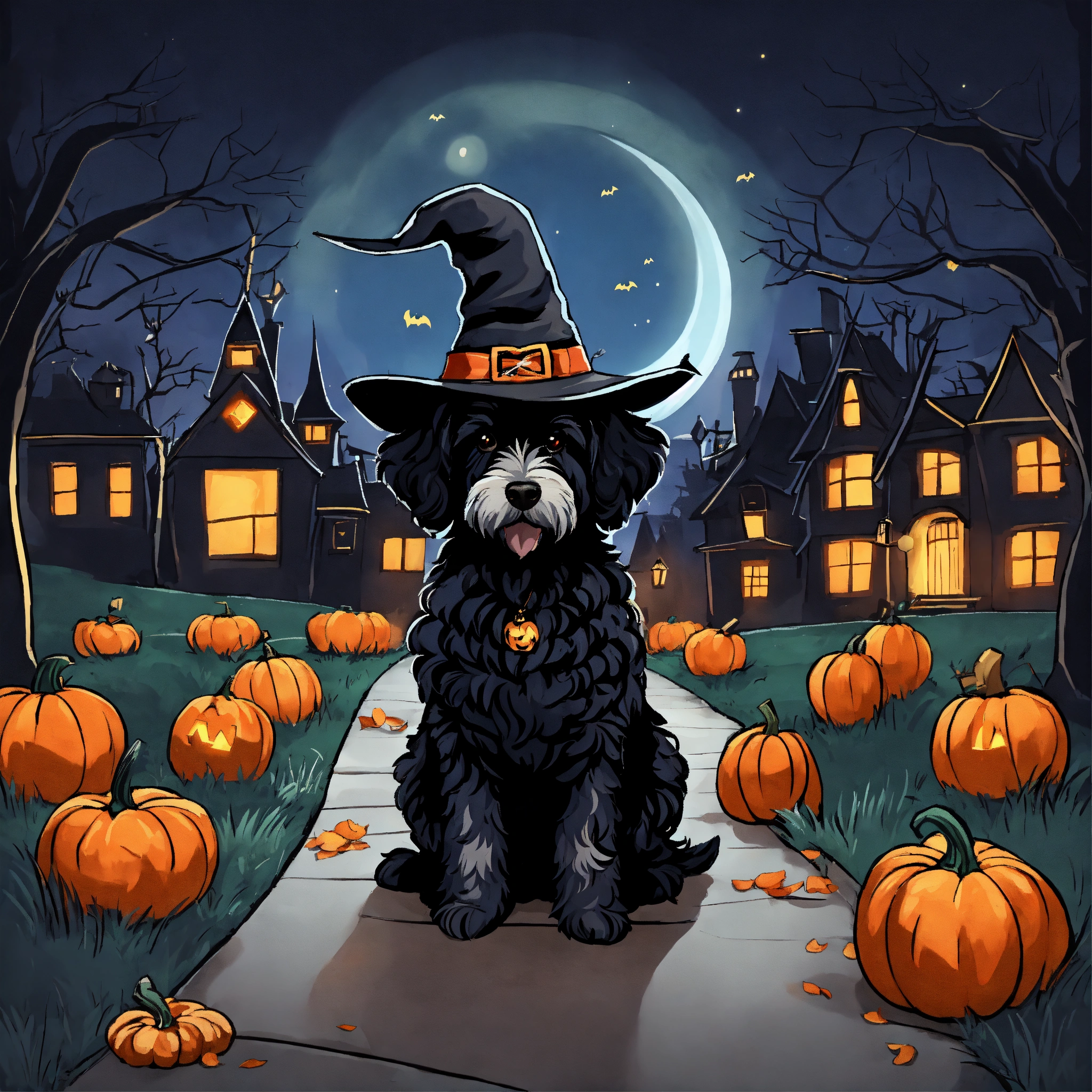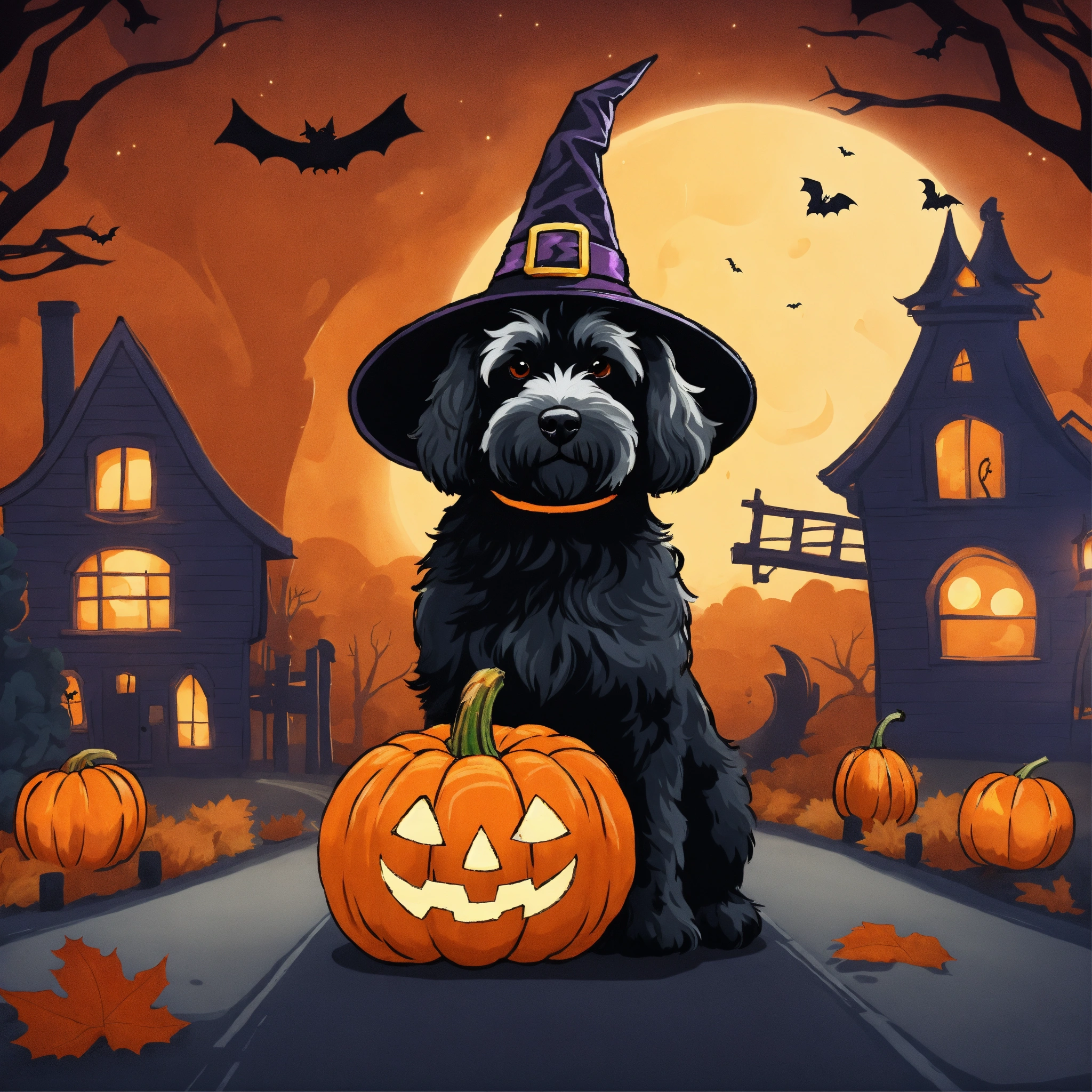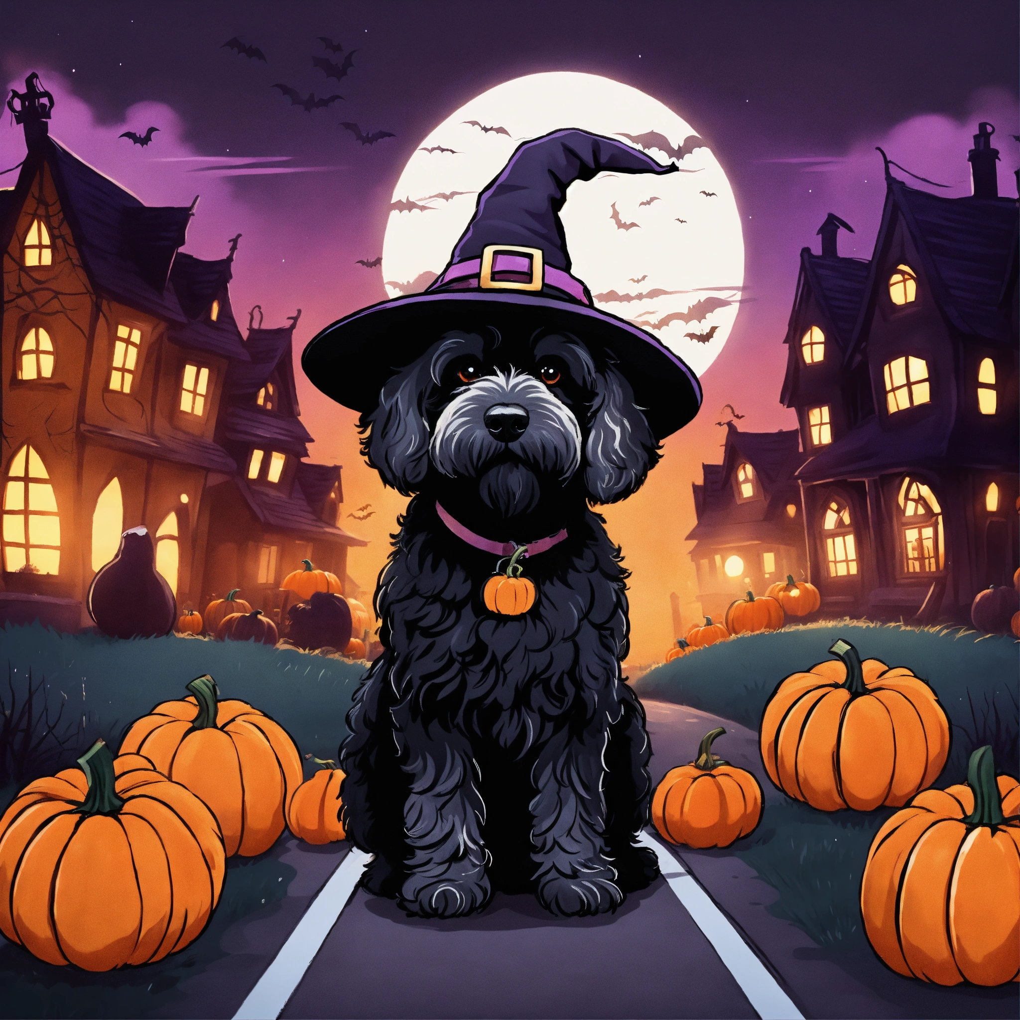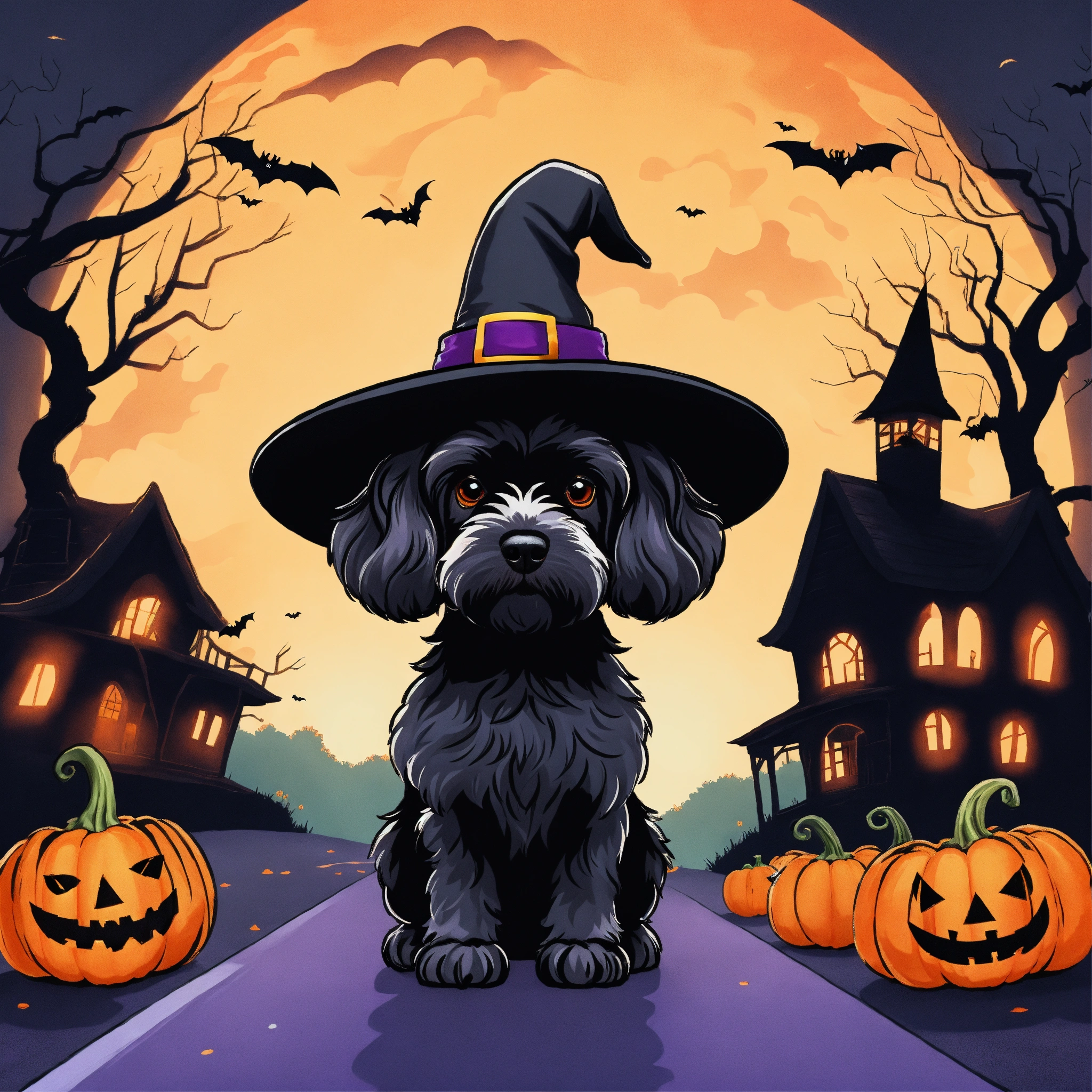 Black cockapoo with white belly and chin fur, wearing a witch hat, standing out in the middle of a dark road, sorrounded by pumpkins, houses, and halloween decorations, 4k, cartoon style