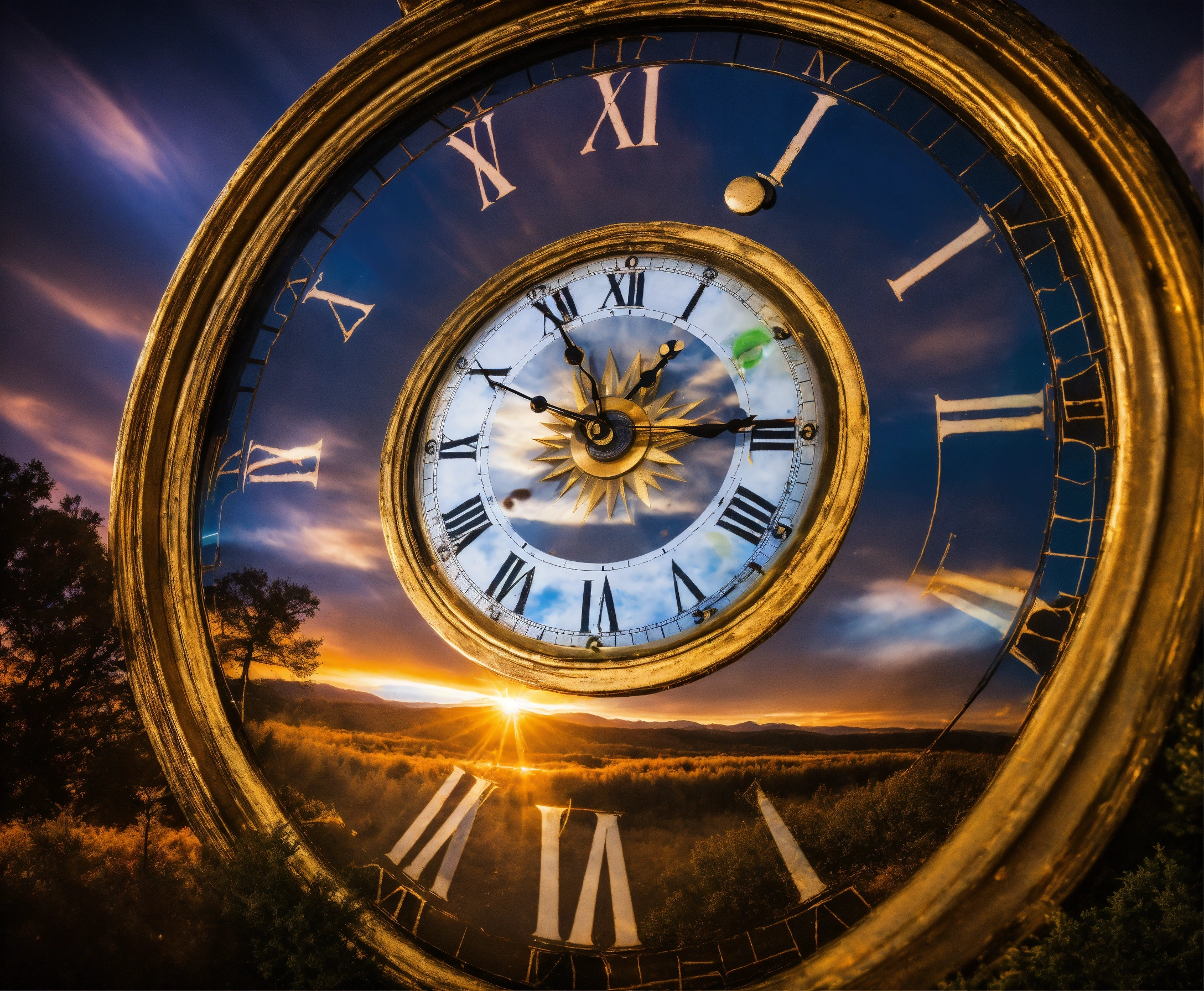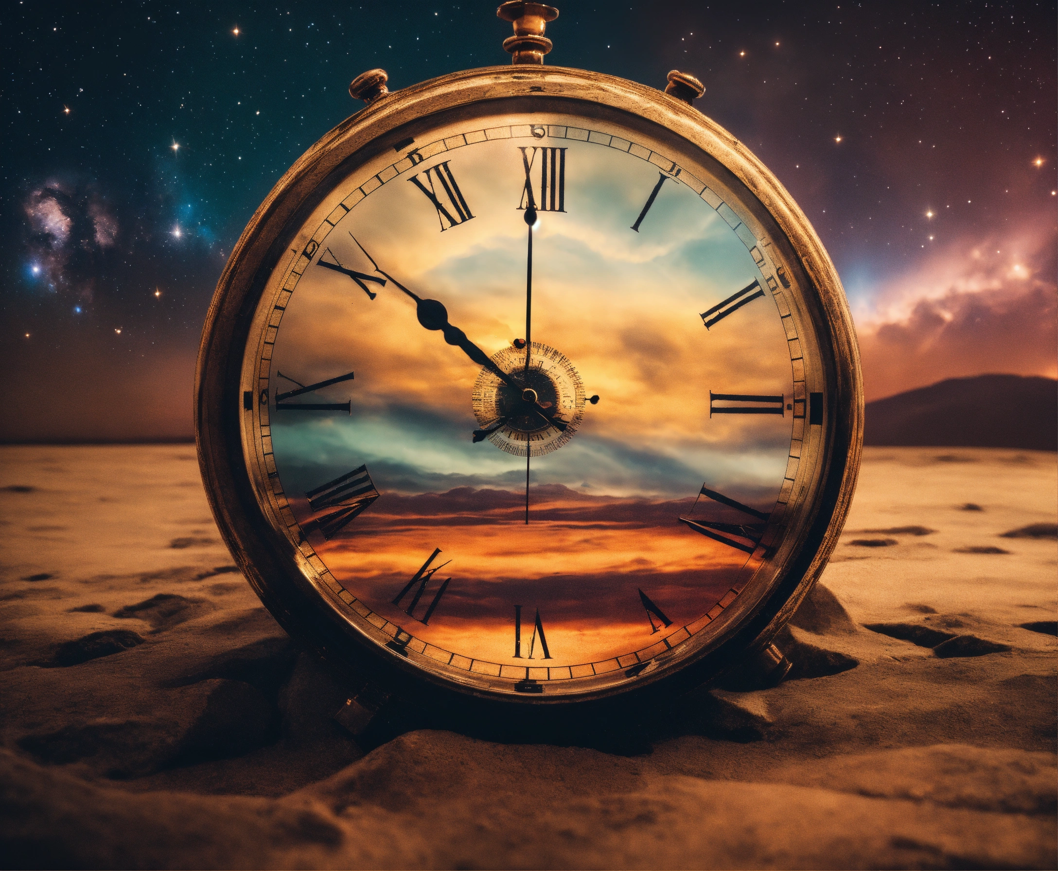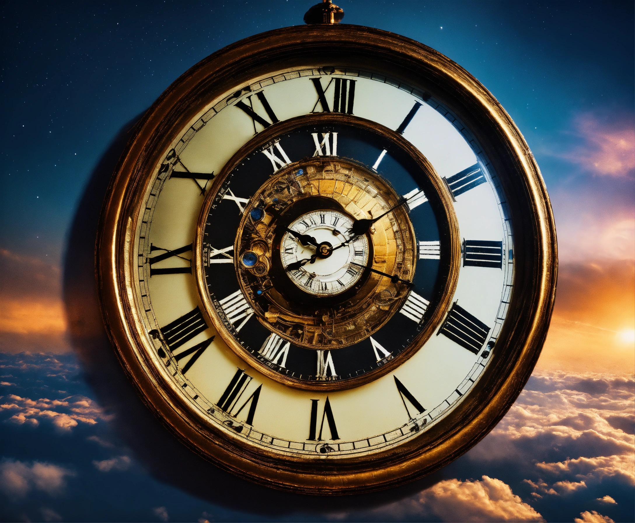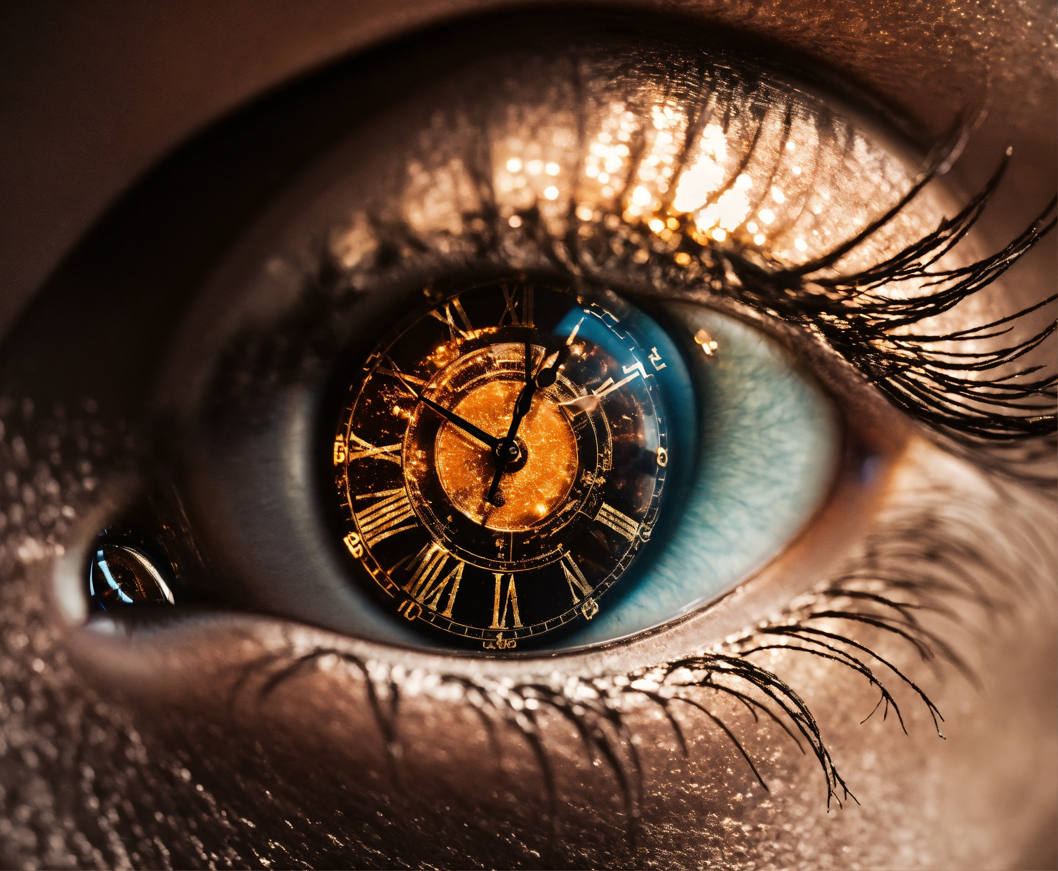 An inspiring photograph of a awe-filled eye reflecting time passing and goal management, sky's the limit, analog clock, ticking, space, bohken