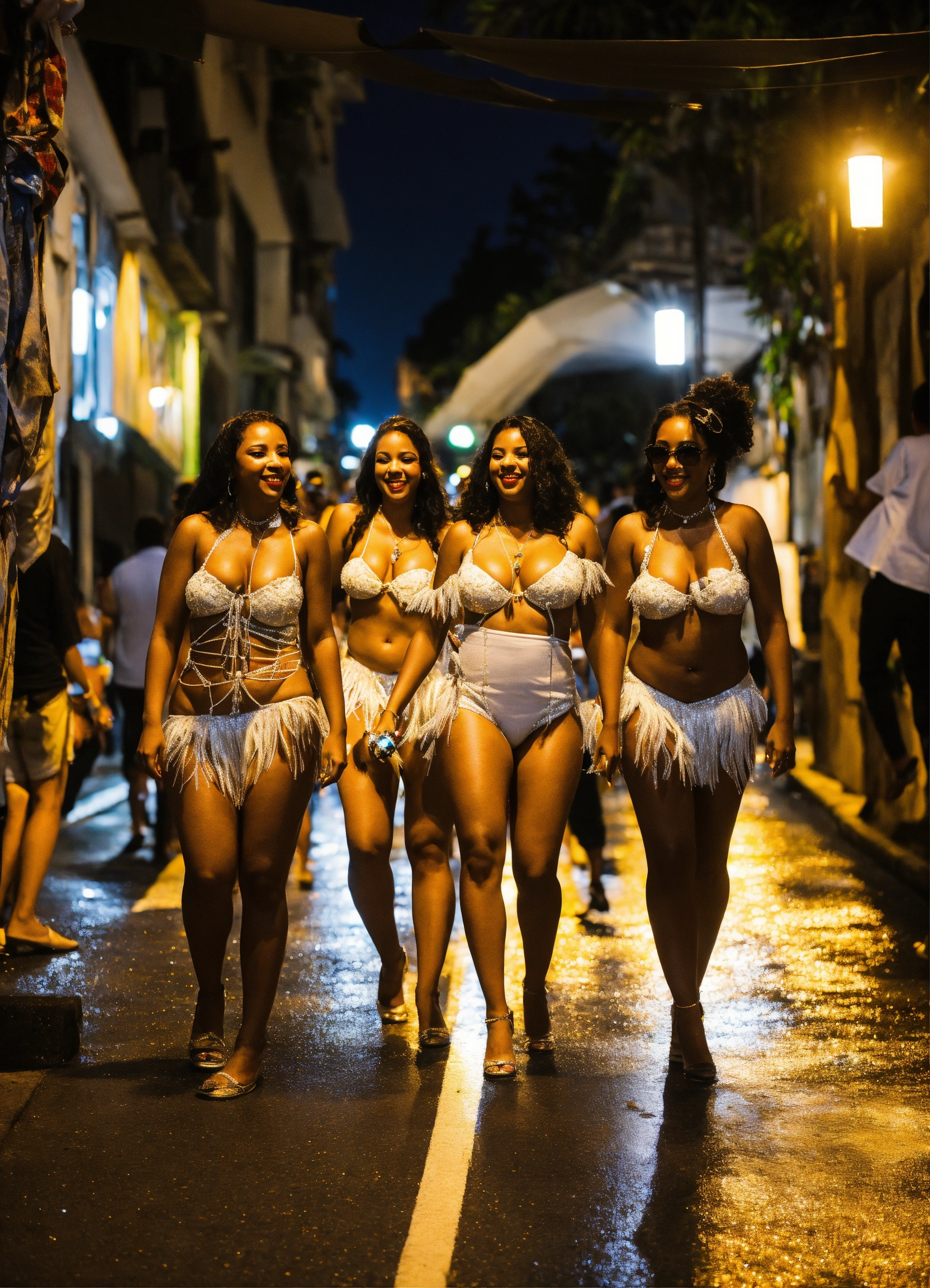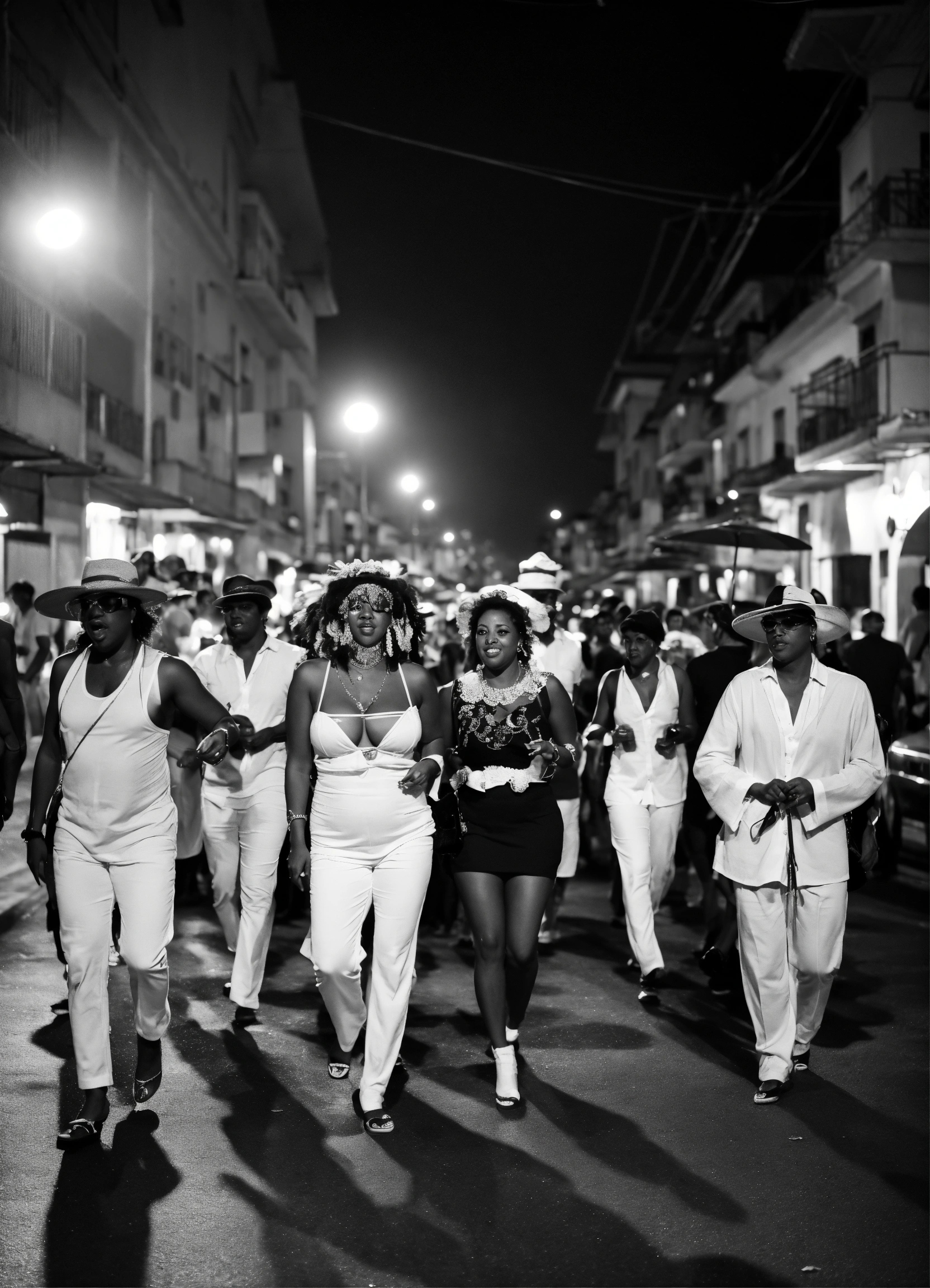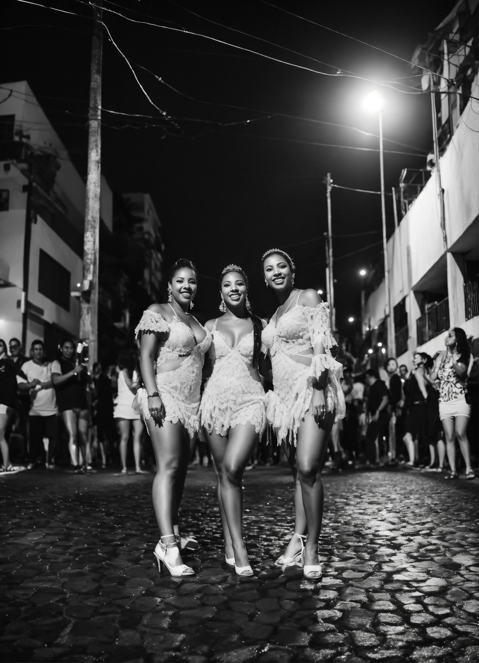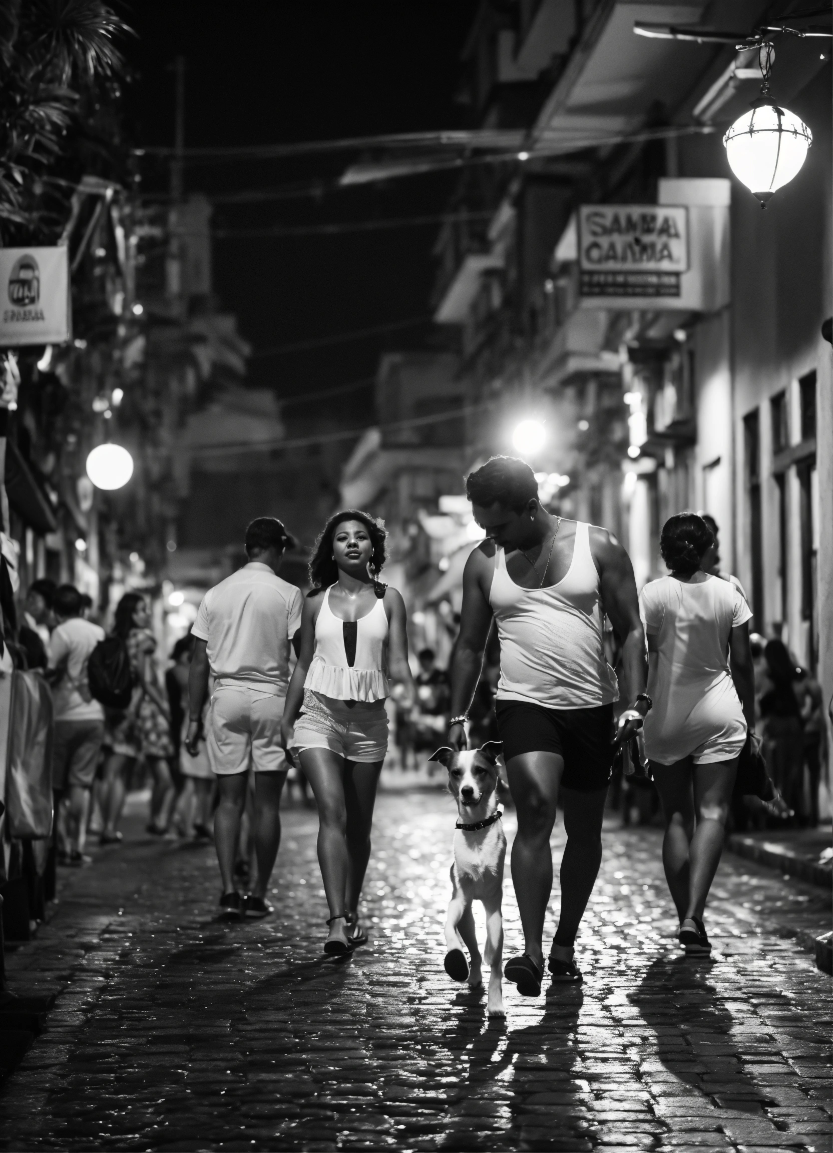 Fotografia de grupo de samba em preto e branco de uma noite chuvosa em rio de janeiro, reflexos no pavimento molhado.