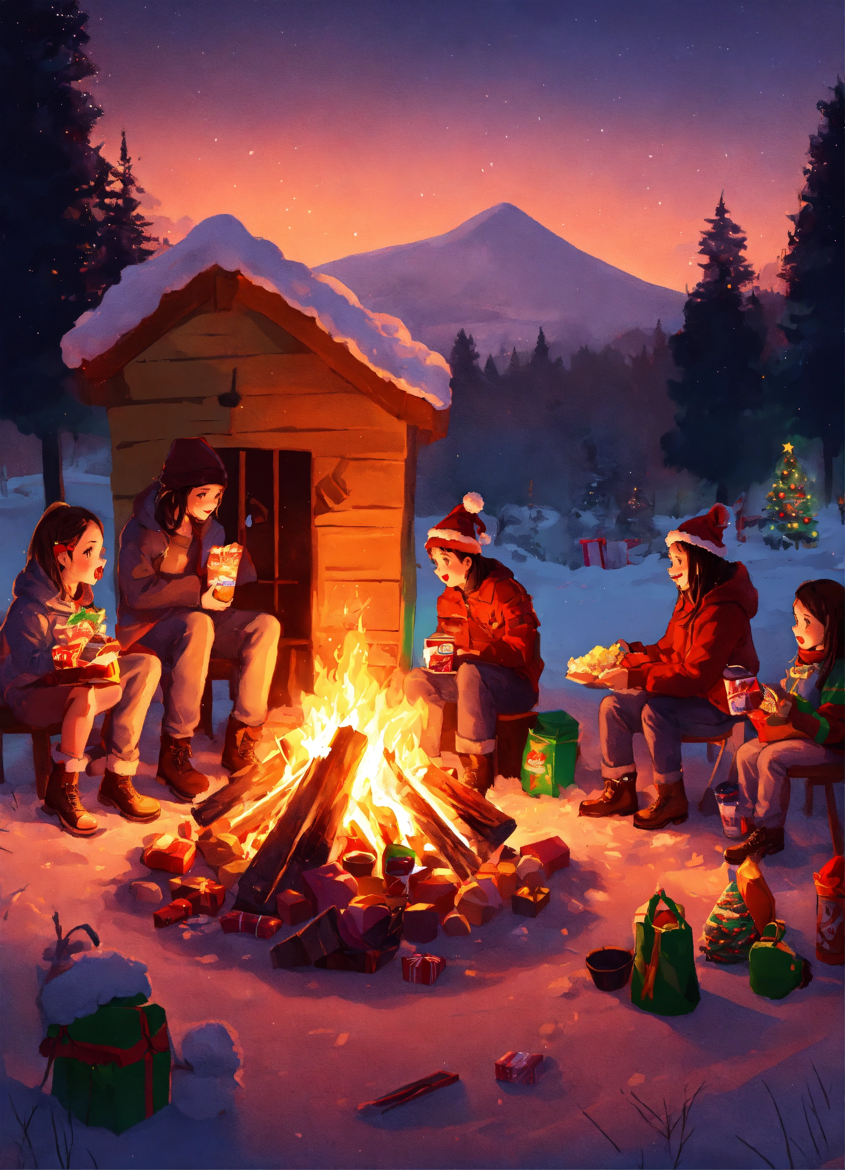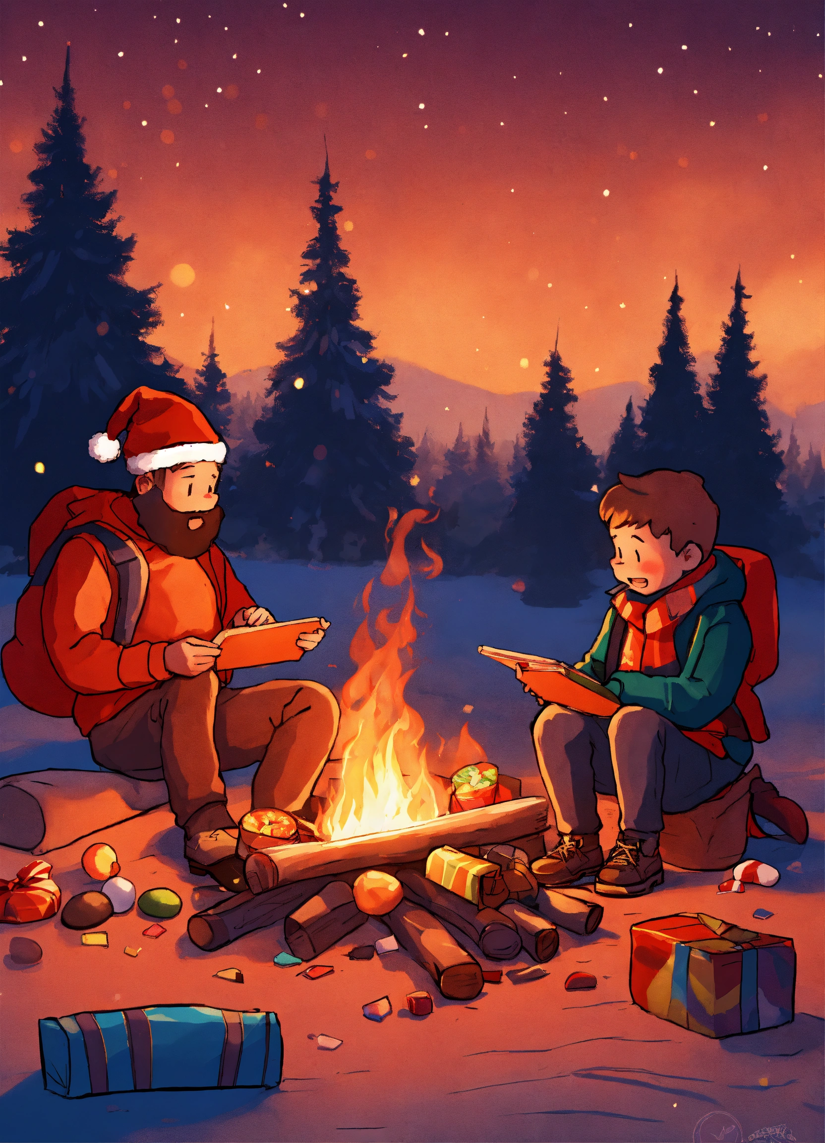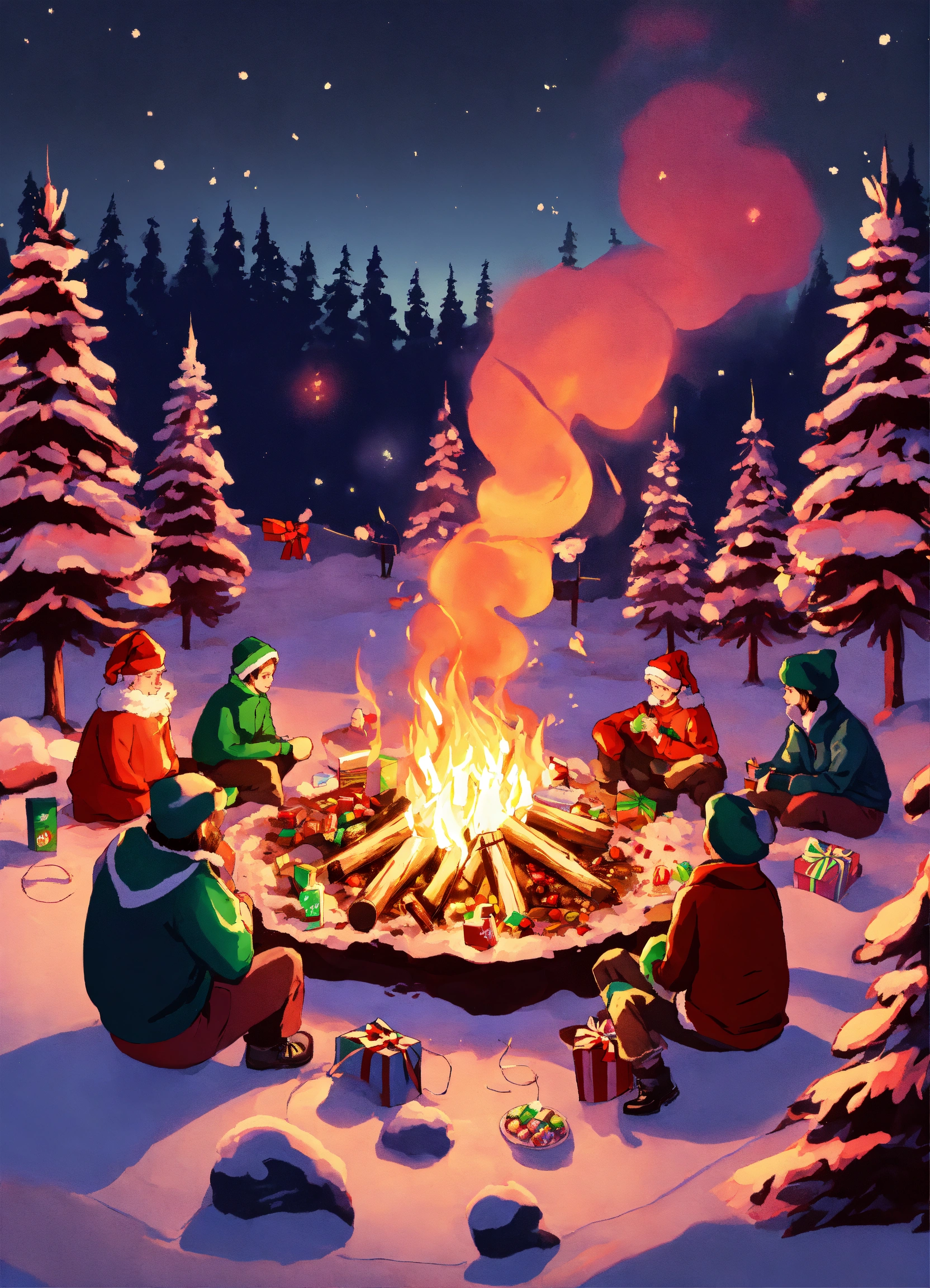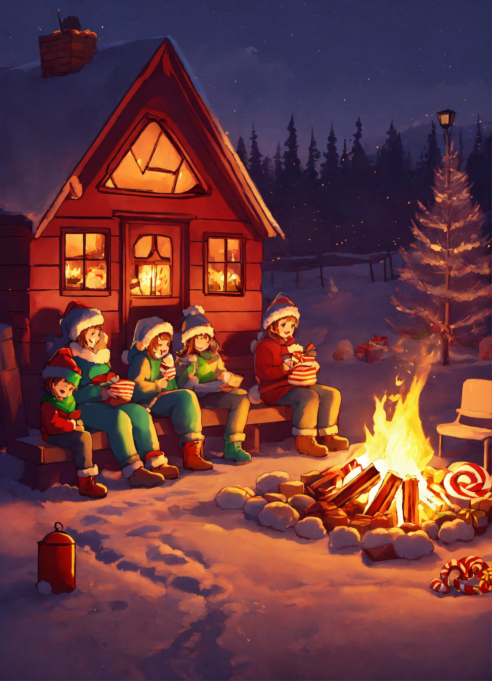 All the chrismas subject around a bonfire eating candy digital illustration