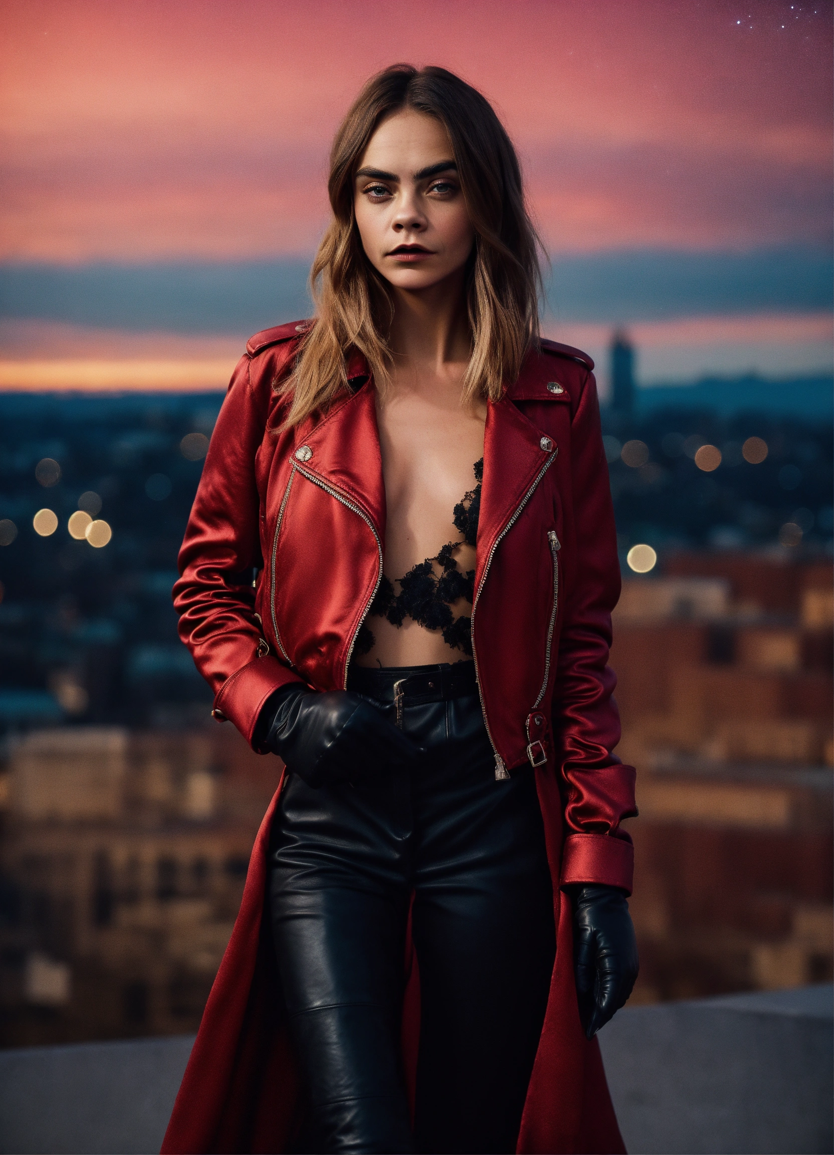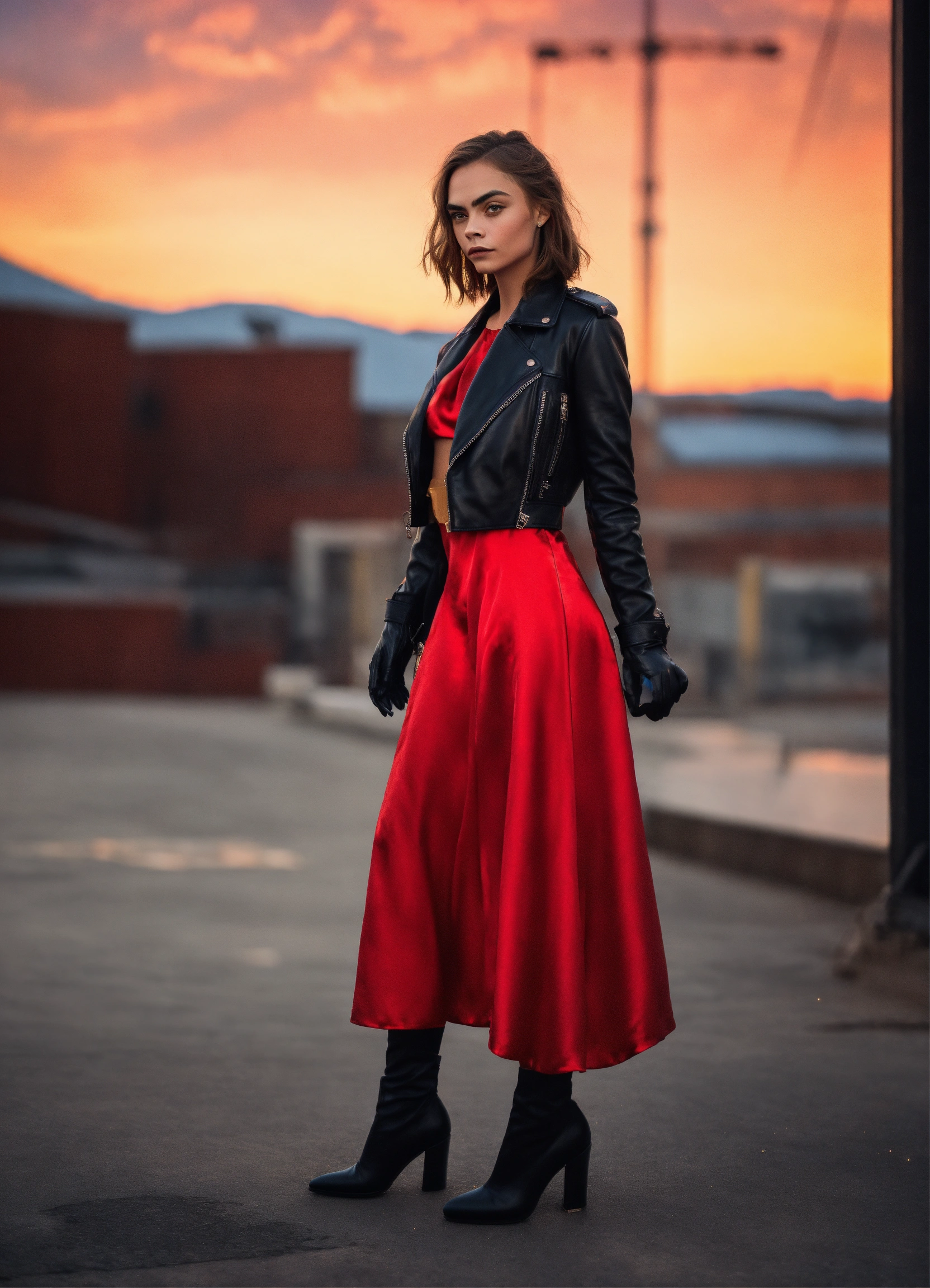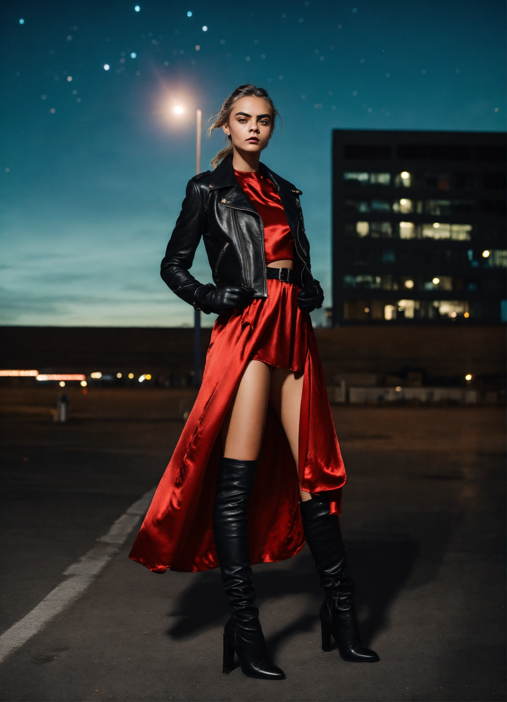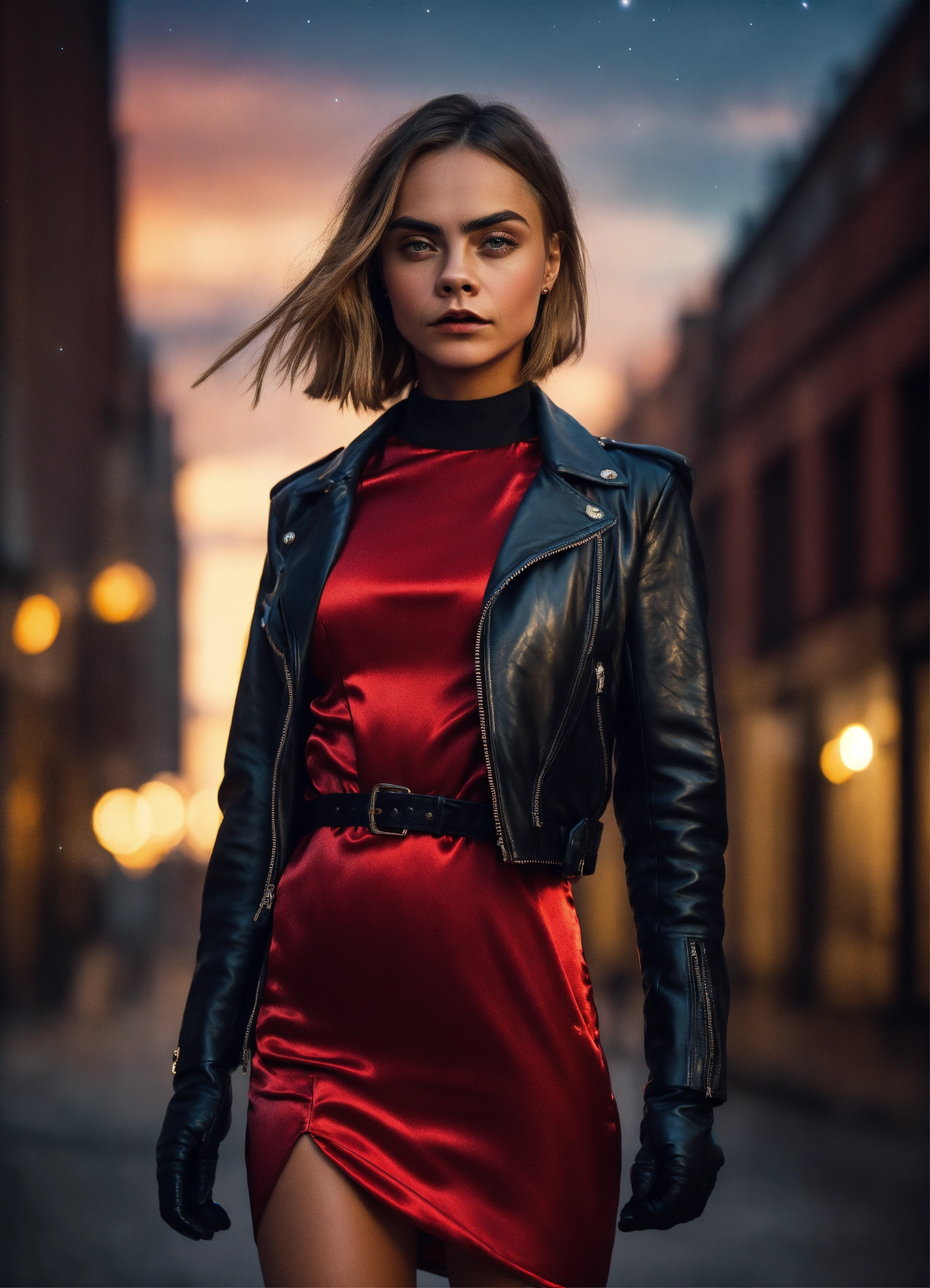 A real photo of a 25 year old girl, wearing a red satin dress and black leather jacket and gloves. urban background in the sky we see the galaxy. full body looks like cara delevingne